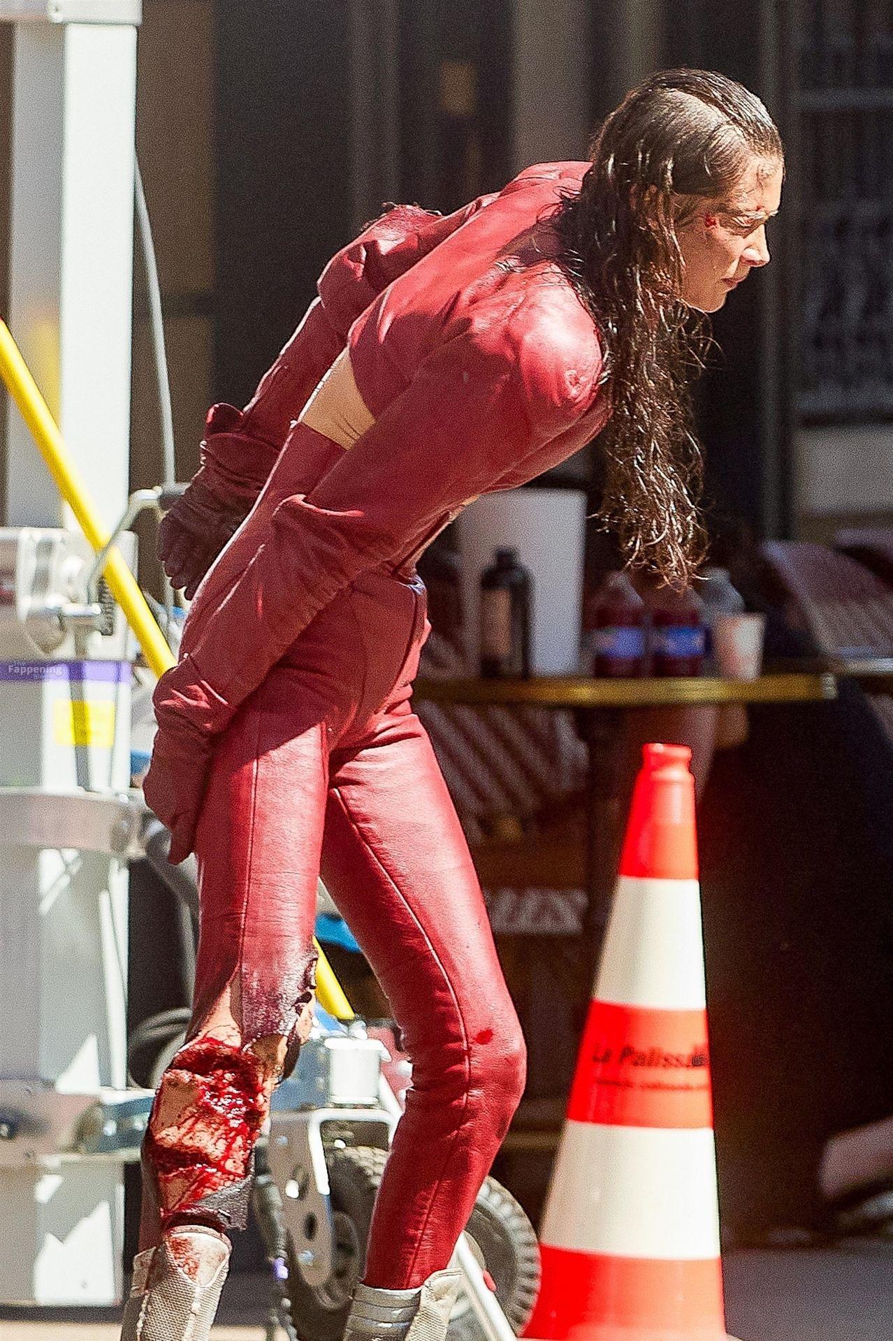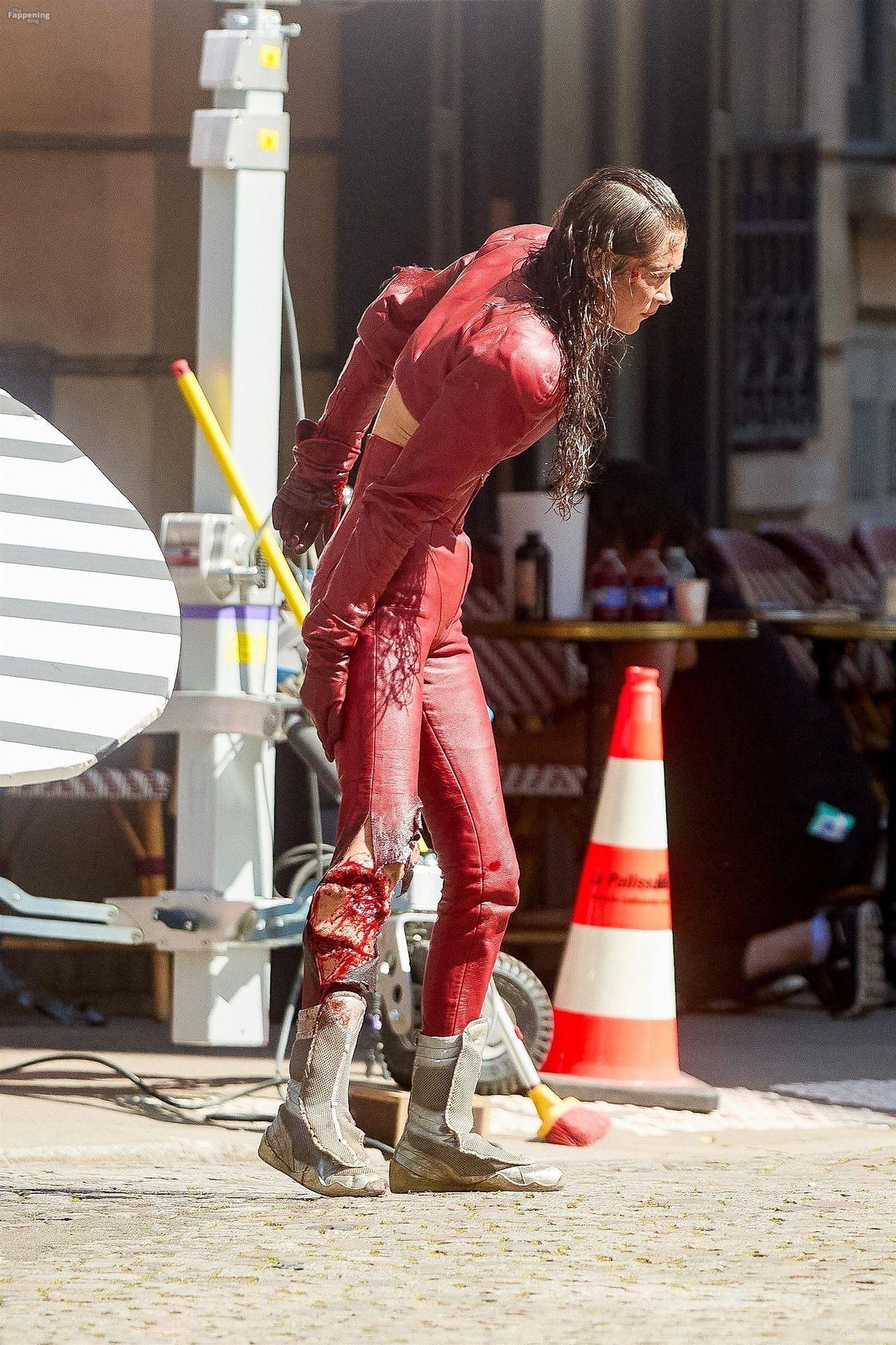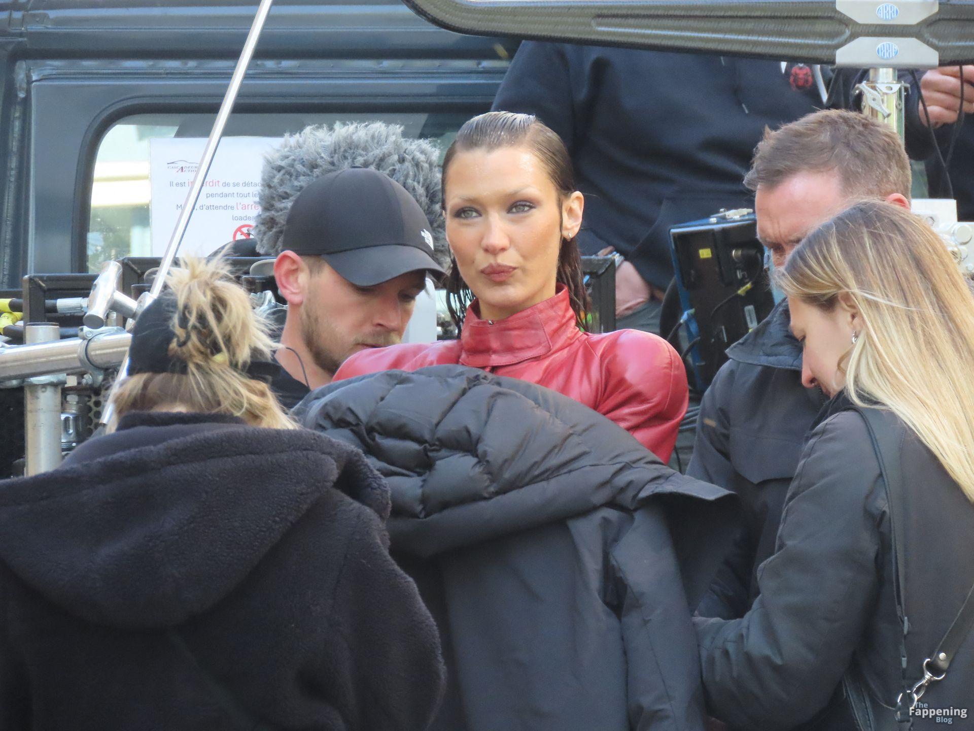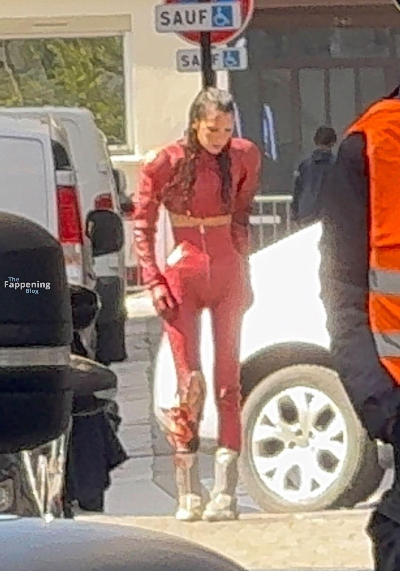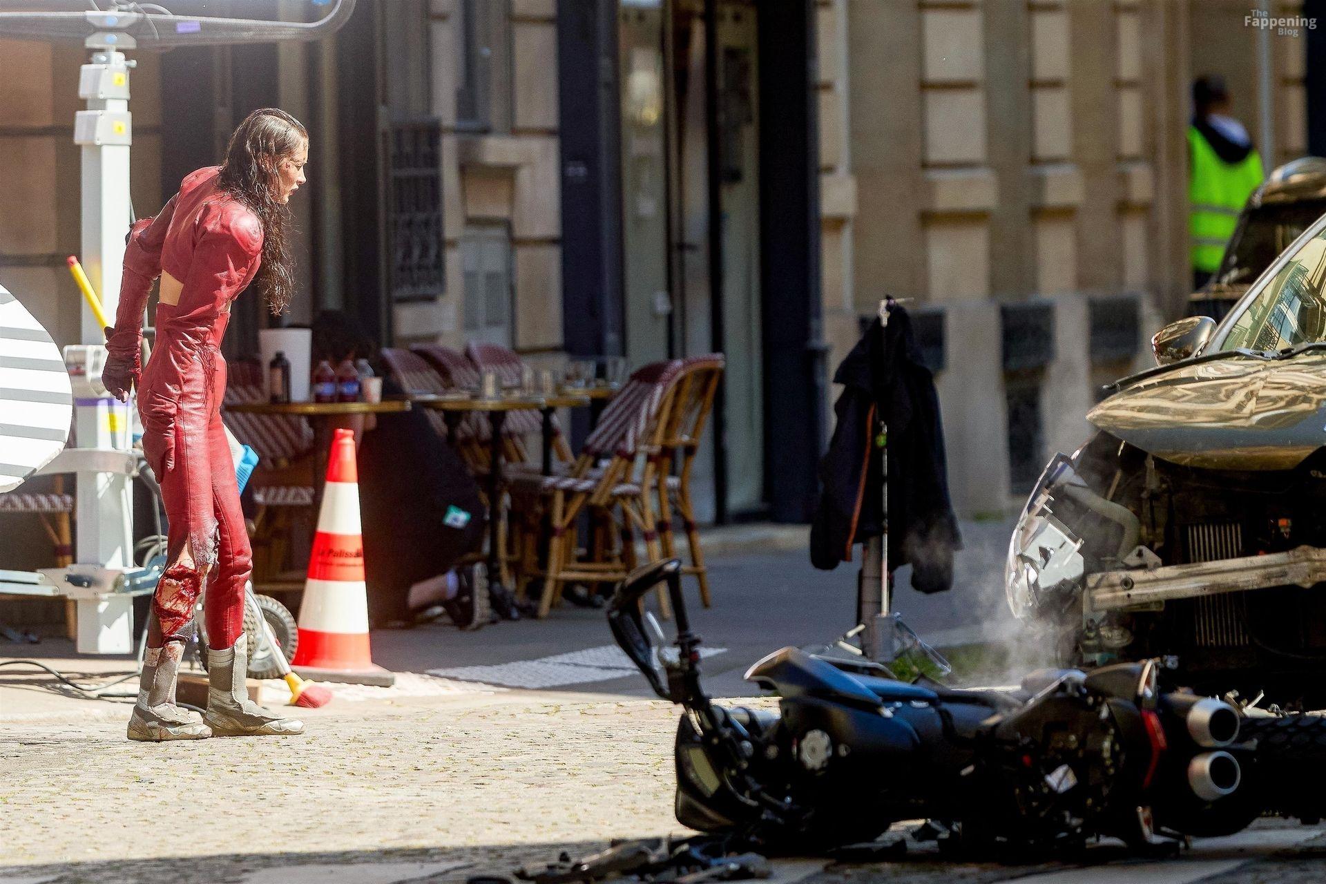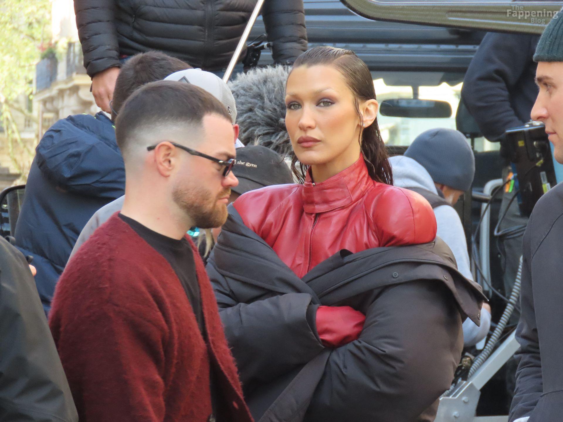 Bella Hadid a été photographiée à Paris, arborant une combinaison en cuir rouge flamboyant et chevauchant une moto. Après cette folle cascade avec un mannequin, elle joue les dures avec une vilaine blessure à la jambe pour une scène de la série « The Beauty » à Paris, France.