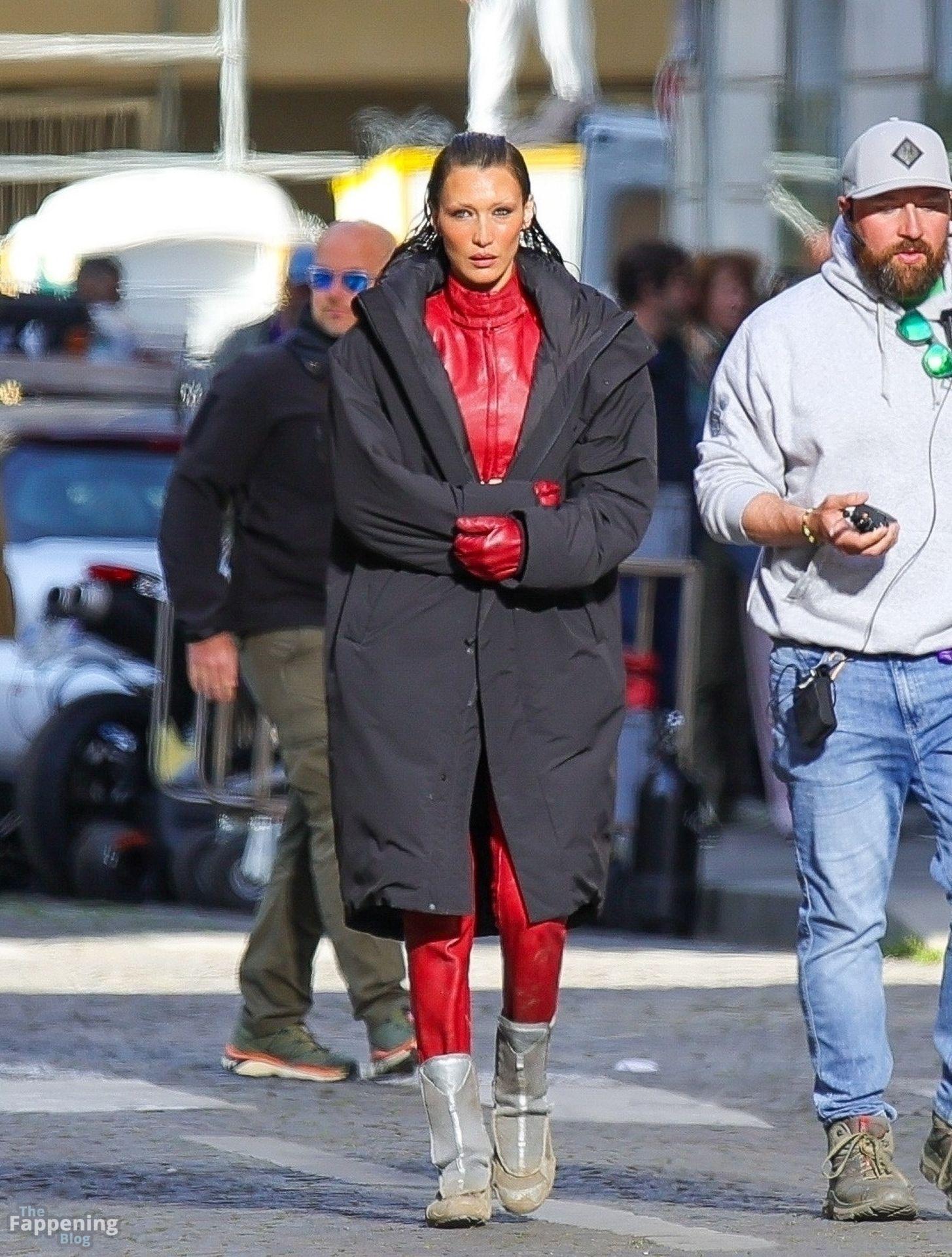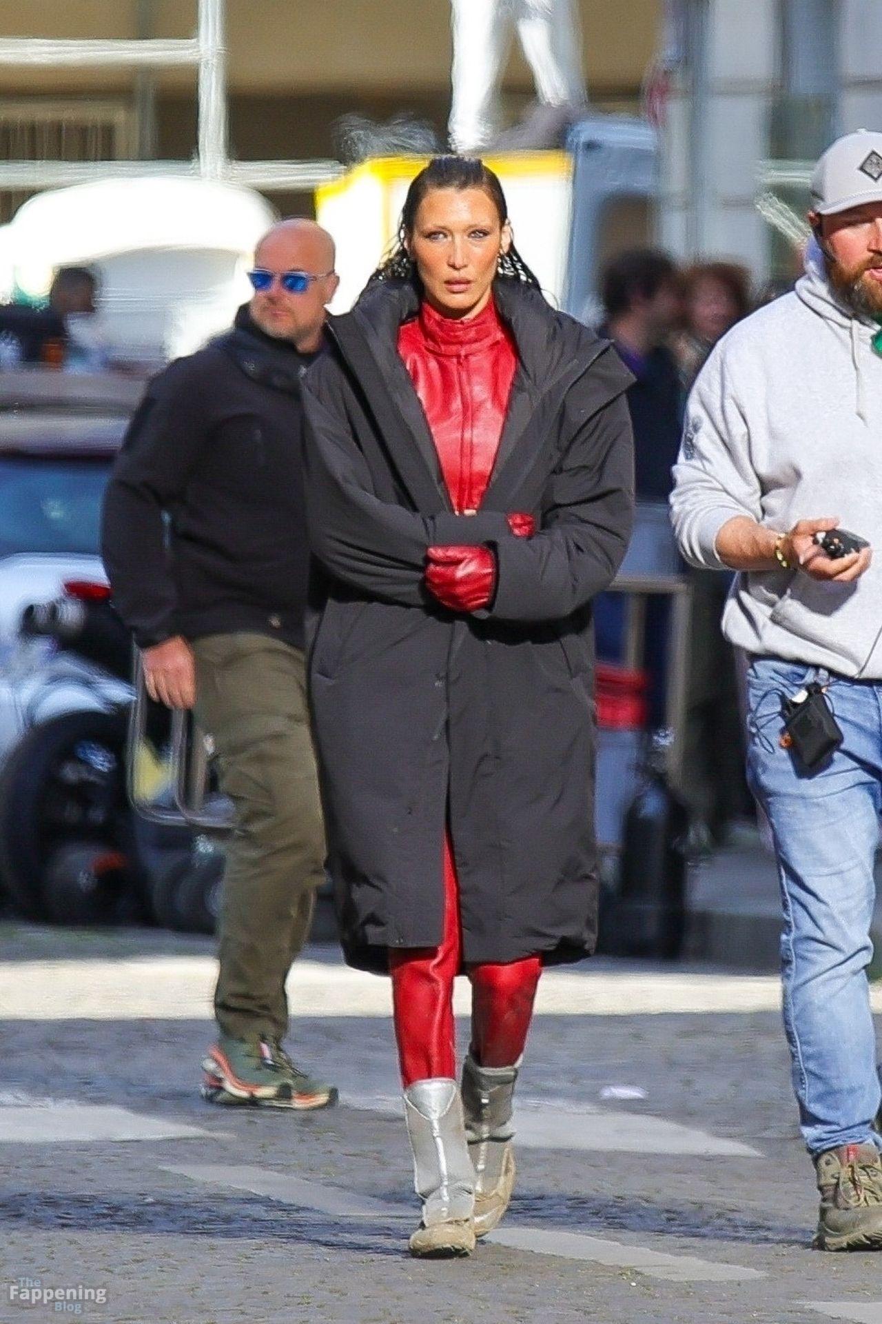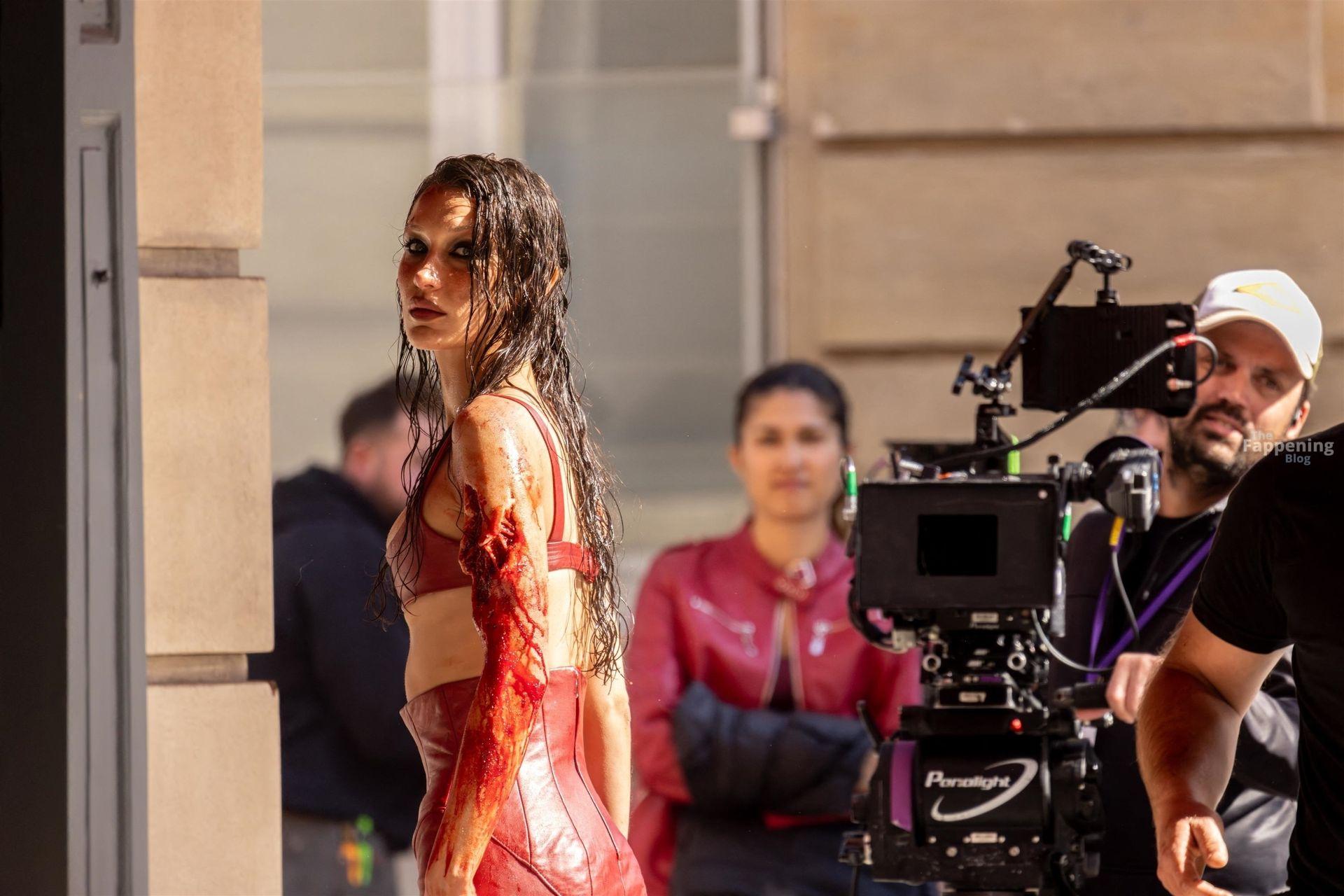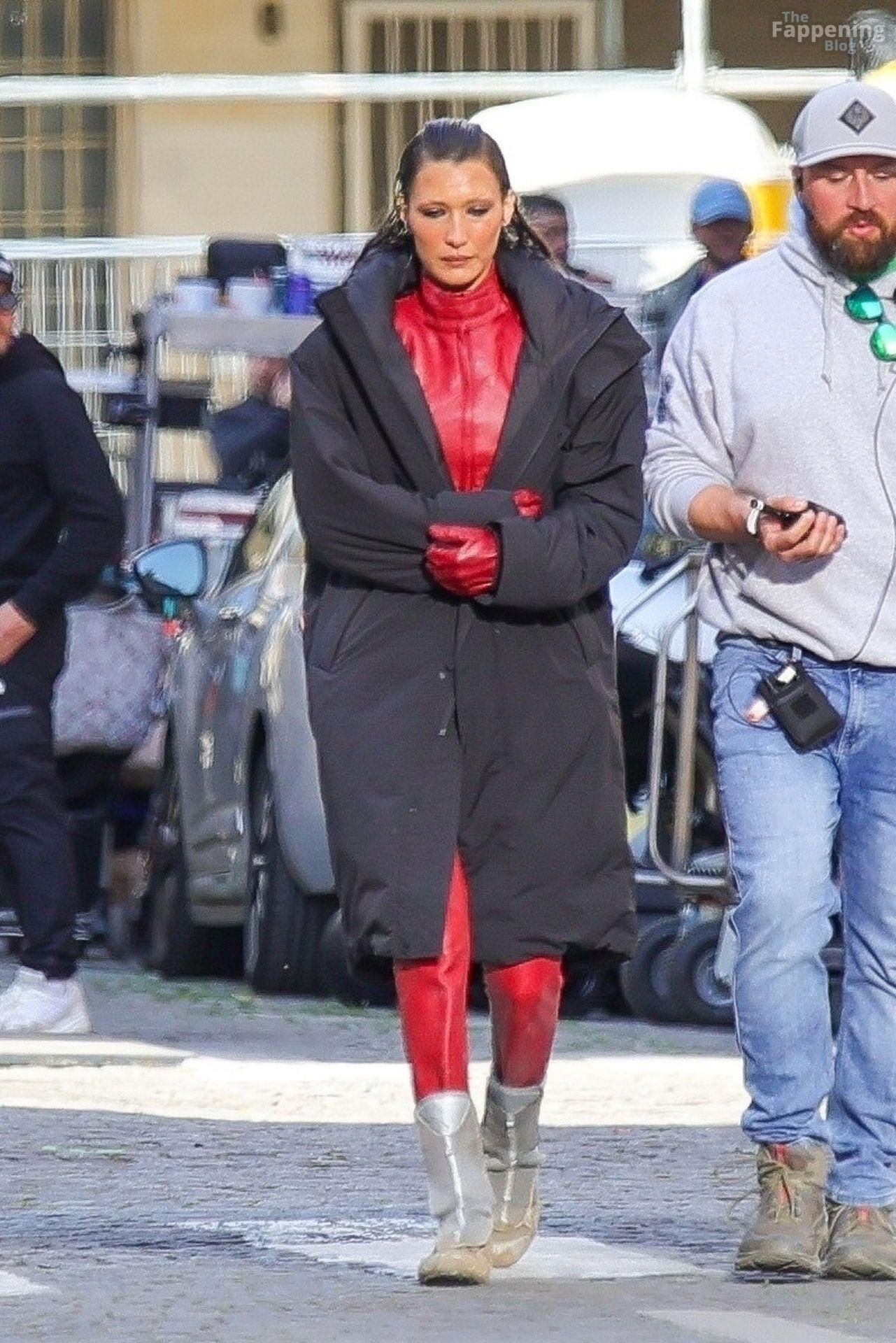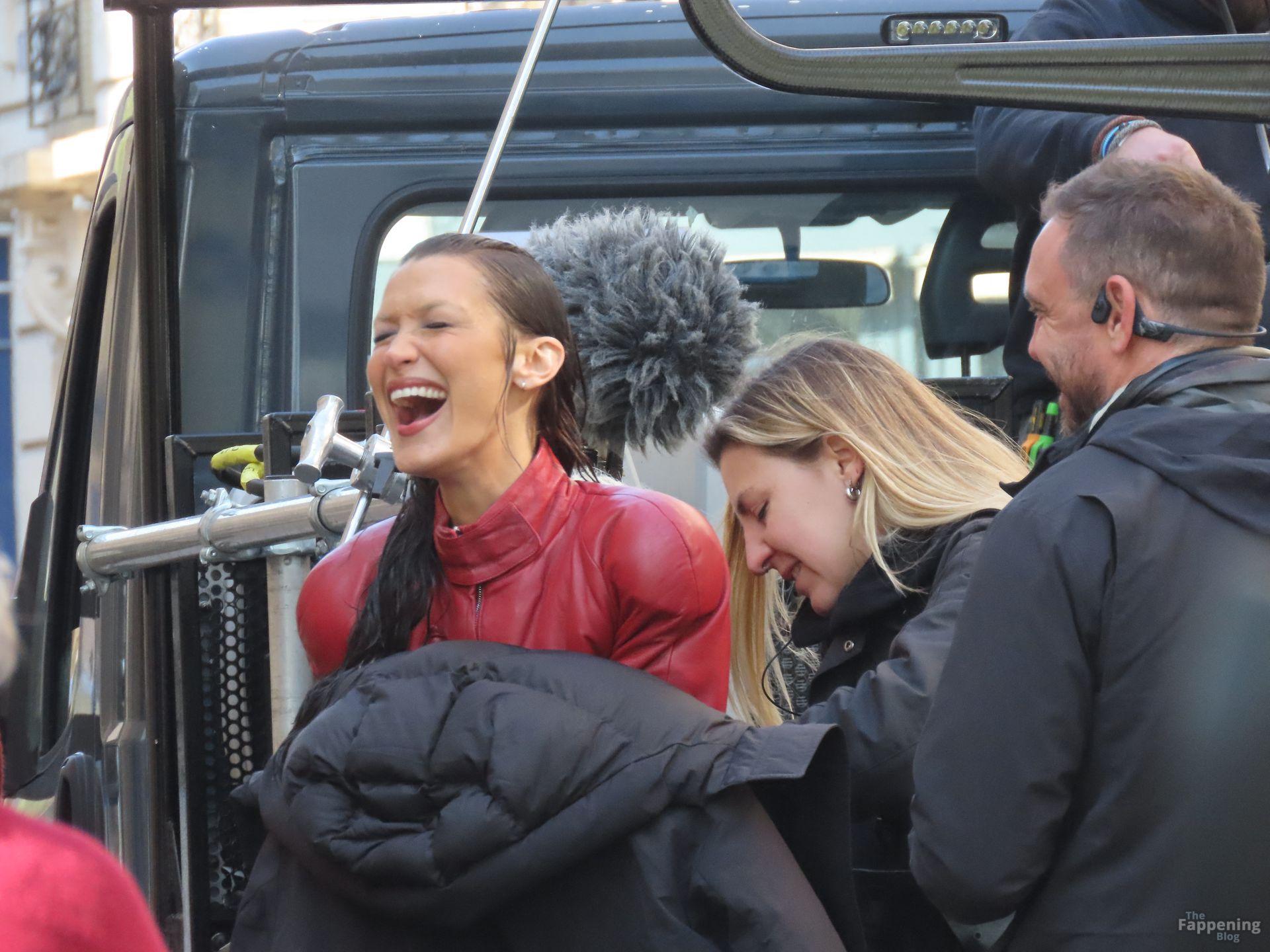 Bella Hadid a été photographiée à Paris, arborant une combinaison en cuir rouge flamboyant et chevauchant une moto. Après cette folle cascade avec un mannequin, elle joue les dures avec une vilaine blessure à la jambe pour une scène de la série « The Beauty » à Paris, France.