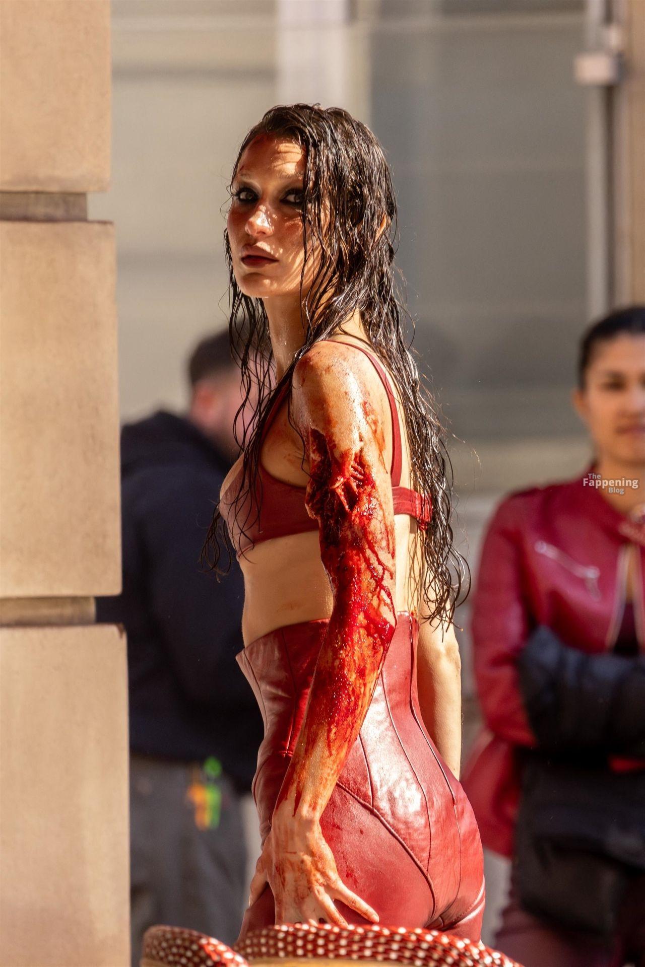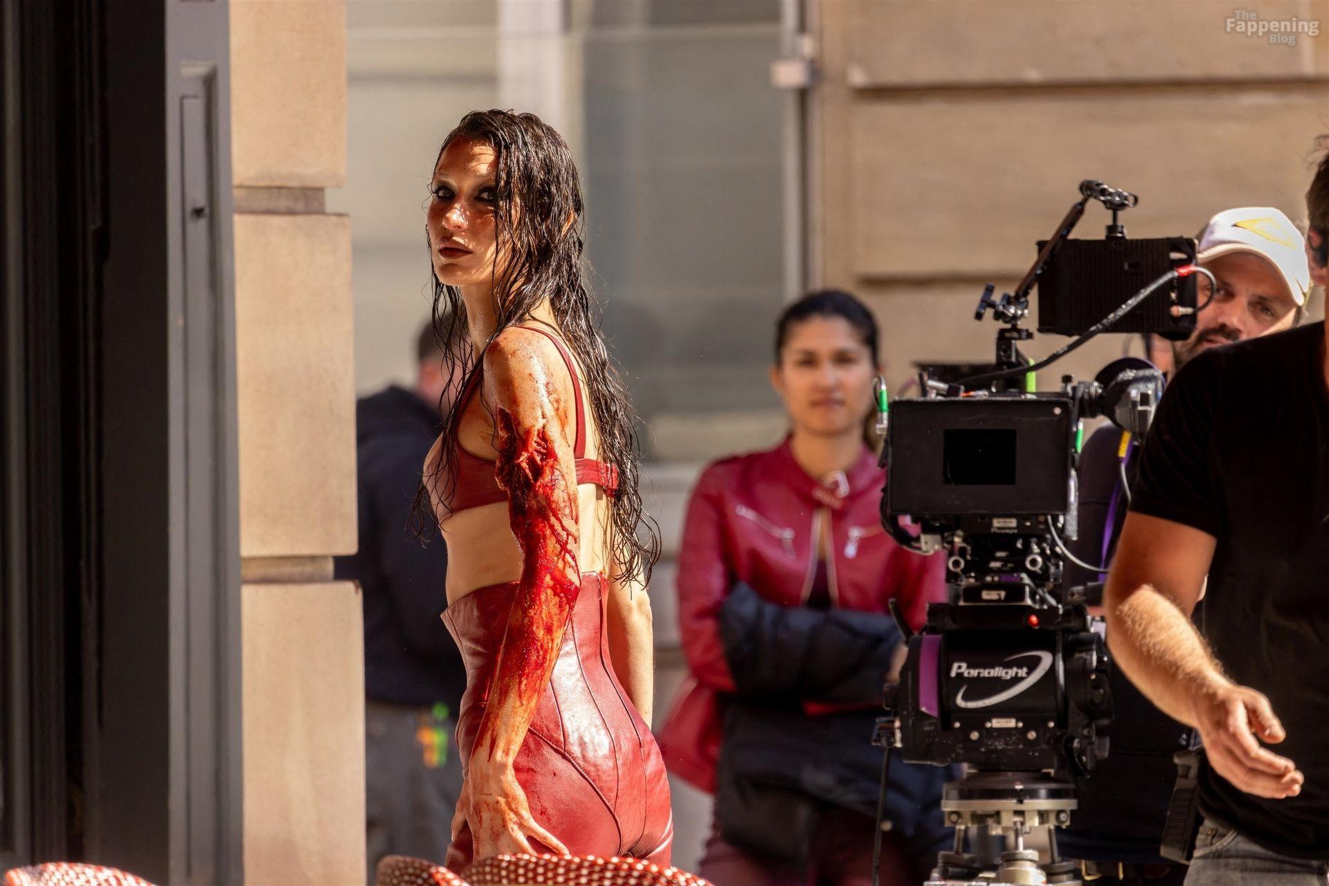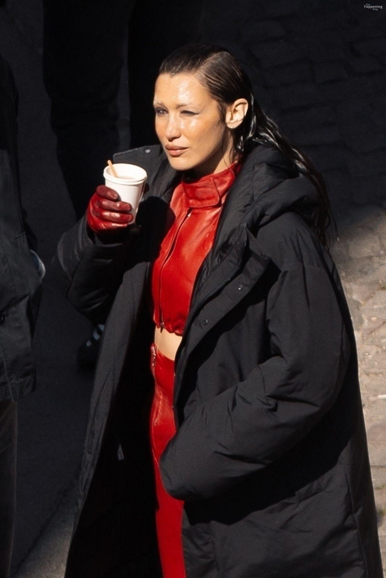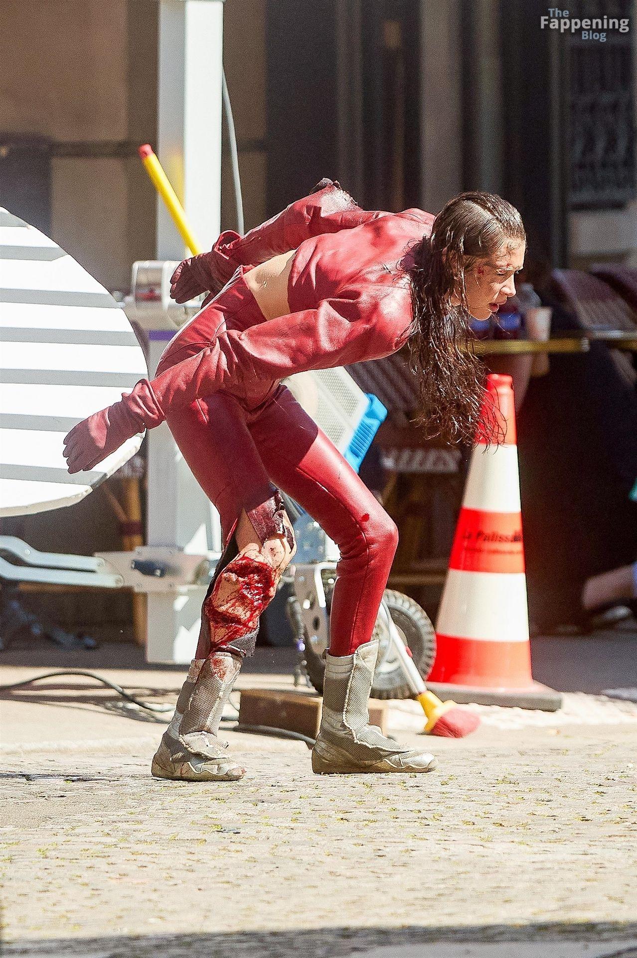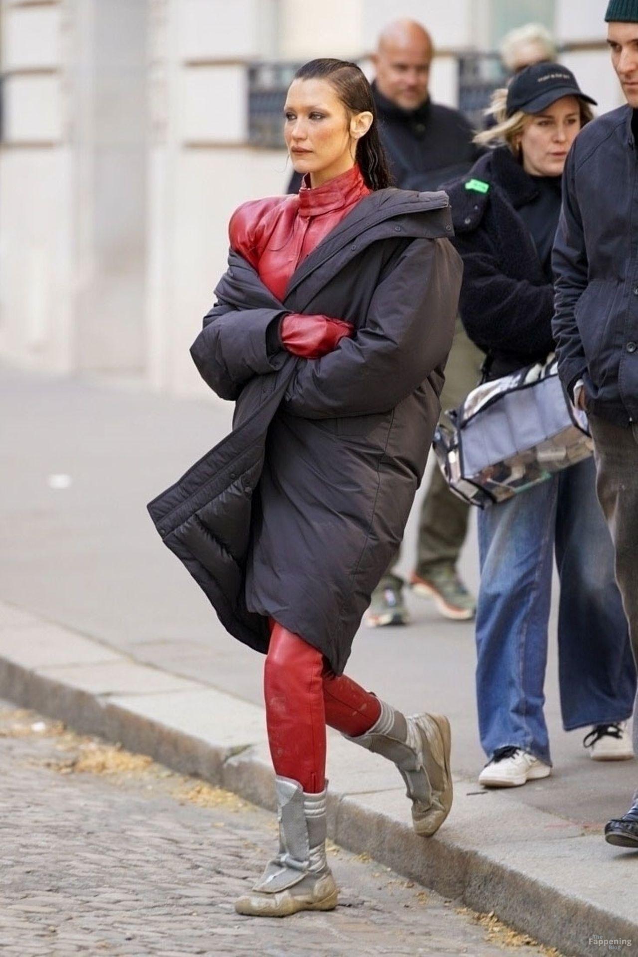 Bella Hadid a été photographiée à Paris, arborant une combinaison en cuir rouge flamboyant et chevauchant une moto. Après cette folle cascade avec un mannequin, elle joue les dures avec une vilaine blessure à la jambe pour une scène de la série « The Beauty » à Paris, France.