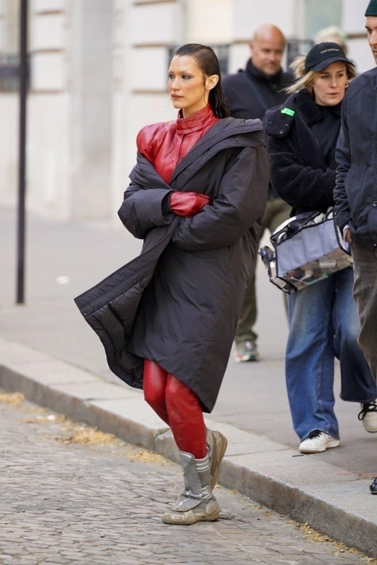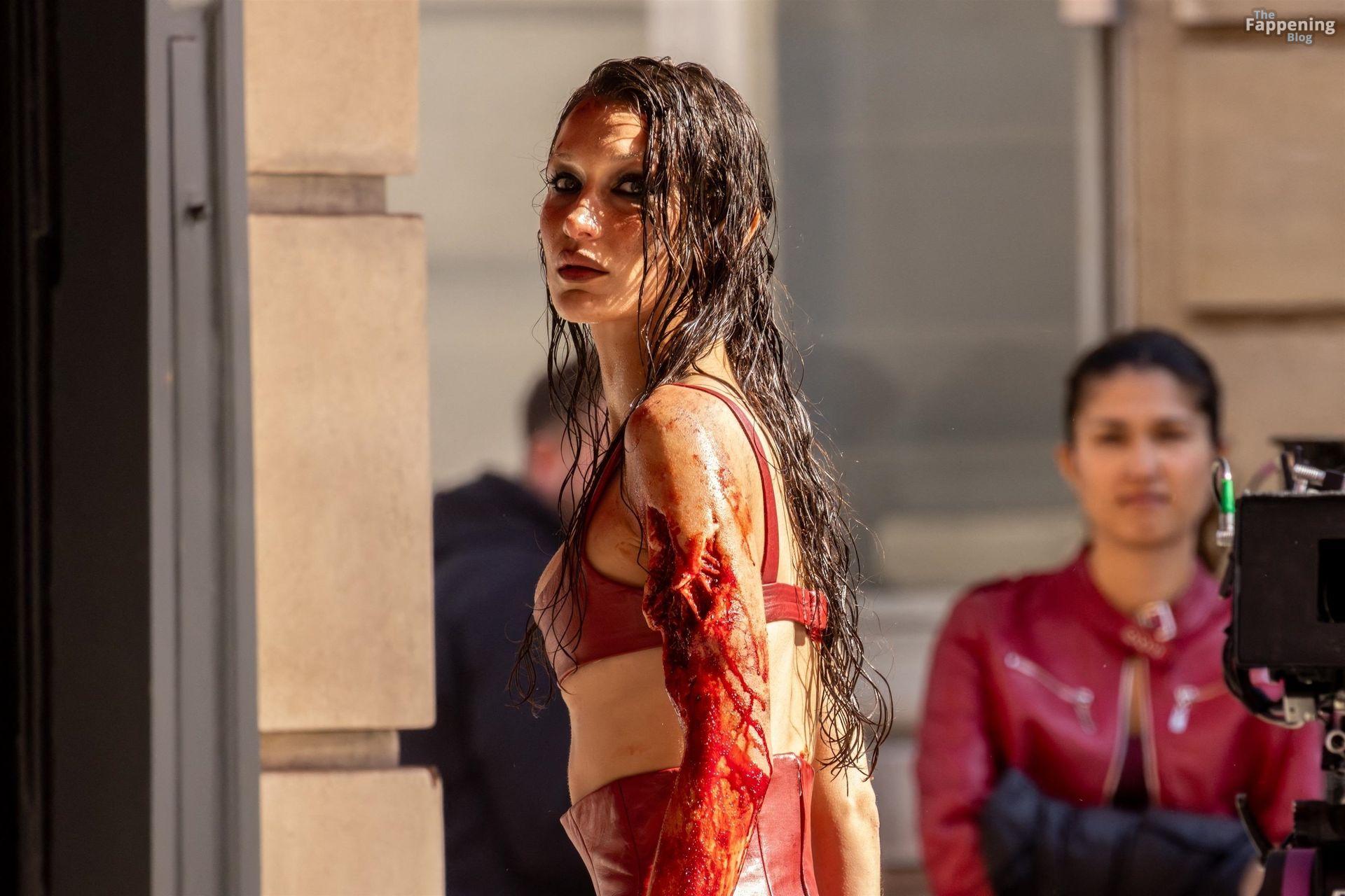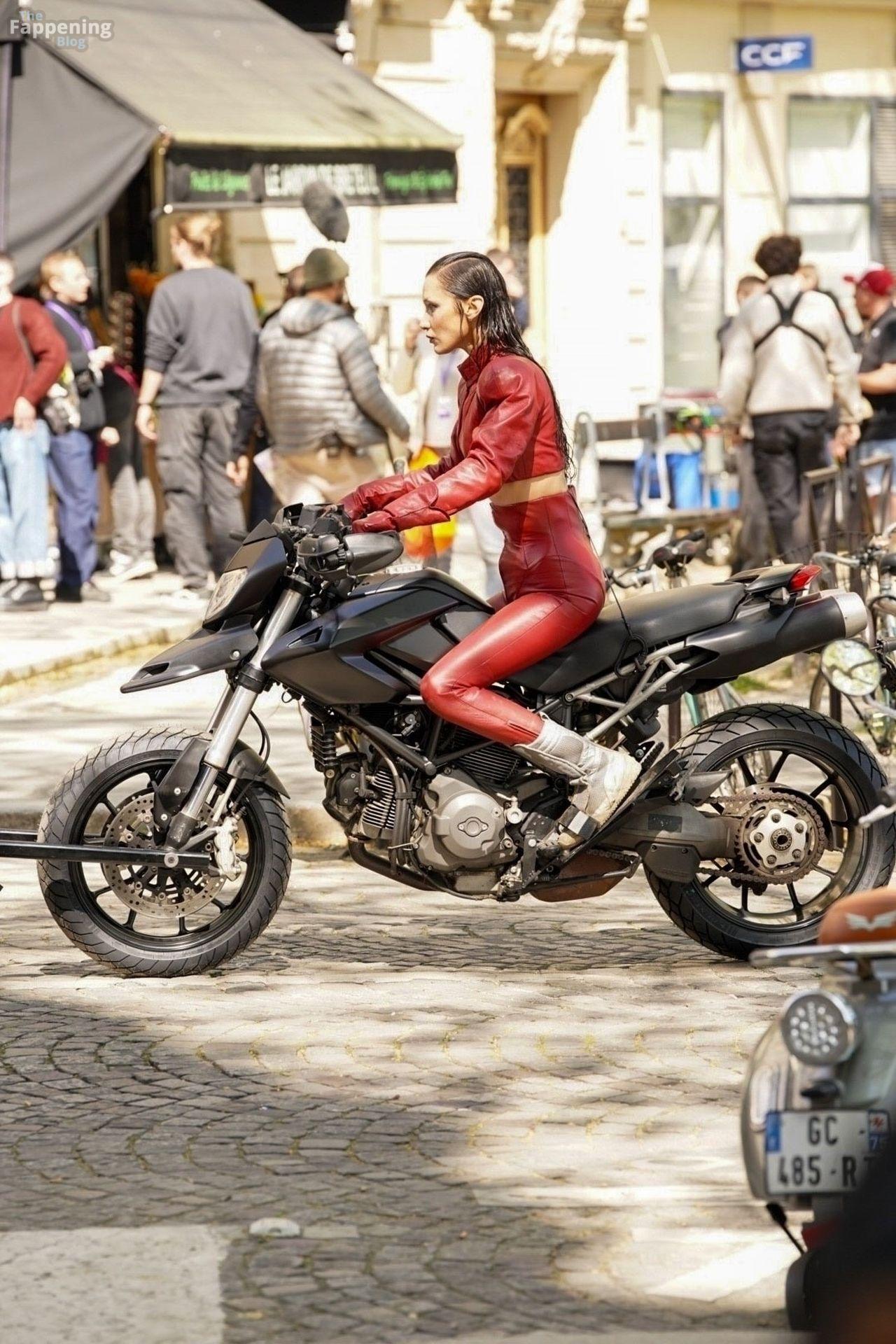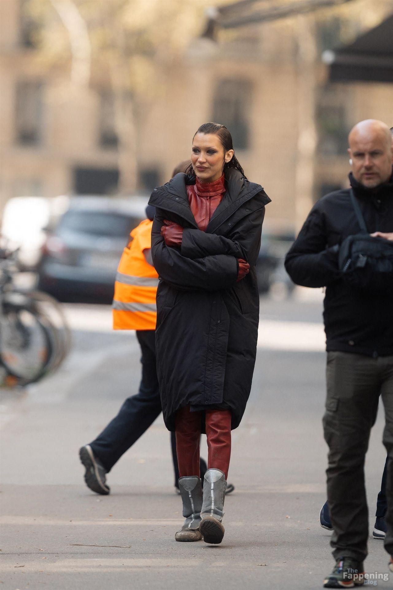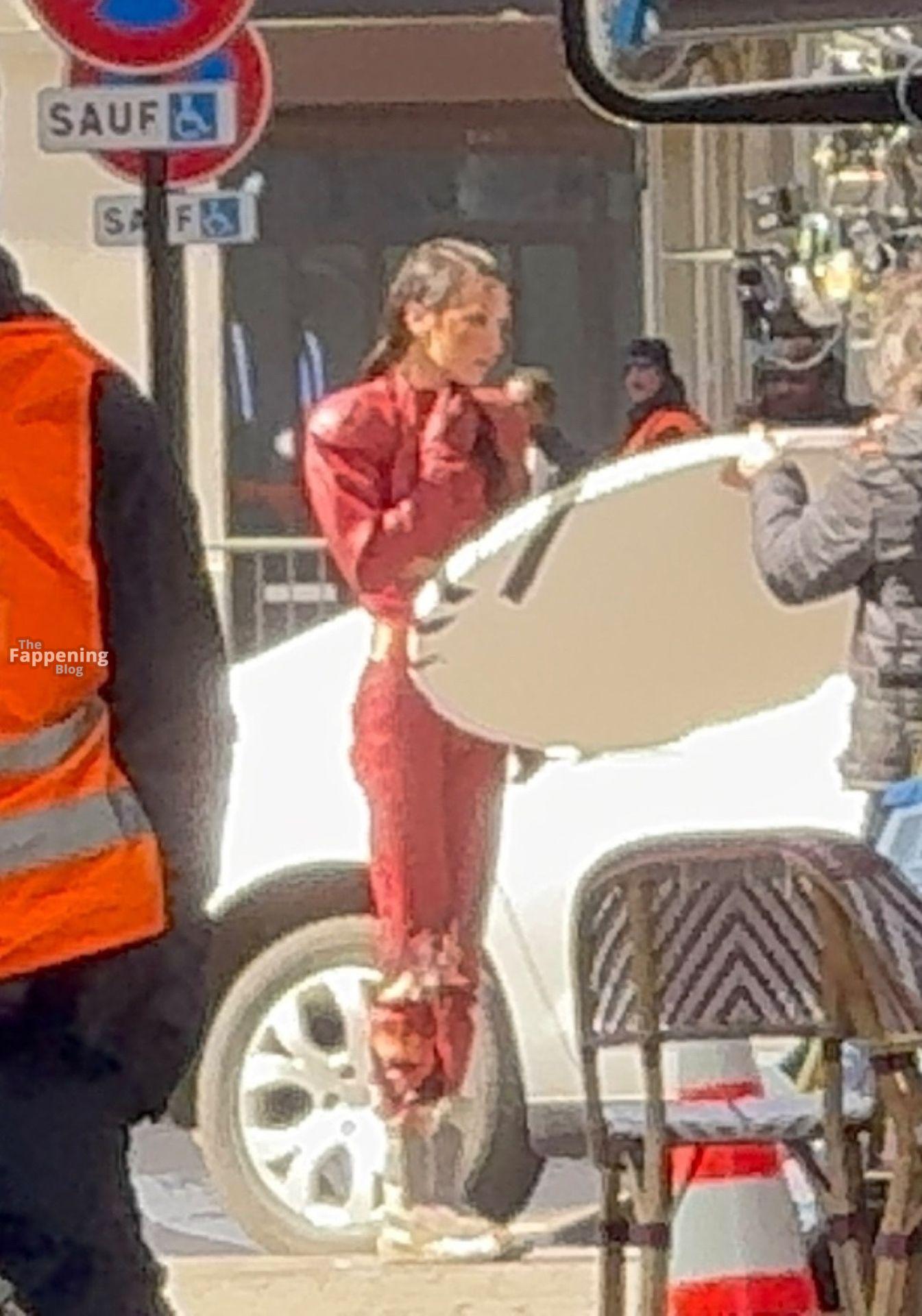 Bella Hadid a été photographiée à Paris, arborant une combinaison en cuir rouge flamboyant et chevauchant une moto. Après cette folle cascade avec un mannequin, elle joue les dures avec une vilaine blessure à la jambe pour une scène de la série « The Beauty » à Paris, France.