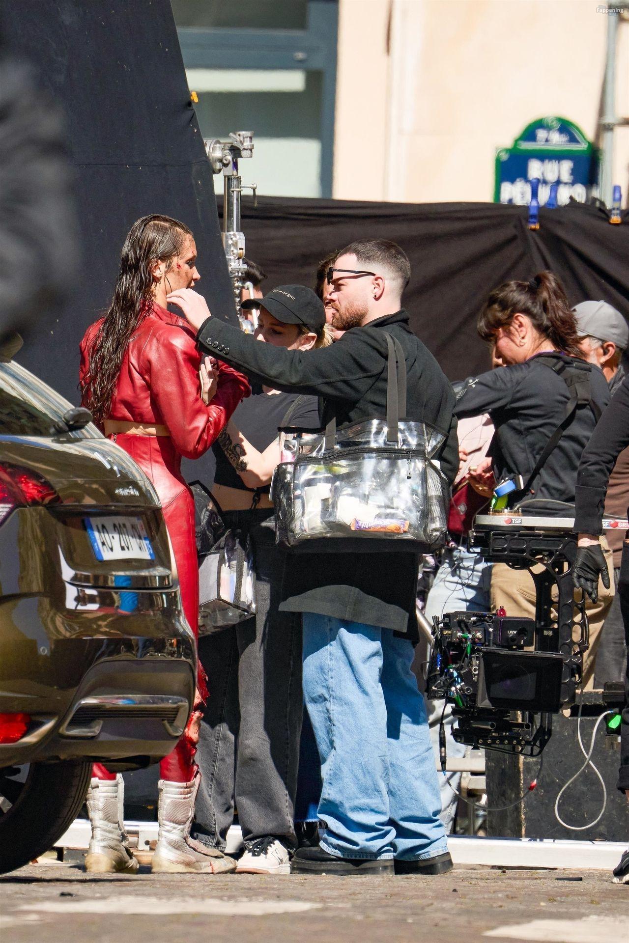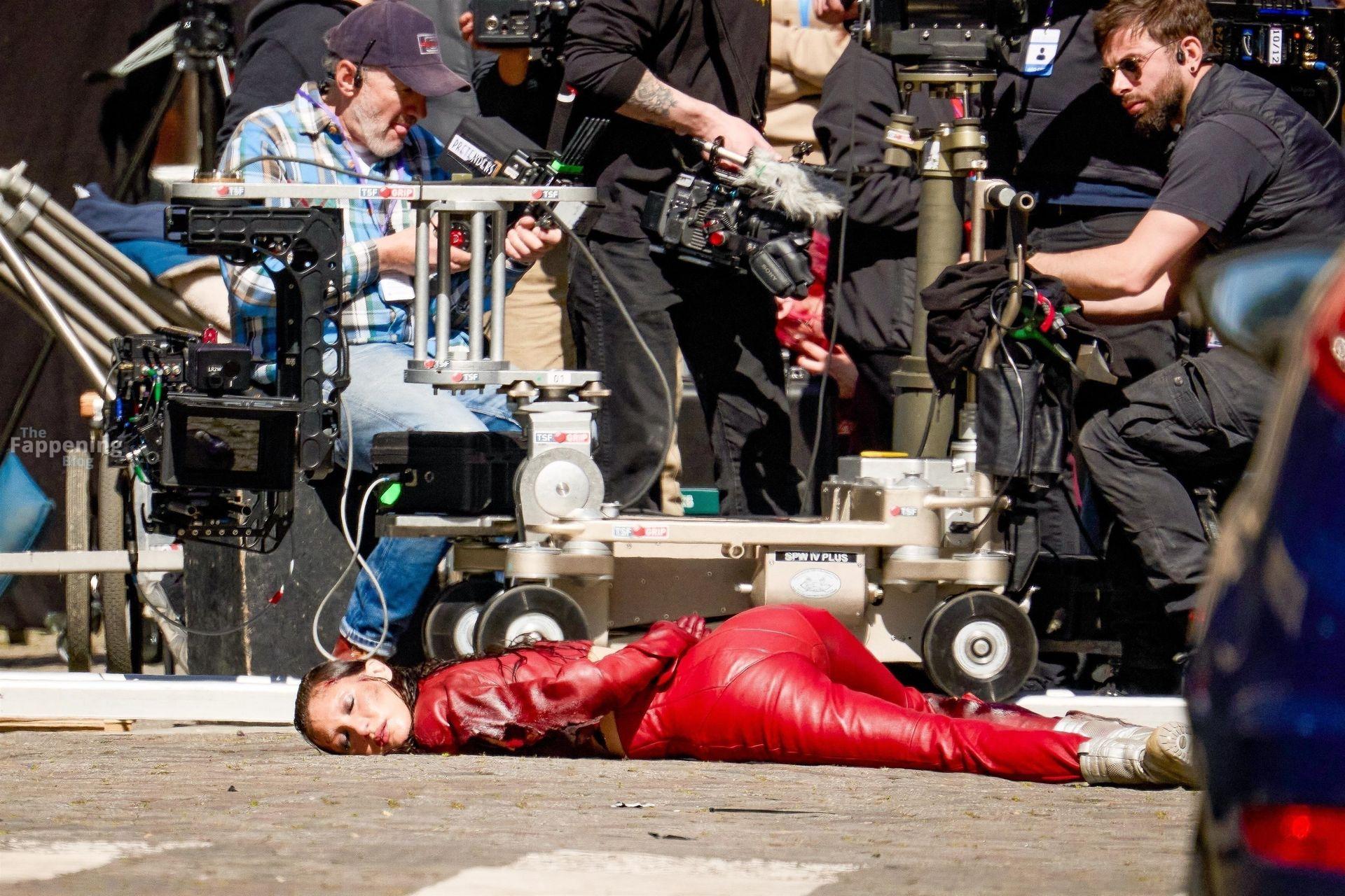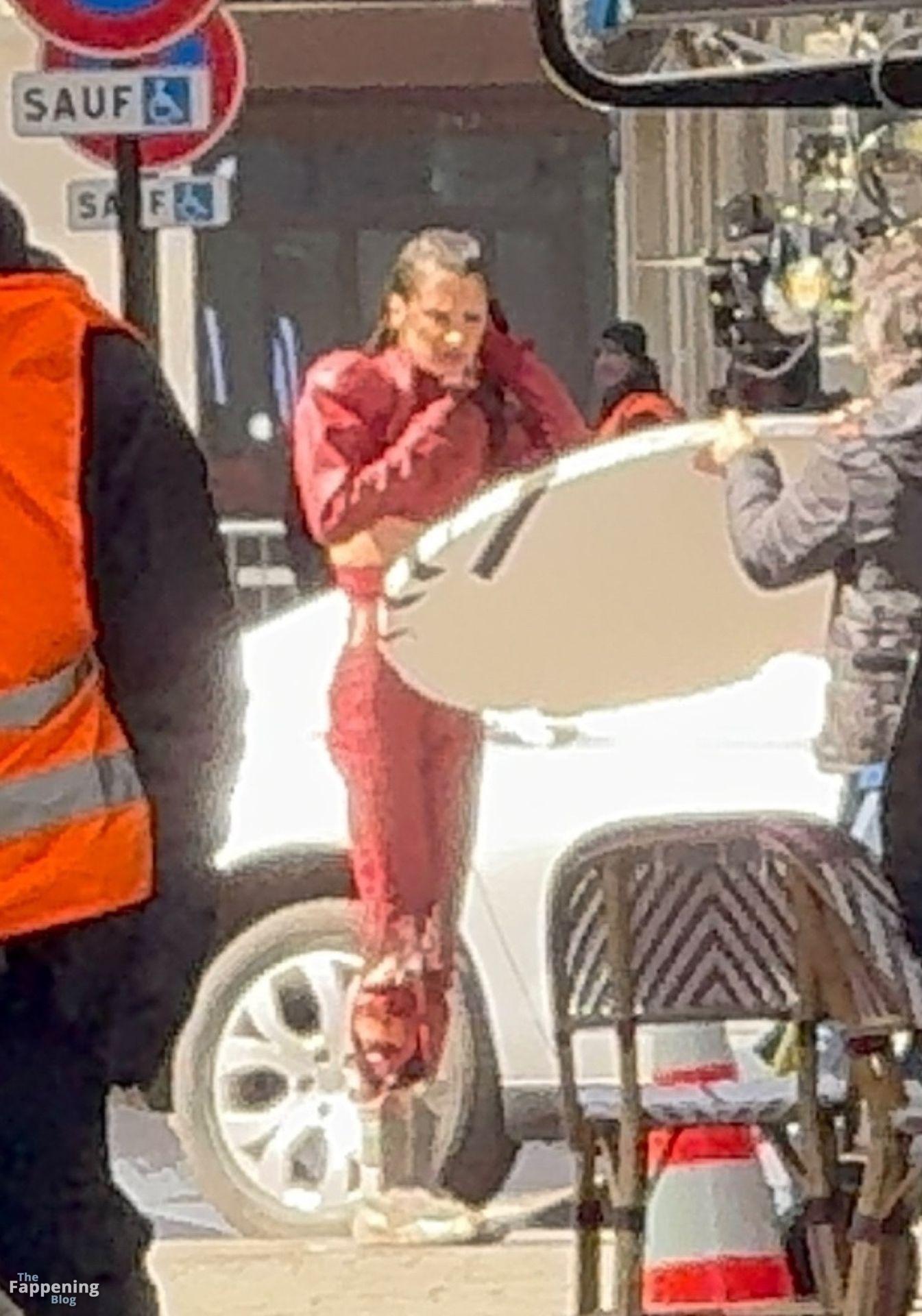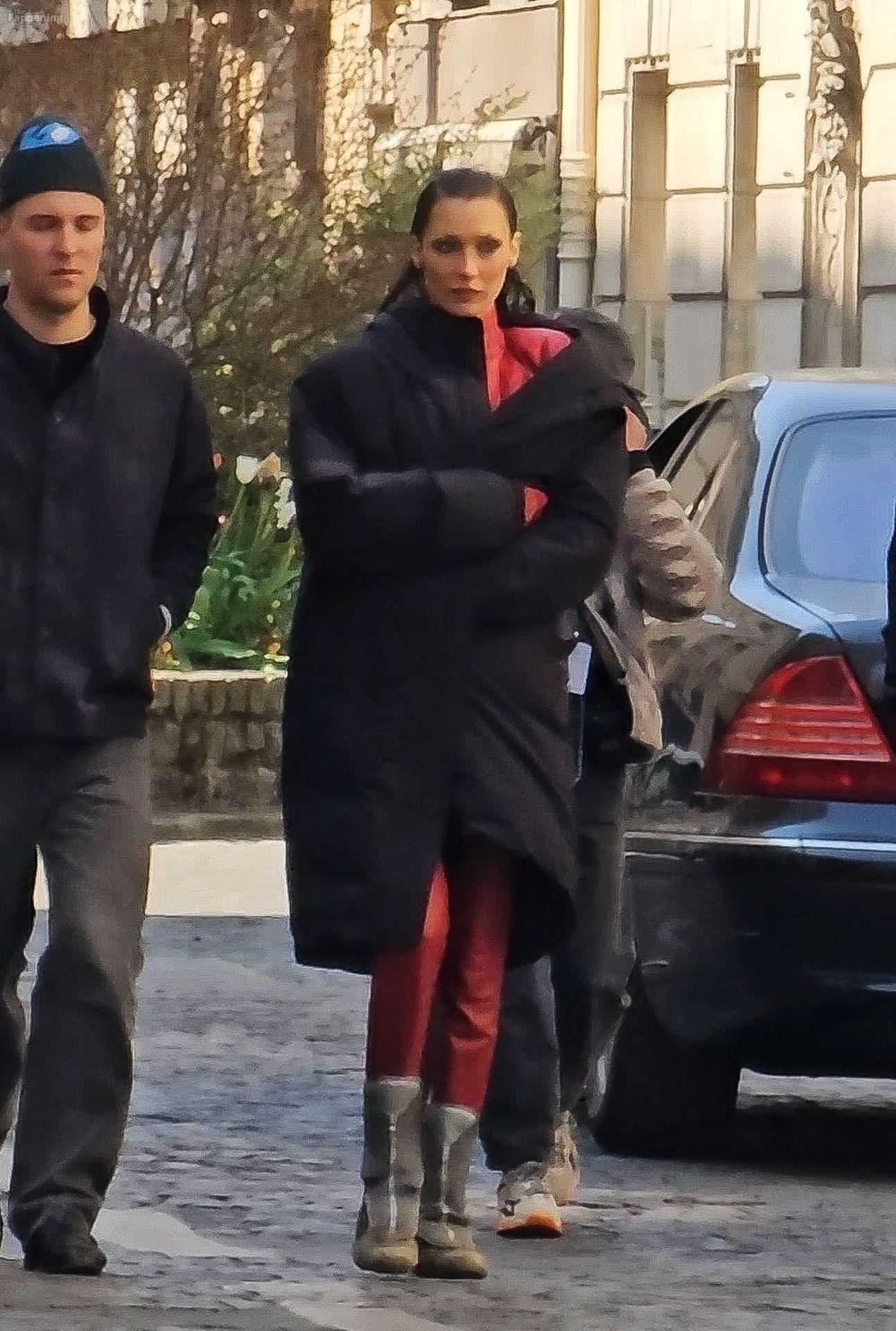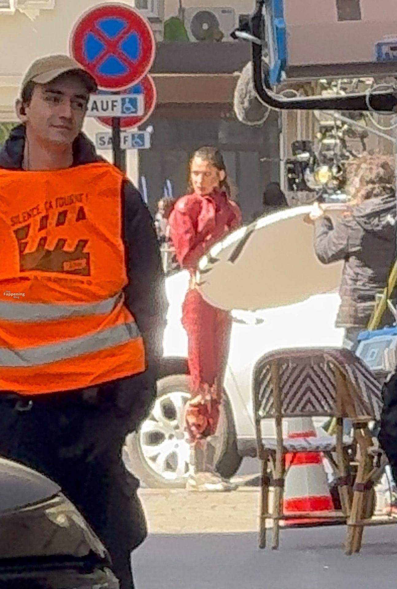 Bella Hadid a été photographiée à Paris, arborant une combinaison en cuir rouge flamboyant et chevauchant une moto. Après cette folle cascade avec un mannequin, elle joue les dures avec une vilaine blessure à la jambe pour une scène de la série « The Beauty » à Paris, France.