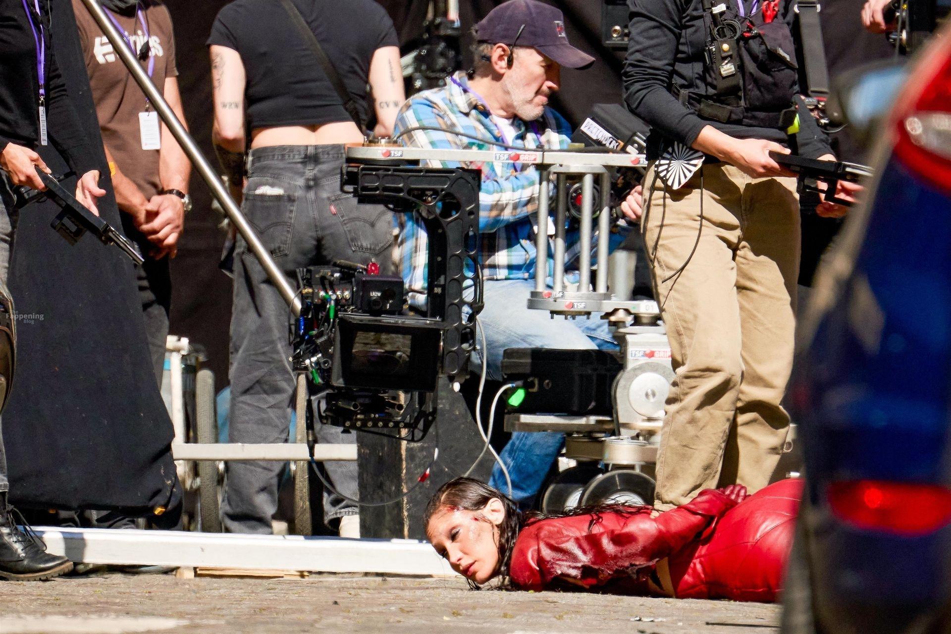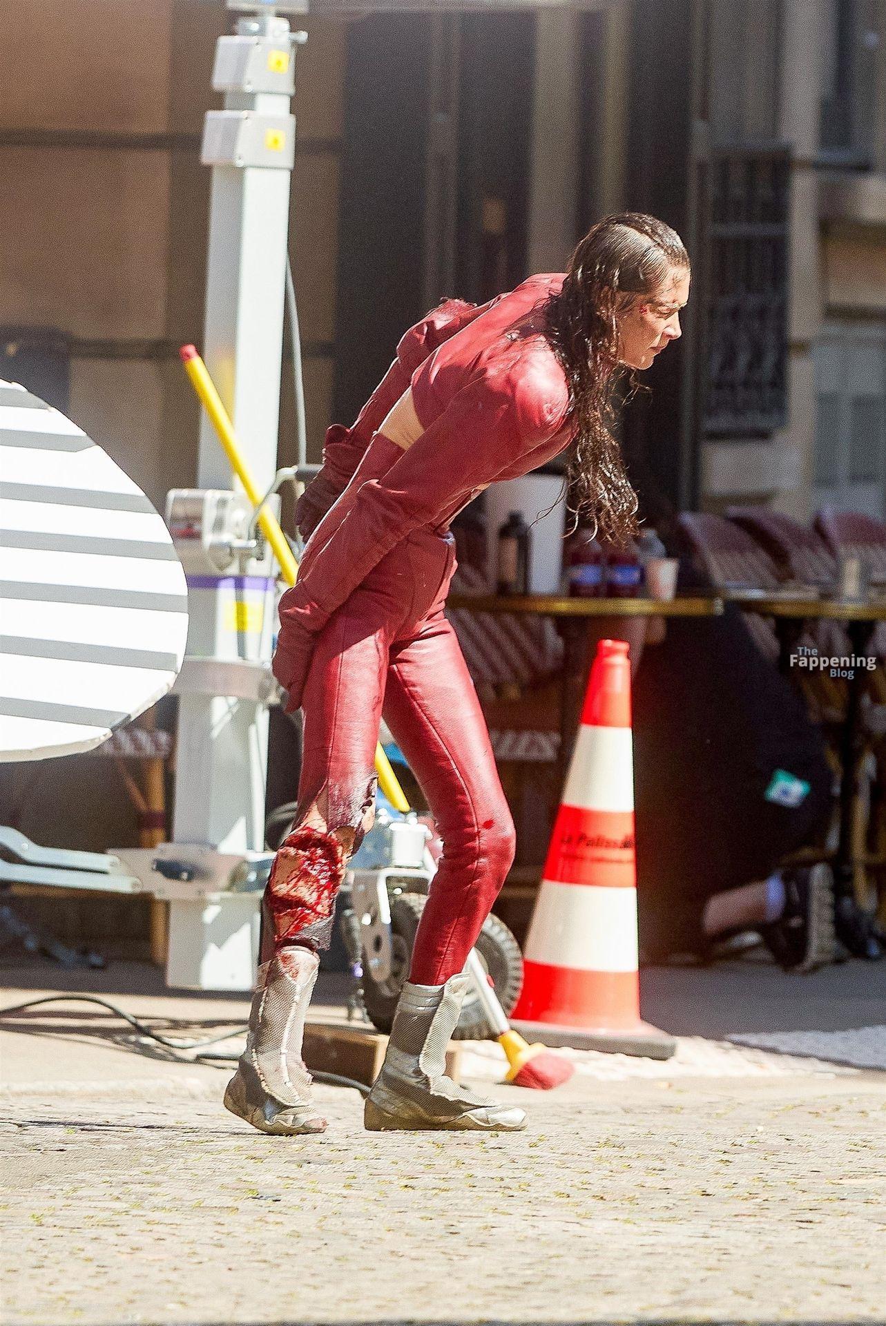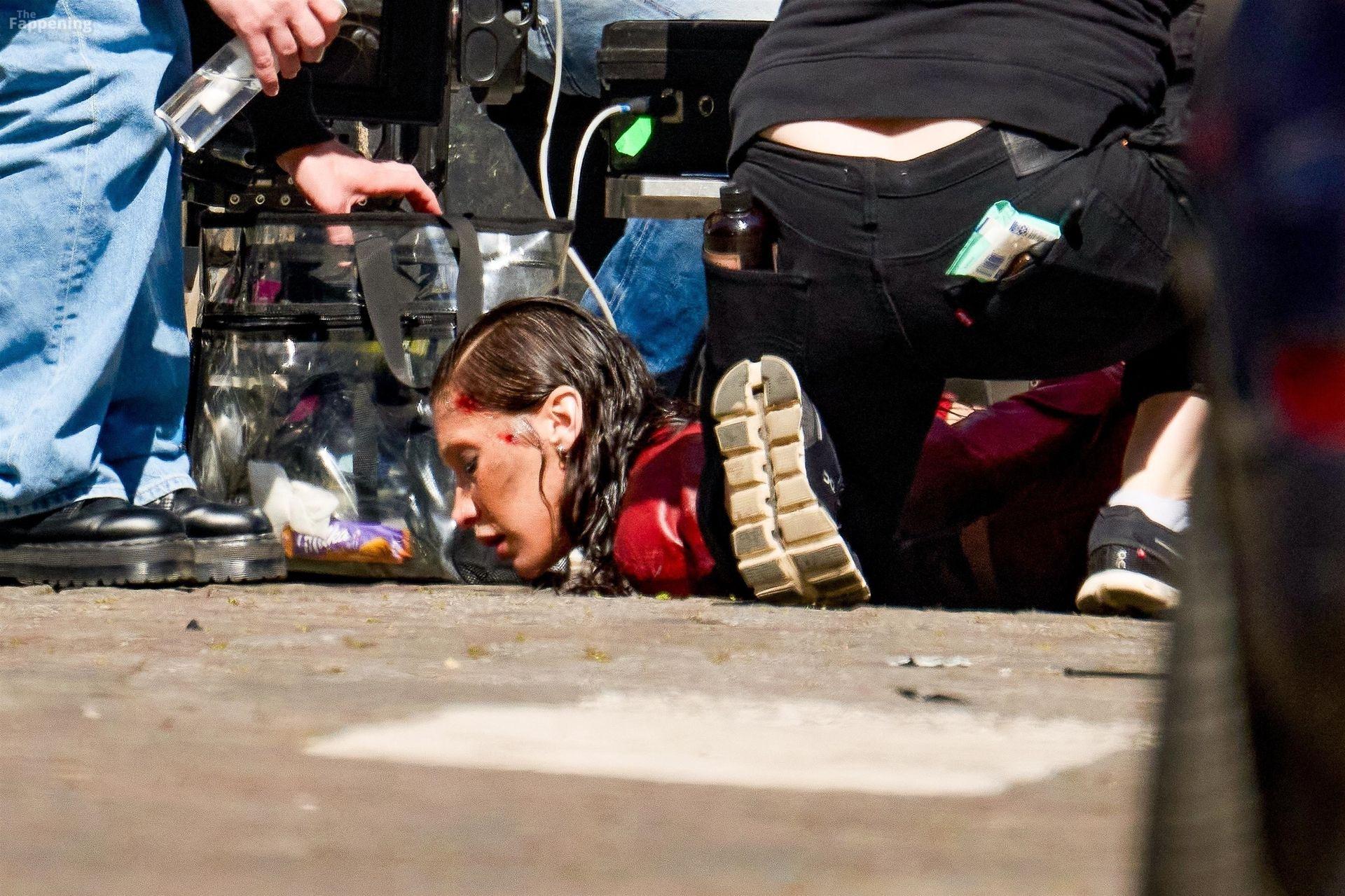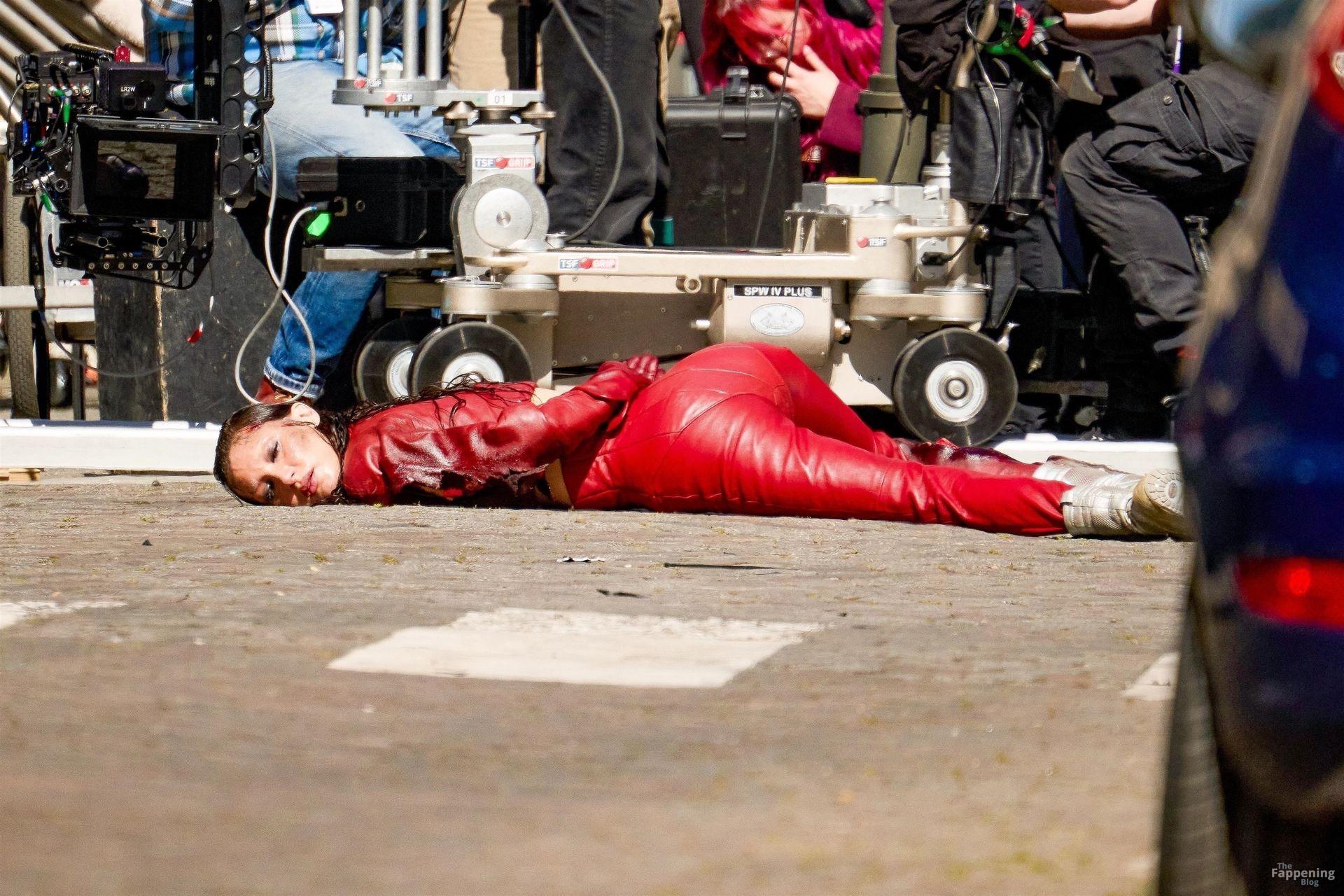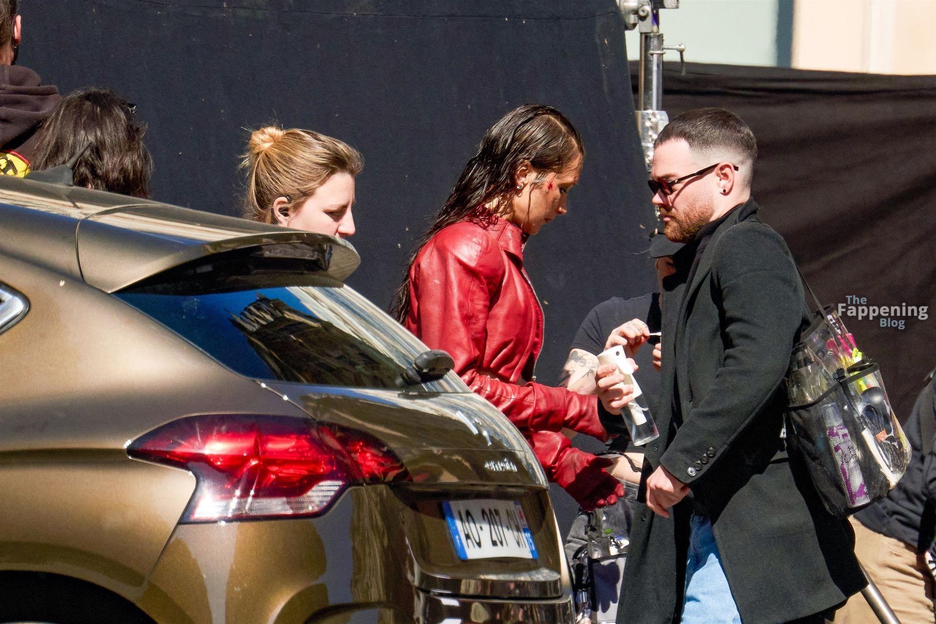 Bella Hadid a été photographiée à Paris, arborant une combinaison en cuir rouge flamboyant et chevauchant une moto. Après cette folle cascade avec un mannequin, elle joue les dures avec une vilaine blessure à la jambe pour une scène de la série « The Beauty » à Paris, France.