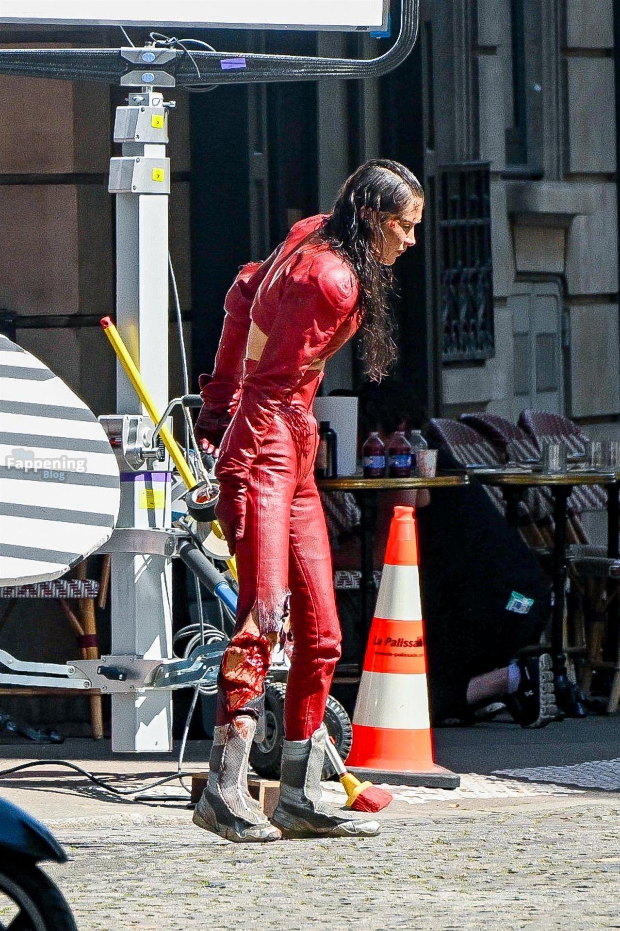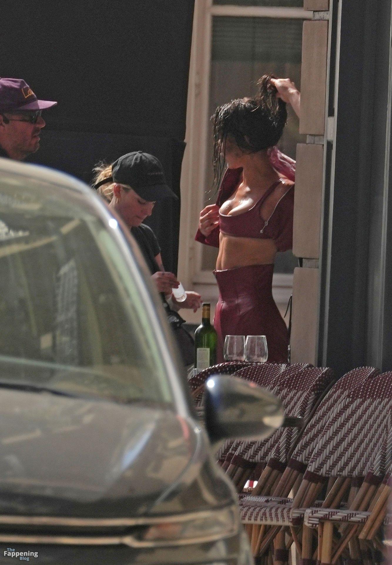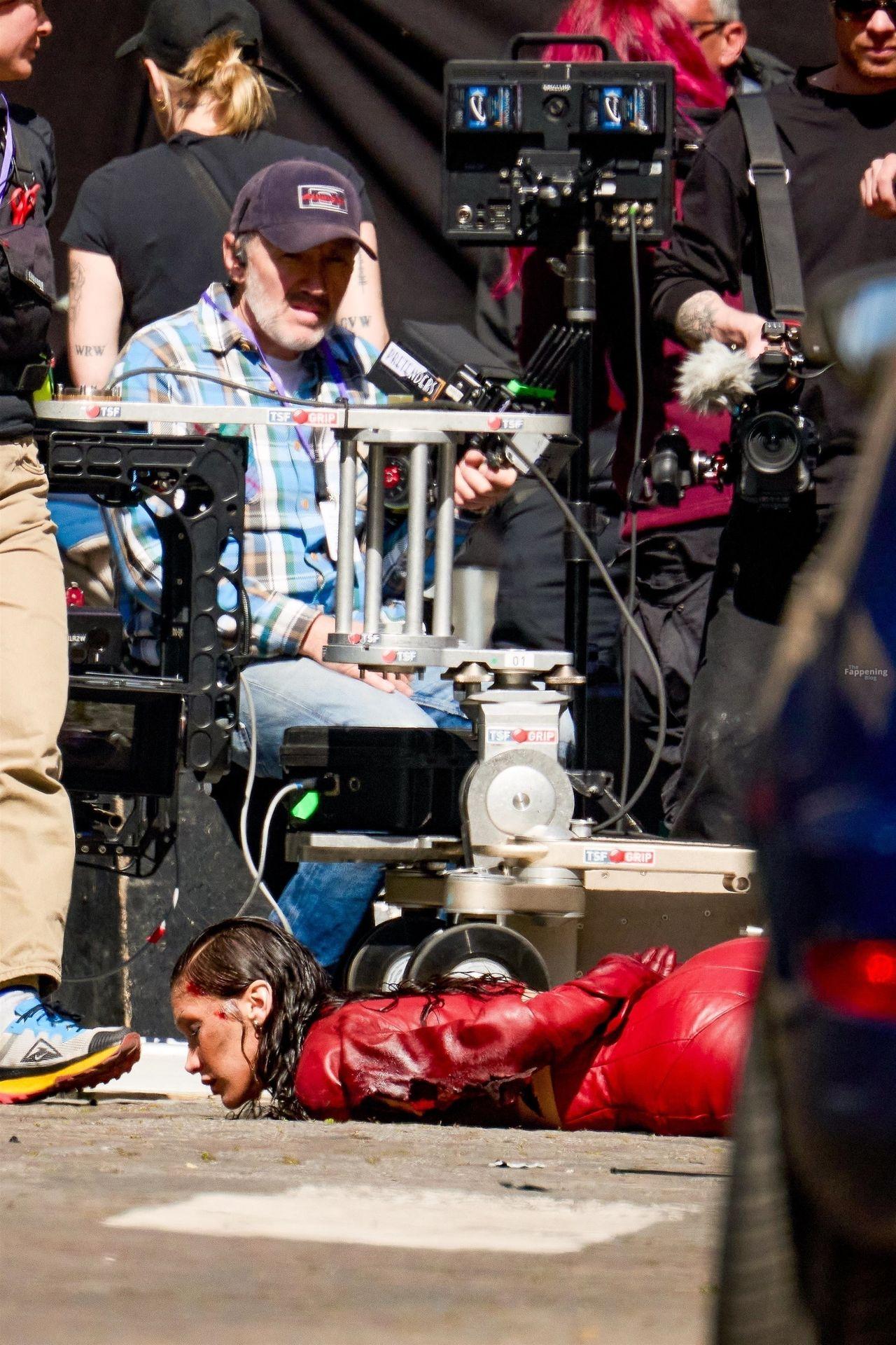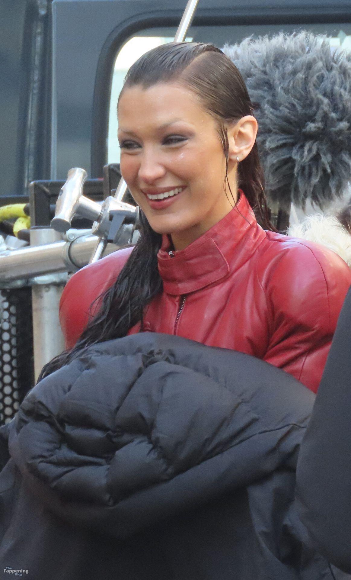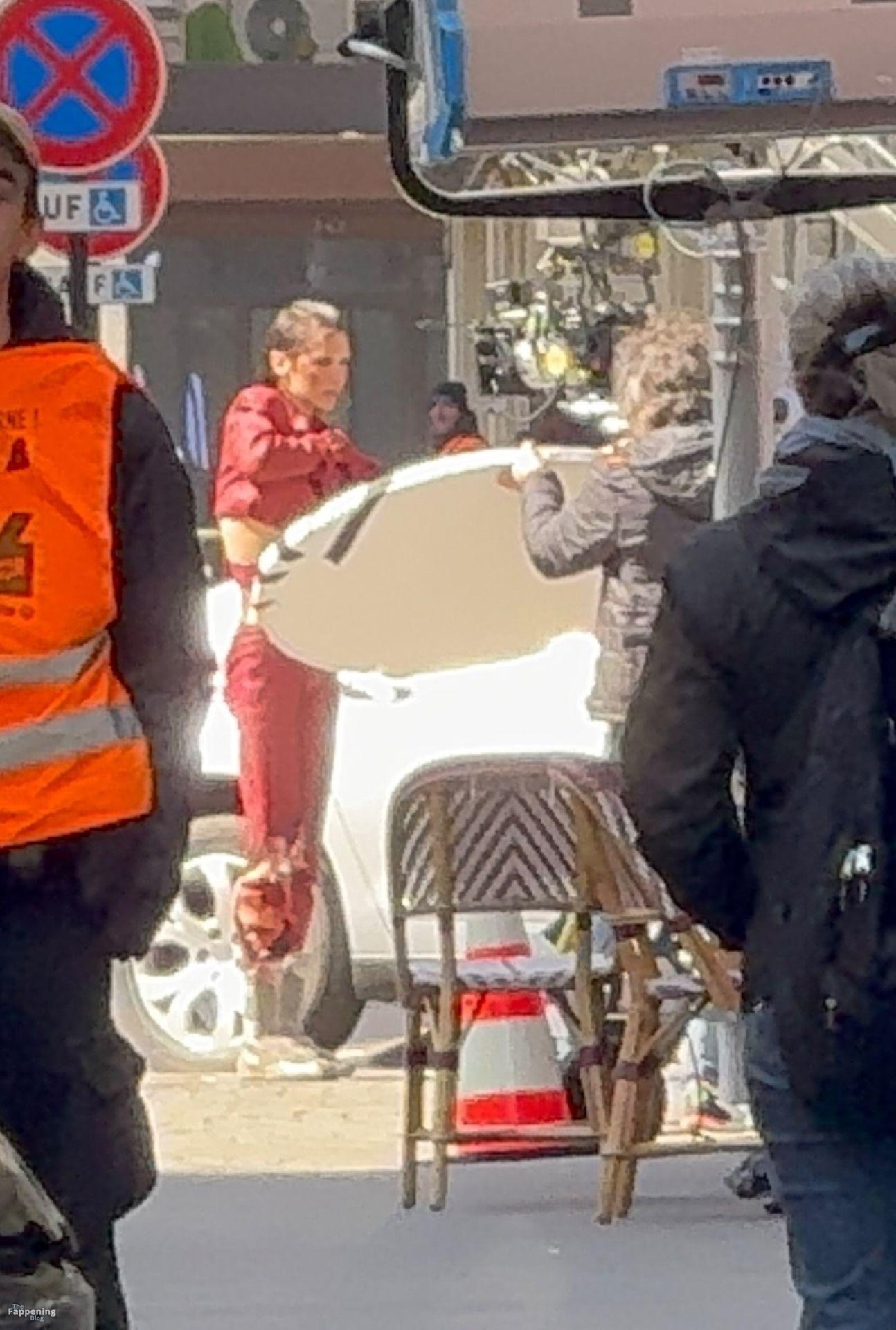 Bella Hadid a été photographiée à Paris, arborant une combinaison en cuir rouge flamboyant et chevauchant une moto. Après cette folle cascade avec un mannequin, elle joue les dures avec une vilaine blessure à la jambe pour une scène de la série « The Beauty » à Paris, France.
