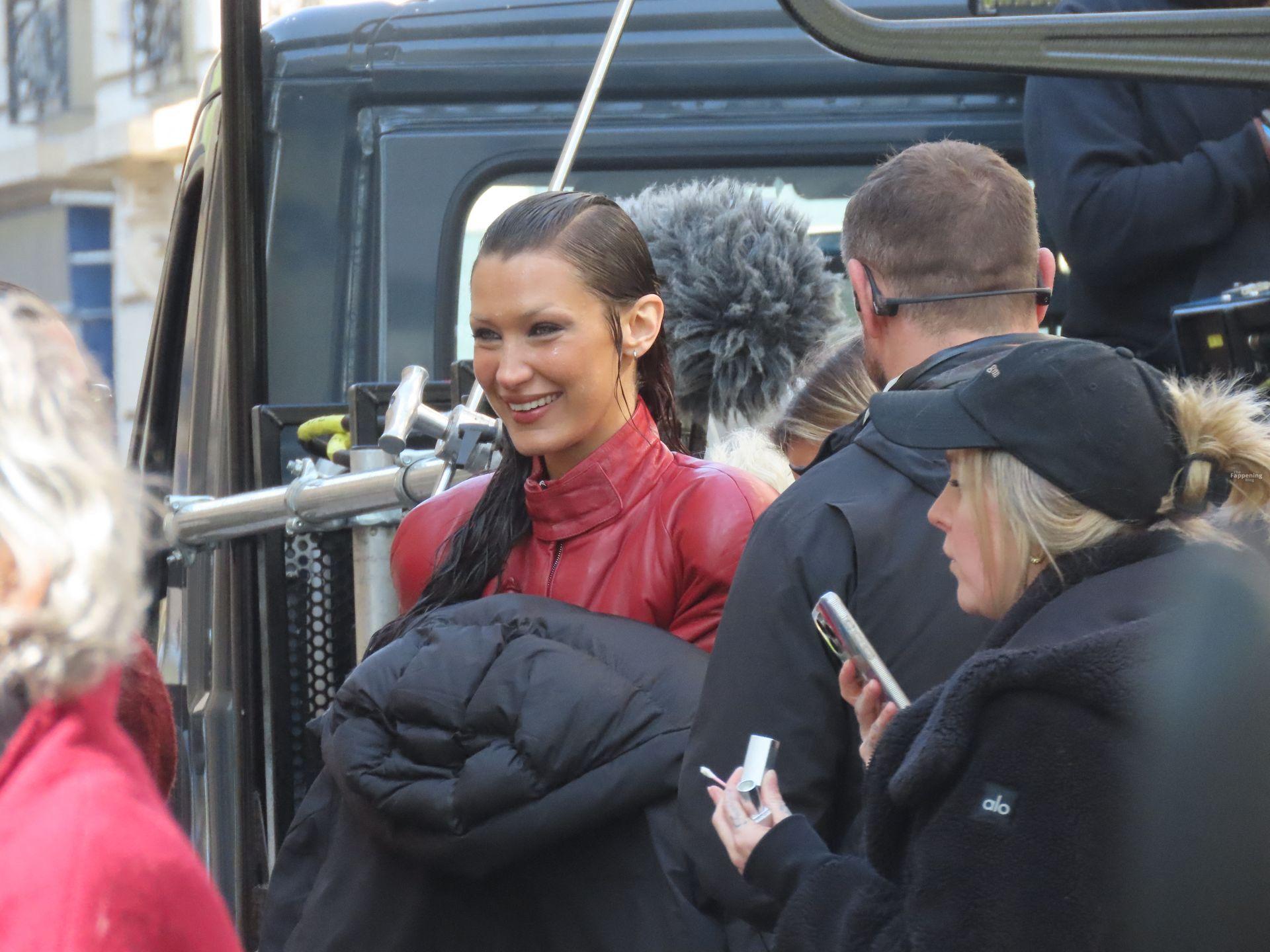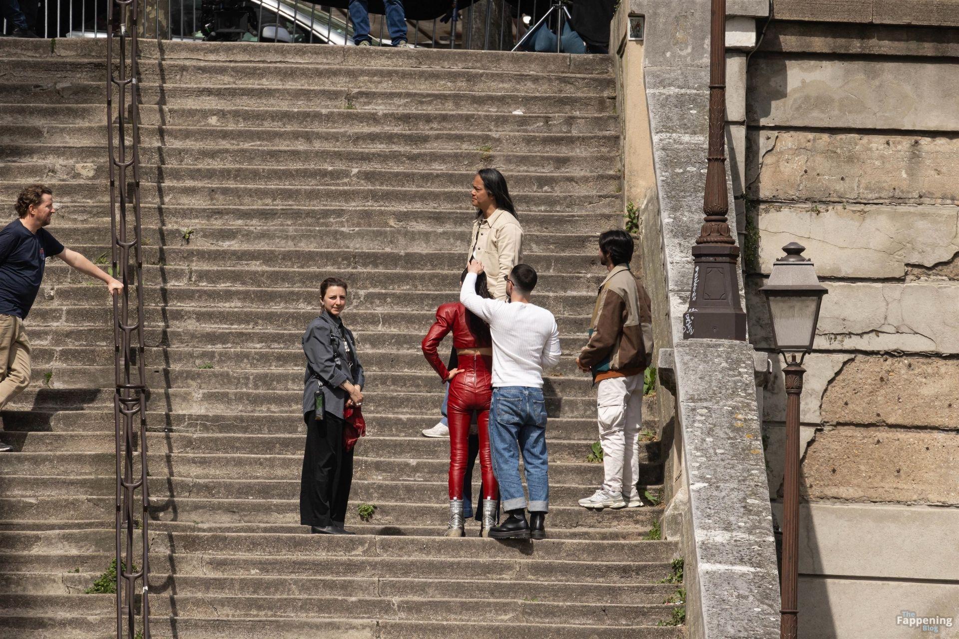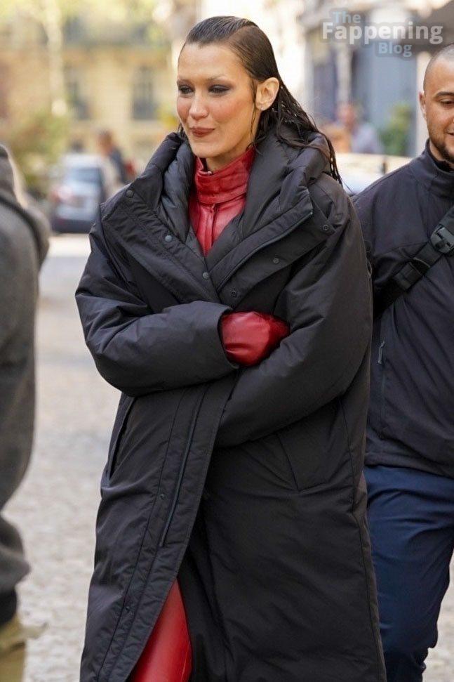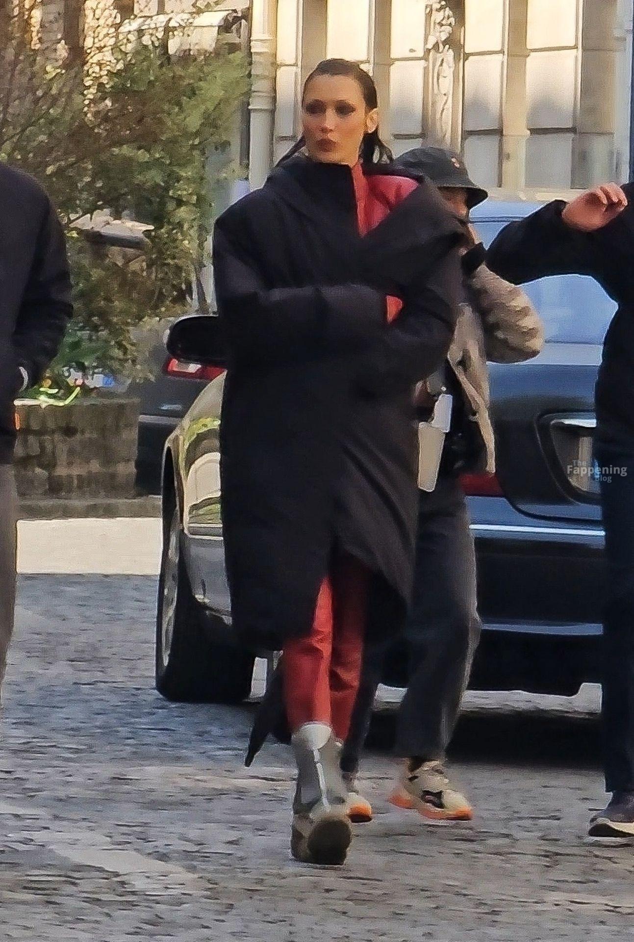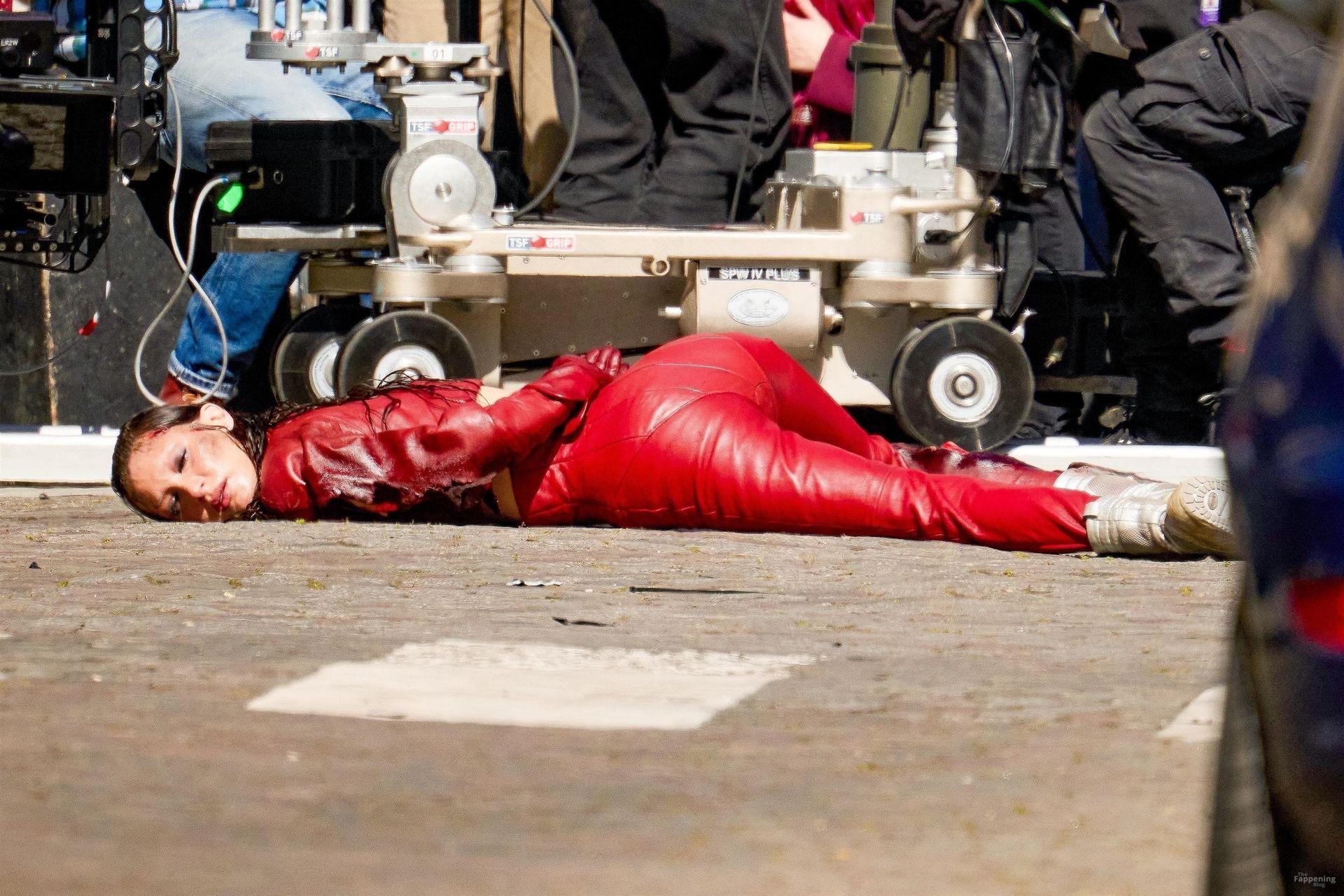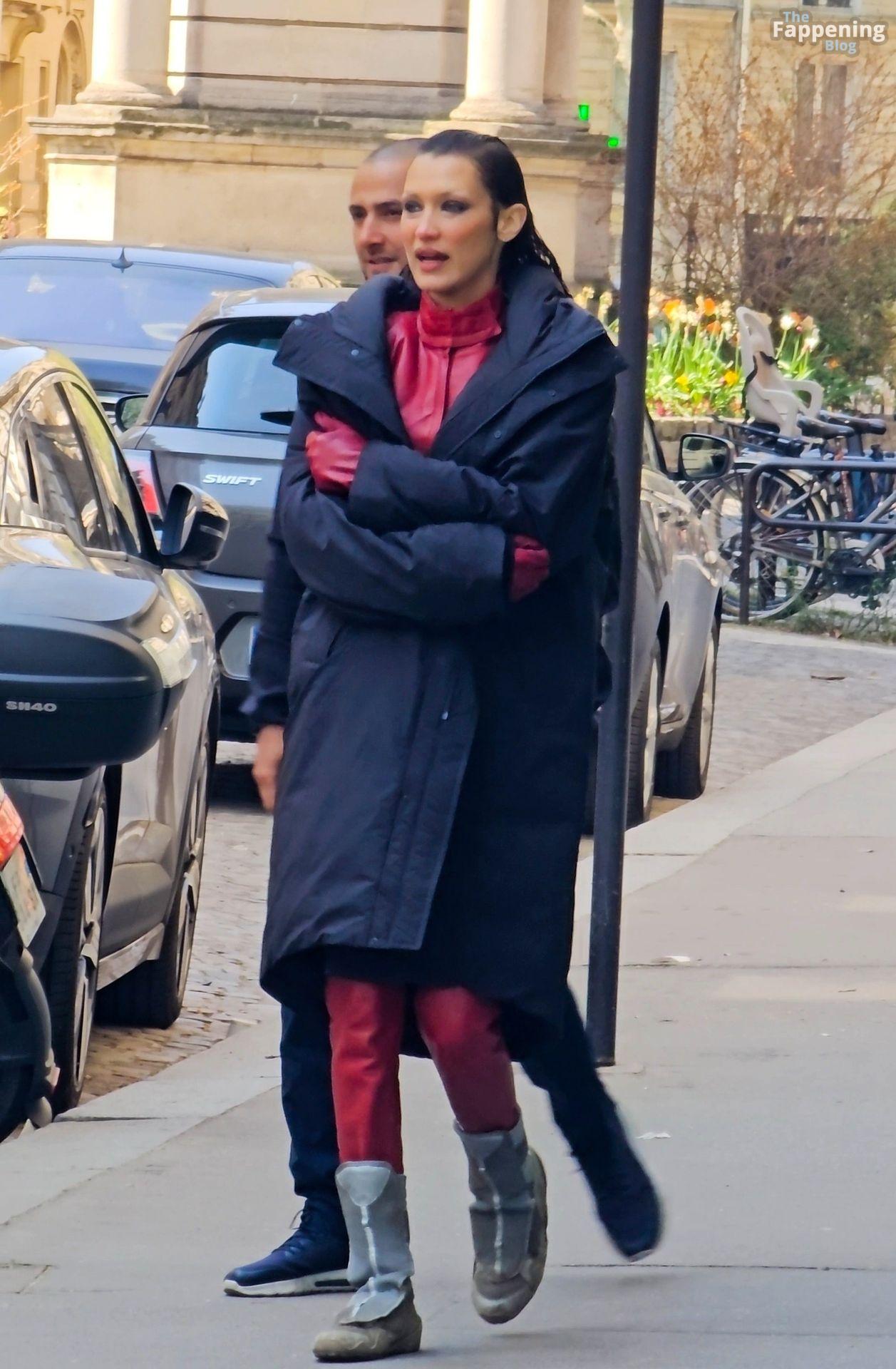 Bella Hadid a été photographiée à Paris, arborant une combinaison en cuir rouge flamboyant et chevauchant une moto. Après cette folle cascade avec un mannequin, elle joue les dures avec une vilaine blessure à la jambe pour une scène de la série « The Beauty » à Paris, France.