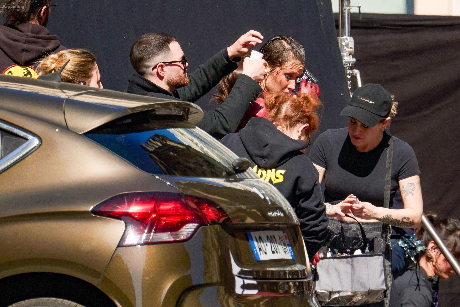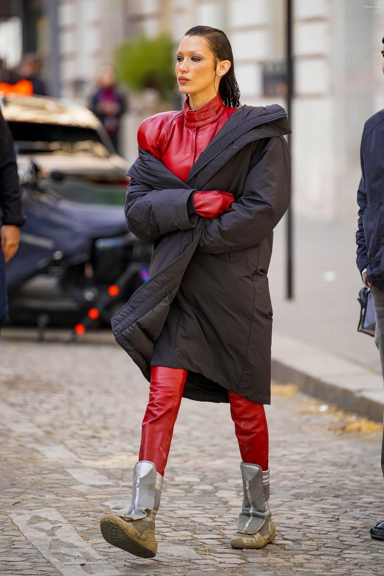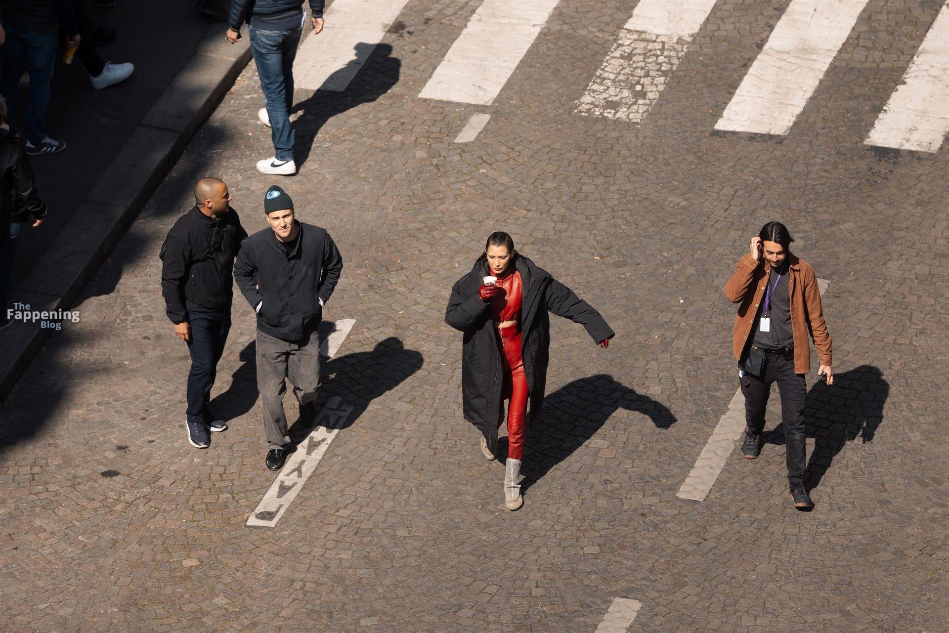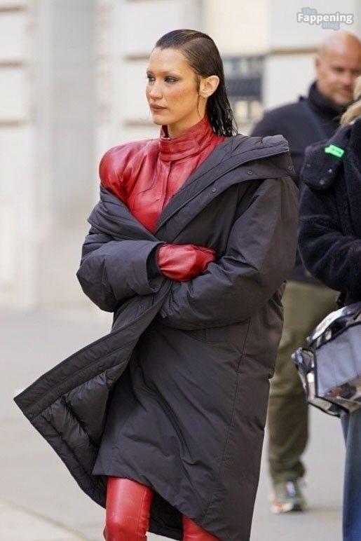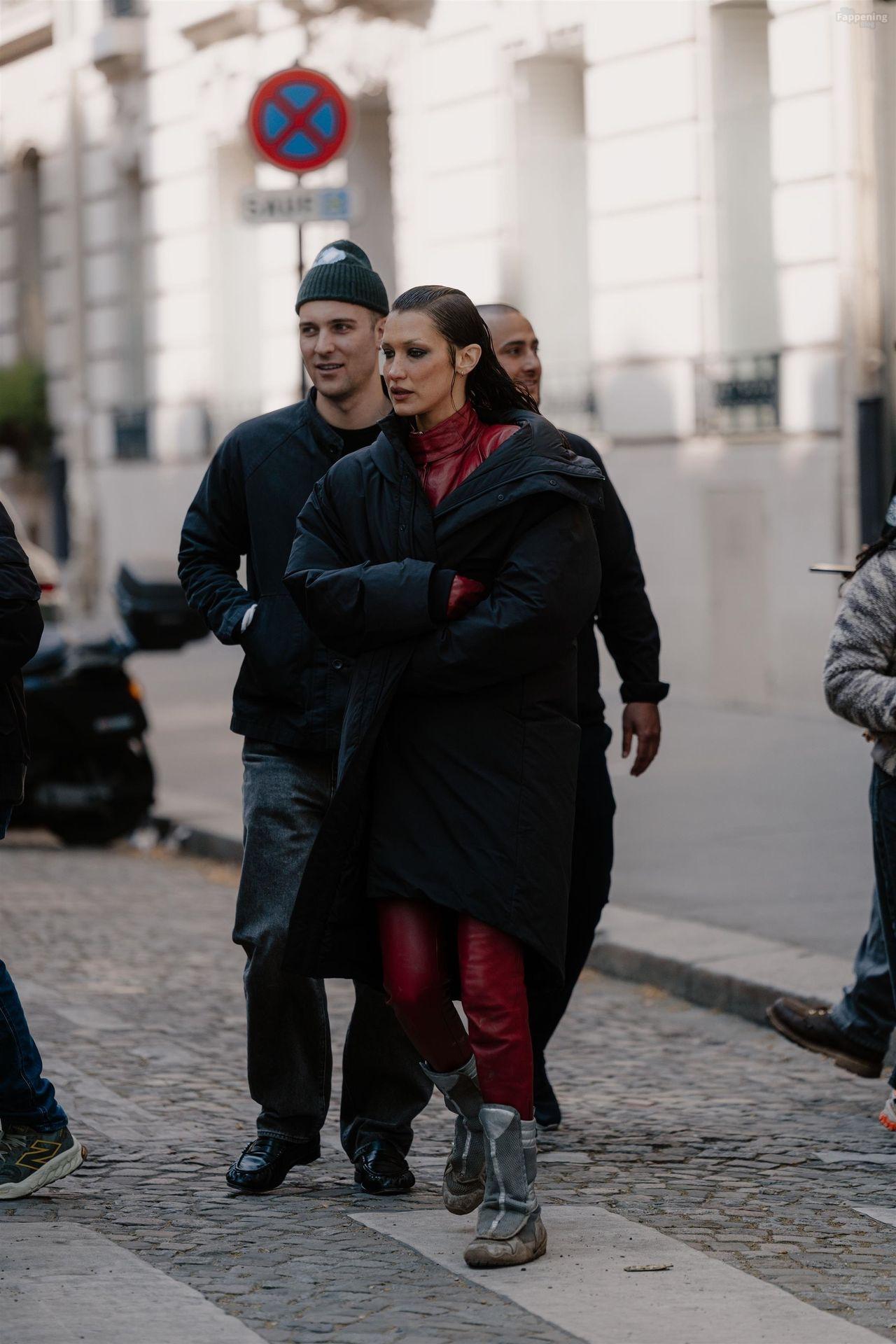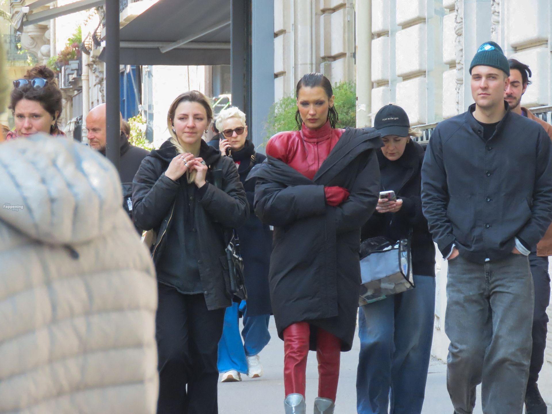 Bella Hadid a été photographiée à Paris, arborant une combinaison en cuir rouge flamboyant et chevauchant une moto. Après cette folle cascade avec un mannequin, elle joue les dures avec une vilaine blessure à la jambe pour une scène de la série « The Beauty » à Paris, France.