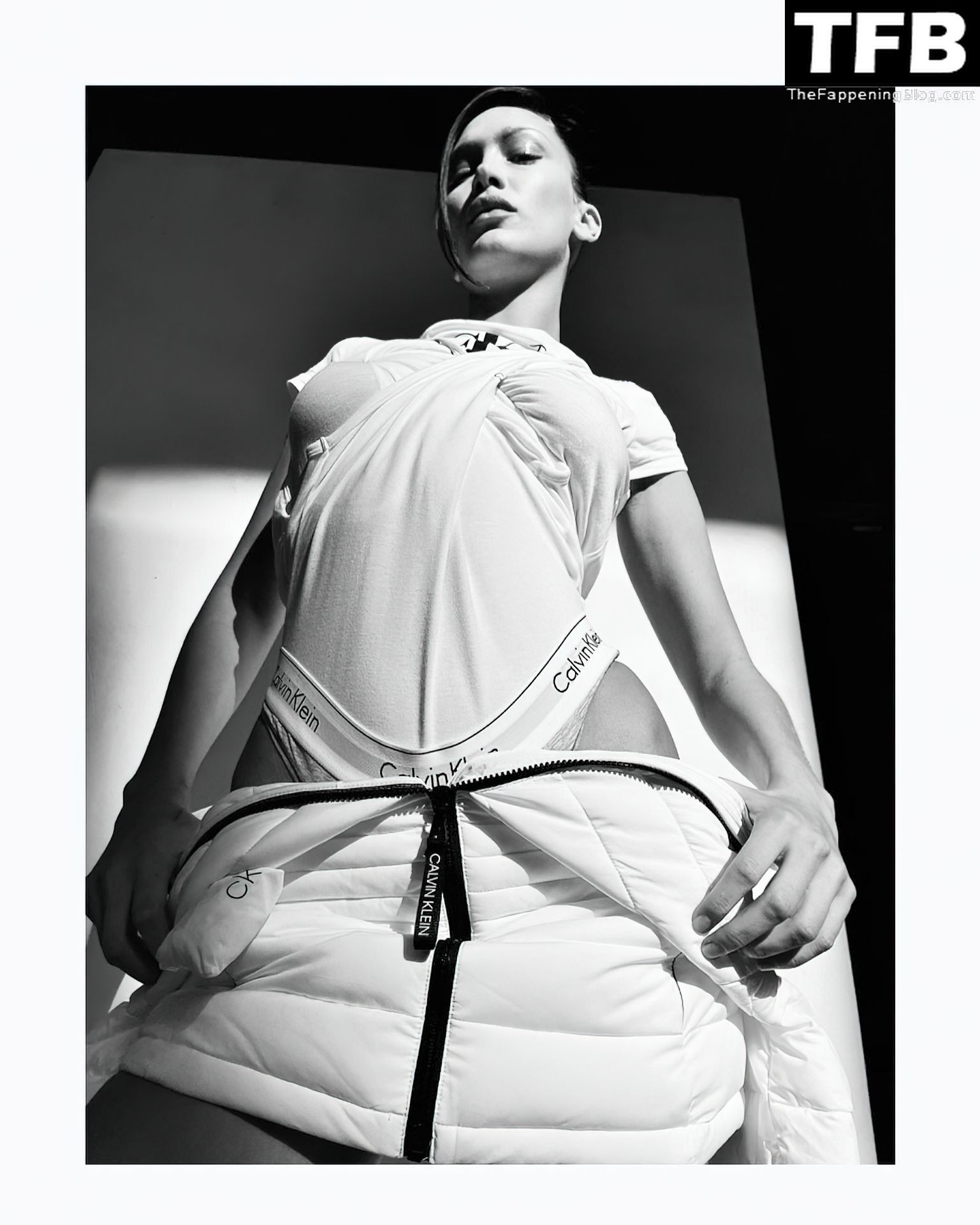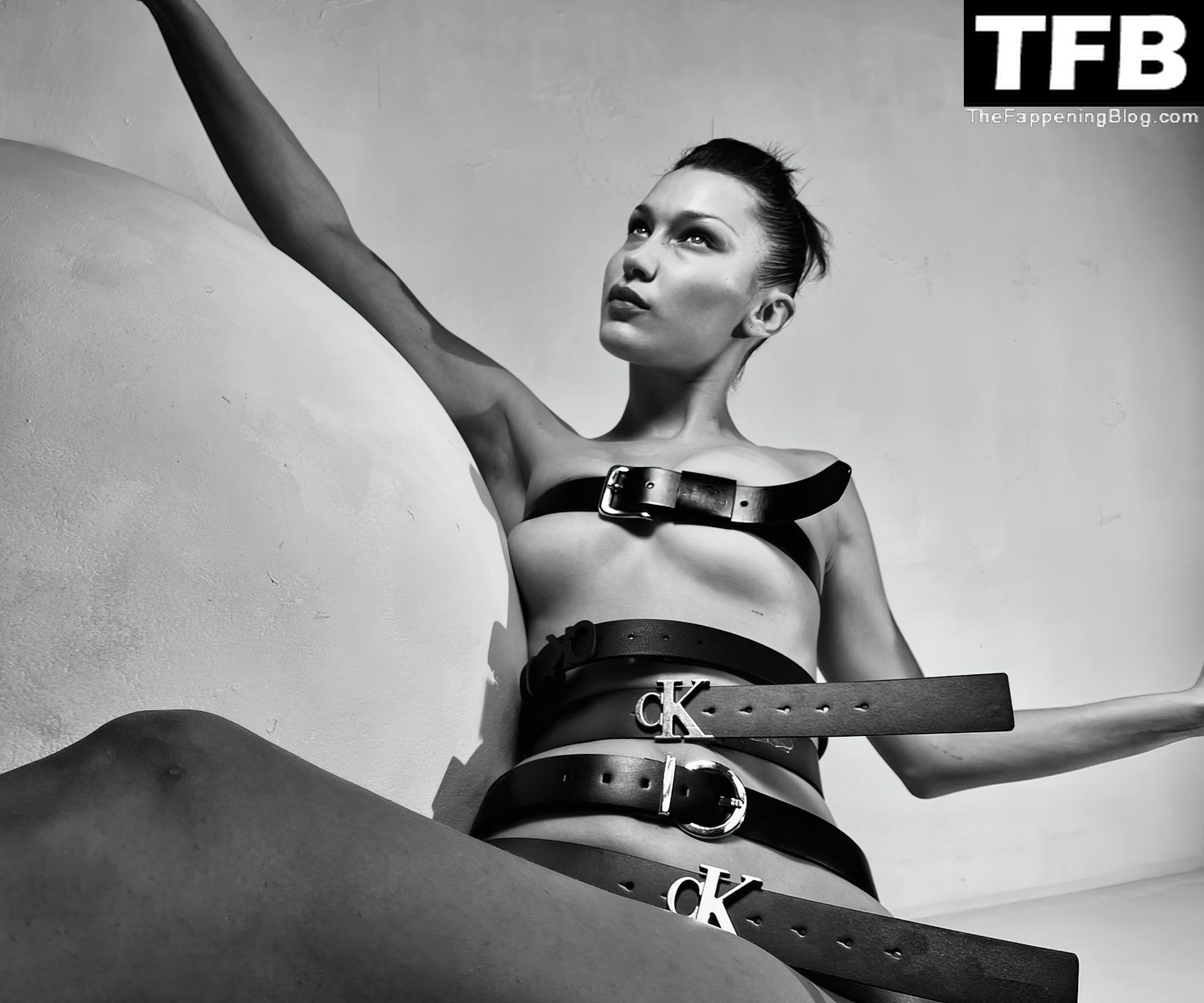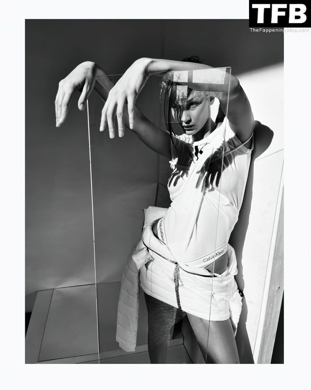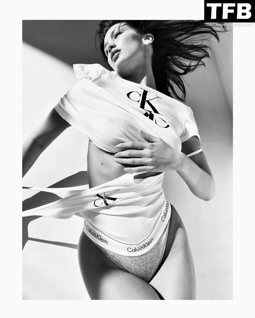 La star de la télé-réalité et mannequin Bella Hadid montre son corps presque nu et nous taquine avec ses seins sexy en posant dans une séance photo de Katie Burnett pour Calvin Klein (2021).
