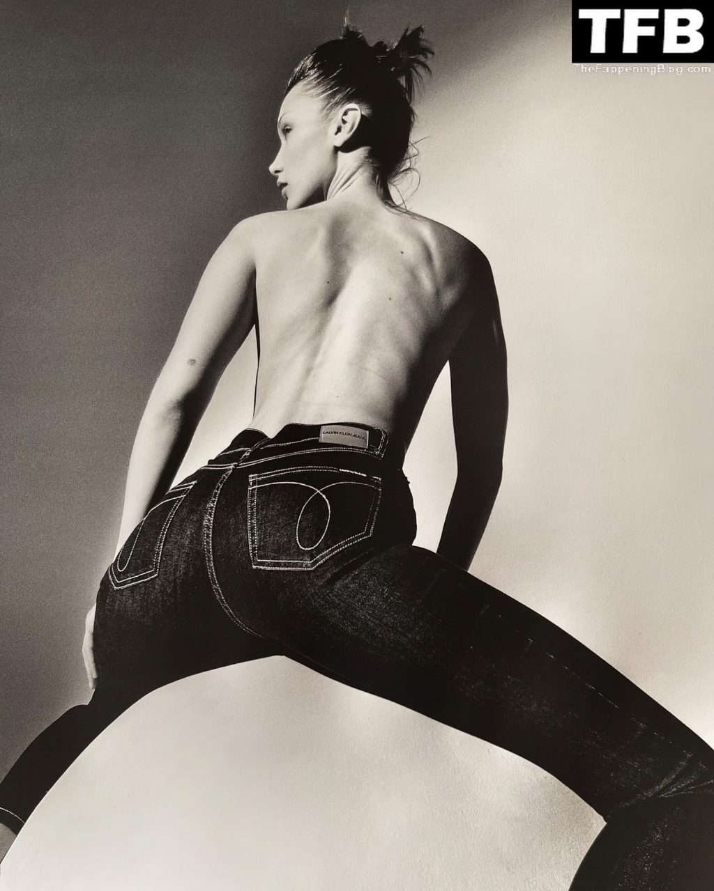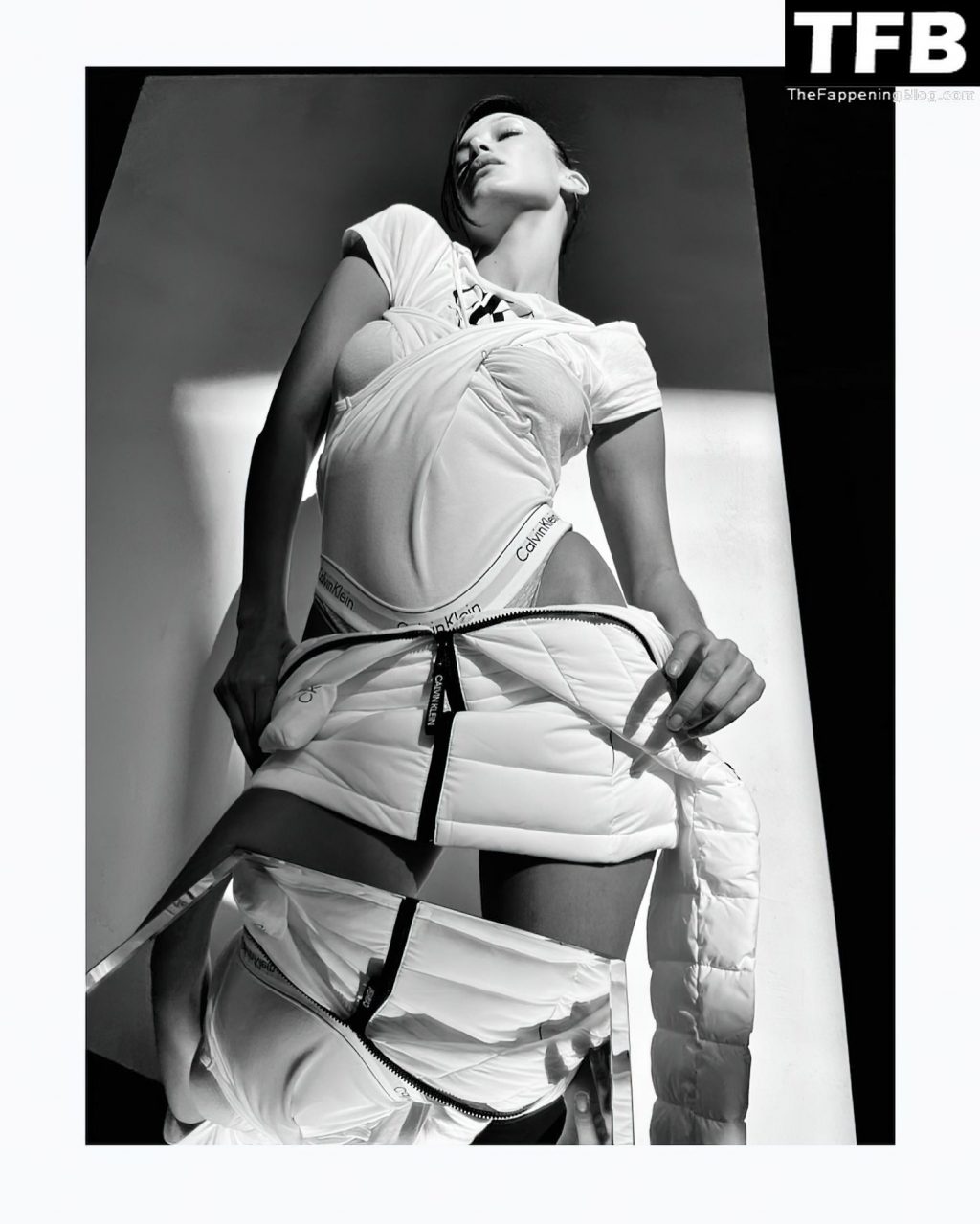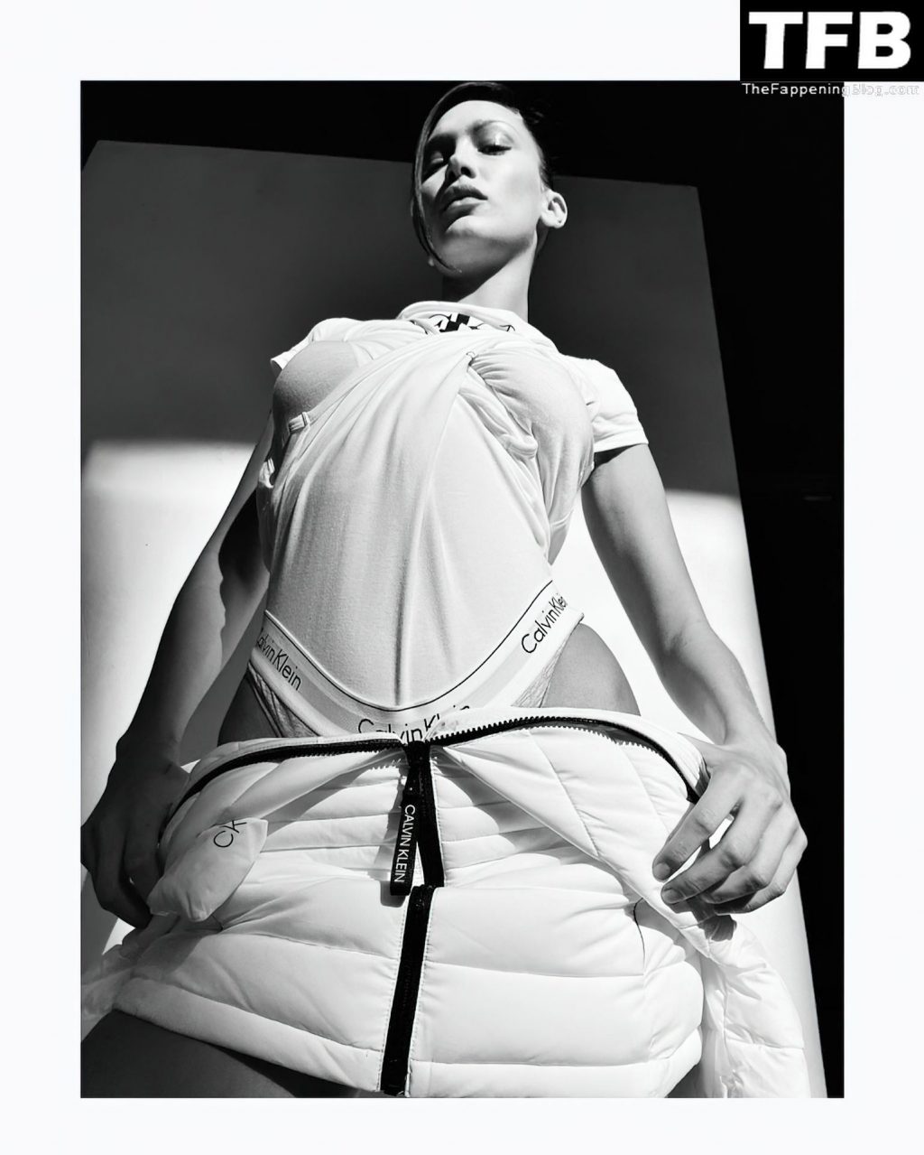 La star de la télé-réalité et mannequin Bella Hadid montre son corps presque nu et nous taquine avec ses seins sexy en posant dans une séance photo de Katie Burnett pour Calvin Klein (2021).