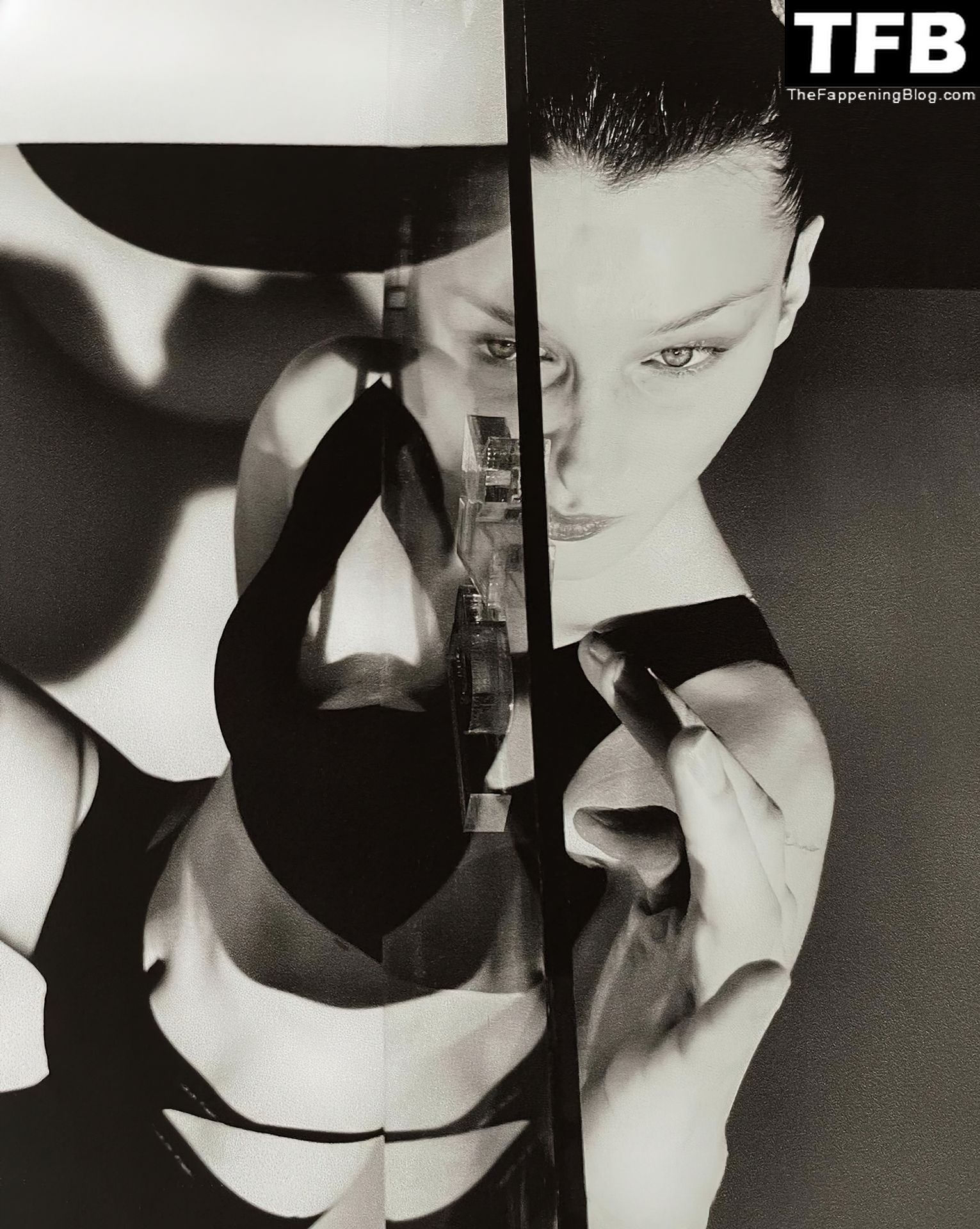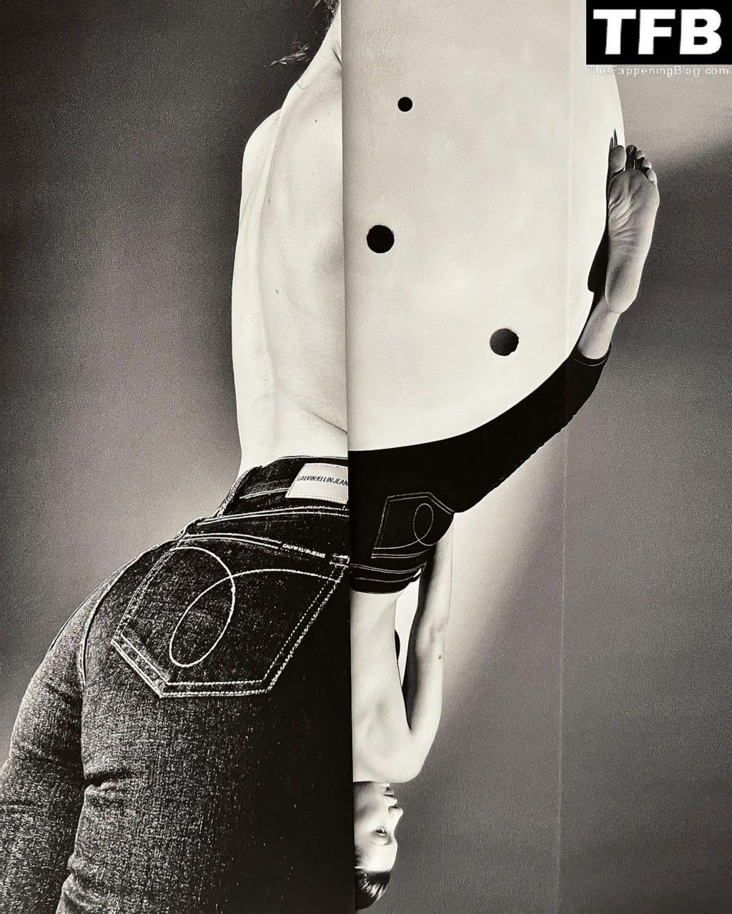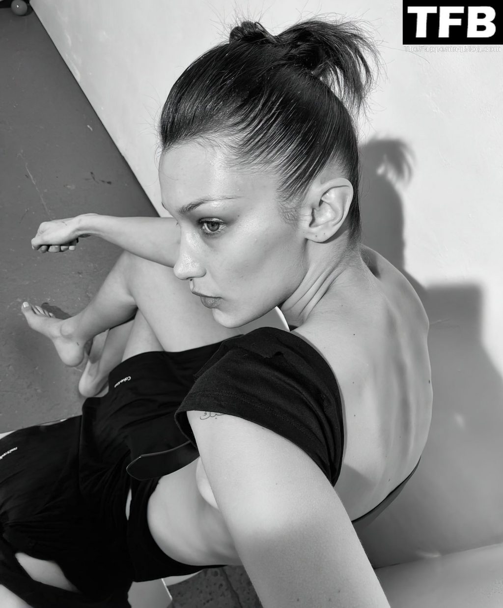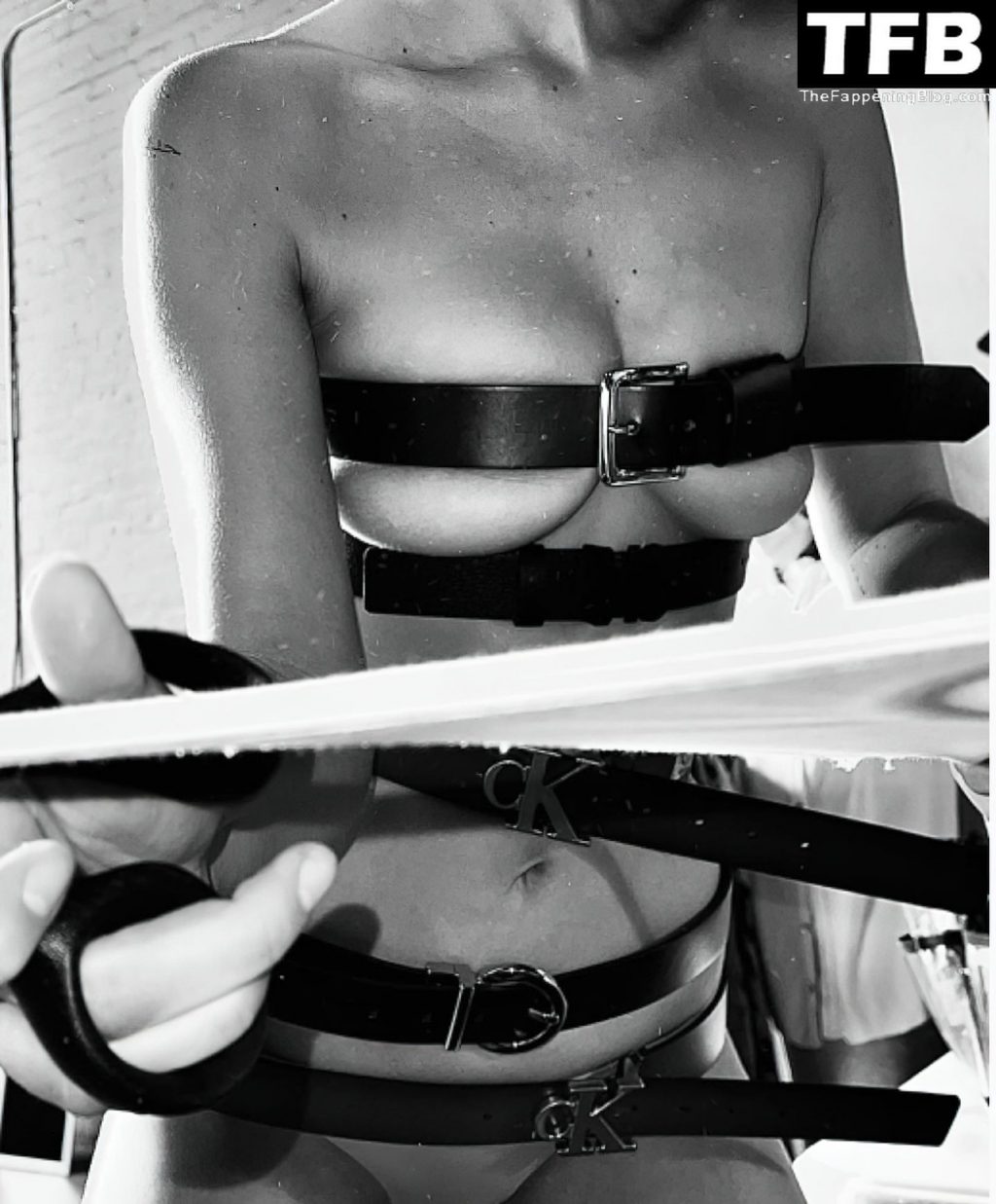 La star de la télé-réalité et mannequin Bella Hadid montre son corps presque nu et nous taquine avec ses seins sexy en posant dans une séance photo de Katie Burnett pour Calvin Klein (2021).