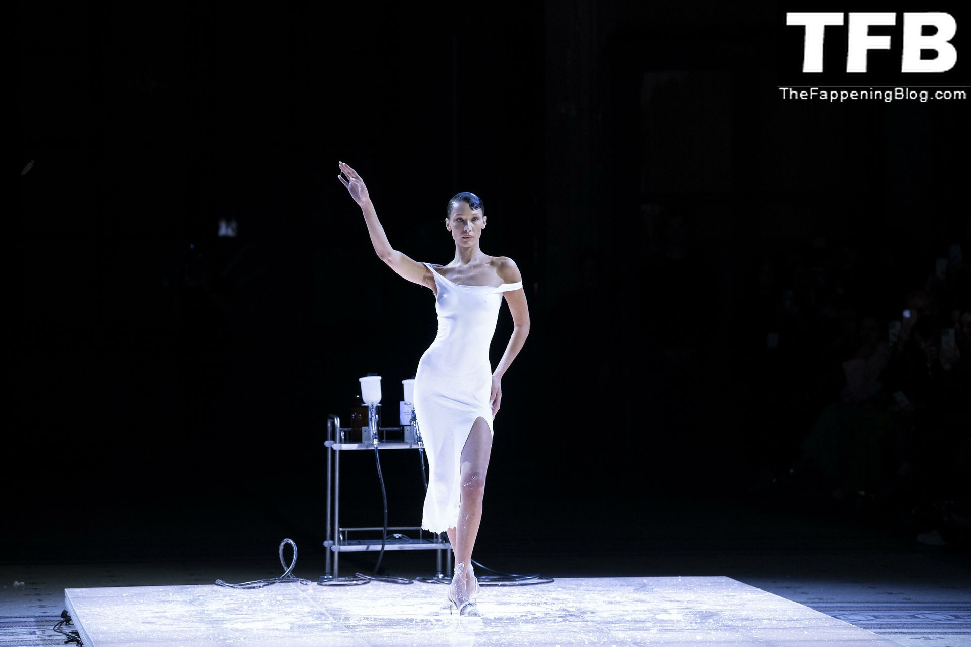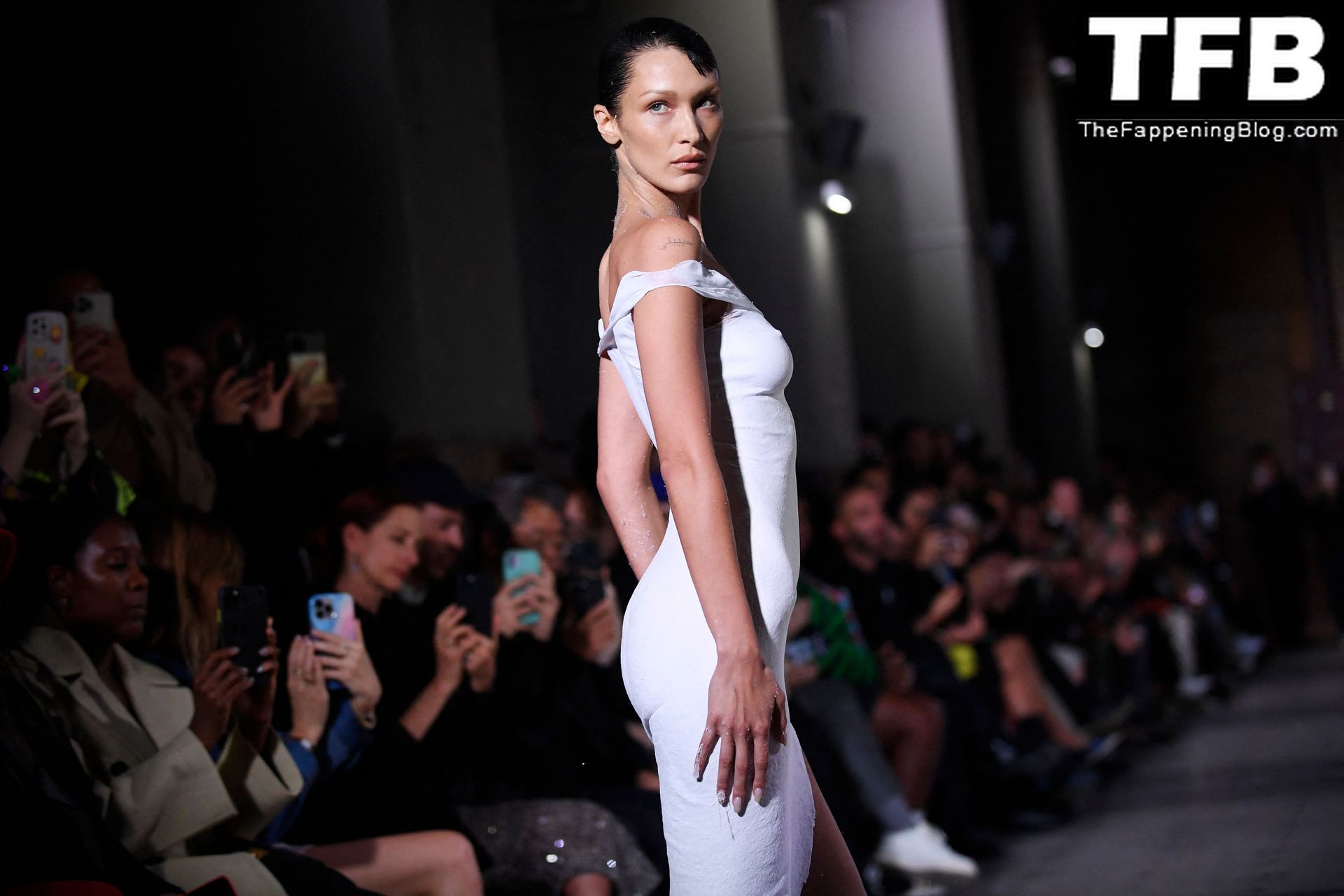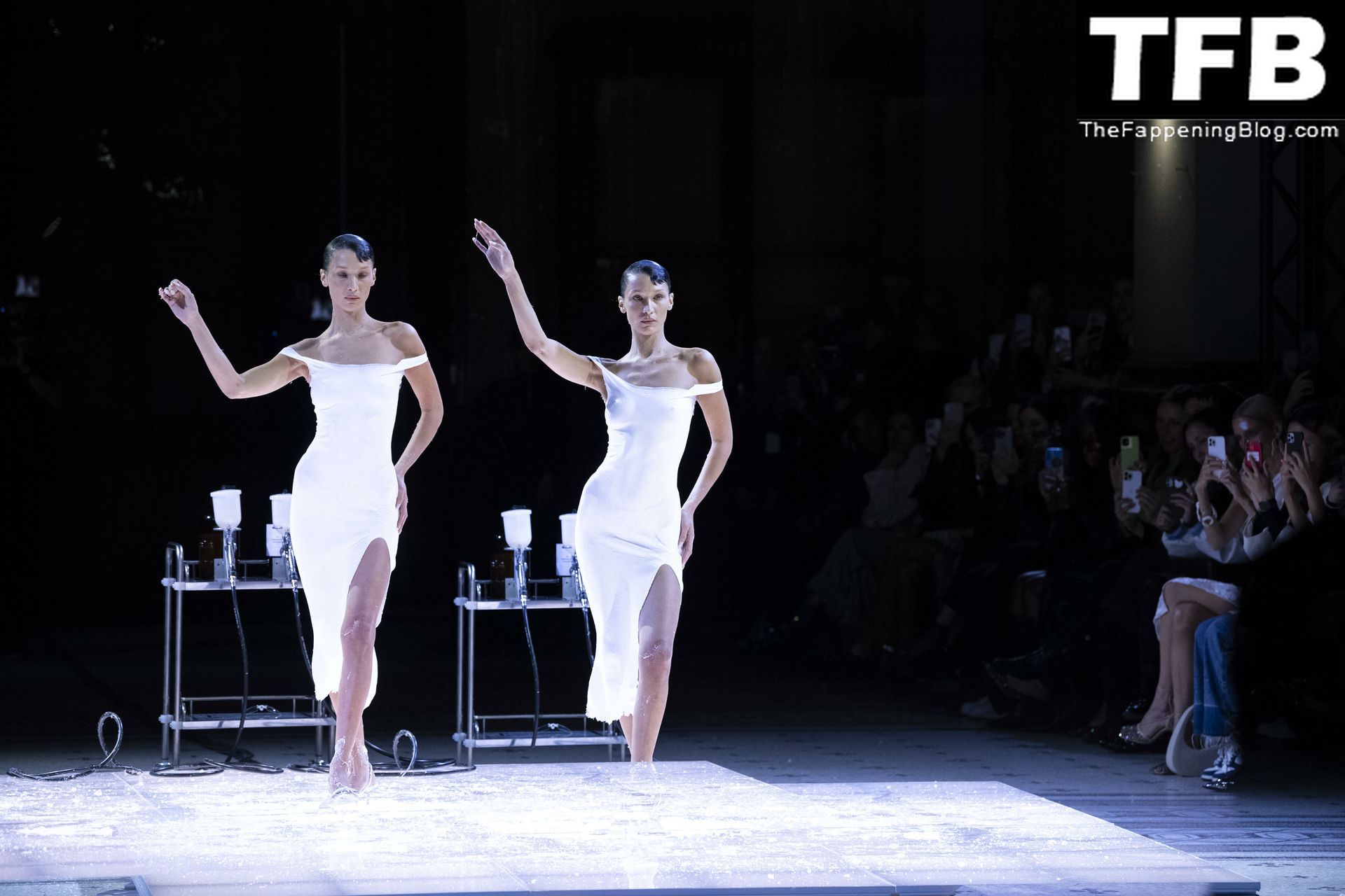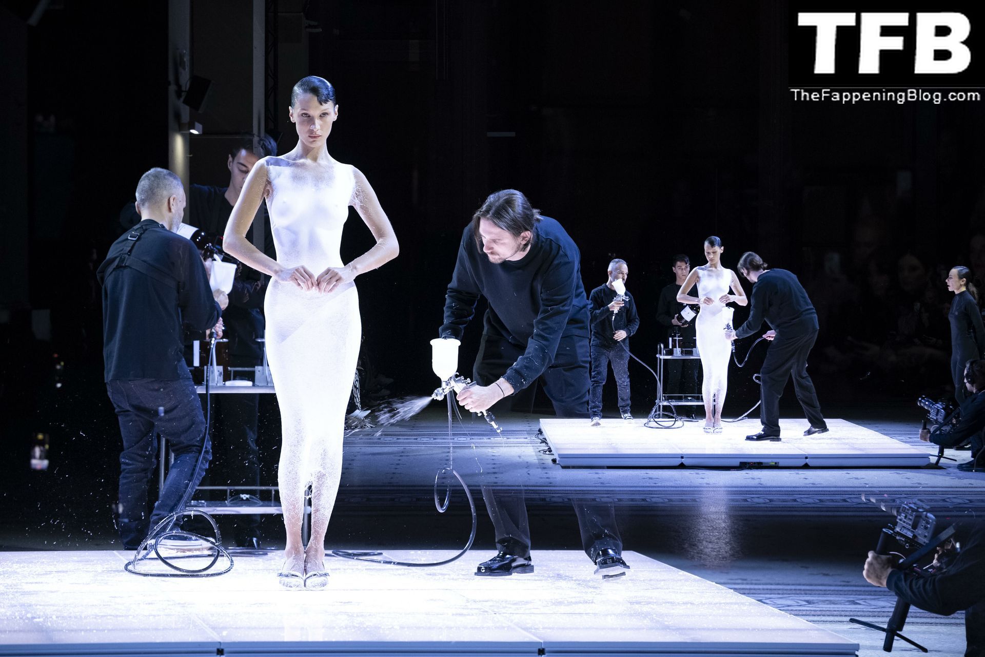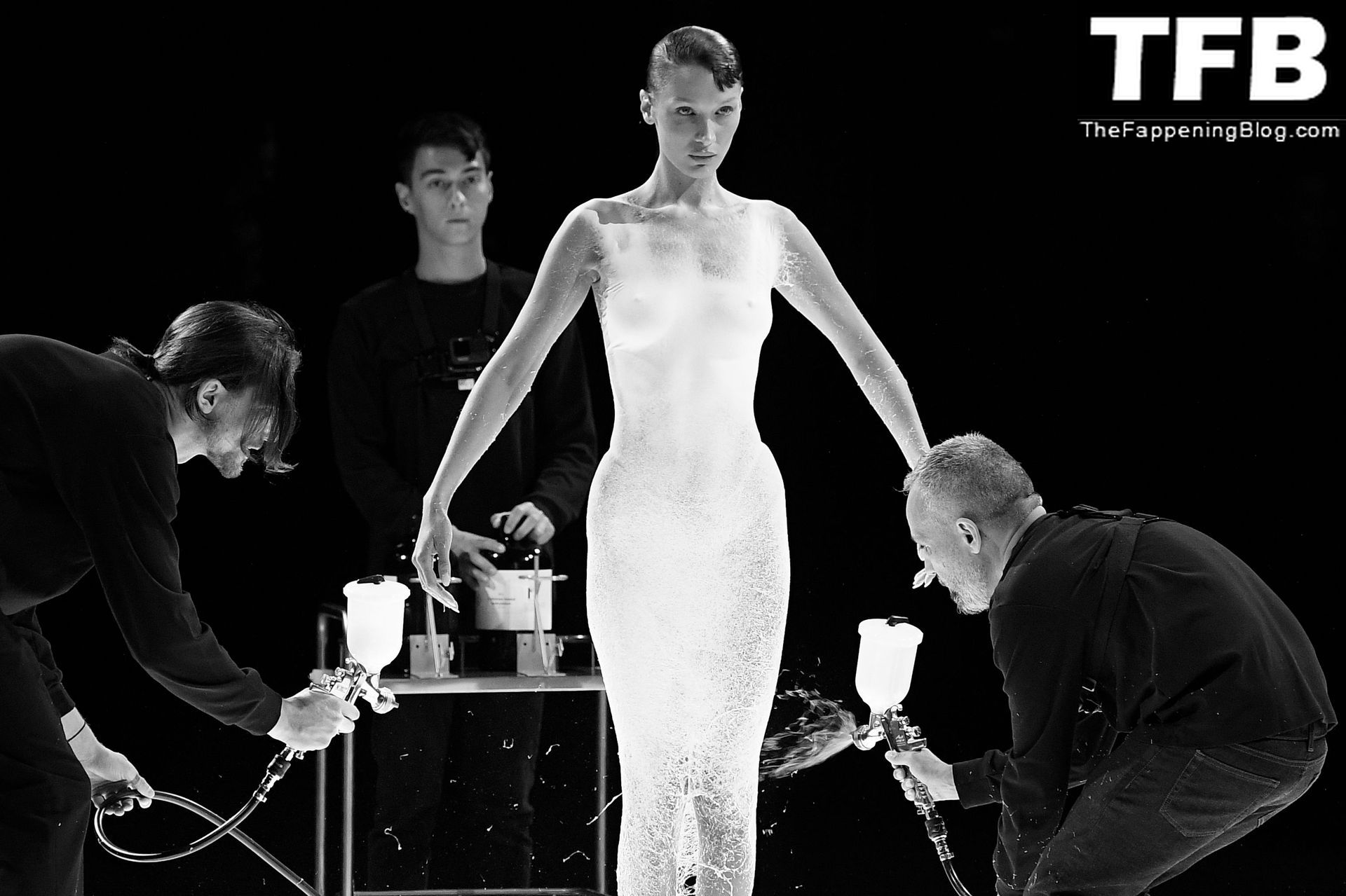 Bella Hadid apparaît au défilé de mode Coperni pendant la Fashion Week de Paris, le 30/09/2022. Le mannequin se fait peindre une robe en spray au milieu du défilé.