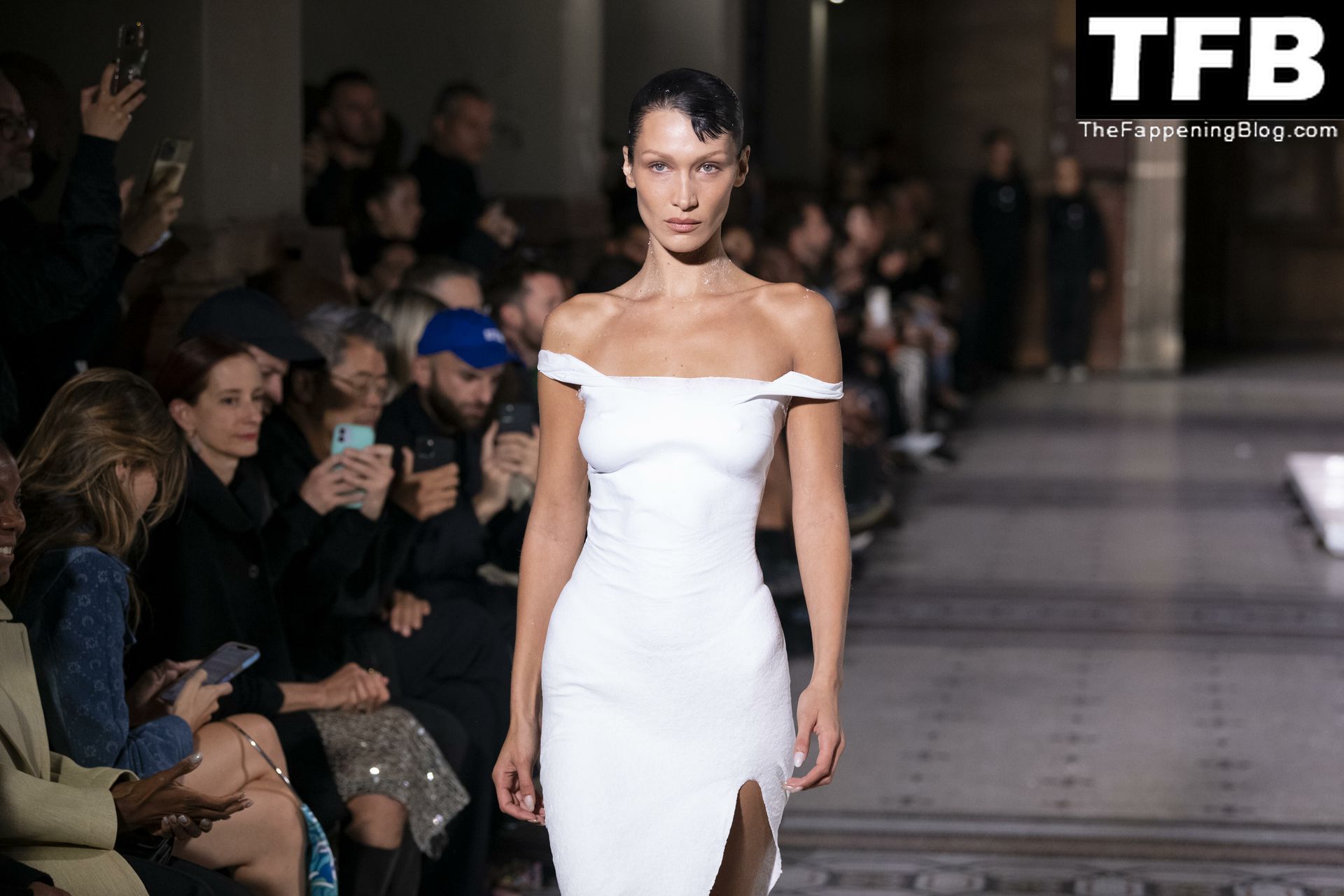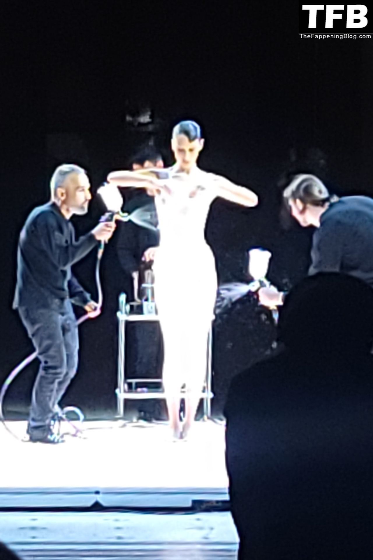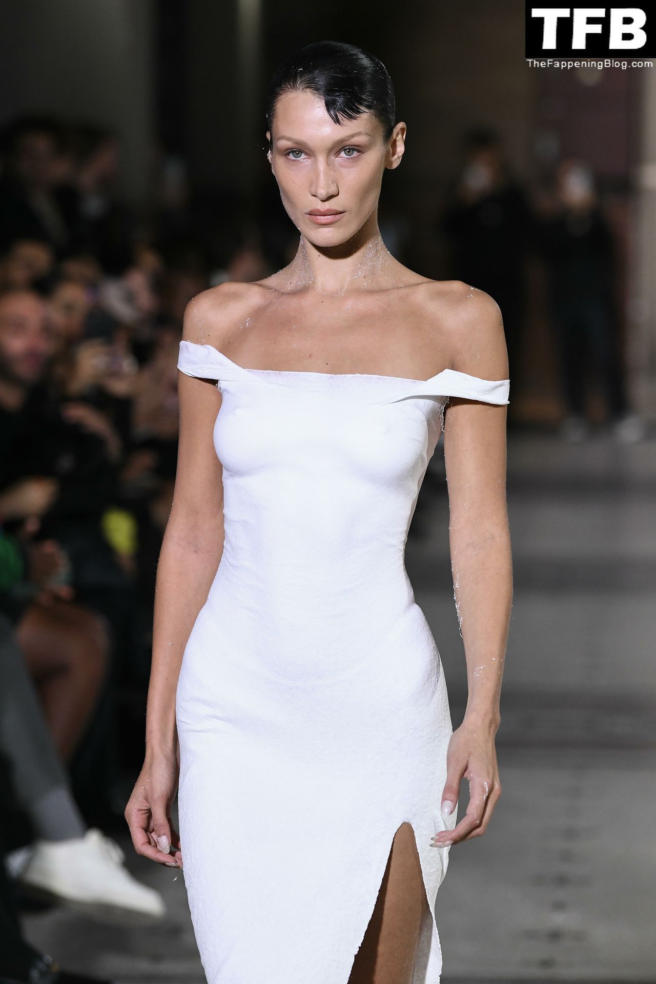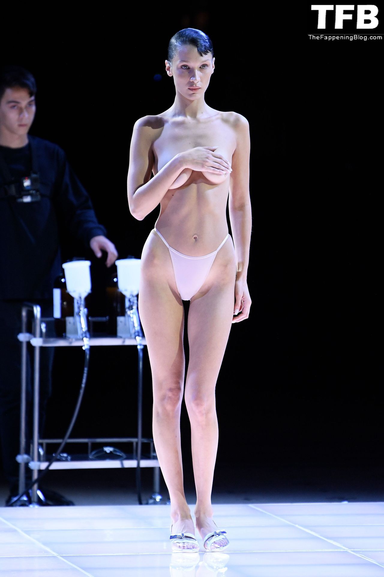 Bella Hadid apparaît au défilé de mode Coperni pendant la Fashion Week de Paris, le 30/09/2022. Le mannequin se fait peindre une robe en spray au milieu du défilé.