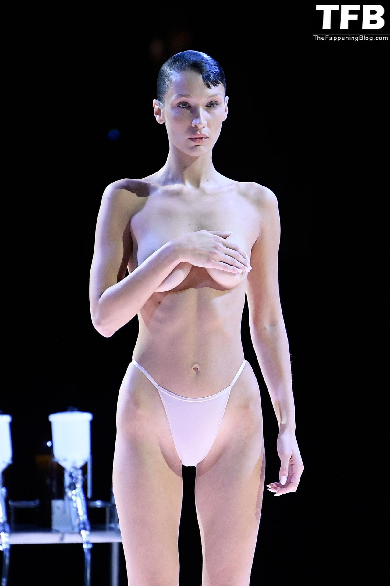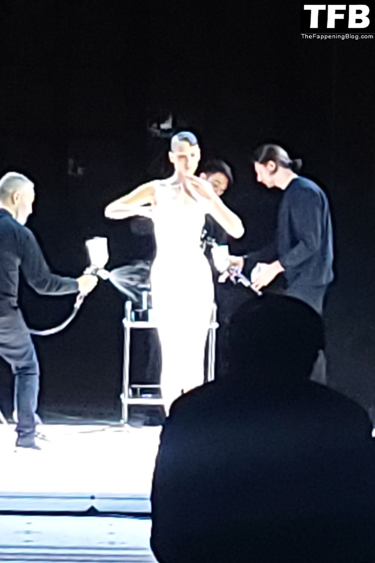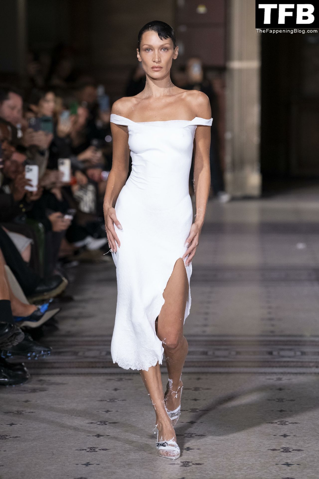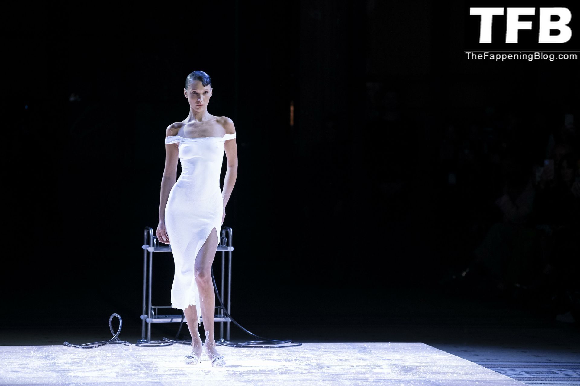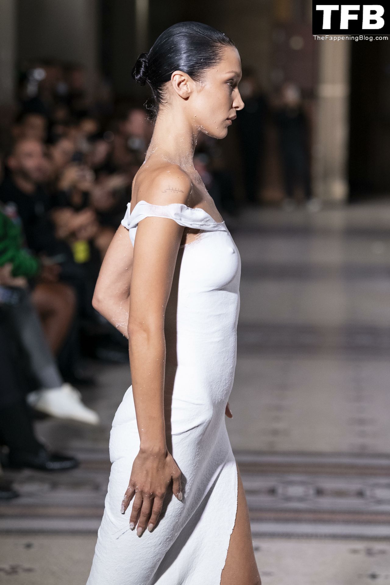 Bella Hadid apparaît au défilé de mode Coperni pendant la Fashion Week de Paris, le 30/09/2022. Le mannequin se fait peindre une robe en spray au milieu du défilé.