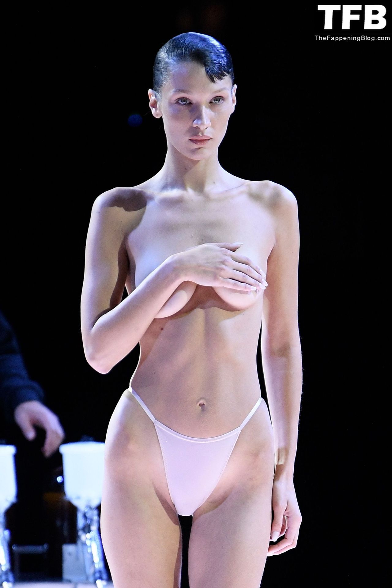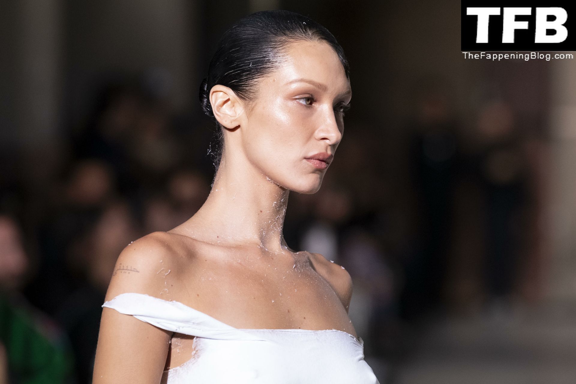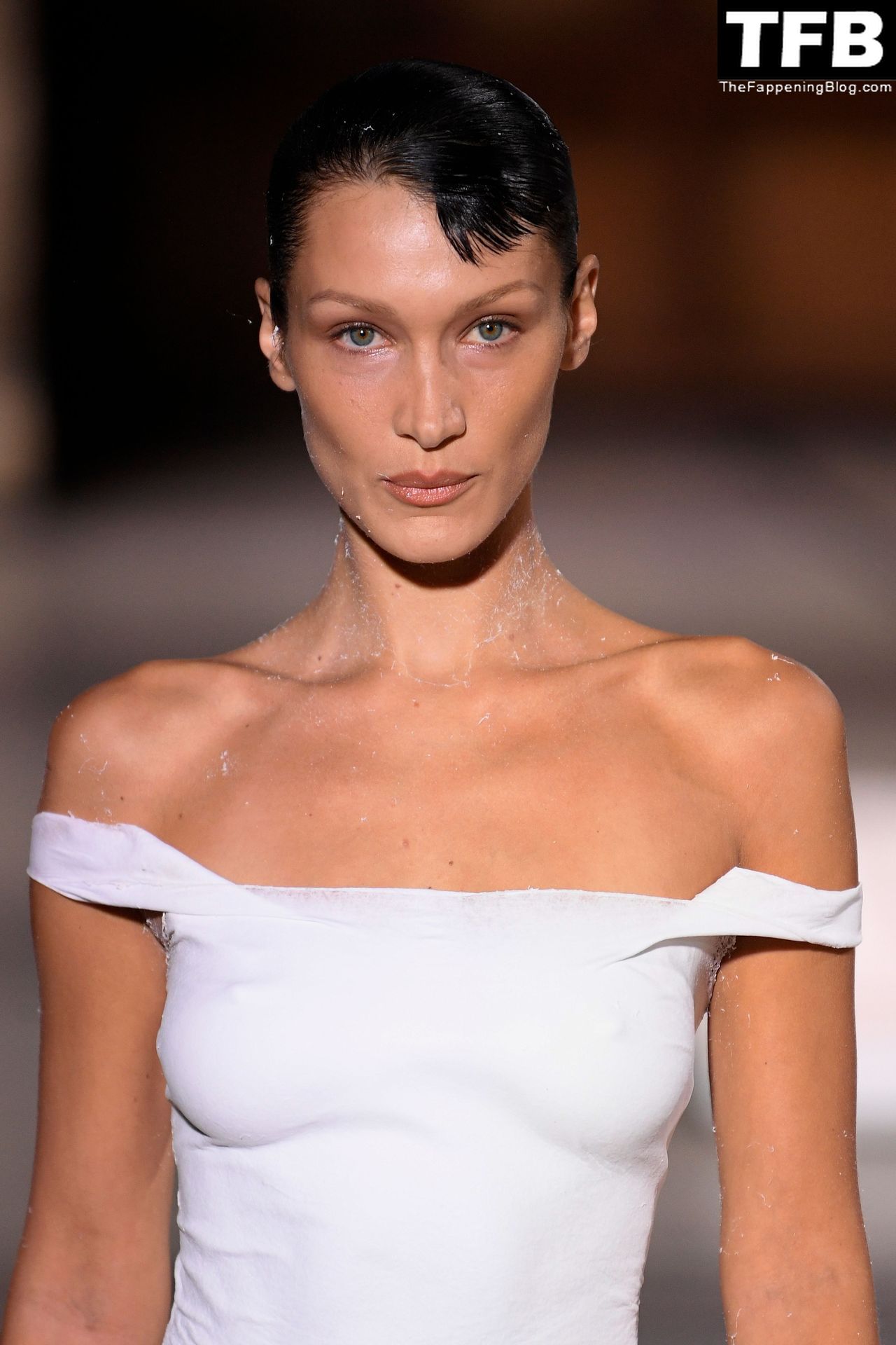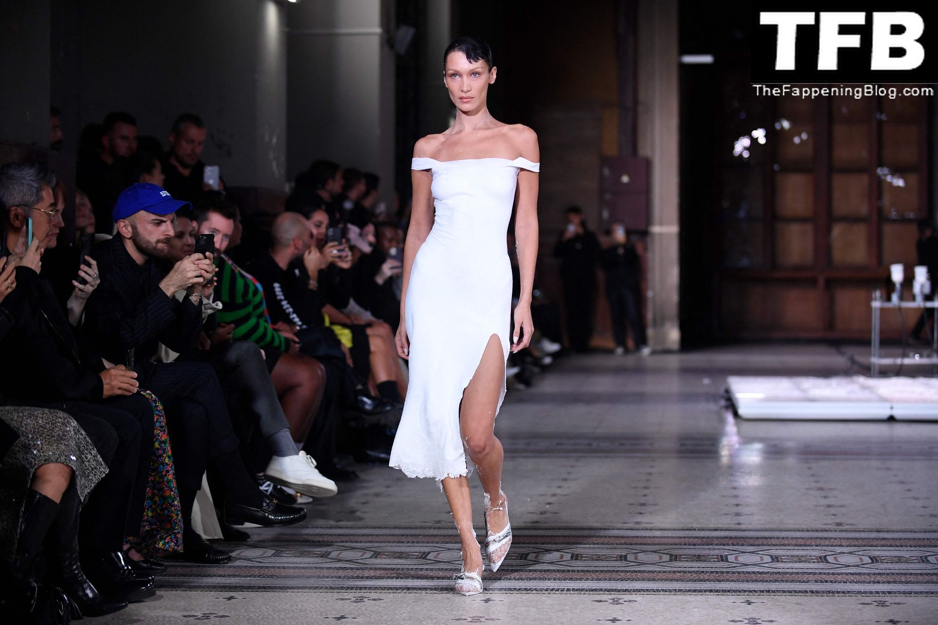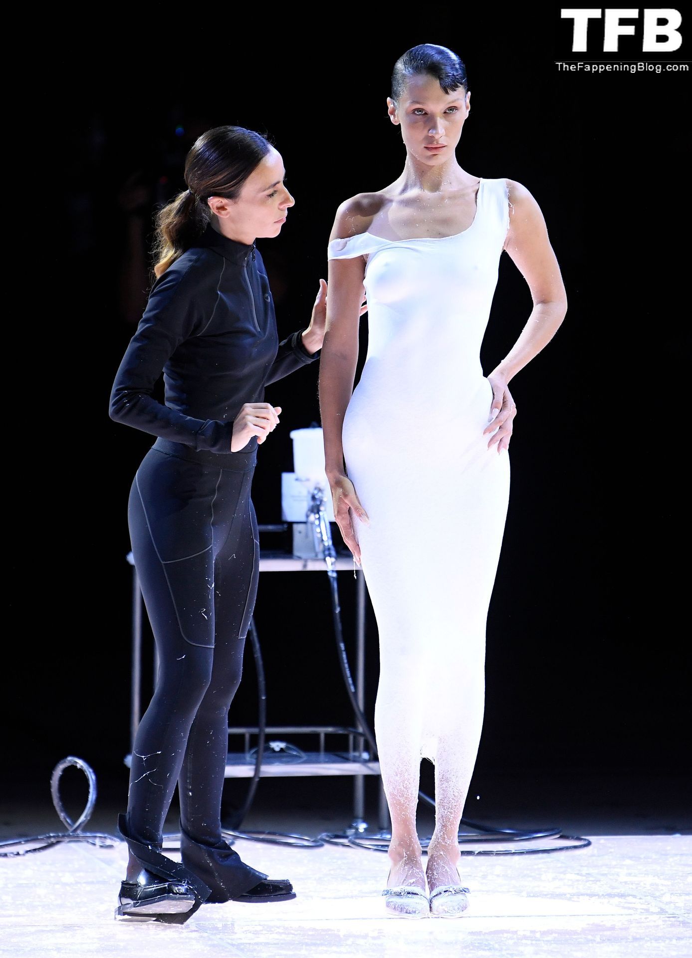 Bella Hadid apparaît au défilé de mode Coperni pendant la Fashion Week de Paris, le 30/09/2022. Le mannequin se fait peindre une robe en spray au milieu du défilé.