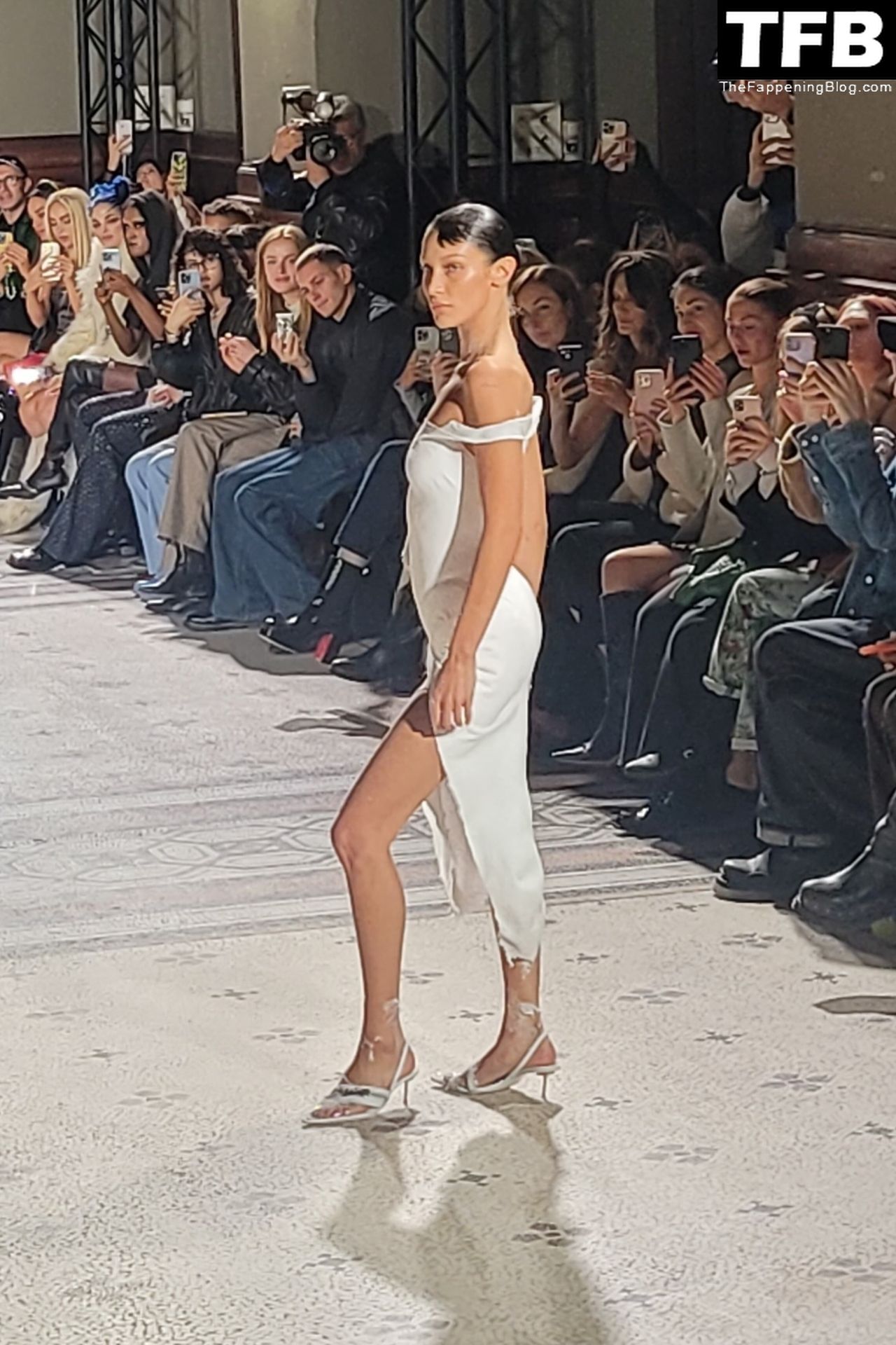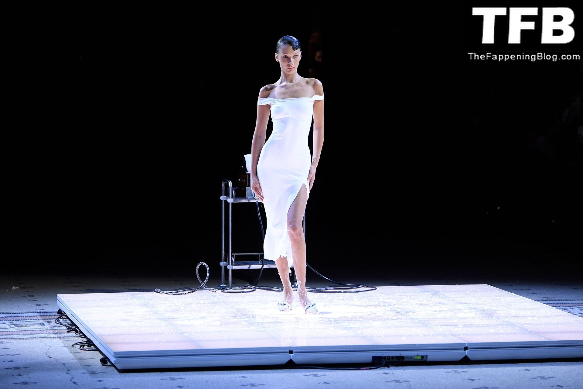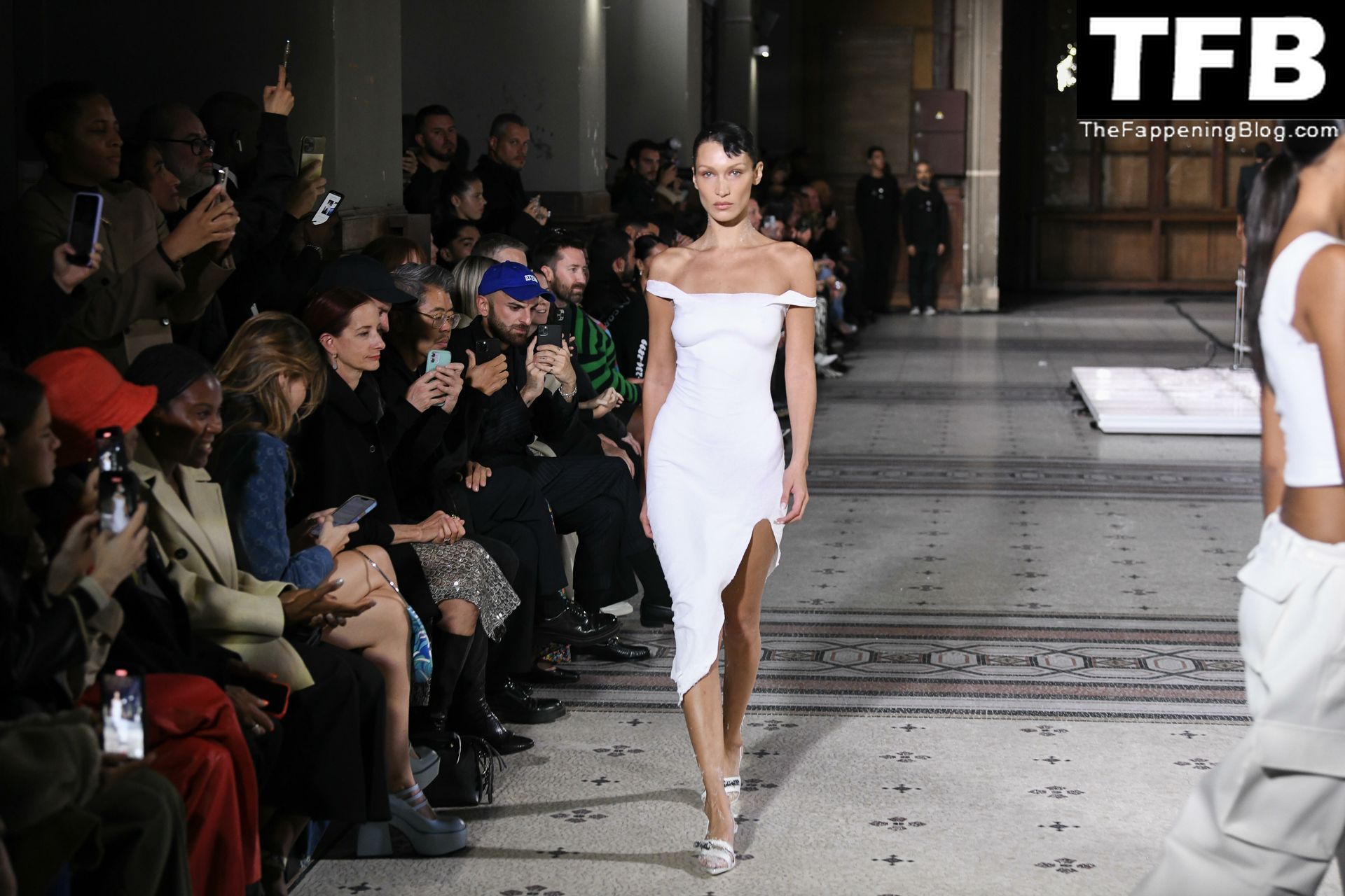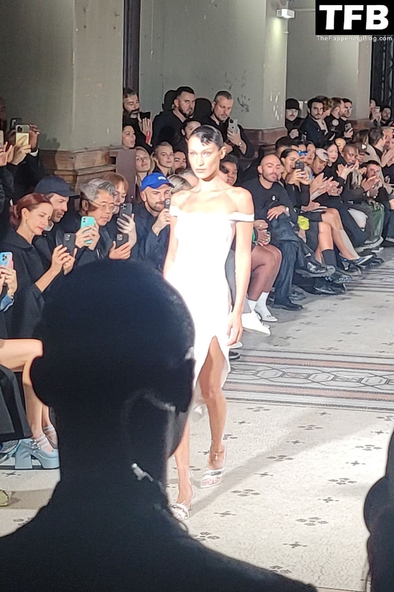 Bella Hadid apparaît au défilé de mode Coperni pendant la Fashion Week de Paris, le 30/09/2022. Le mannequin se fait peindre une robe en spray au milieu du défilé.