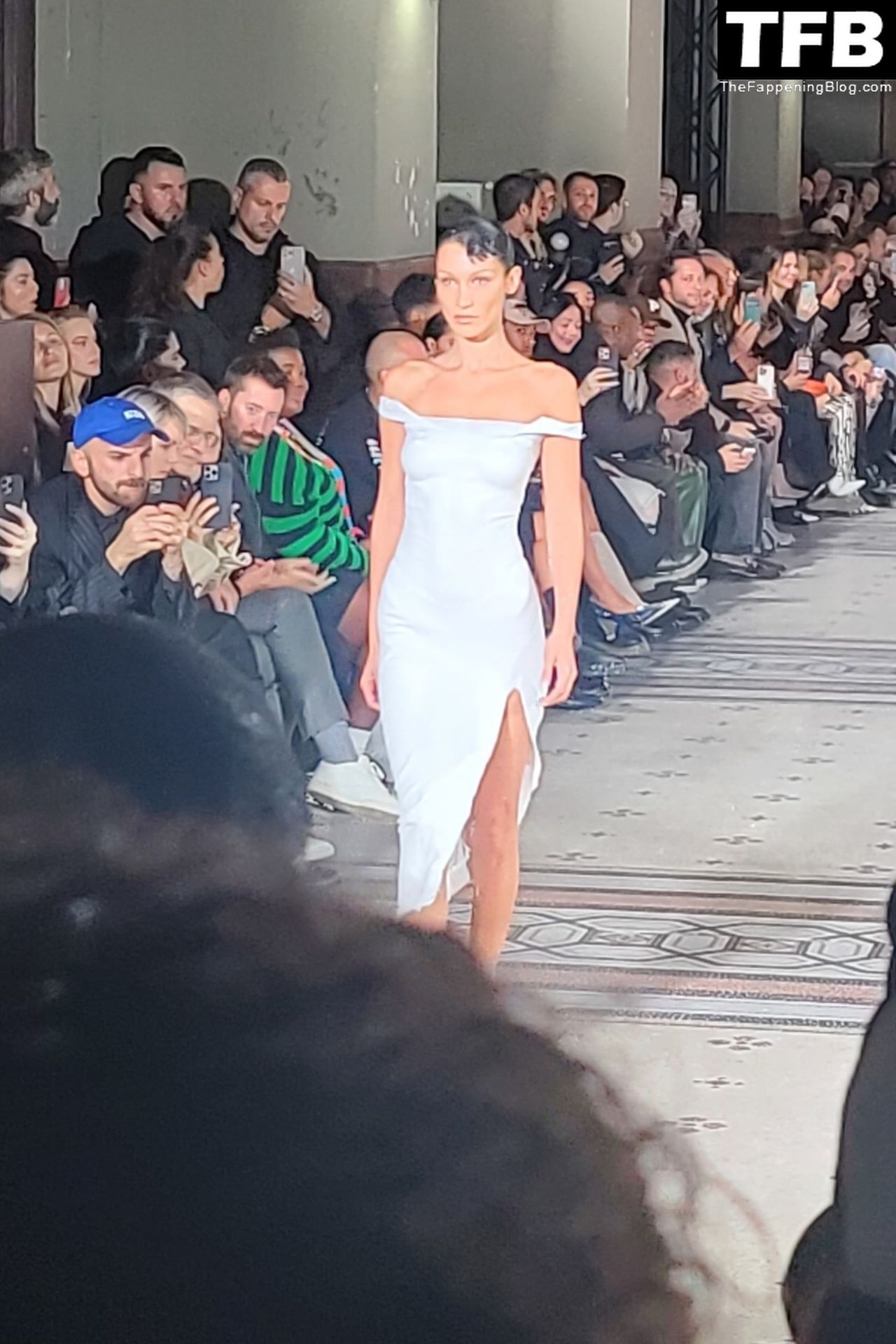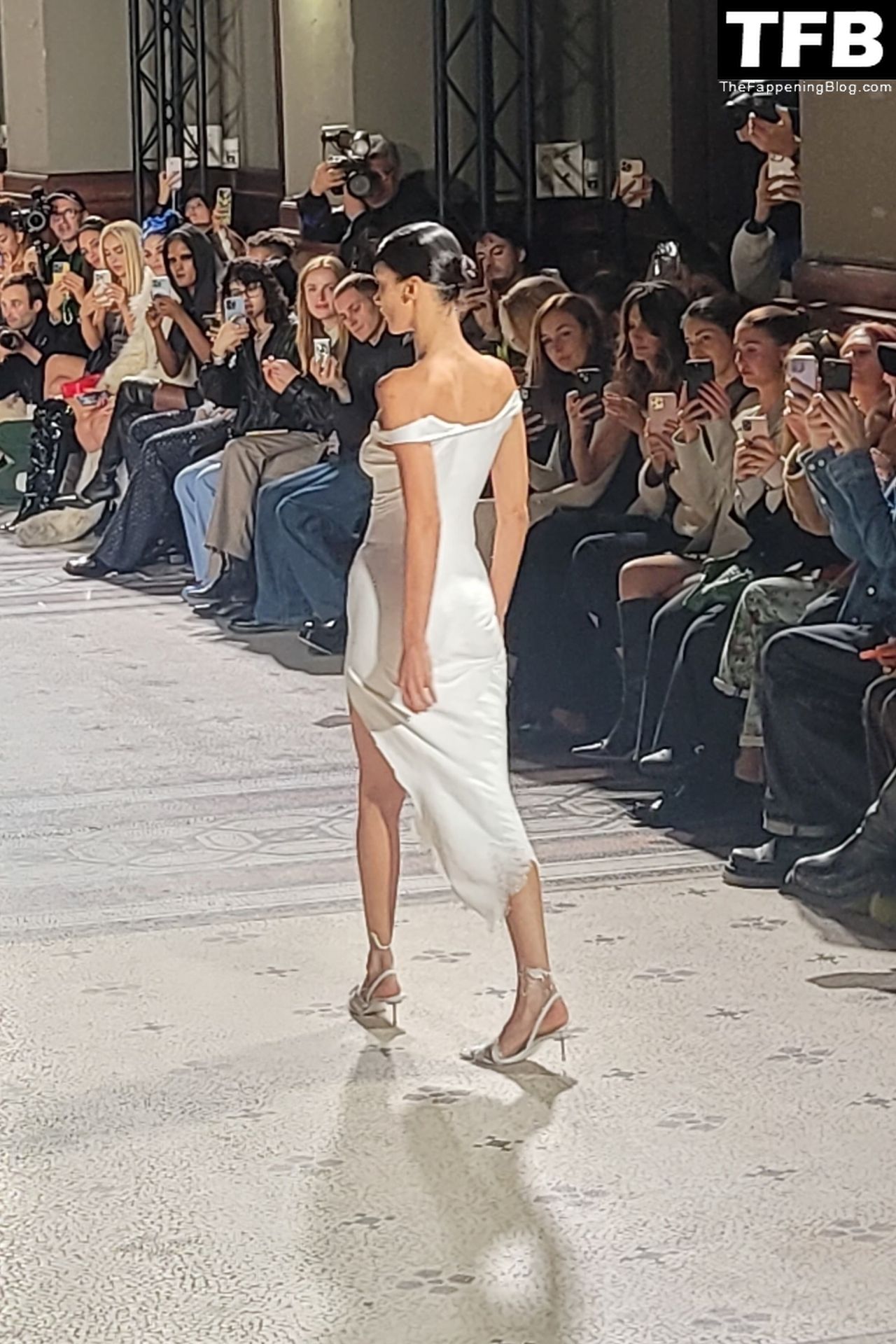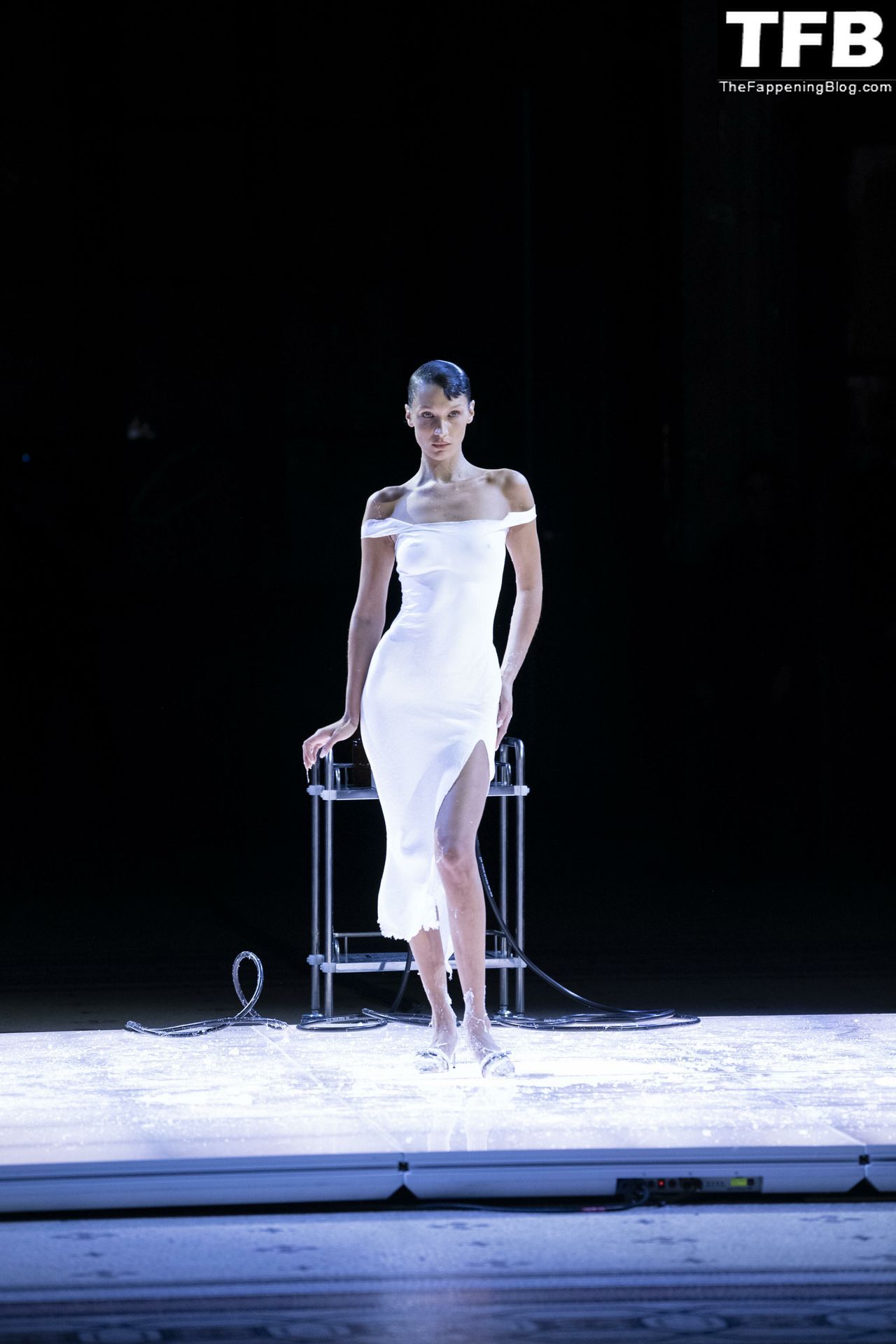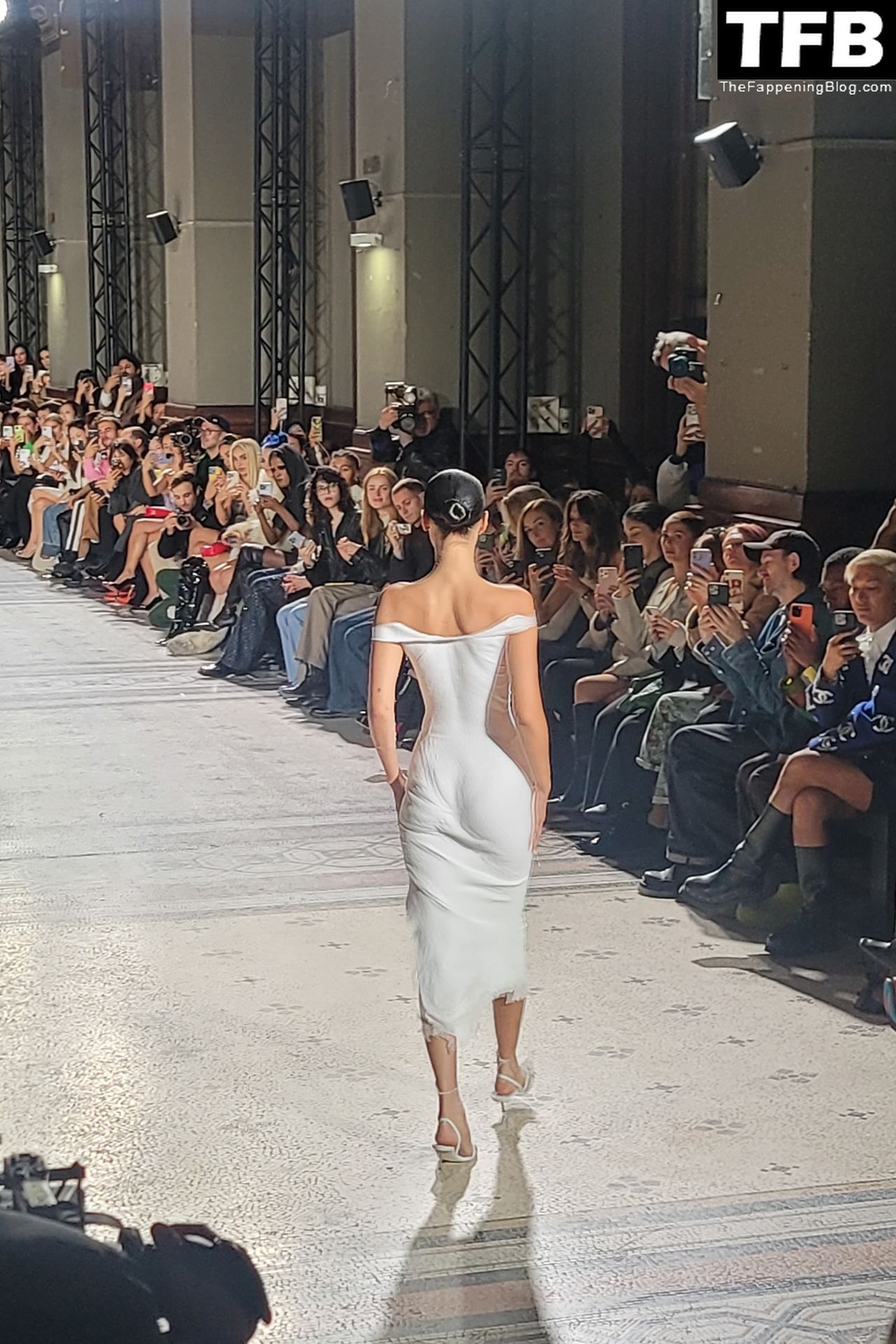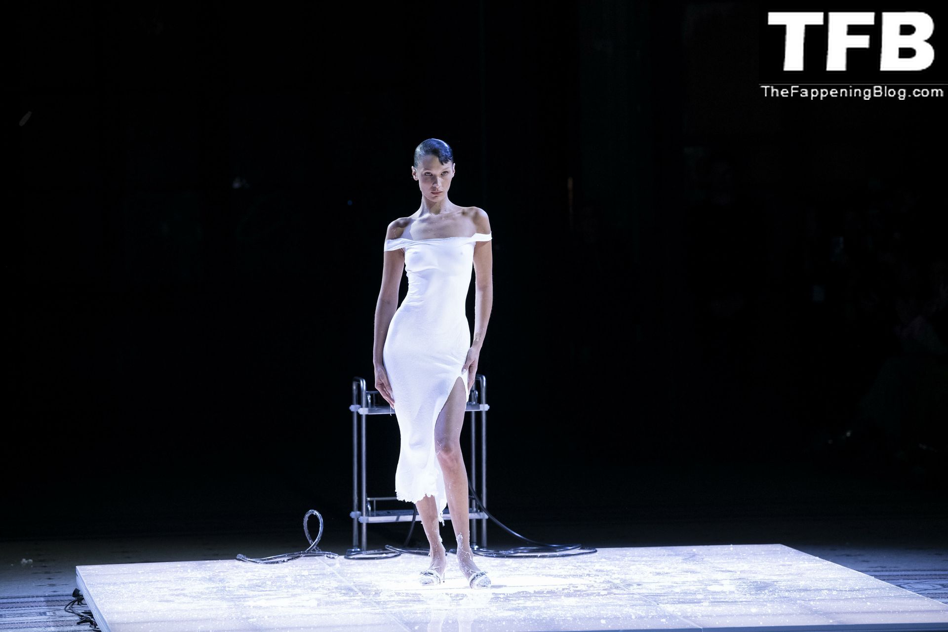Bella Hadid apparaît au défilé de mode Coperni pendant la Fashion Week de Paris, le 30/09/2022. Le mannequin se fait peindre une robe en spray au milieu du défilé.