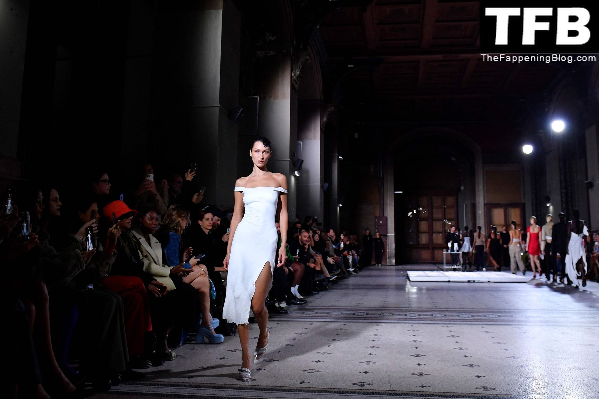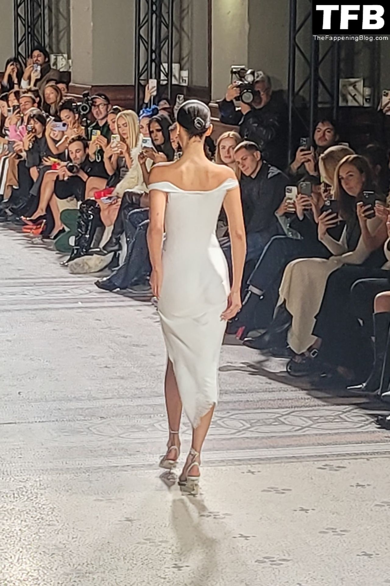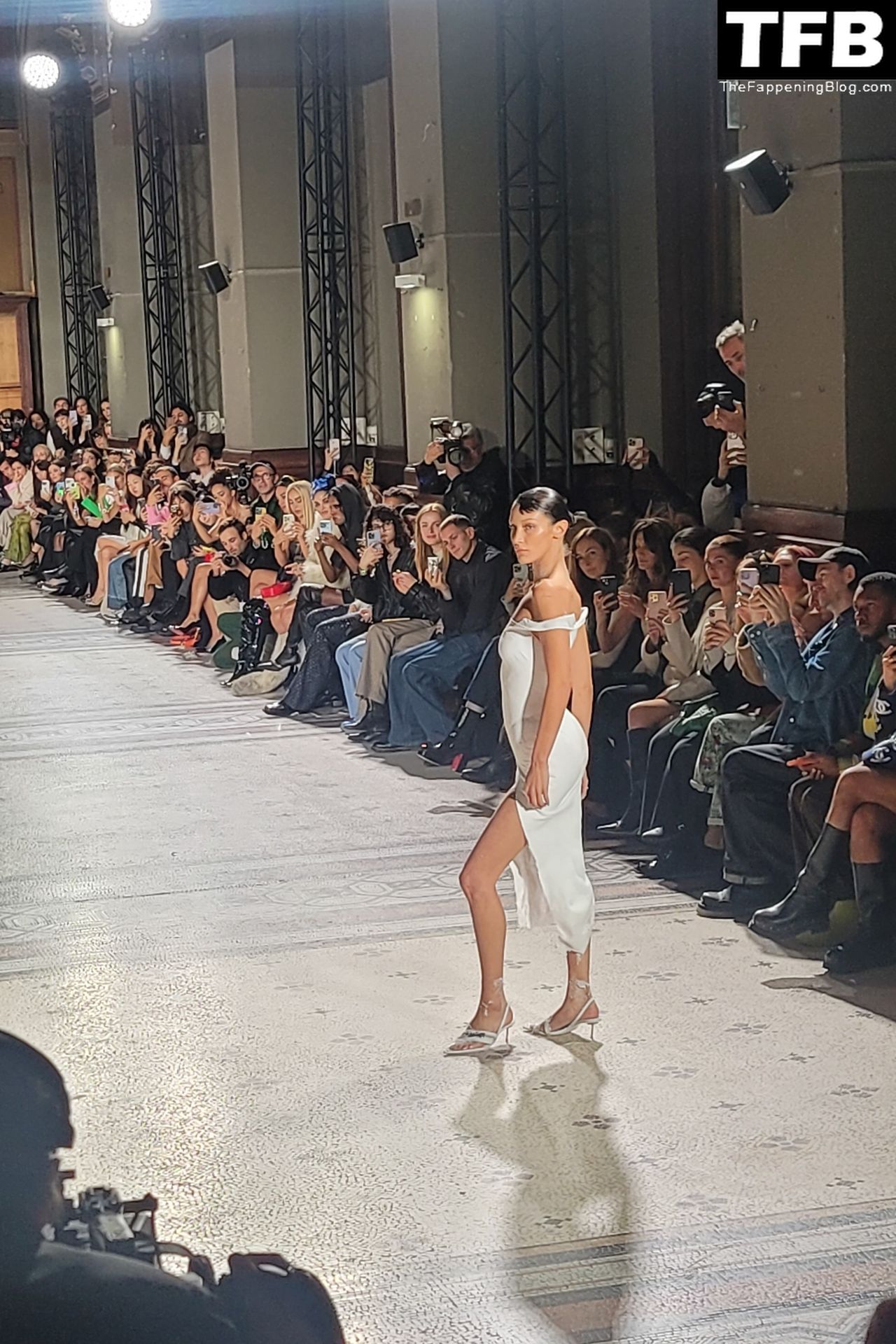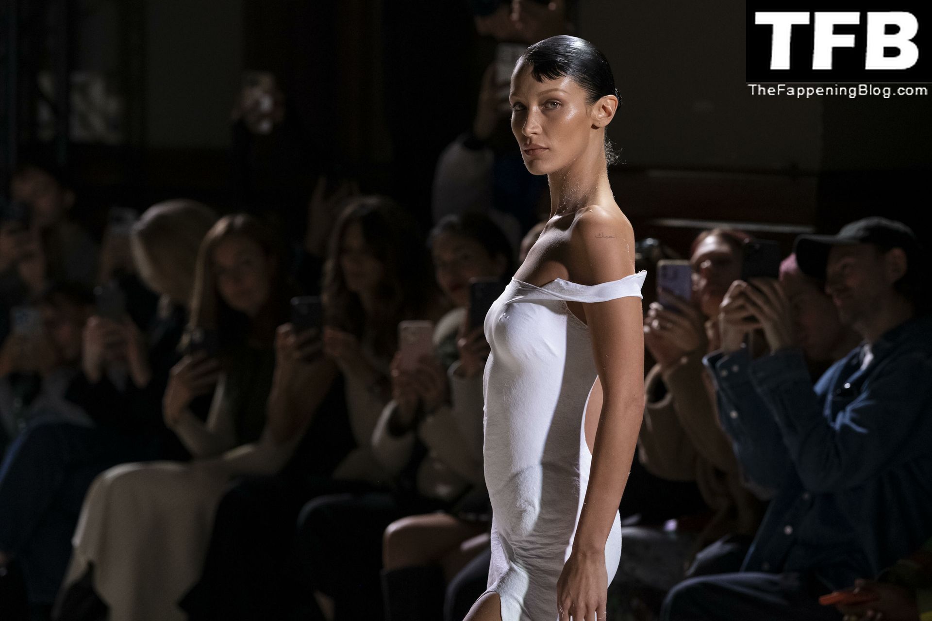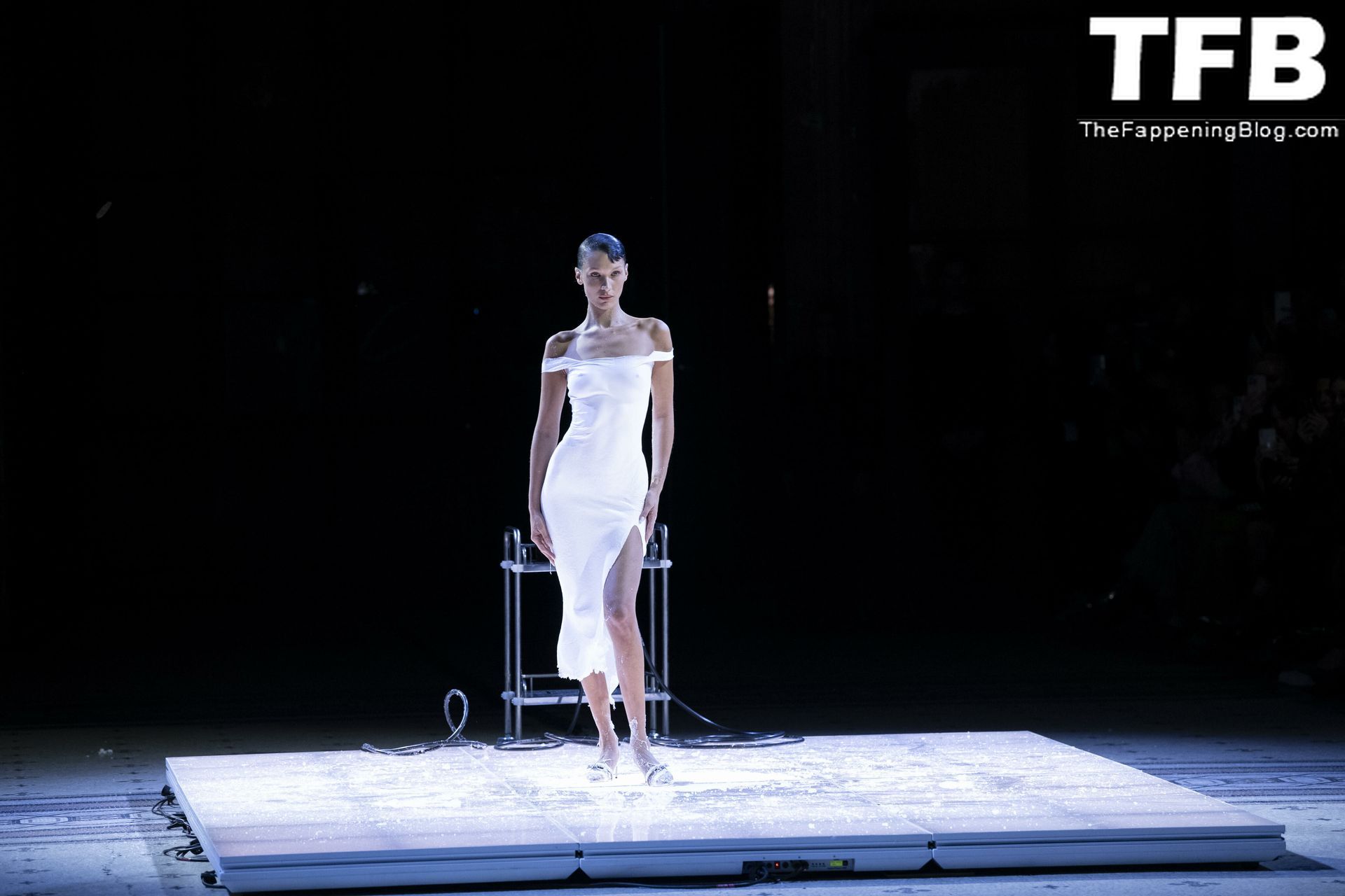 Bella Hadid apparaît au défilé de mode Coperni pendant la Fashion Week de Paris, le 30/09/2022. Le mannequin se fait peindre une robe en spray au milieu du défilé.