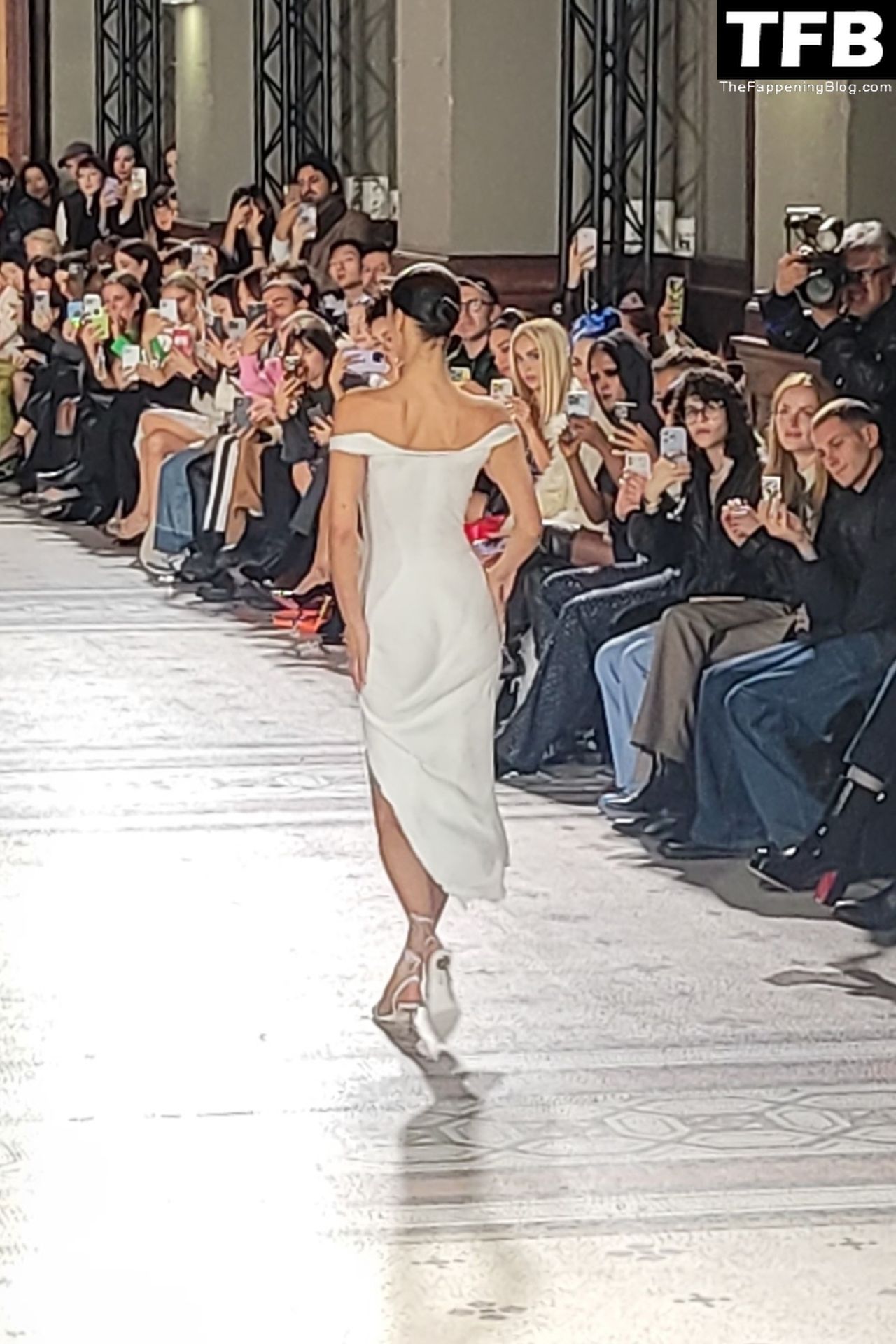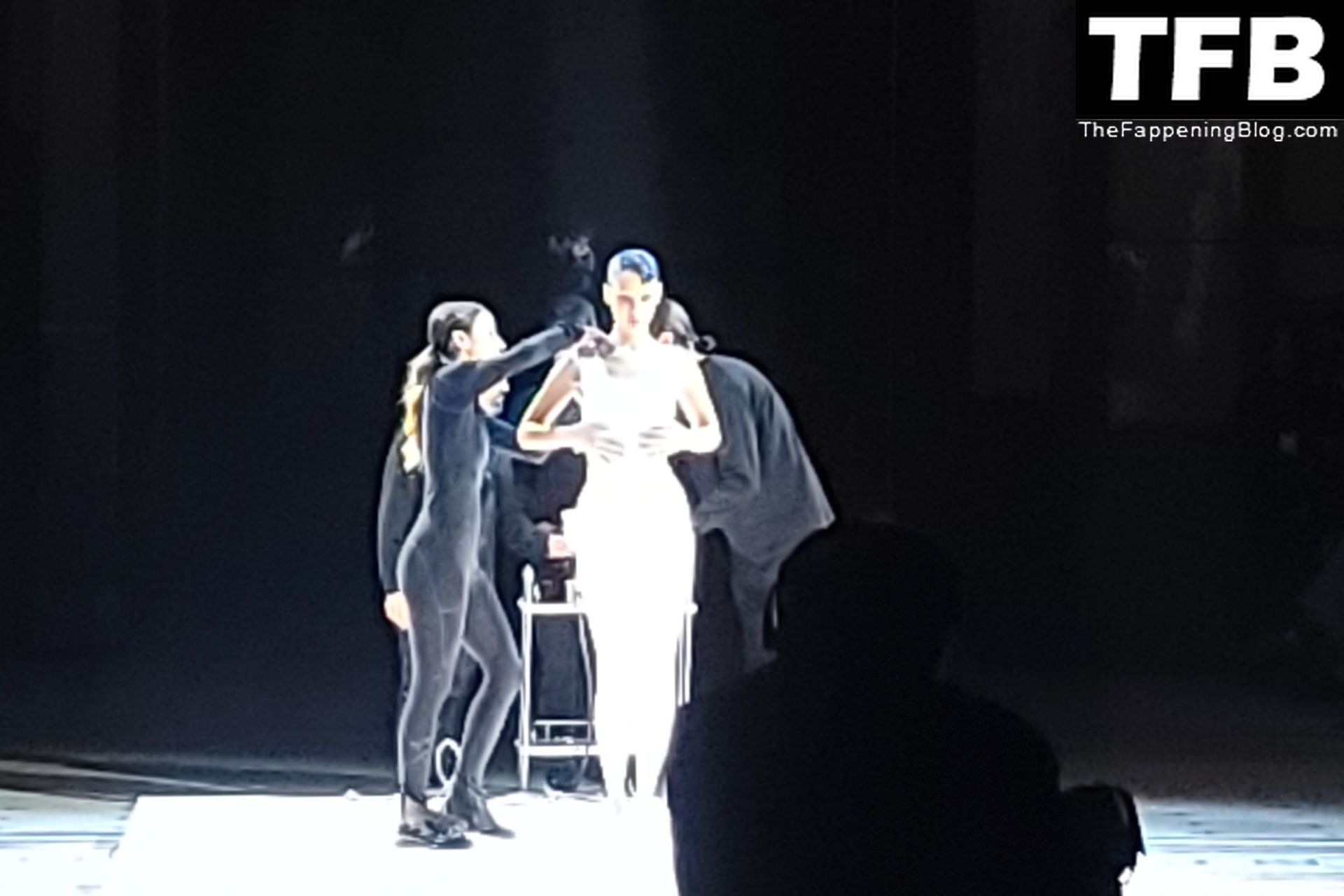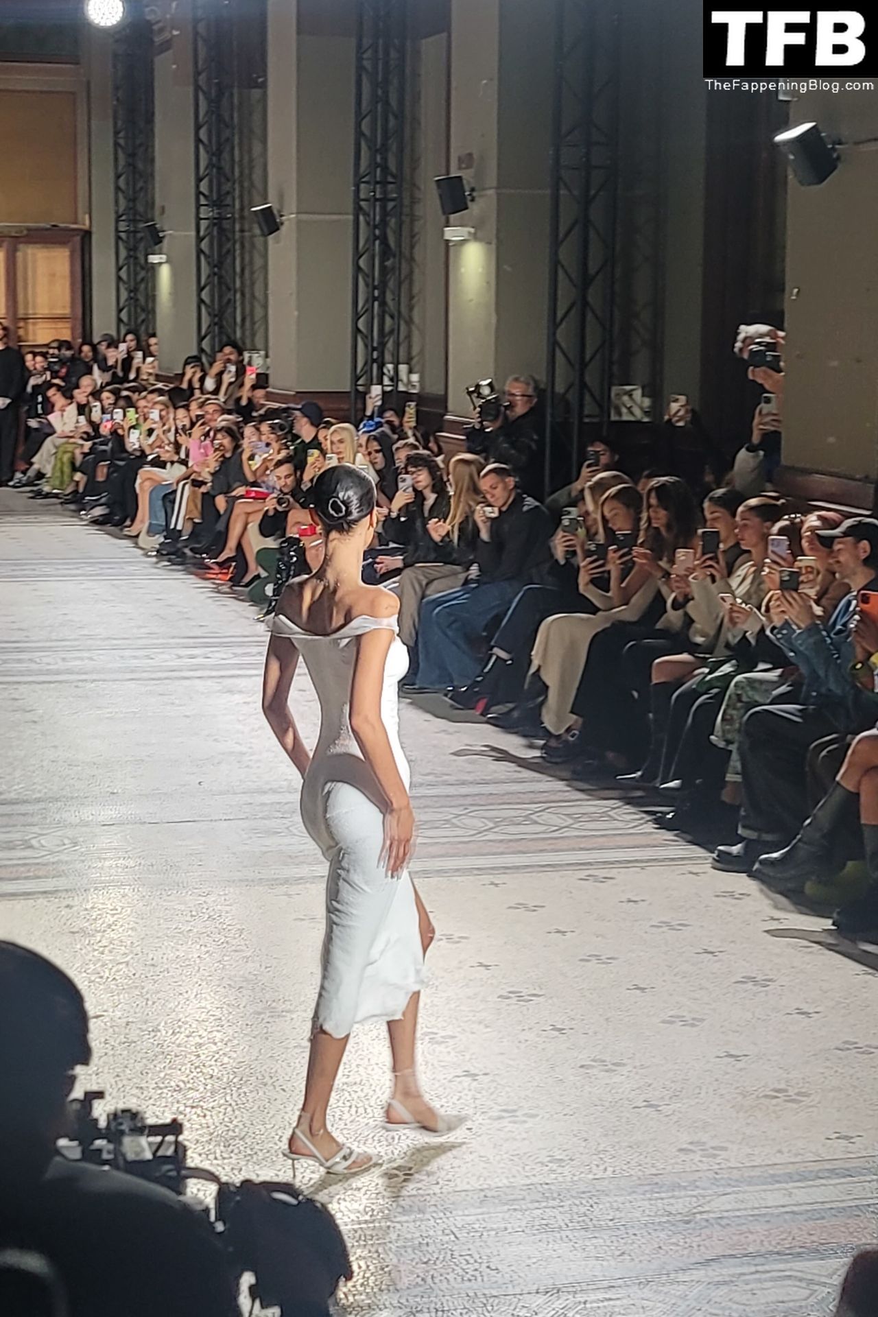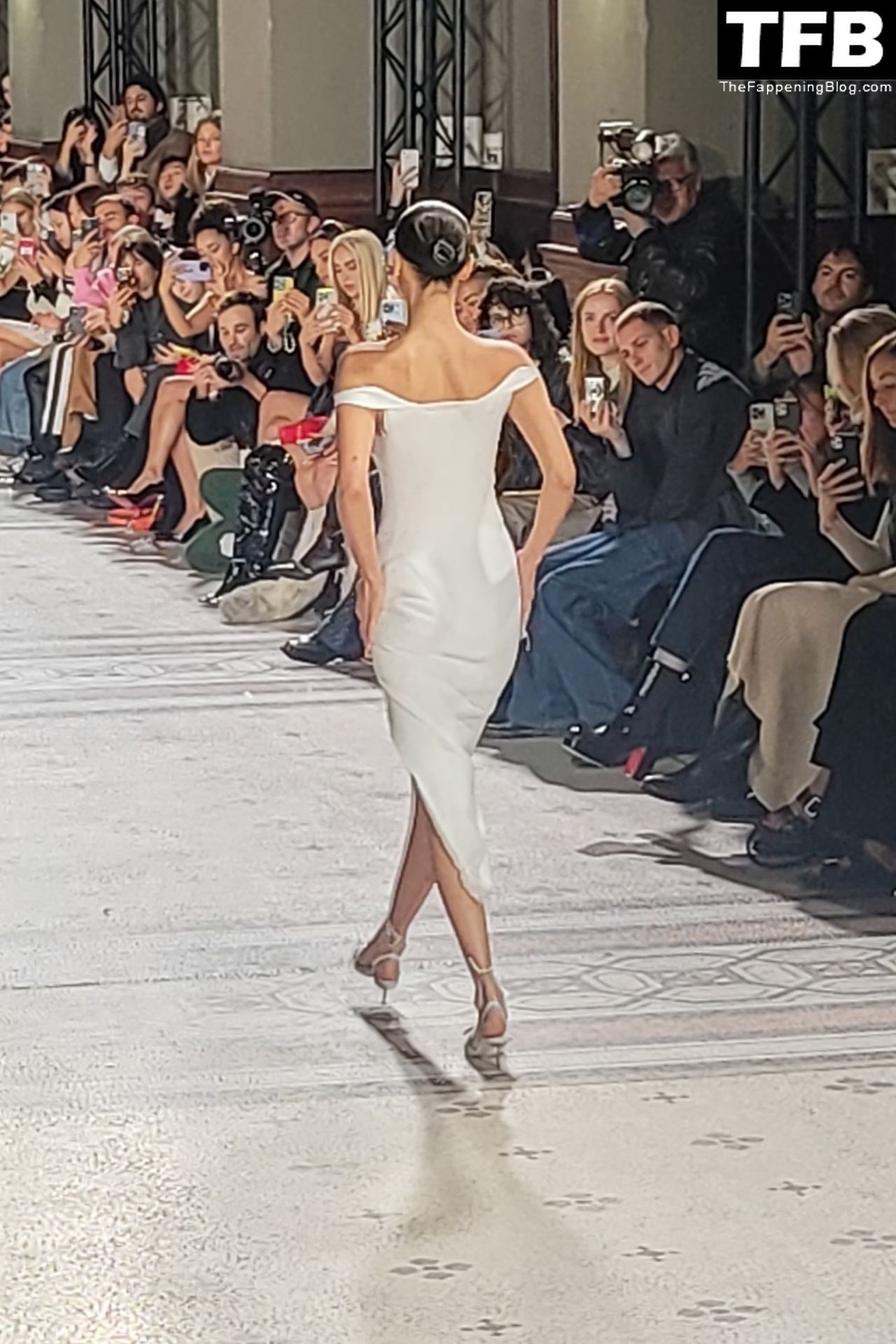 Bella Hadid apparaît au défilé de mode Coperni pendant la Fashion Week de Paris, le 30/09/2022. Le mannequin se fait peindre une robe en spray au milieu du défilé.