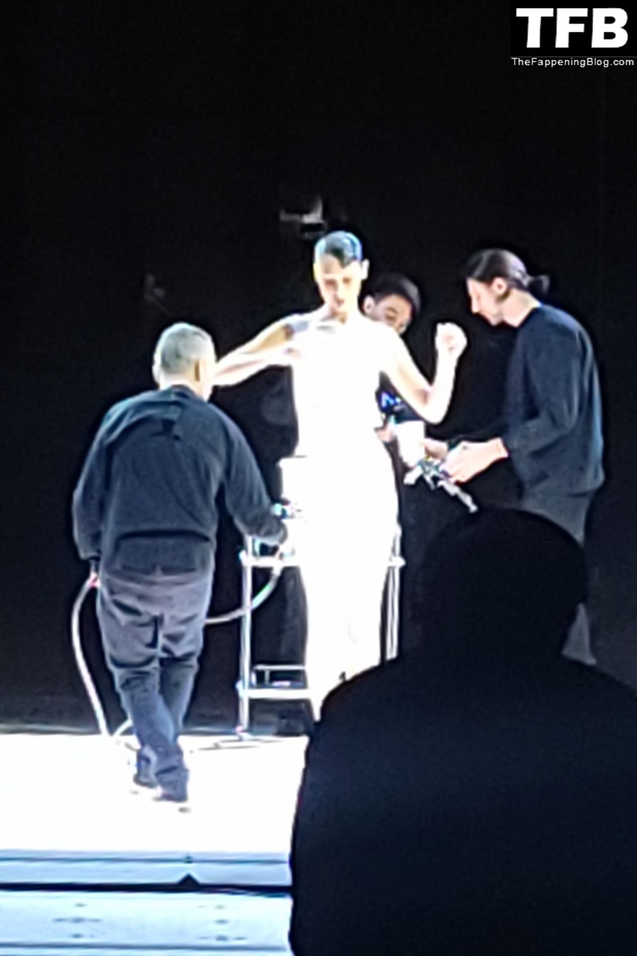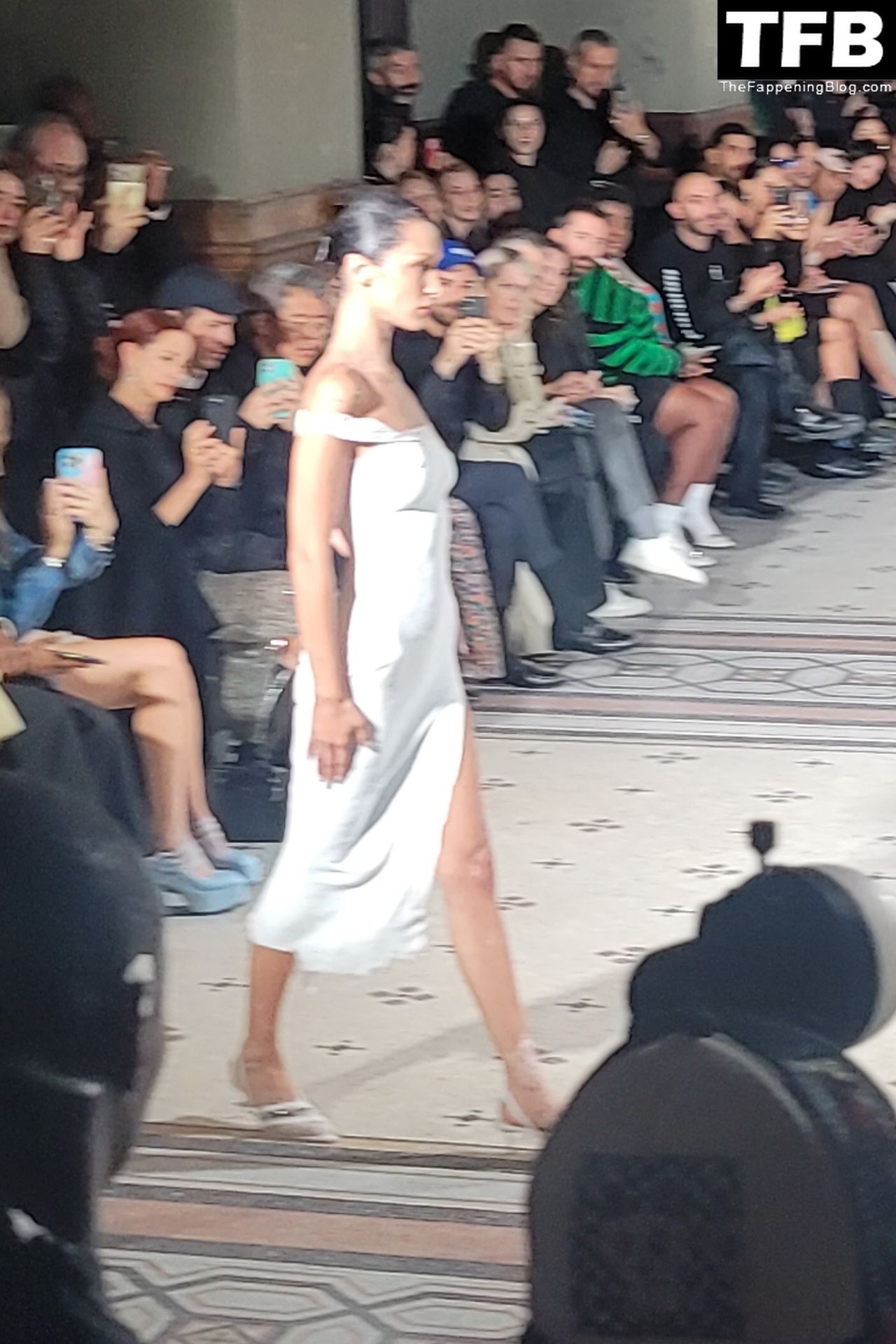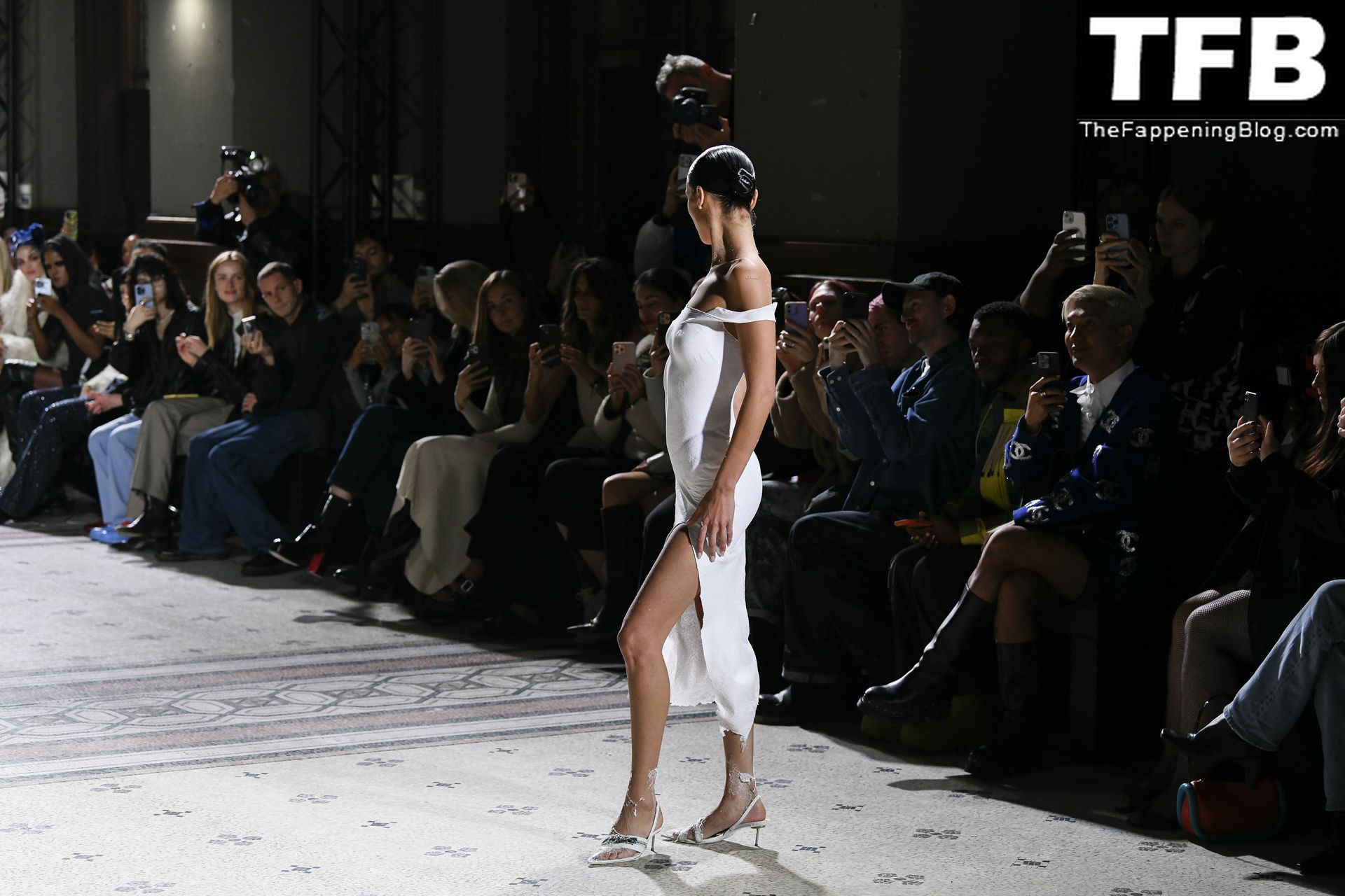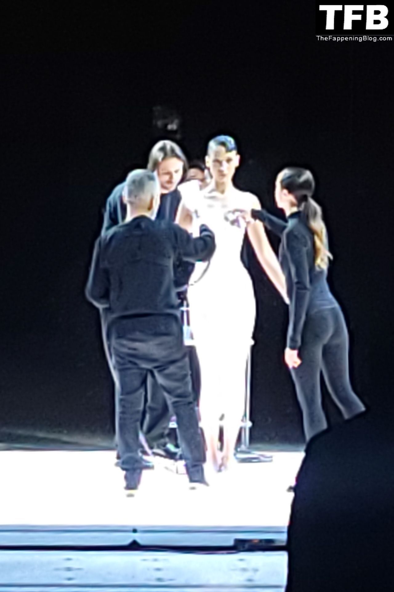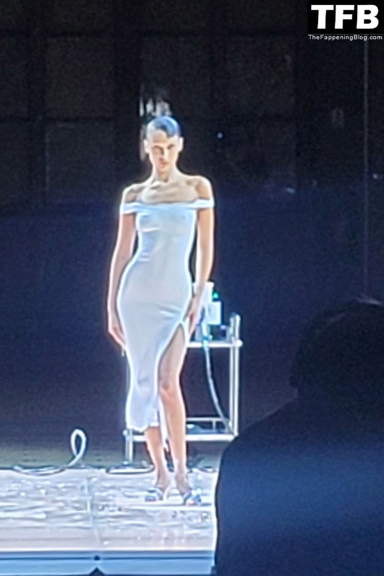 Bella Hadid apparaît au défilé de mode Coperni pendant la Fashion Week de Paris, le 30/09/2022. Le mannequin se fait peindre une robe en spray au milieu du défilé.