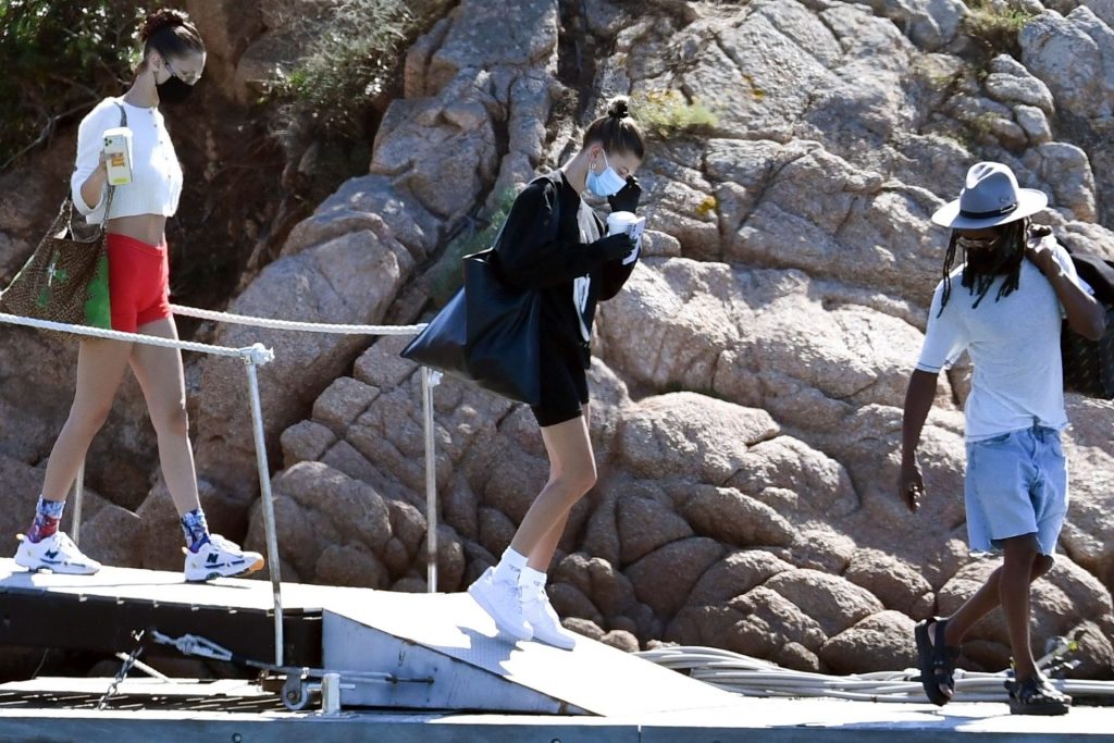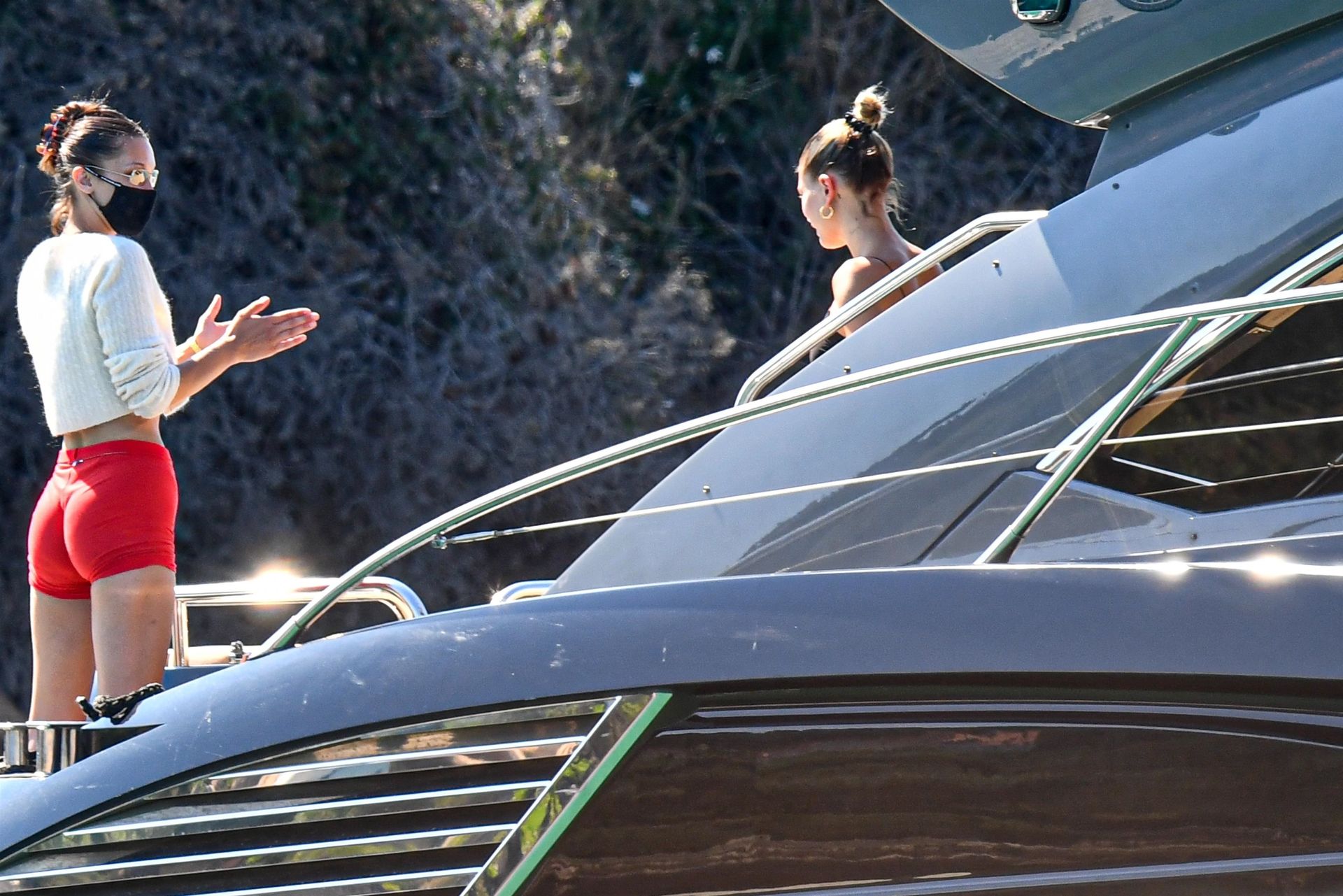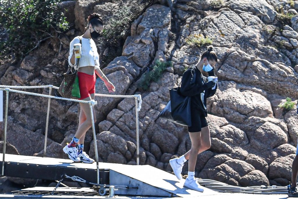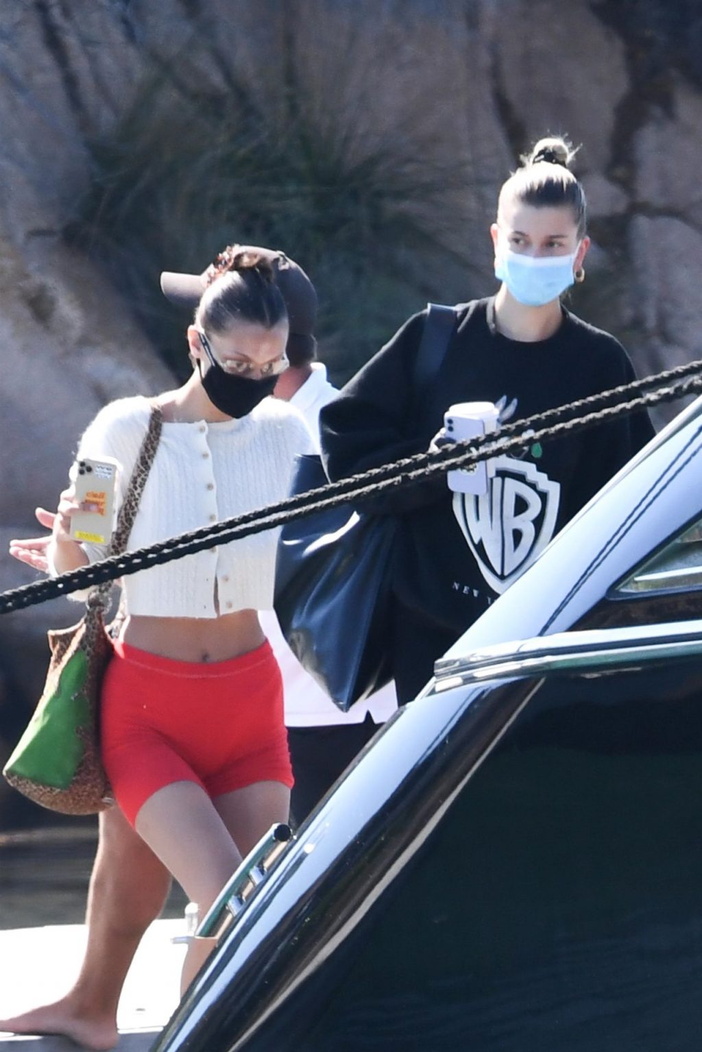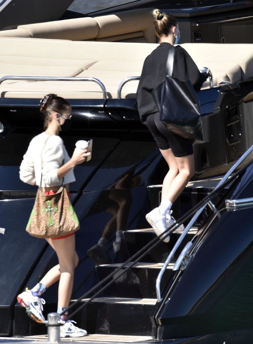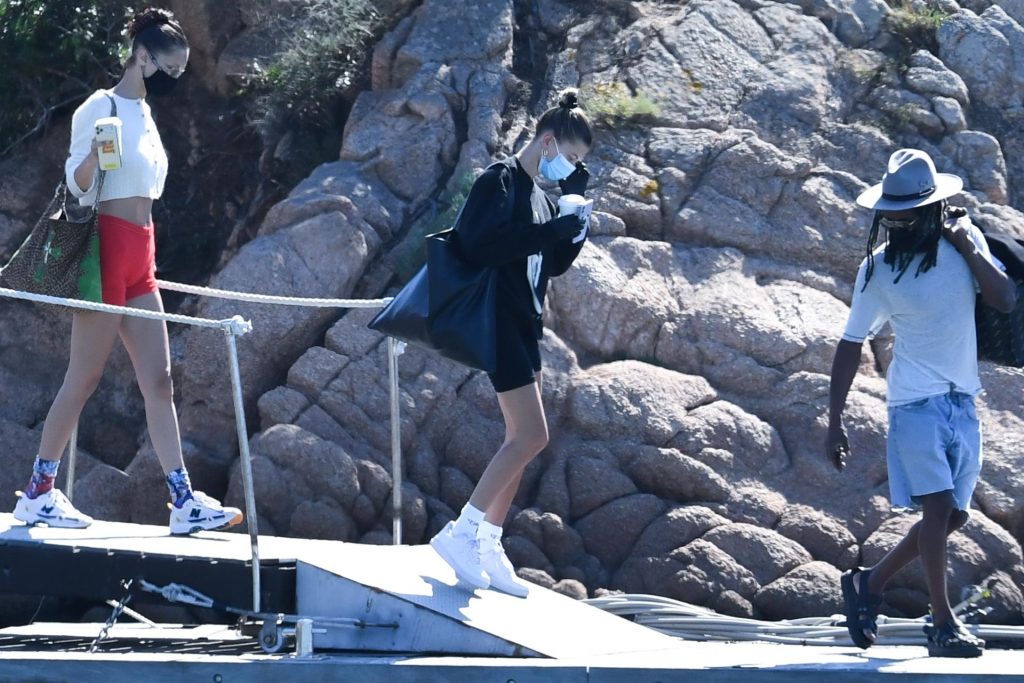 Bella Hadid et Hailey Baldwin sont vues montant à bord d’un yacht aujourd’hui après être arrivées en ville plus tôt – Sardaigne, Italie, 23/06/2020. Les mannequins semblaient impatientes de profiter d’un moment sur l’eau et de déjeuner.