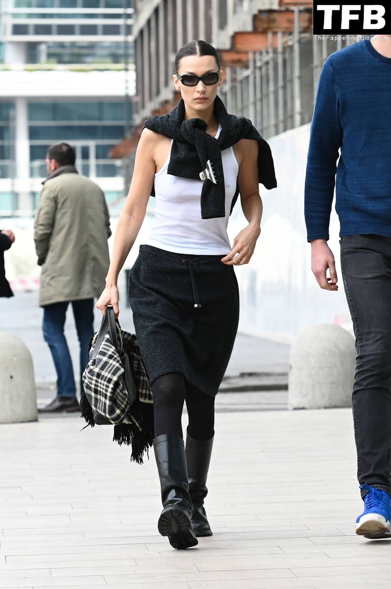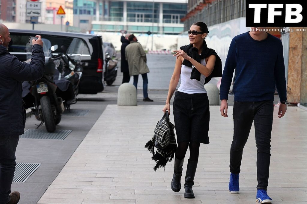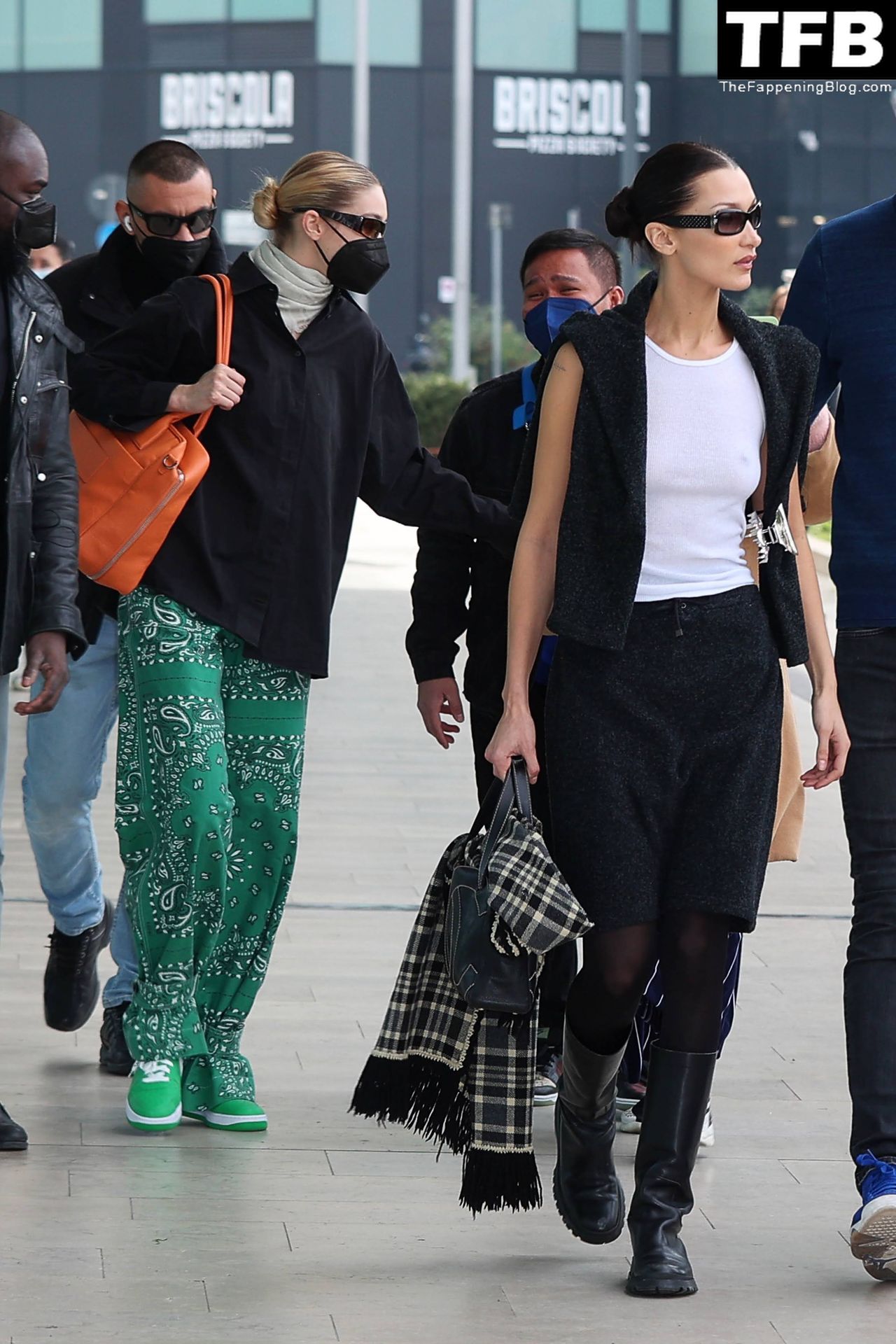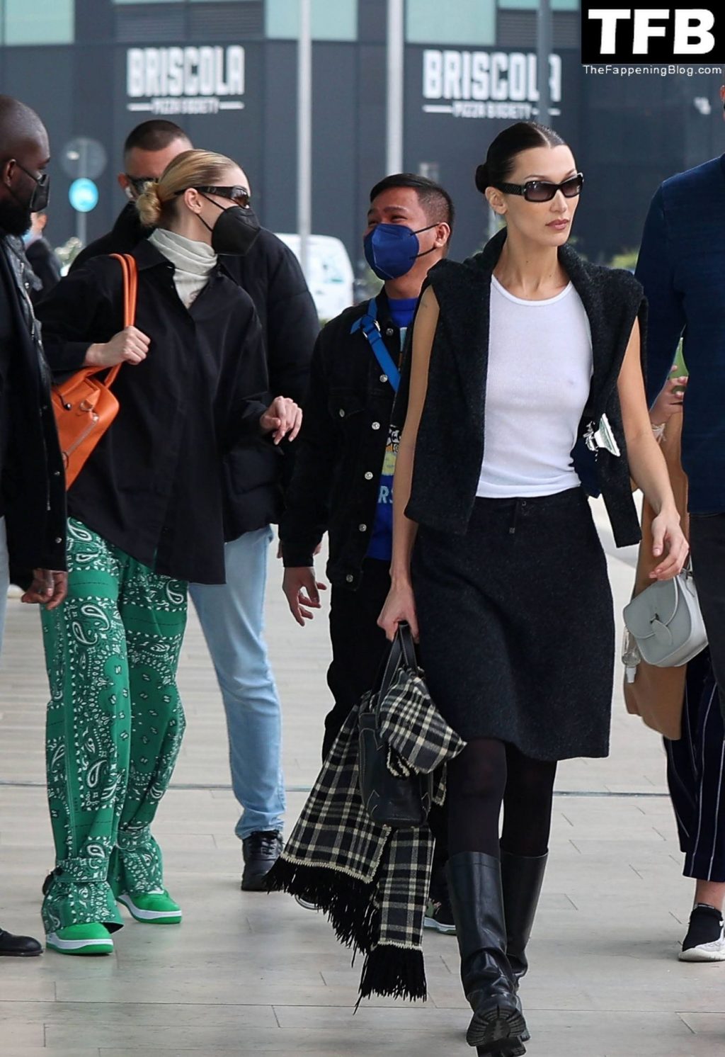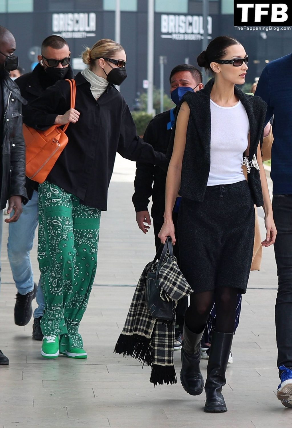 Bella Hadid sans soutien-gorge arrive au siège de Versace pendant la Fashion Week Milan Automne/Hiver 2022-23 à Milan, Italie, 24/02/2022.
