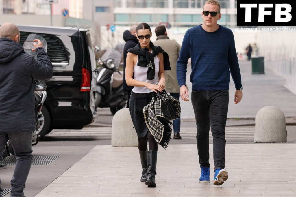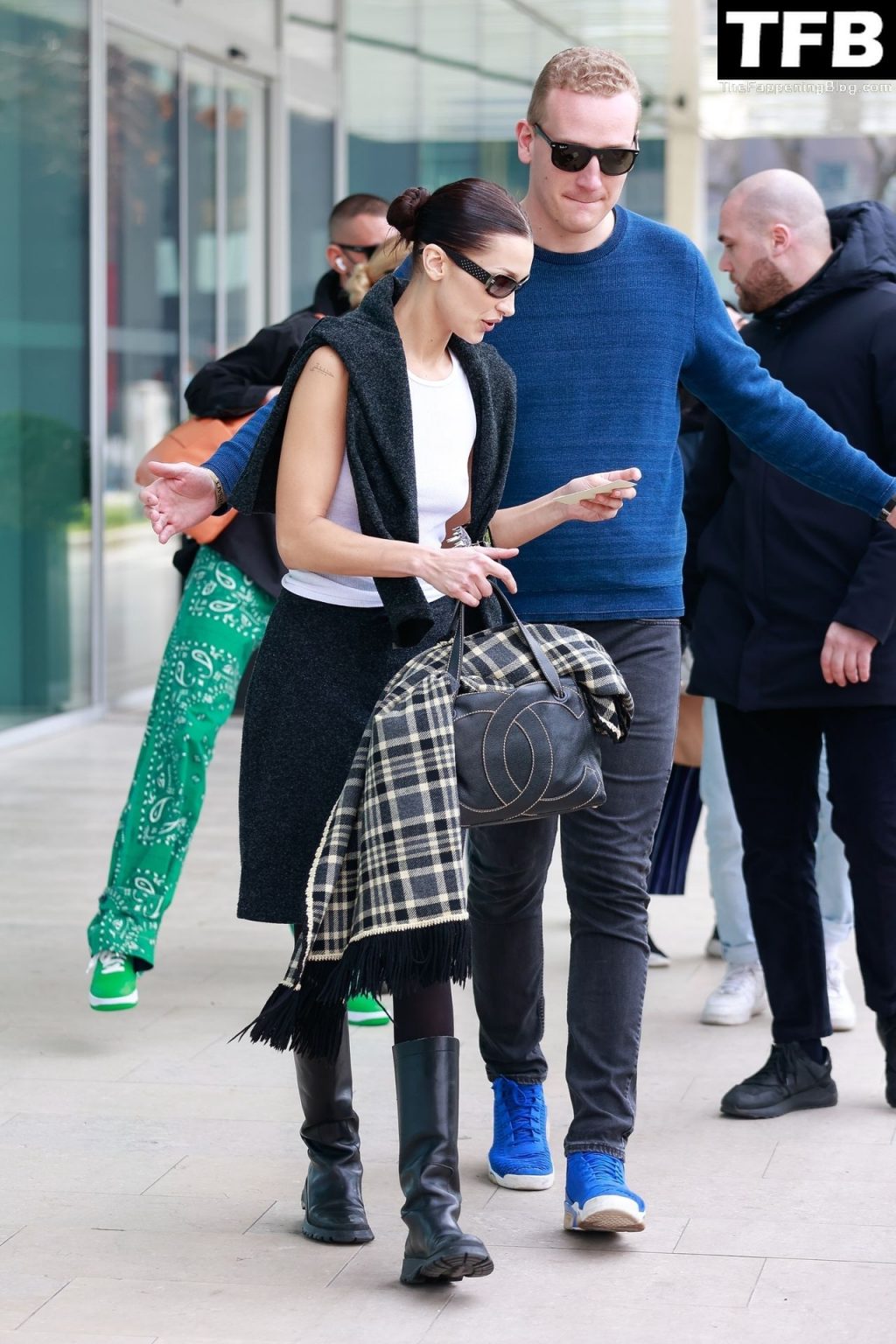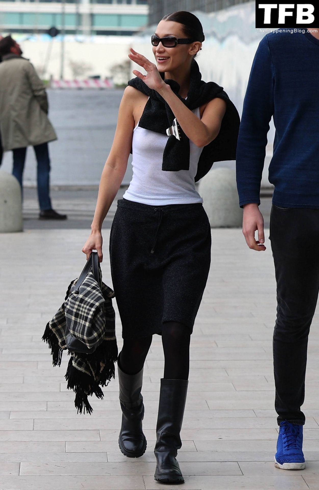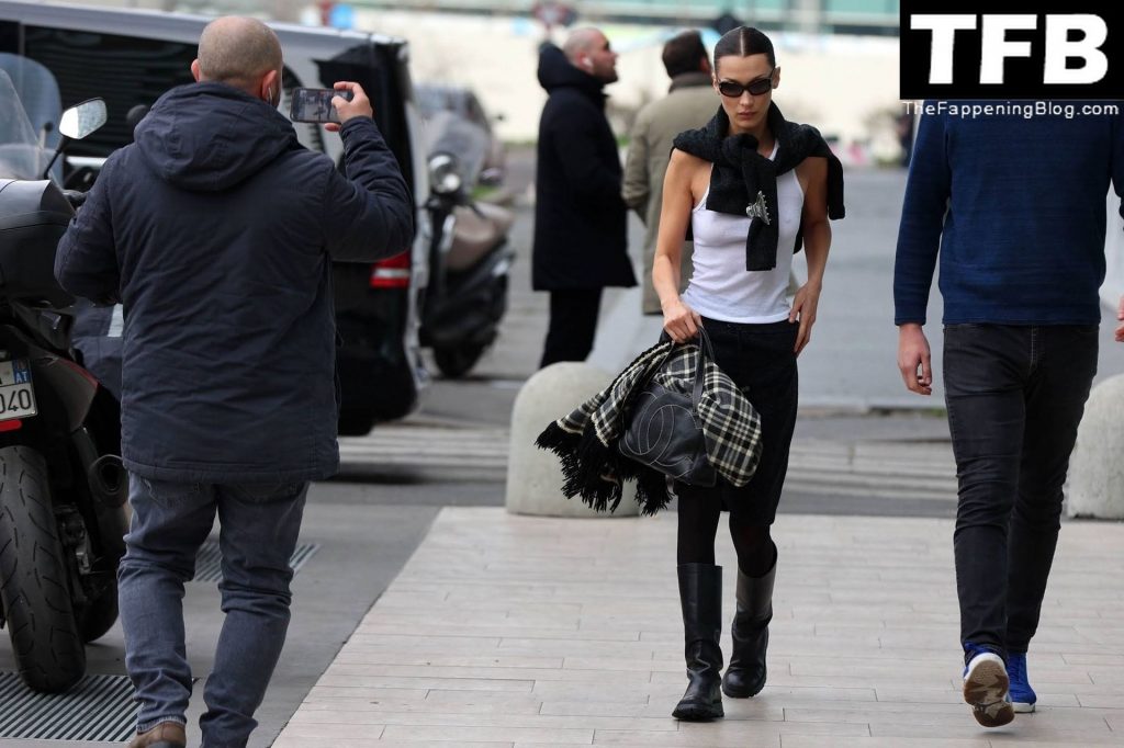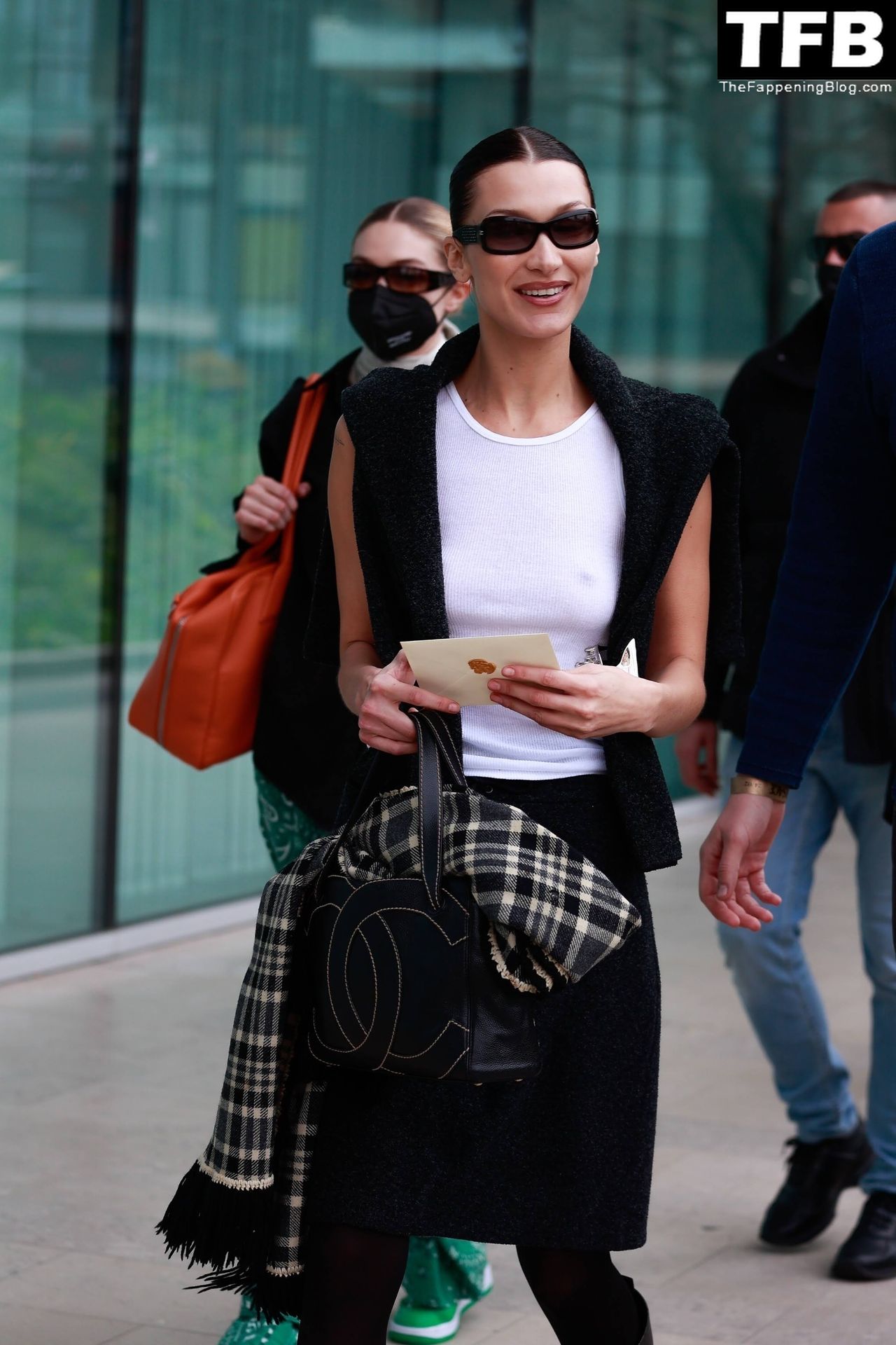 Bella Hadid sans soutien-gorge arrive au siège de Versace pendant la Fashion Week Milan Automne/Hiver 2022-23 à Milan, Italie, 24/02/2022.