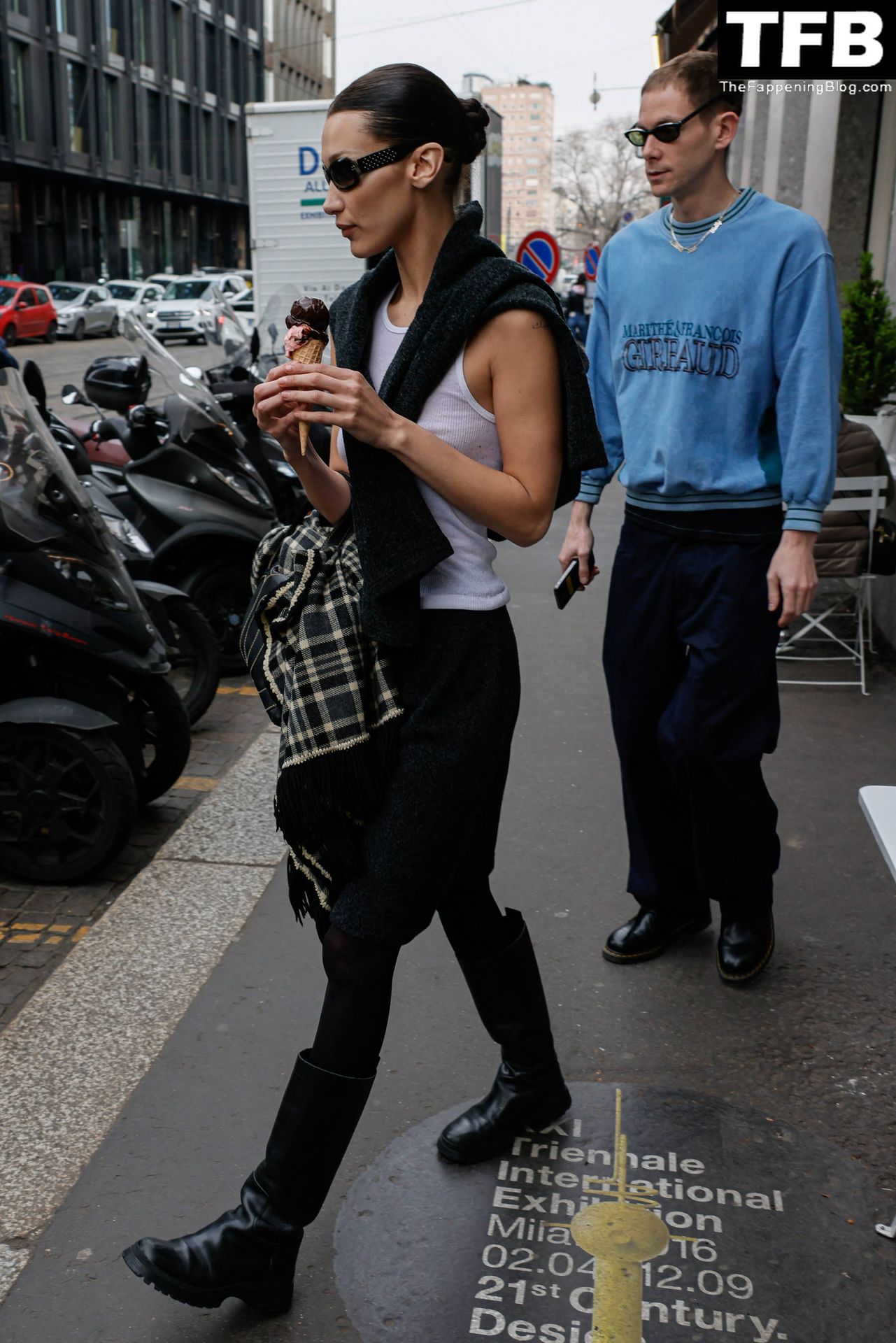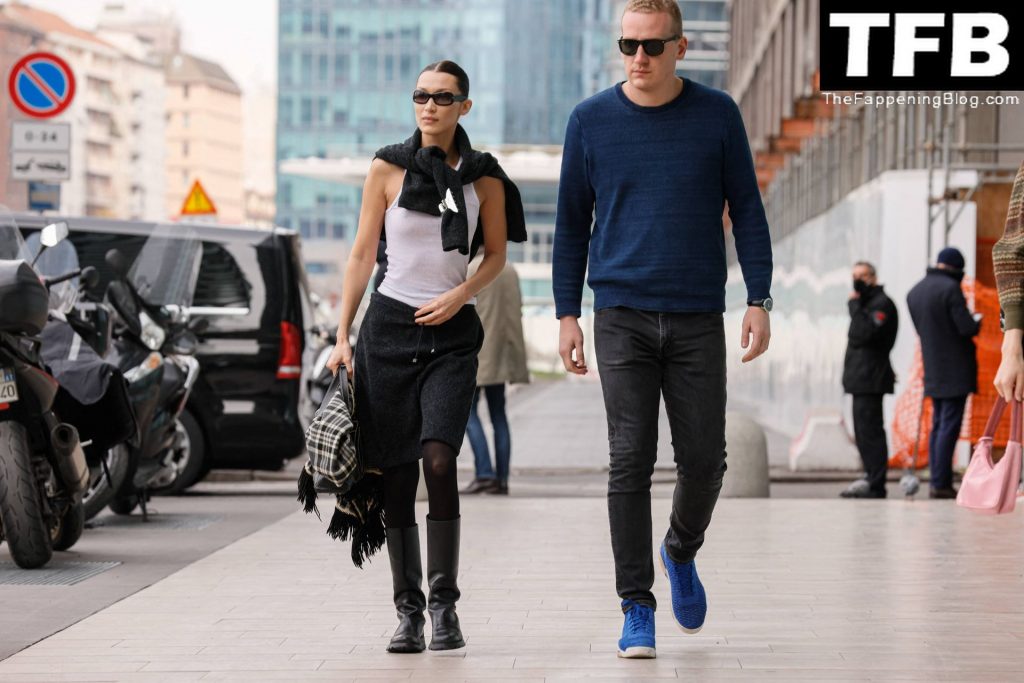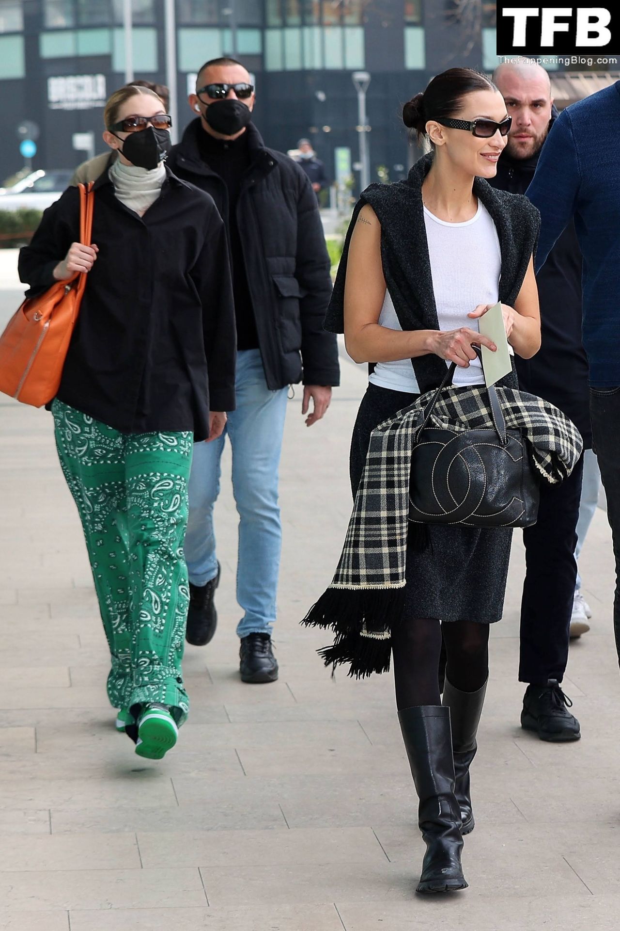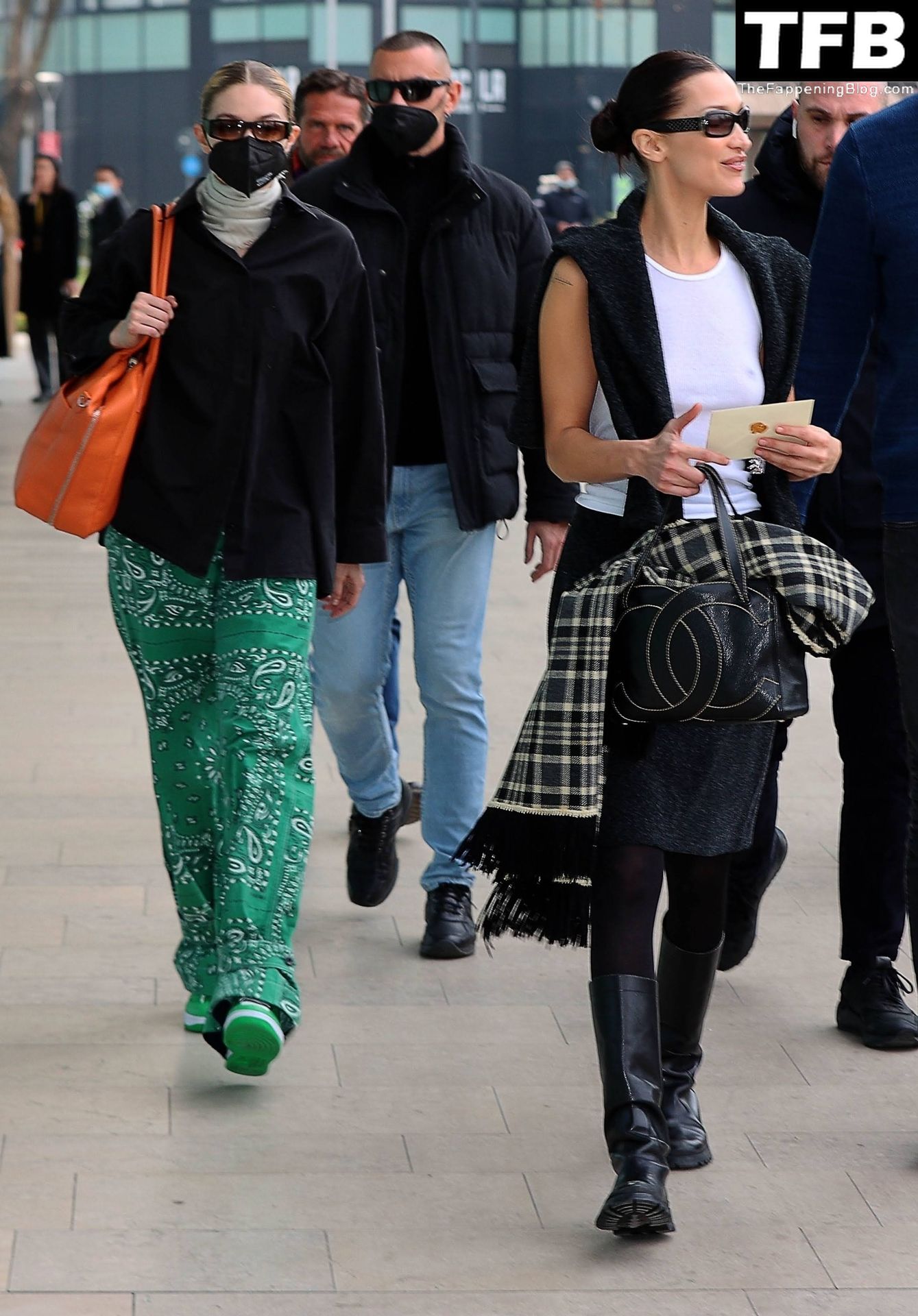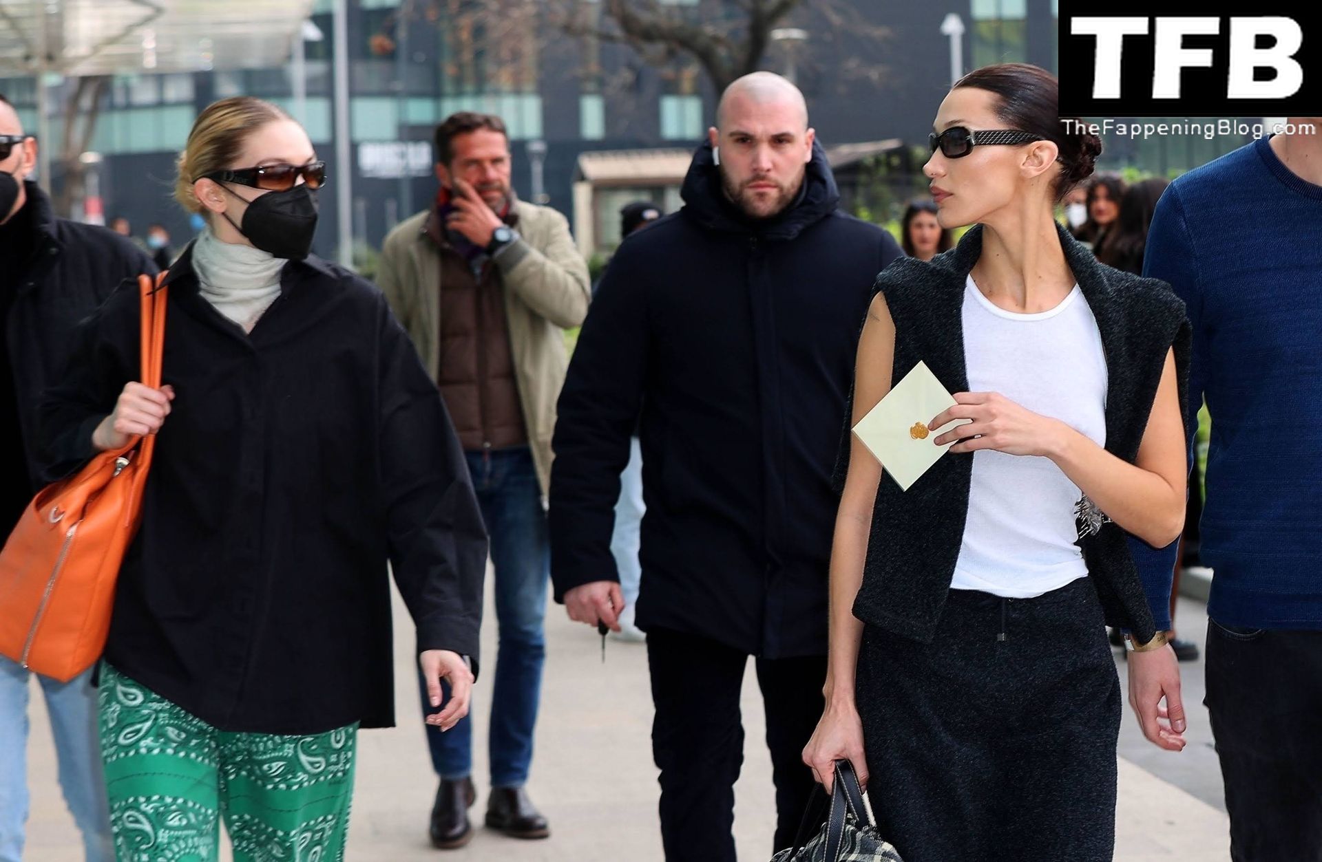 Bella Hadid sans soutien-gorge arrive au siège de Versace pendant la Fashion Week Milan Automne/Hiver 2022-23 à Milan, Italie, 24/02/2022.