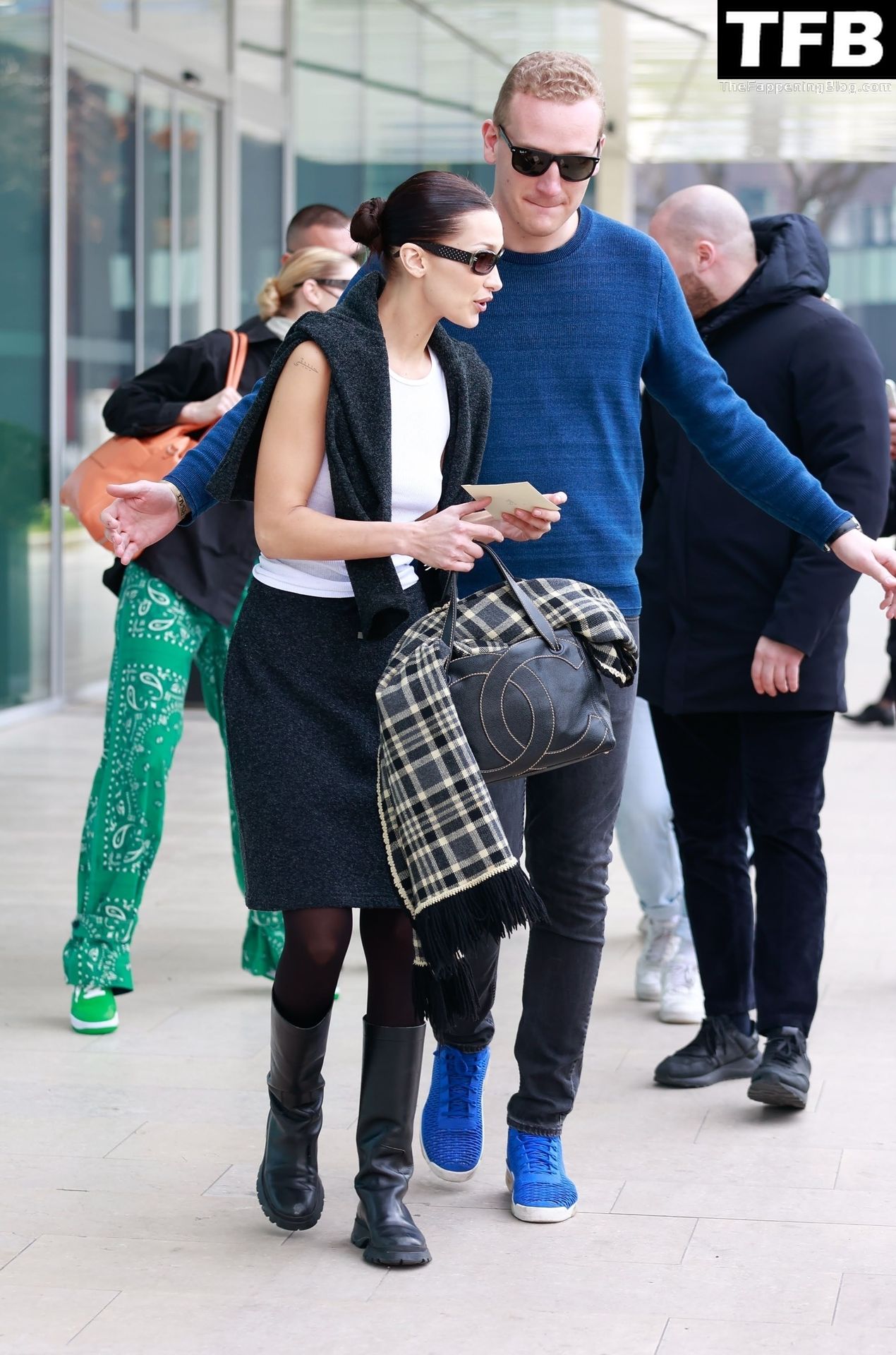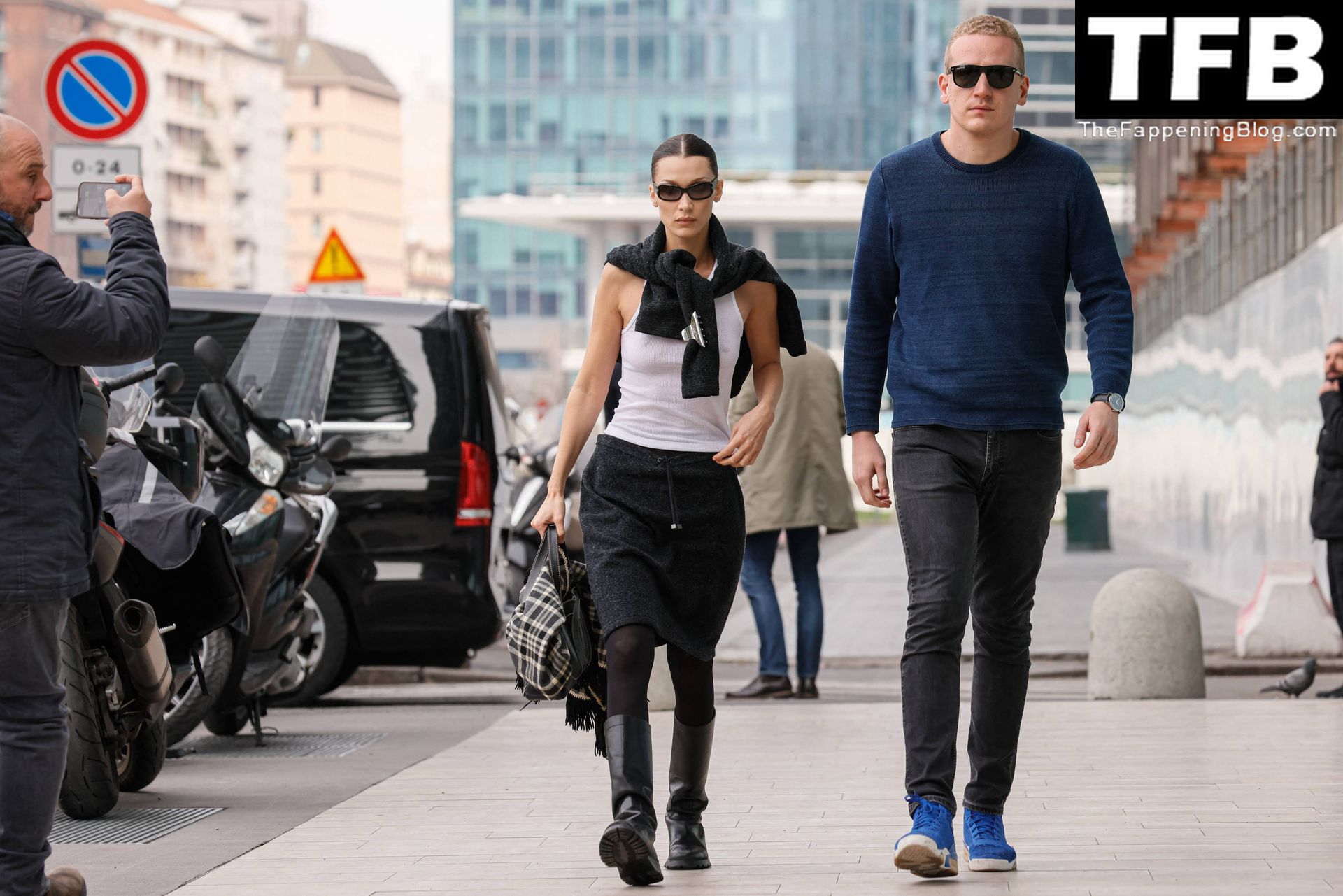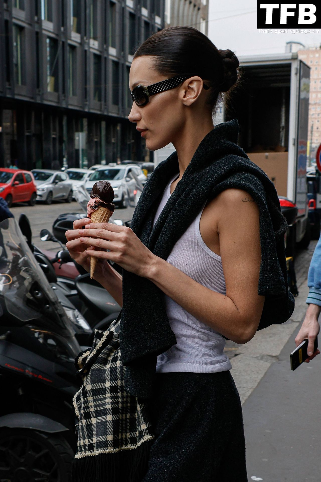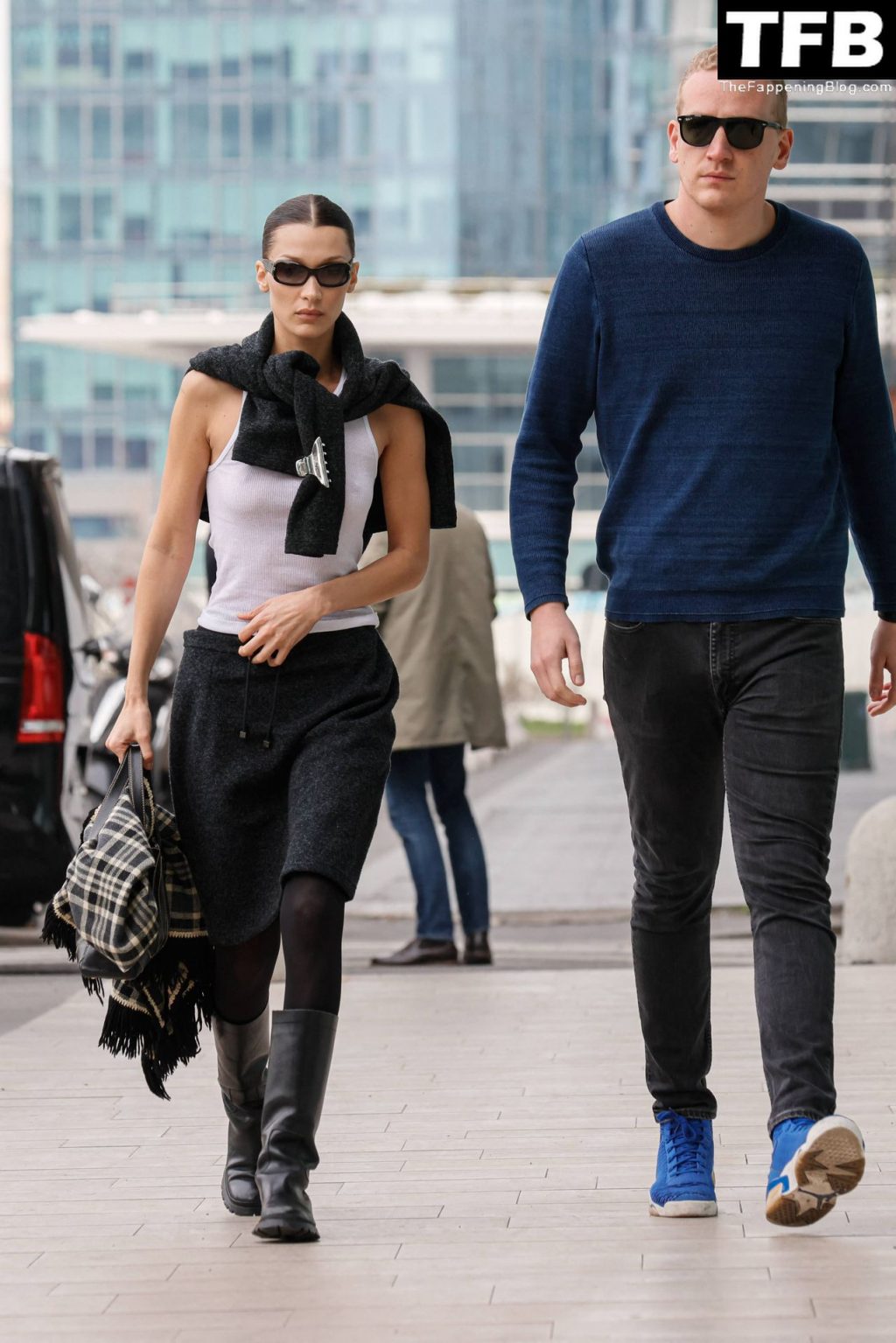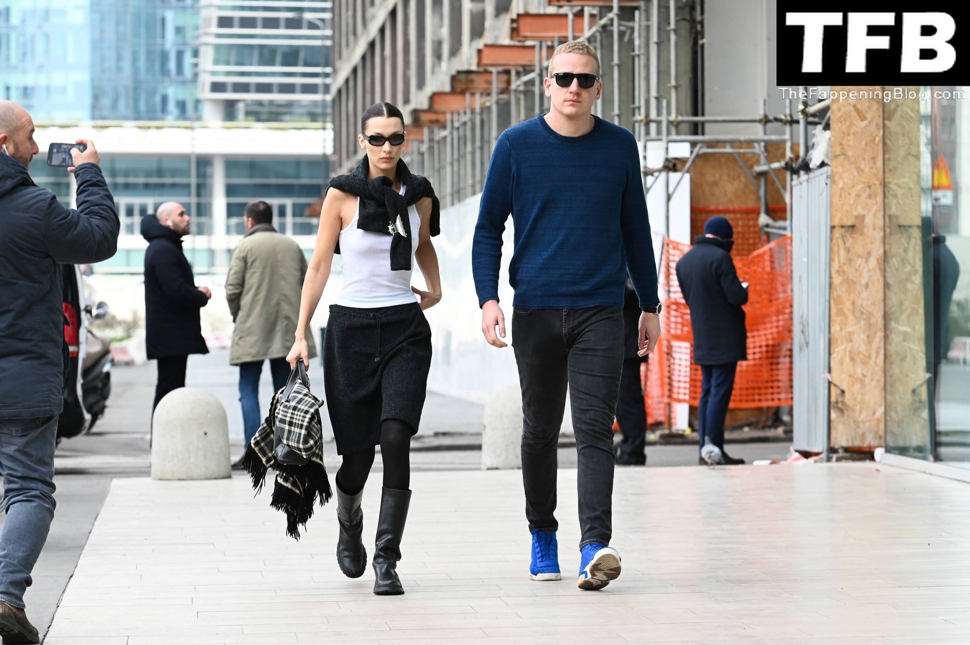 Bella Hadid sans soutien-gorge arrive au siège de Versace pendant la Fashion Week Milan Automne/Hiver 2022-23 à Milan, Italie, 24/02/2022.