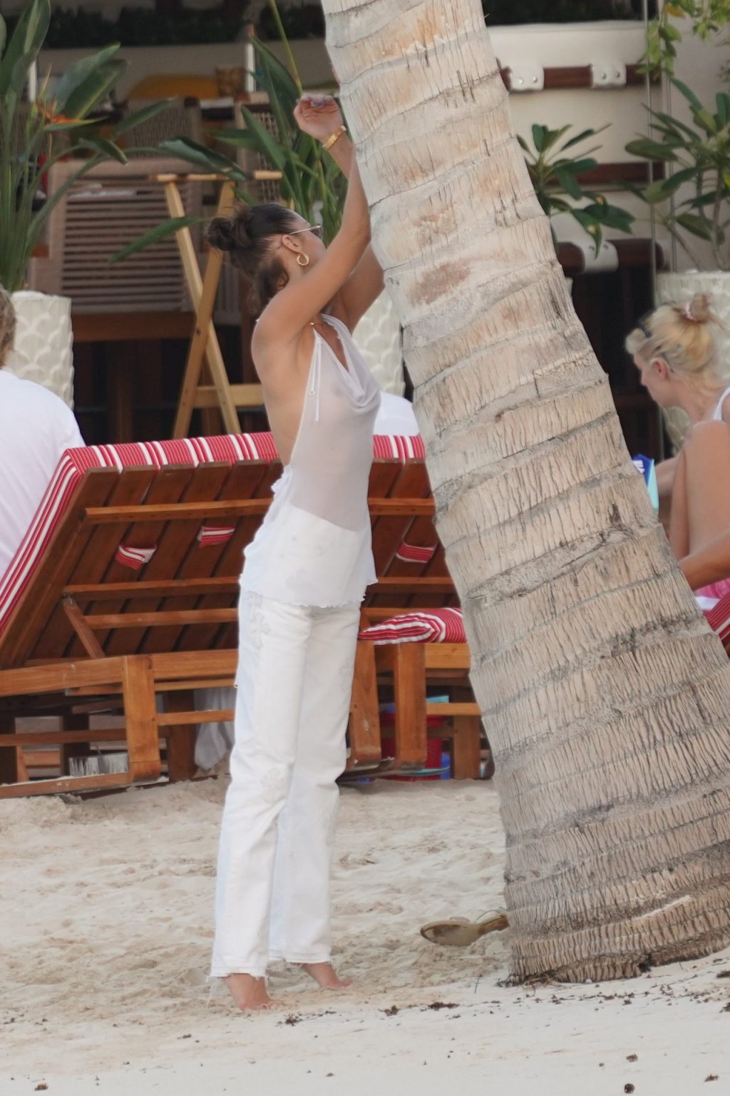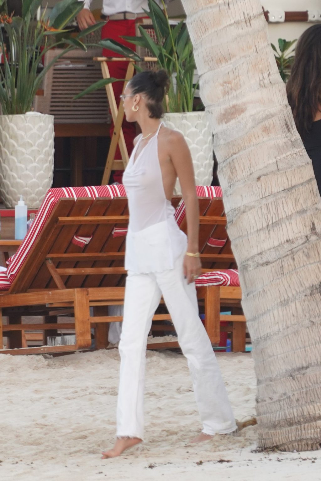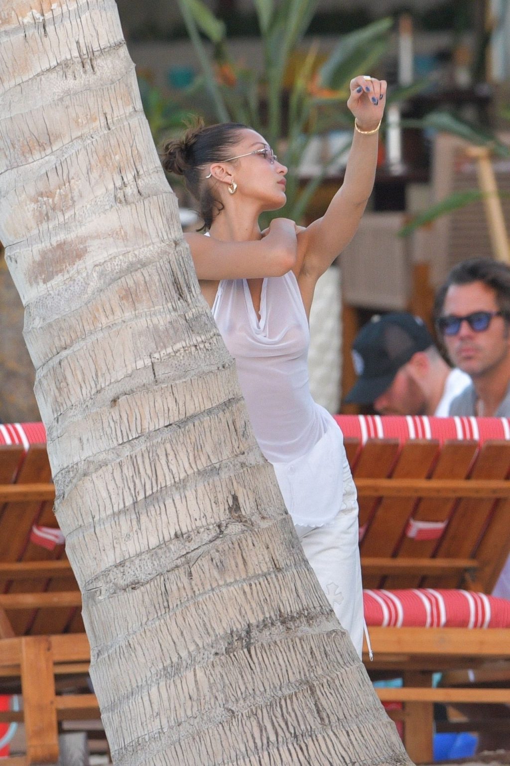 Model Bella Hadid continue de faire monter la température pendant ses vacances à St. Barts, 12/08/2019. Le mannequin portait un haut dos nu blanc transparent qui laissait peu de place à l’imagination en se promenant sur la plage de l’hôtel Eden Rock.