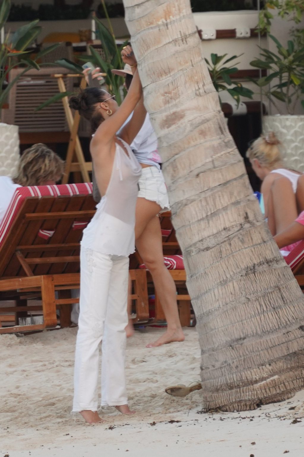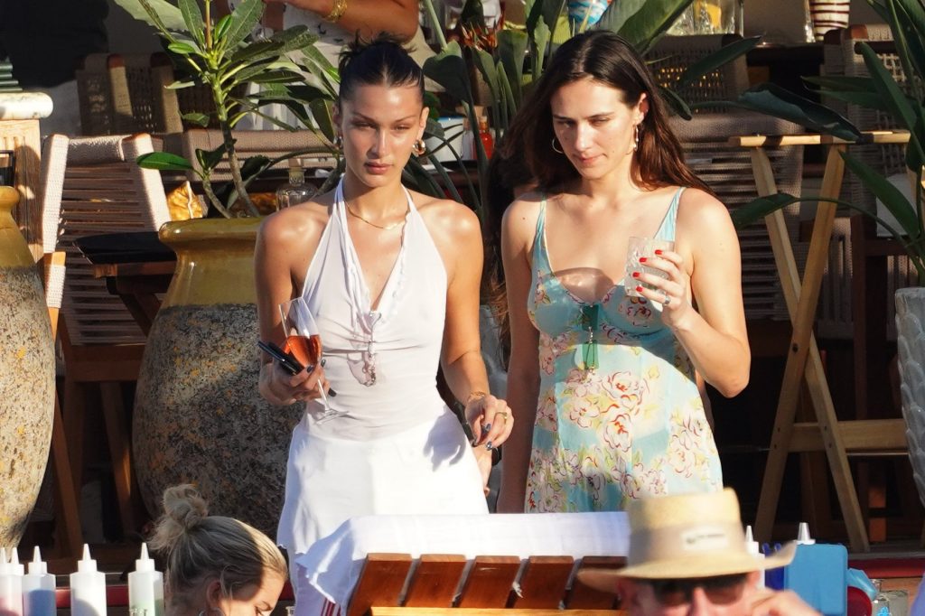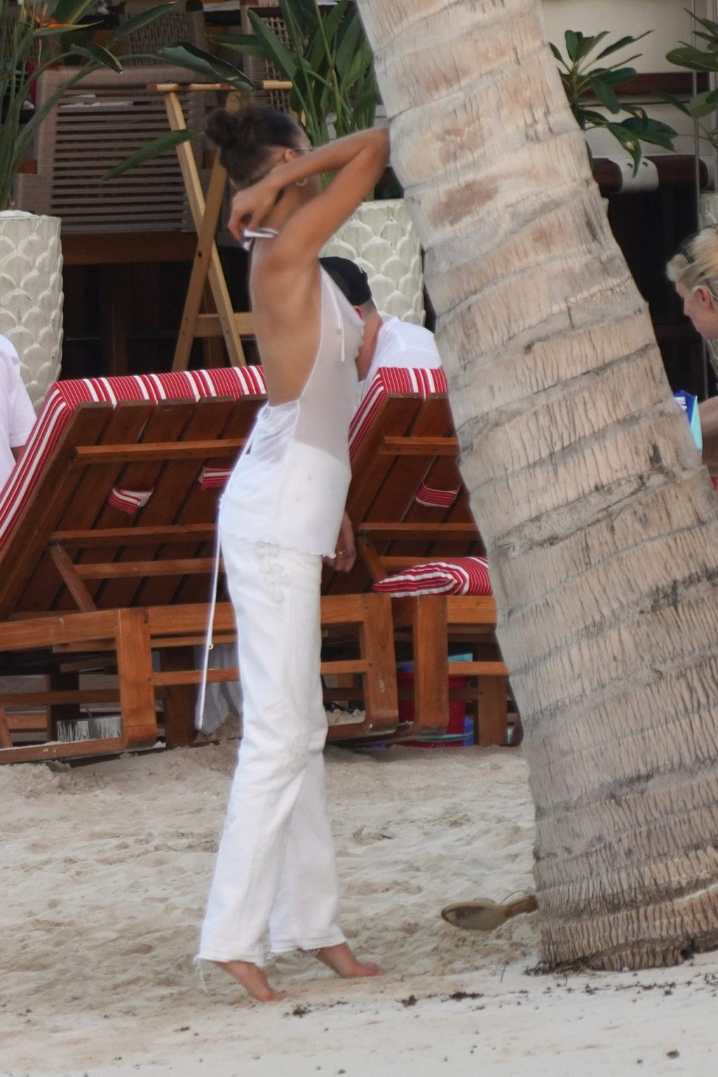 Model Bella Hadid continue de faire monter la température pendant ses vacances à St. Barts, 12/08/2019. Le mannequin portait un haut dos nu blanc transparent qui laissait peu de place à l’imagination en se promenant sur la plage de l’hôtel Eden Rock.