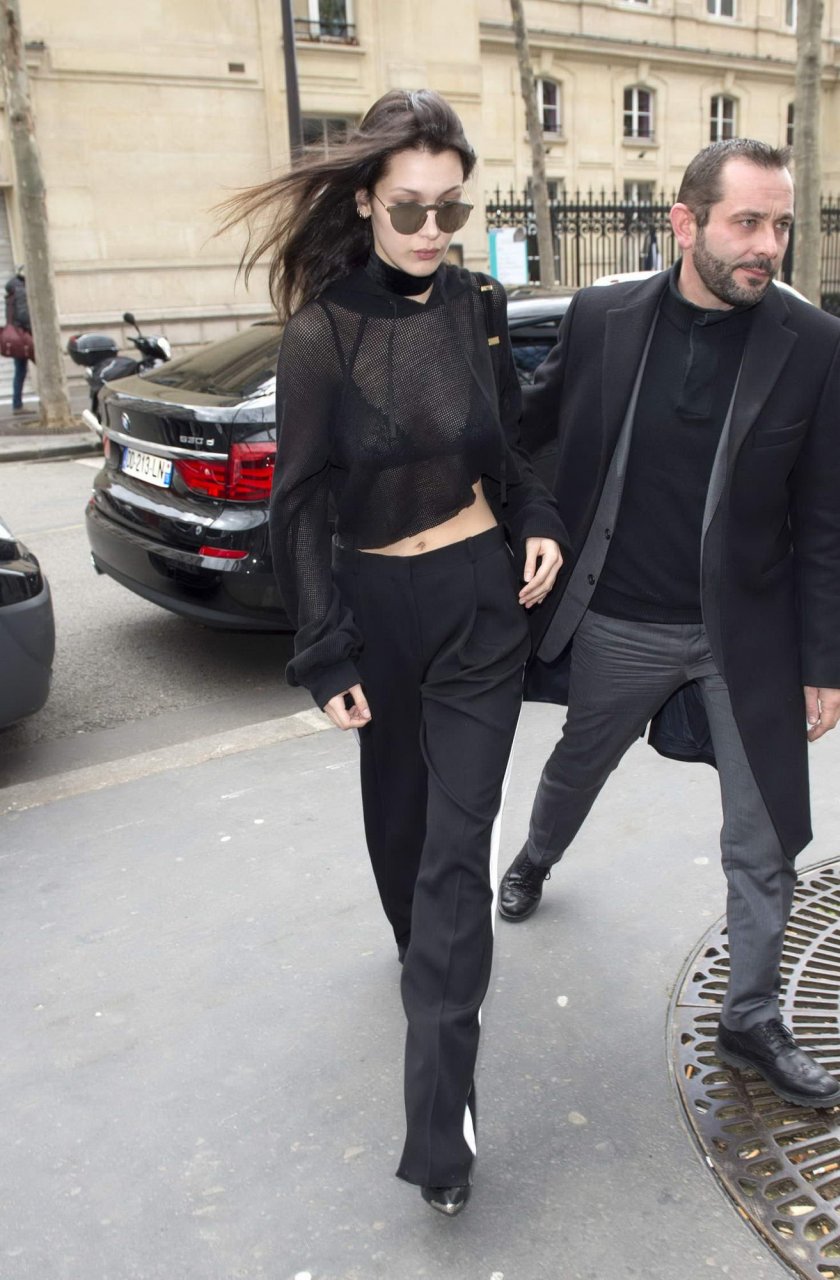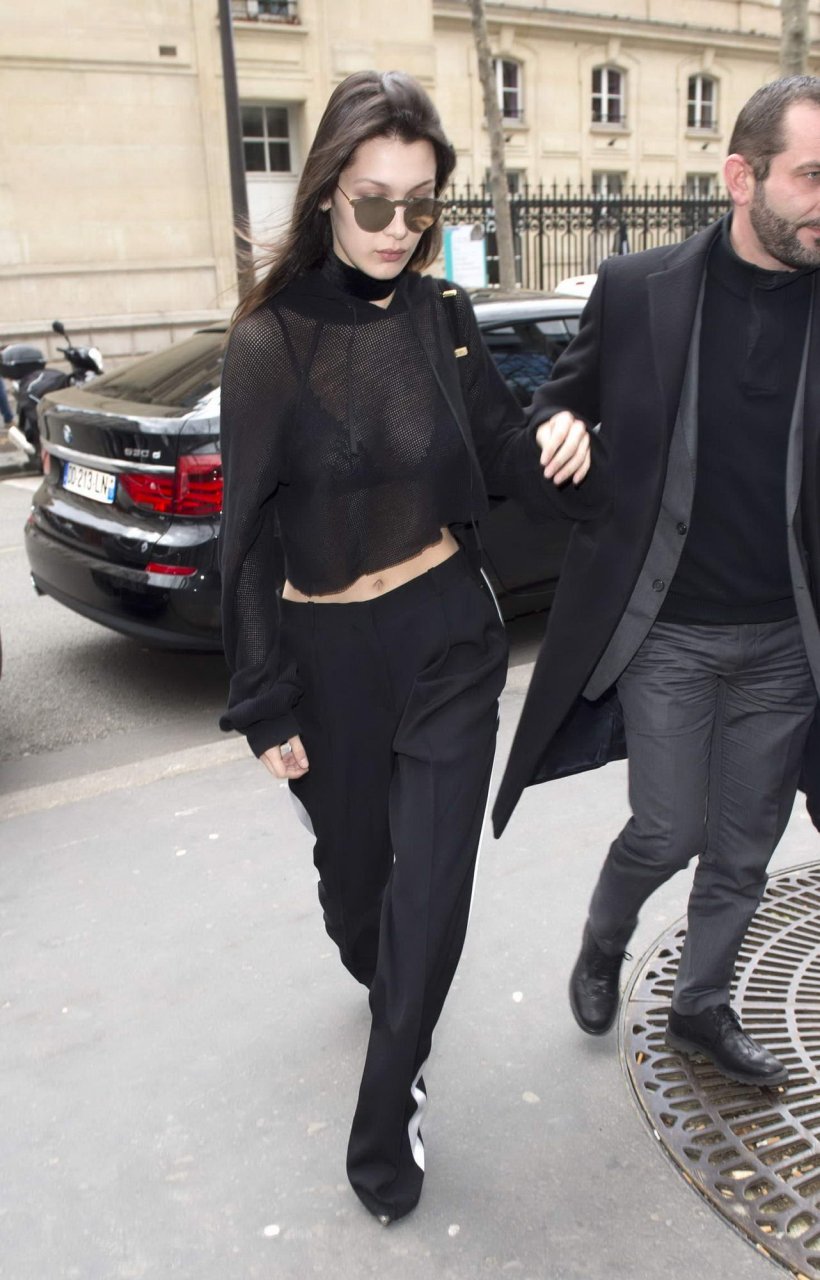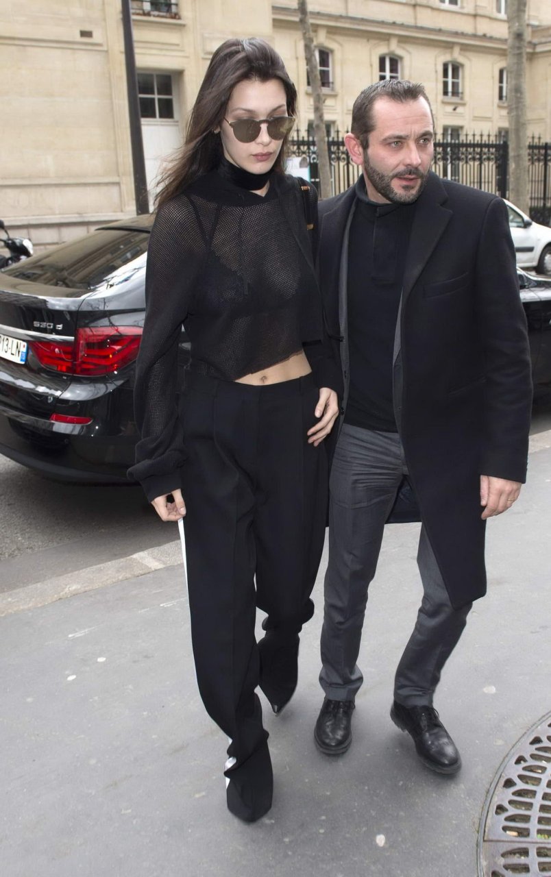 Bella Hadid arrivant à son hôtel à Paris, 03/05/2016. Magnifiques photos doubles transparentes ! Bella Hadid est un mannequin américain. Âge : 19 ans (9 octobre, 1996)