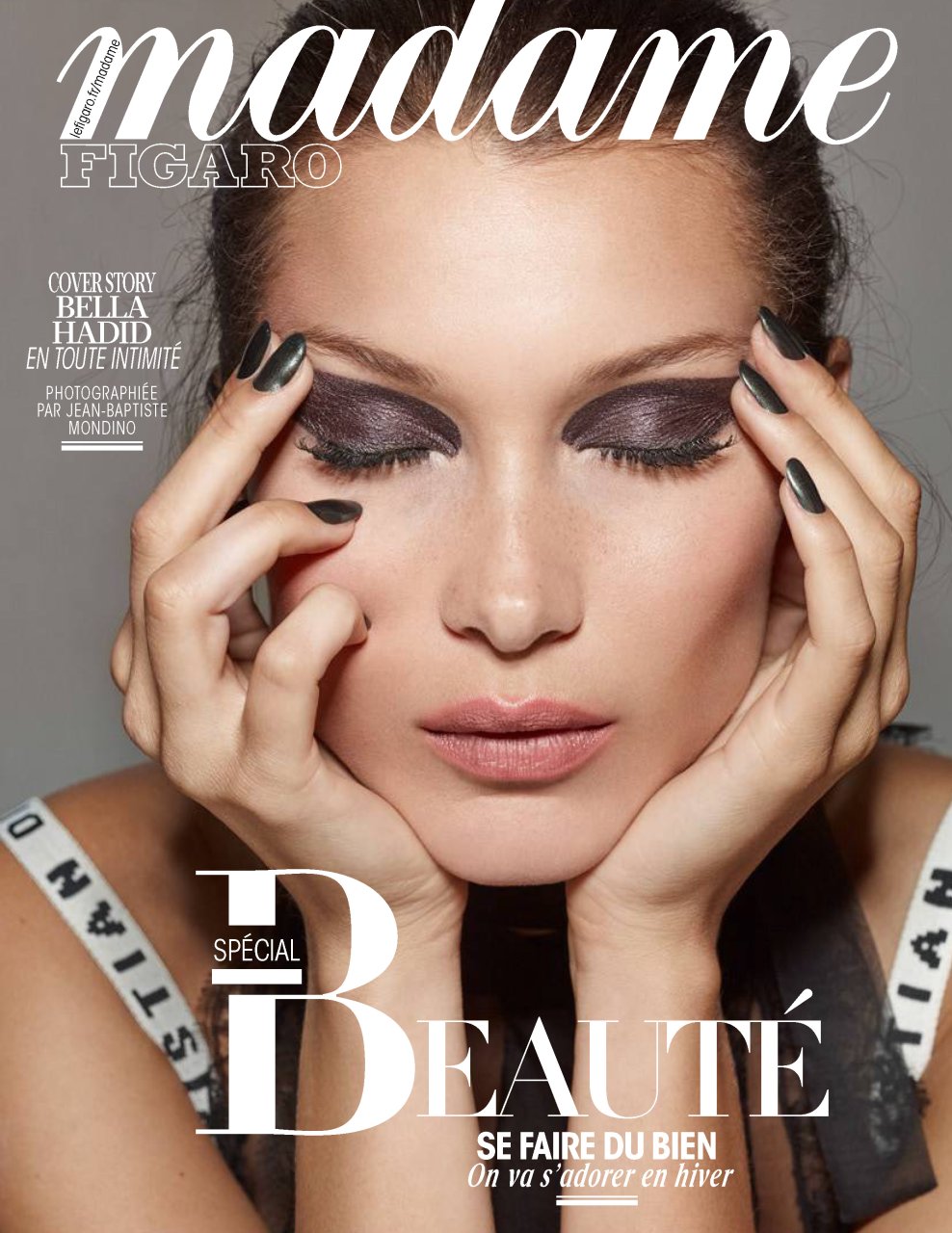Bella Hadid est dans le magazine Madame Figaro, 27/10/2017. Photos par Jean-Baptiste Mondino. Isabella Hadid est un top modèle américain de la mode, star de la télé-réalité, actrice. Âge – 21 ans.