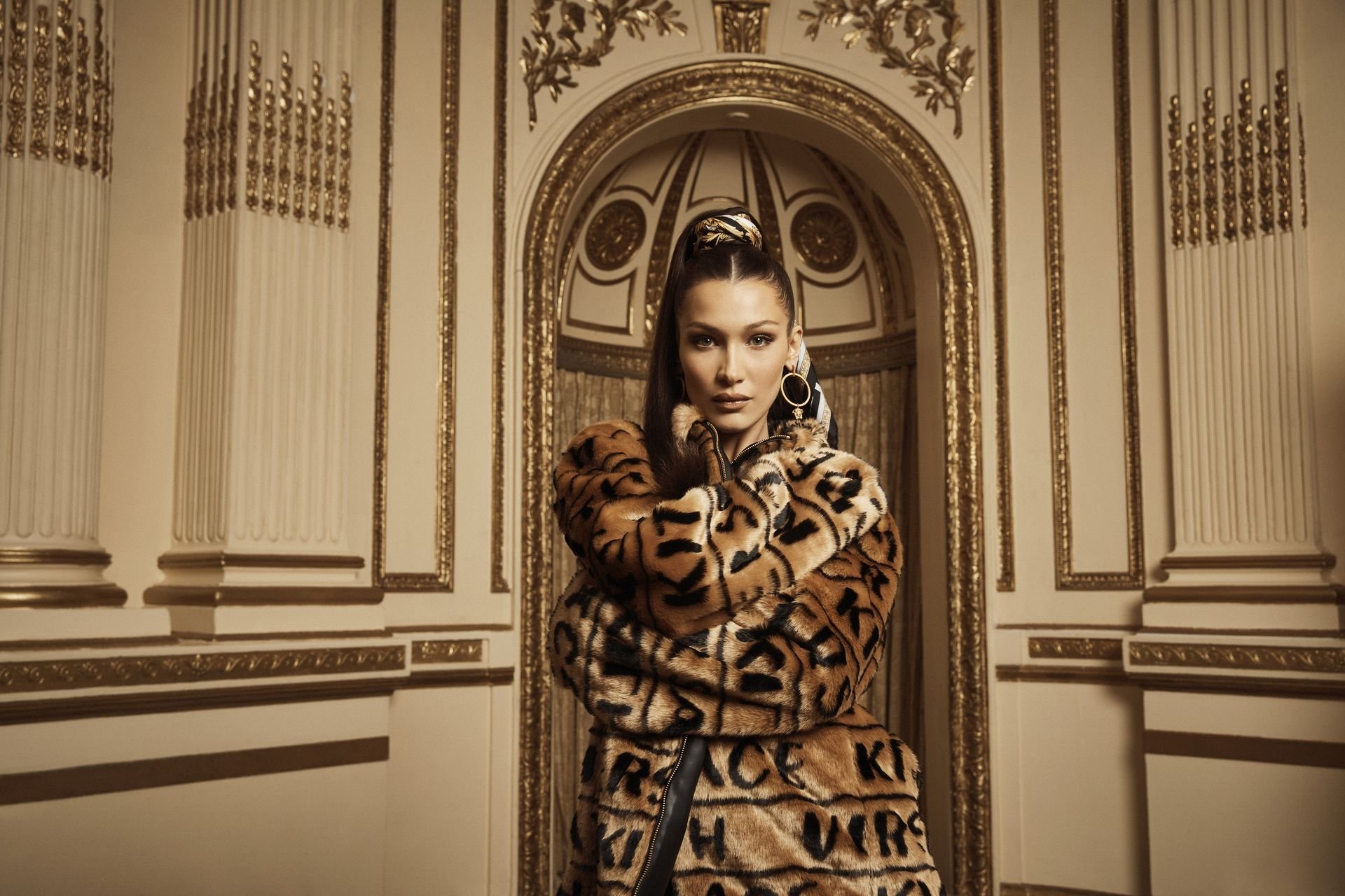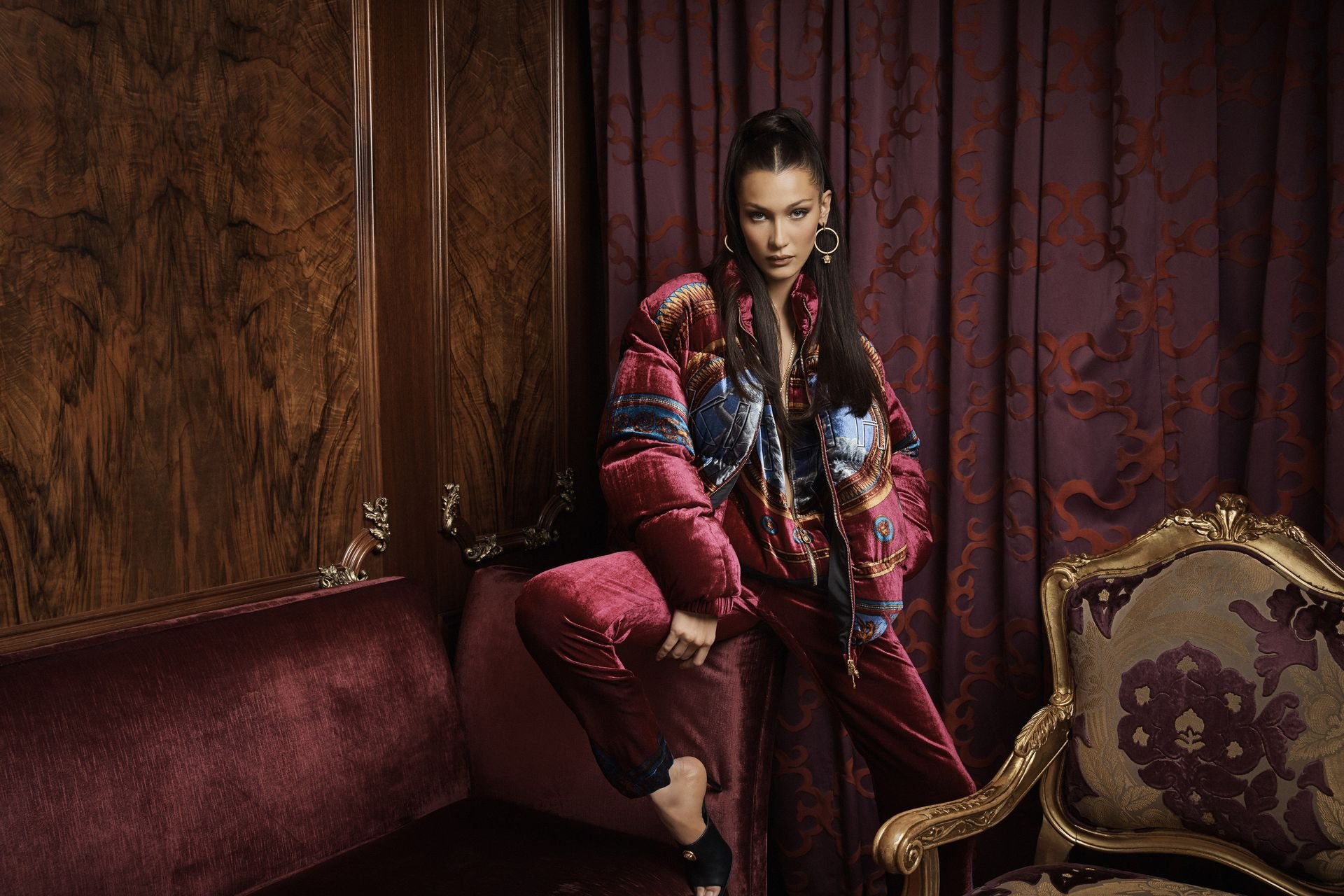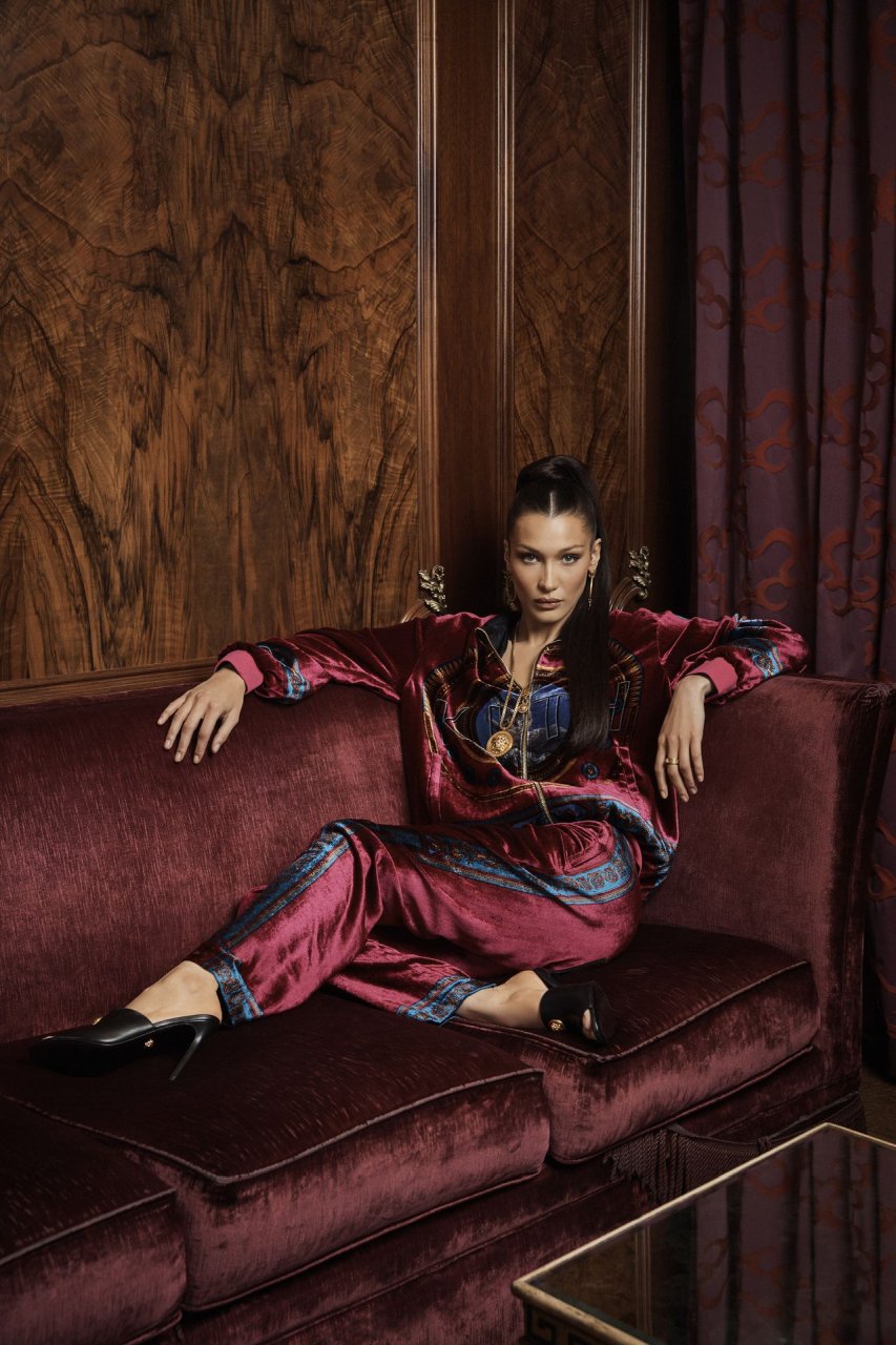 Dans les photos révélatrices, on peut voir Bella poser en shorts de cycliste, blouses, bikinis, survêtements, doudounes et même un babushka approuvé par A$AP Rocky, tous couverts de l’imprimé noir et or signature de la maison de mode italienne.