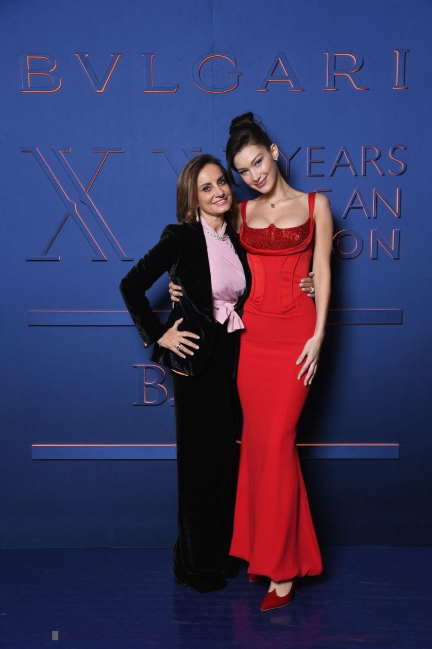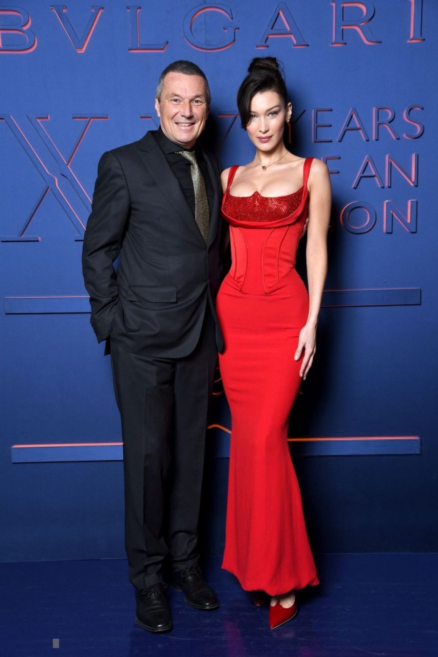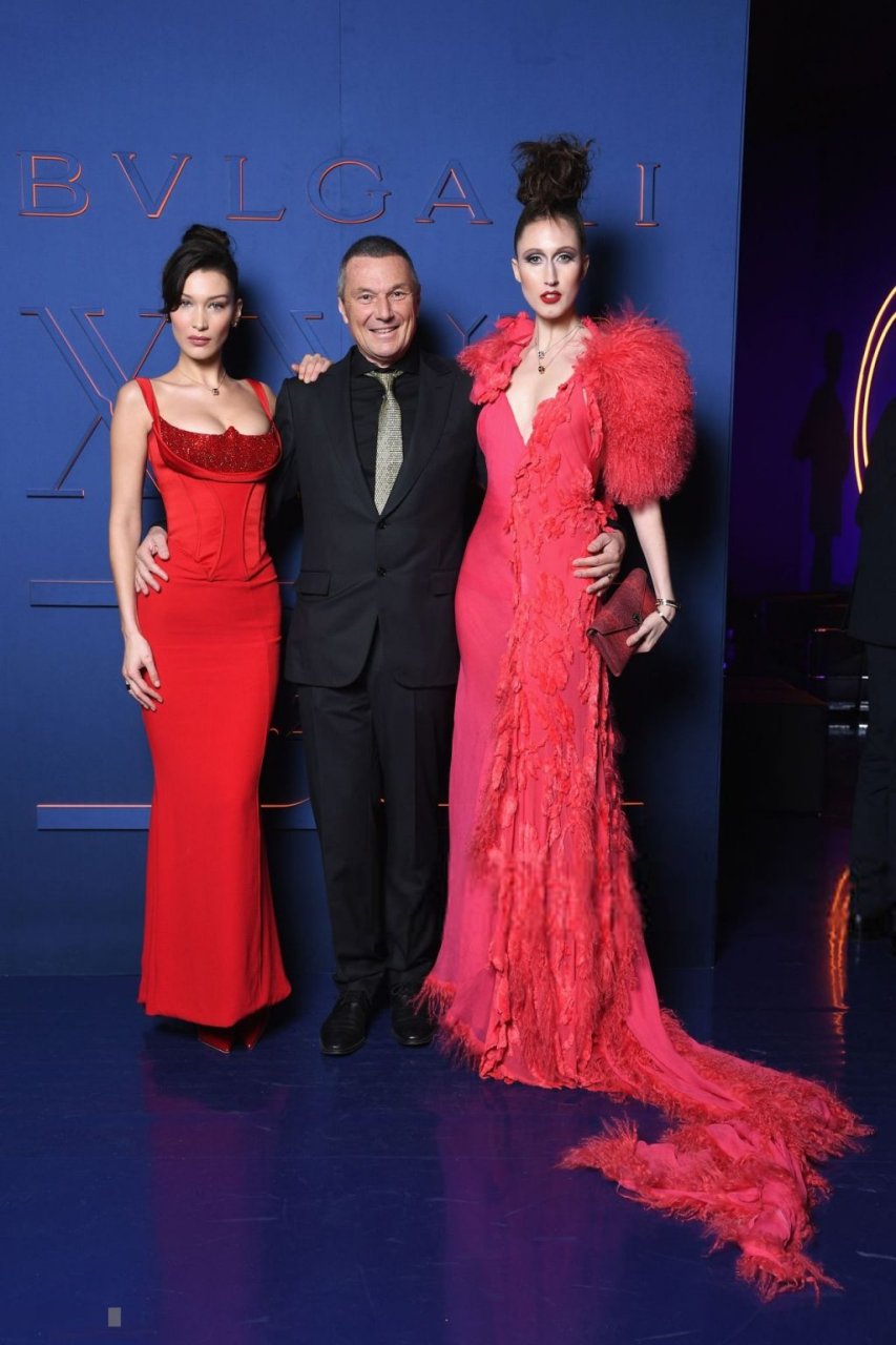 La soirée de la marque Bvlgari a eu lieu à Rome, le 19/02/2019. Des célébrités et des amis de la marque ont assisté à l’événement. Tous les invités ont choisi des tenues de soirée spectaculaires. Le mannequin Bella Hadid (22 ans) est apparue dans une robe rouge Versace avec un décolleté plongeant et un corset, mettant en valeur sa taille fine.