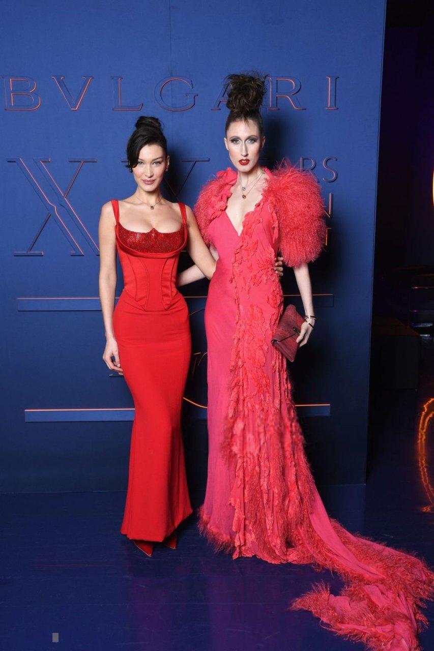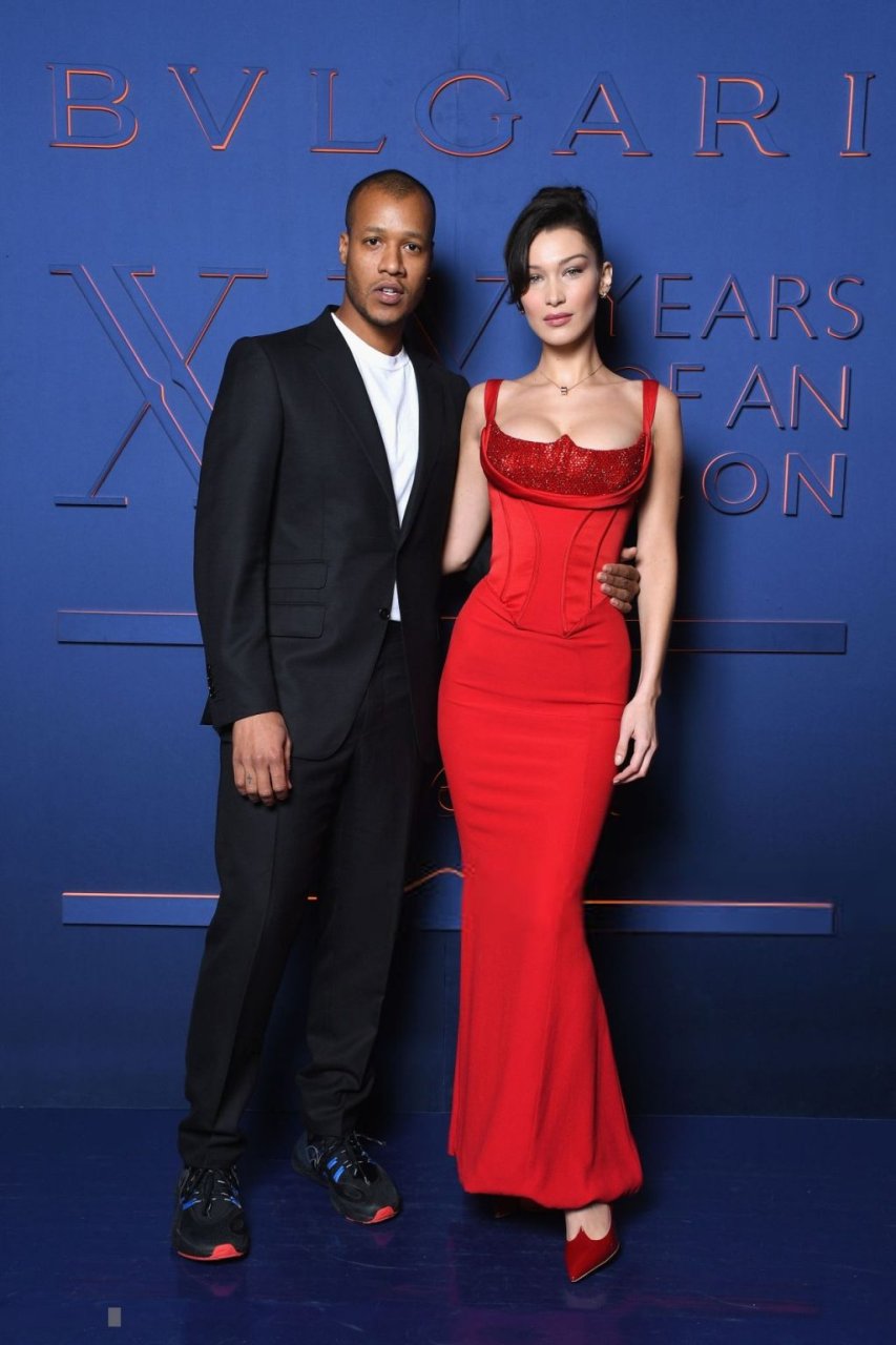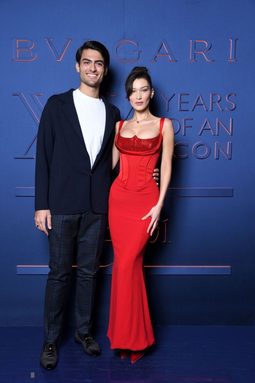 La soirée de la marque Bvlgari a eu lieu à Rome, le 19/02/2019. Des célébrités et des amis de la marque ont assisté à l’événement. Tous les invités ont choisi des tenues de soirée spectaculaires. Le mannequin Bella Hadid (22 ans) est apparue dans une robe rouge Versace avec un décolleté plongeant et un corset, mettant en valeur sa taille fine.
