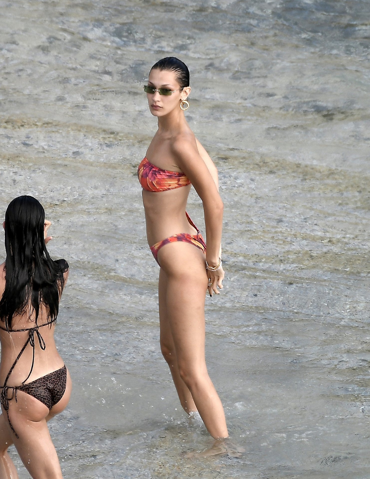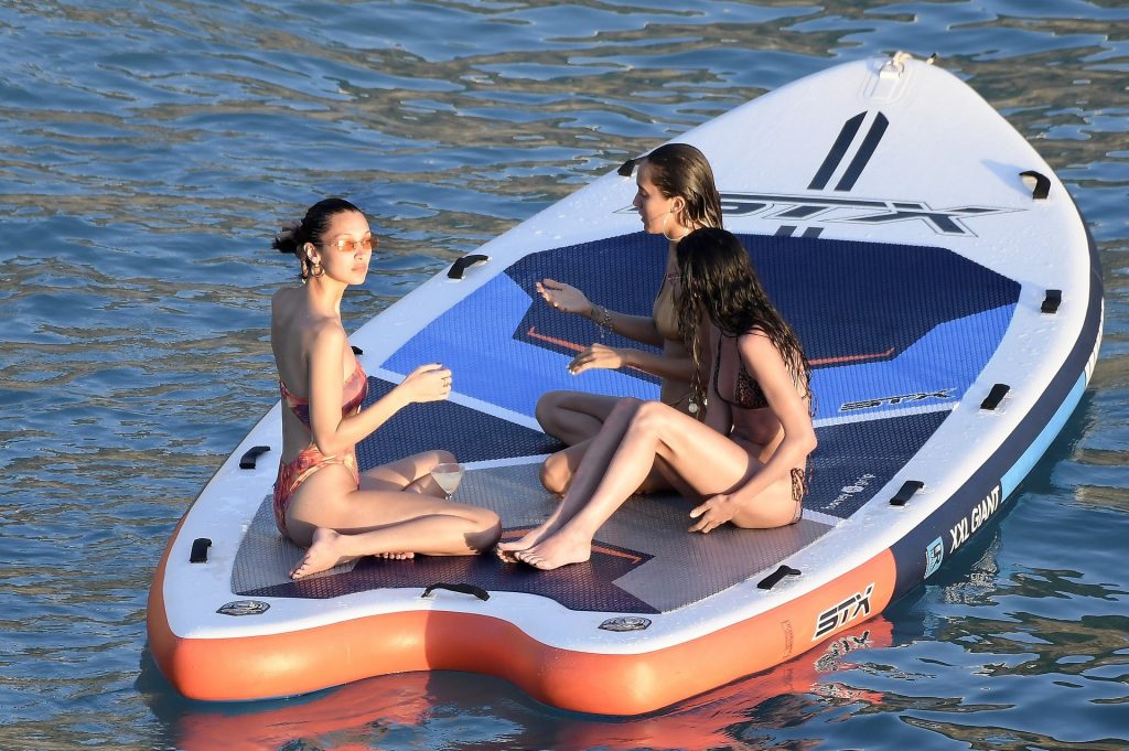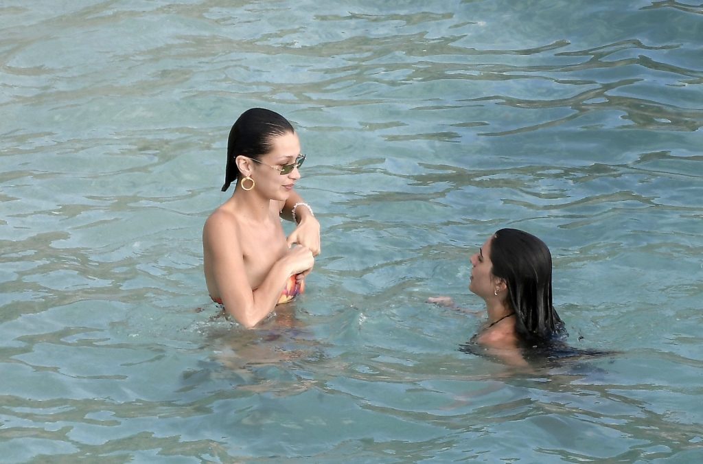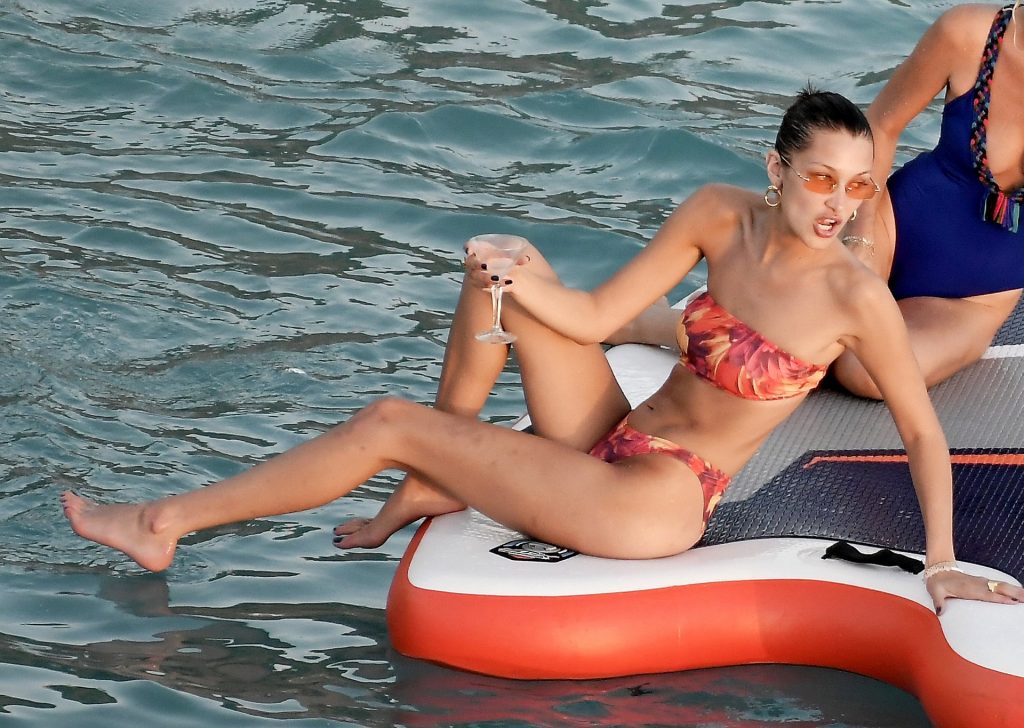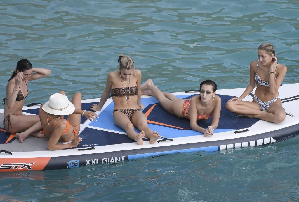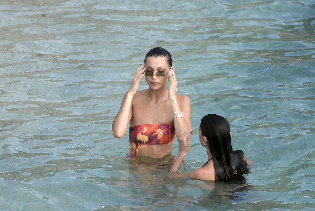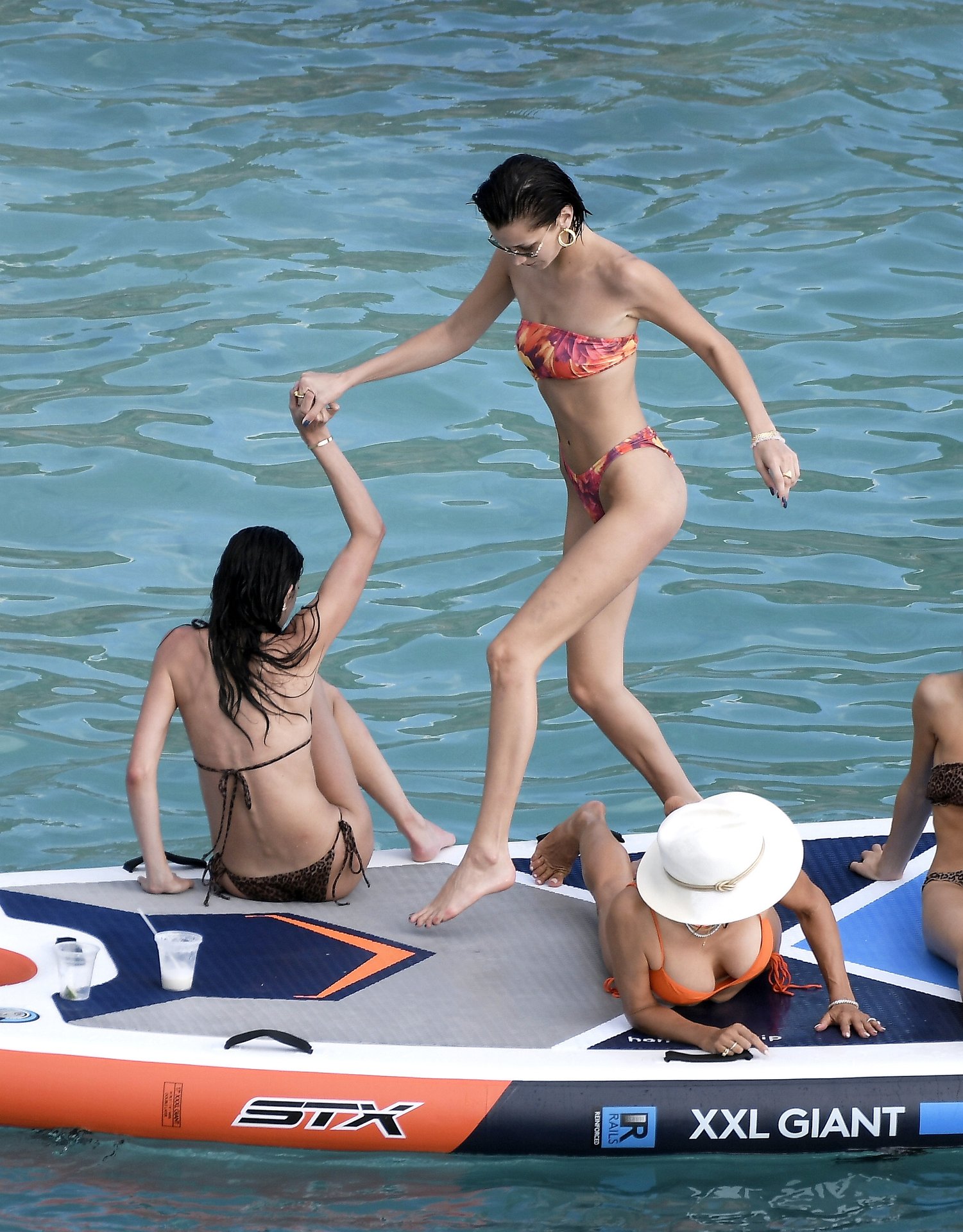 Bella Hadid affiche son incroyable silhouette dans un minuscule bikini tout en profitant du soleil des Caraïbes avec des amis, dont Jesse Jo Stark, Jordan Barrett, Devon Carlson et Lauren Perez à St Barths, le 12/07/2019.