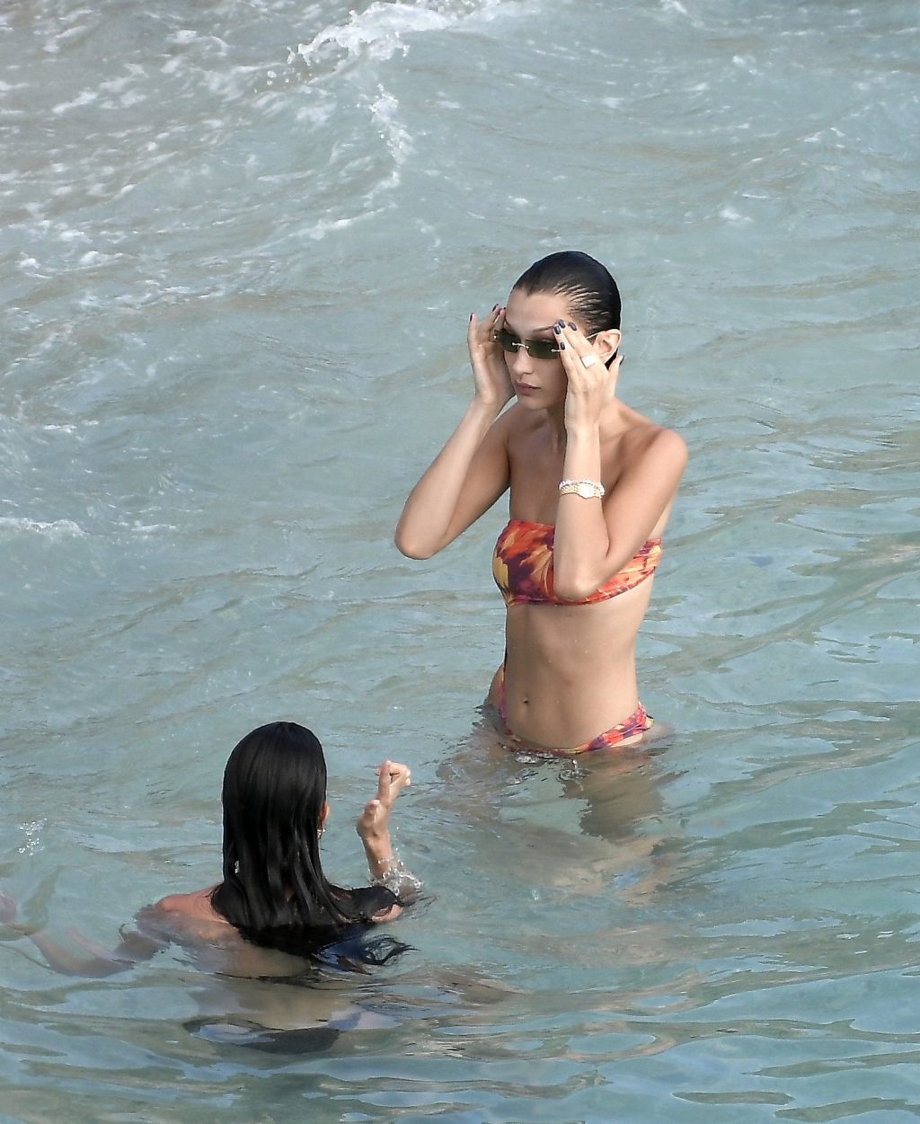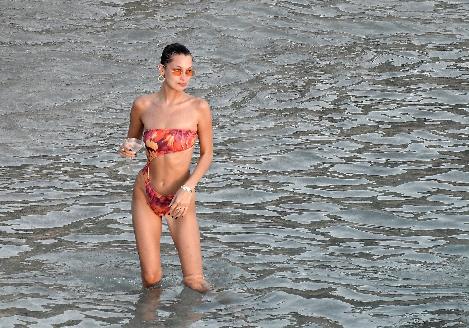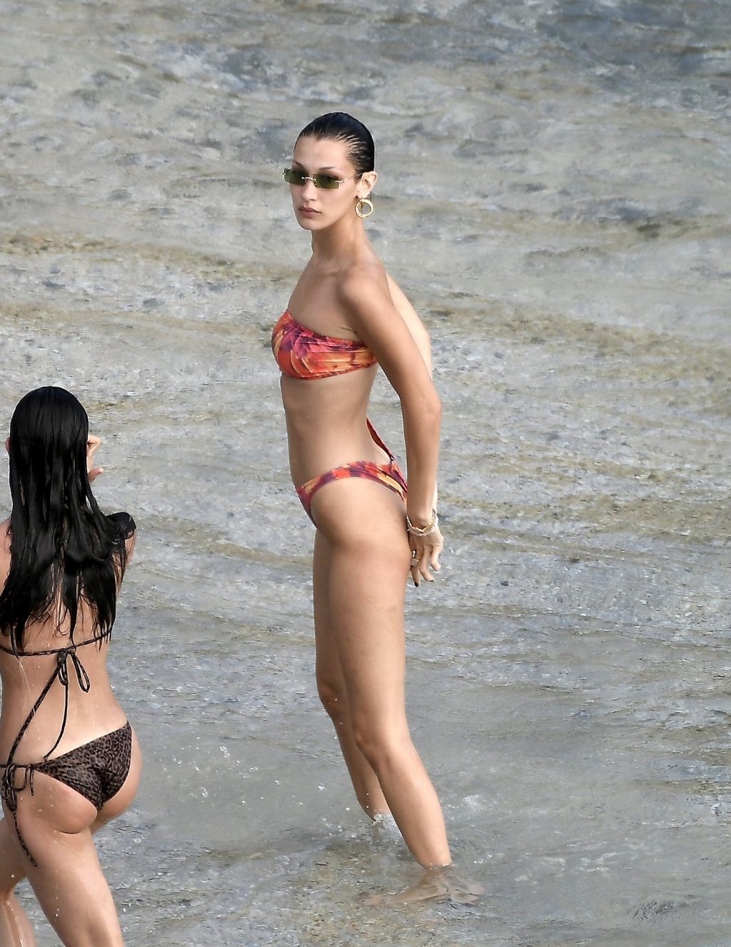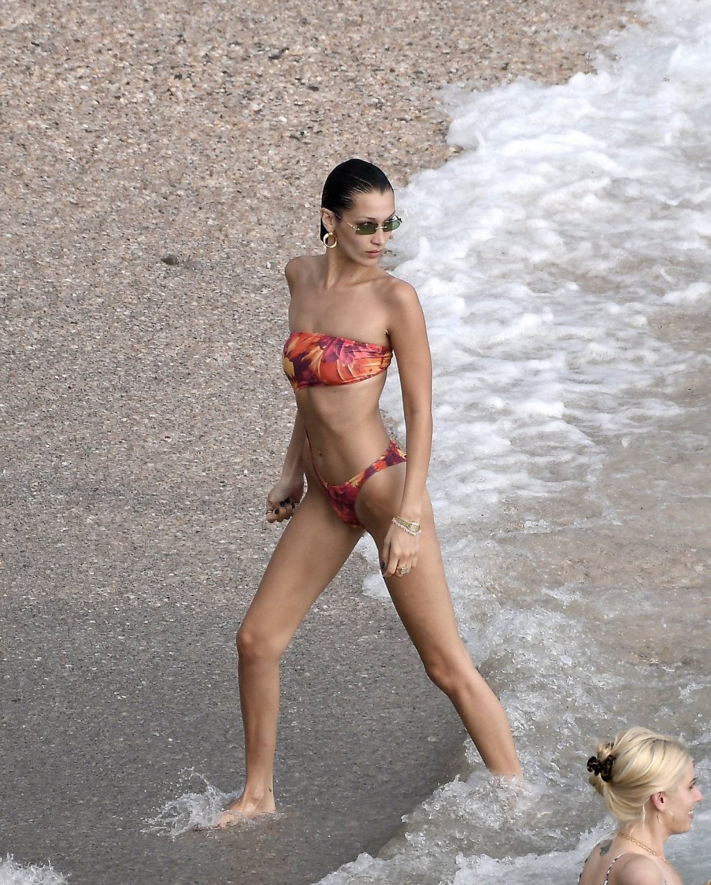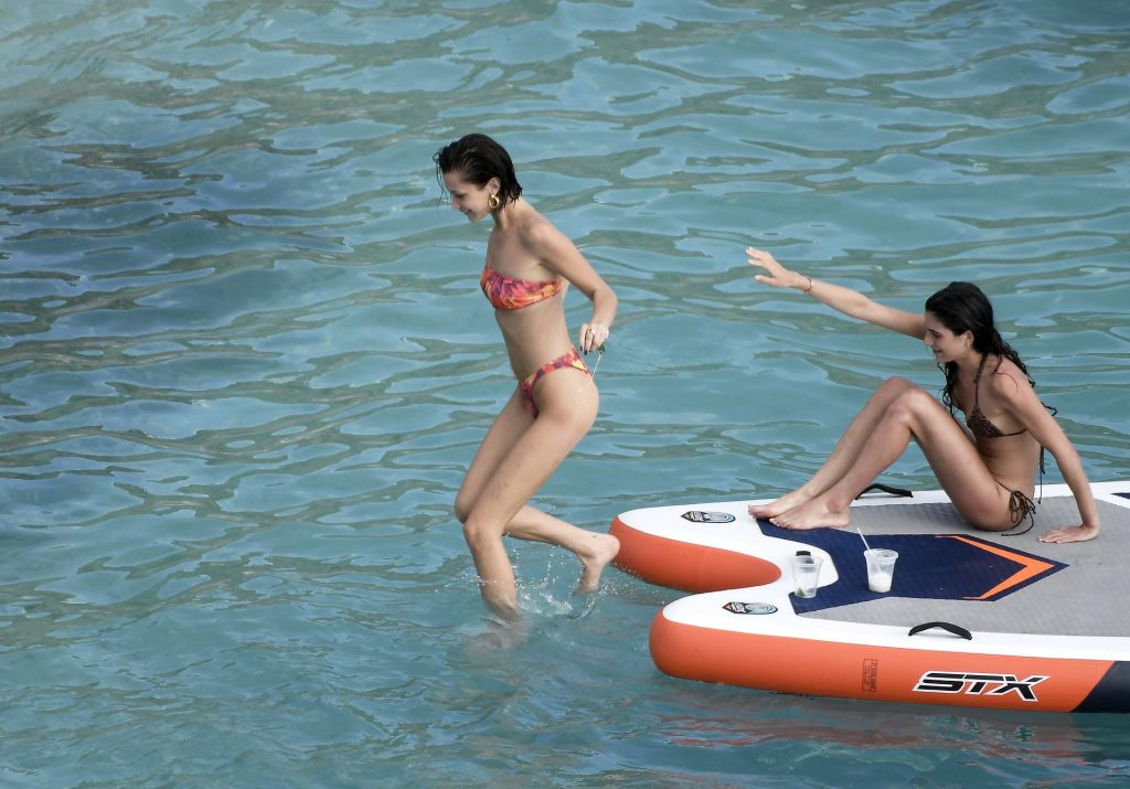 Bella Hadid affiche son incroyable silhouette dans un minuscule bikini tout en profitant du soleil des Caraïbes avec des amis, dont Jesse Jo Stark, Jordan Barrett, Devon Carlson et Lauren Perez à St Barths, le 12/07/2019.