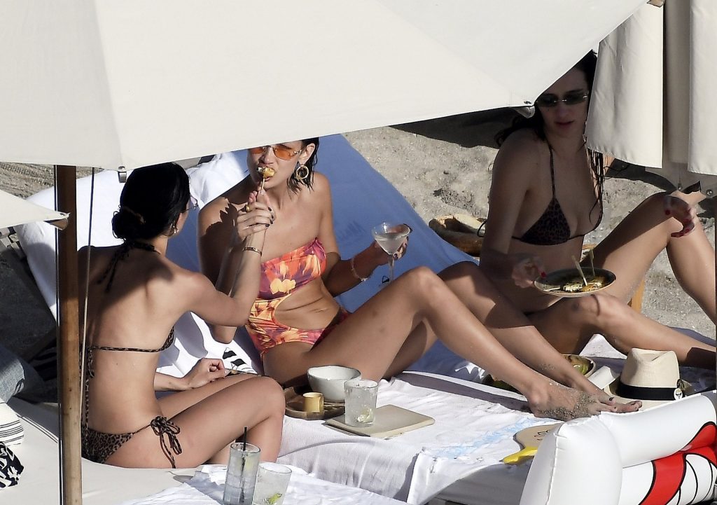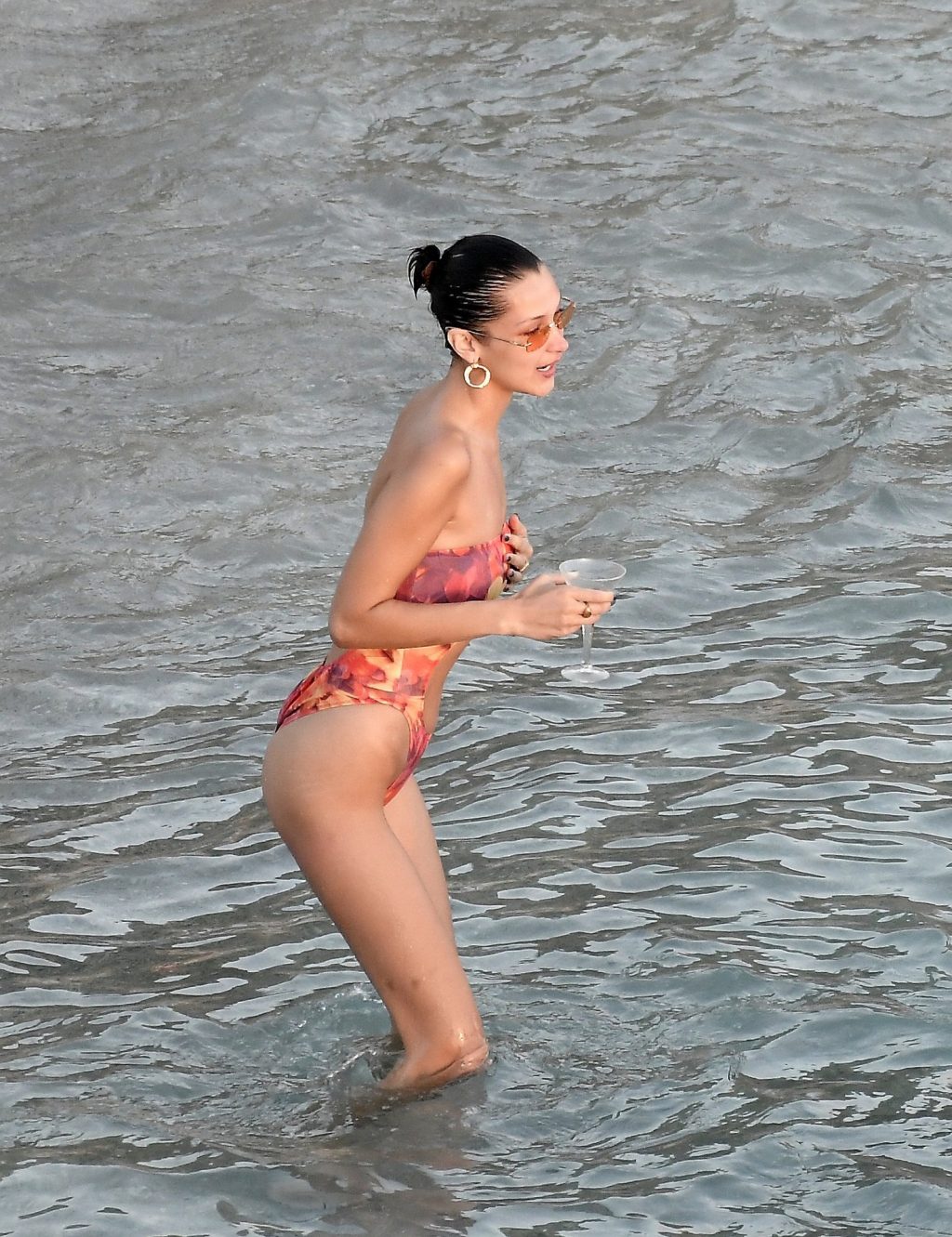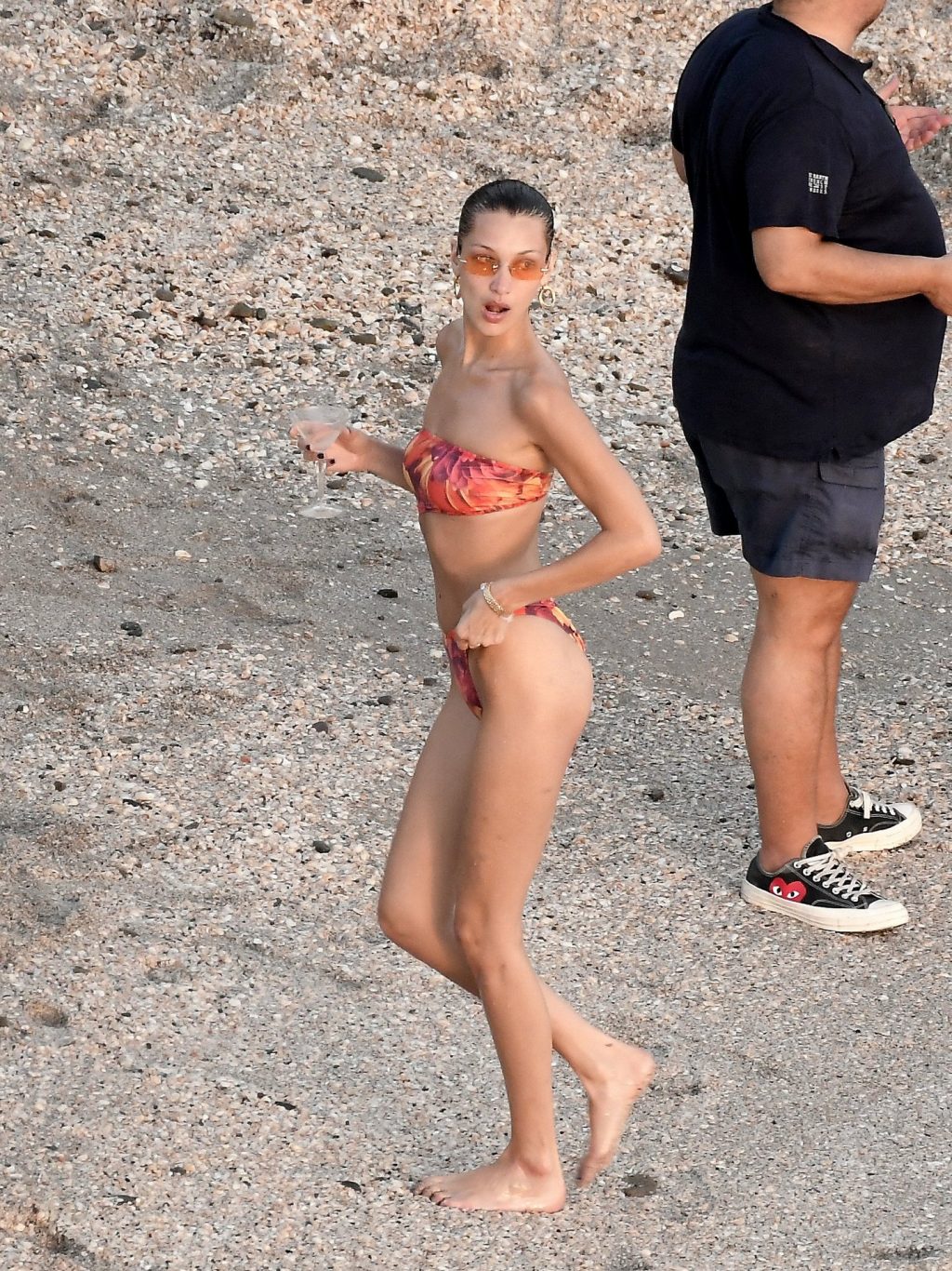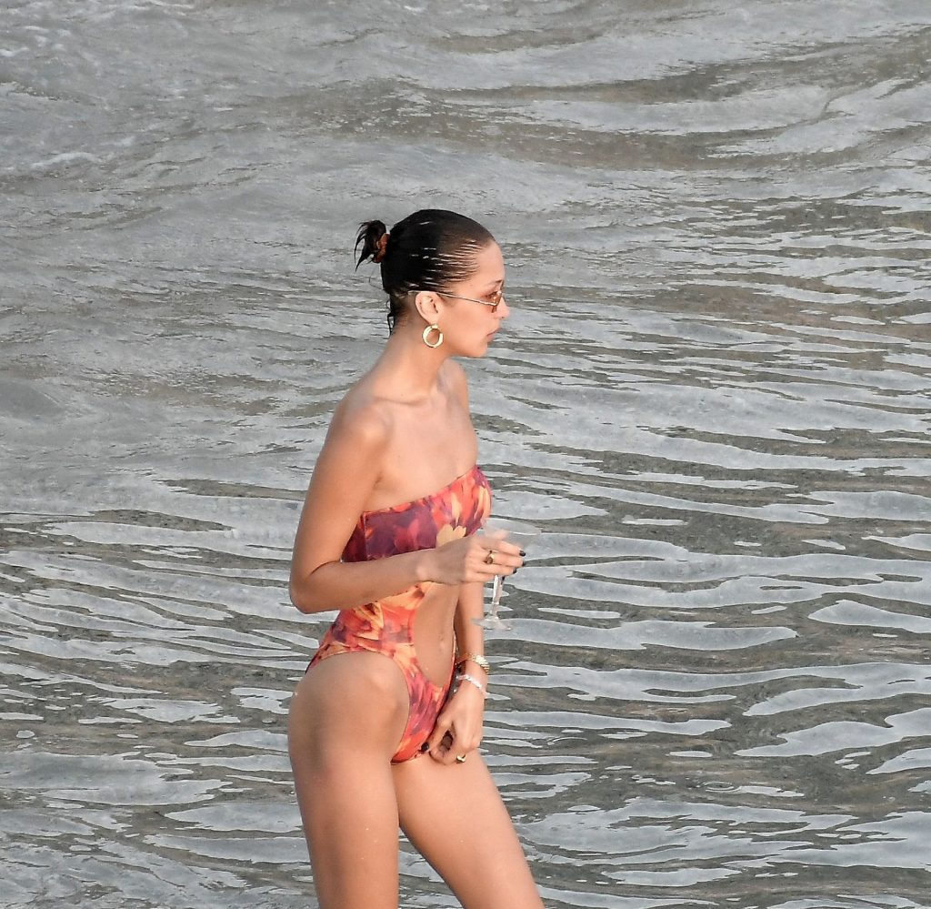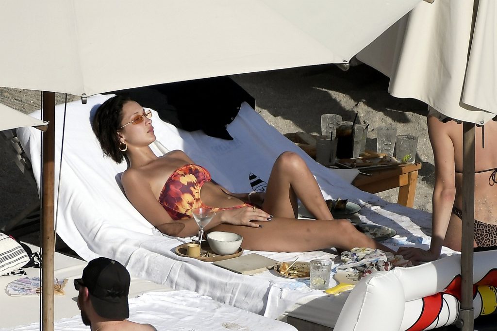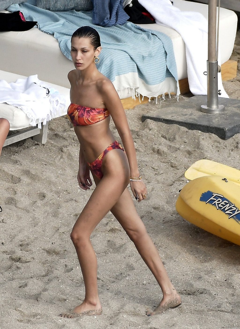 Bella Hadid affiche son incroyable silhouette dans un minuscule bikini tout en profitant du soleil des Caraïbes avec des amis, dont Jesse Jo Stark, Jordan Barrett, Devon Carlson et Lauren Perez à St Barths, le 12/07/2019.