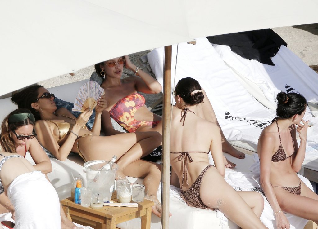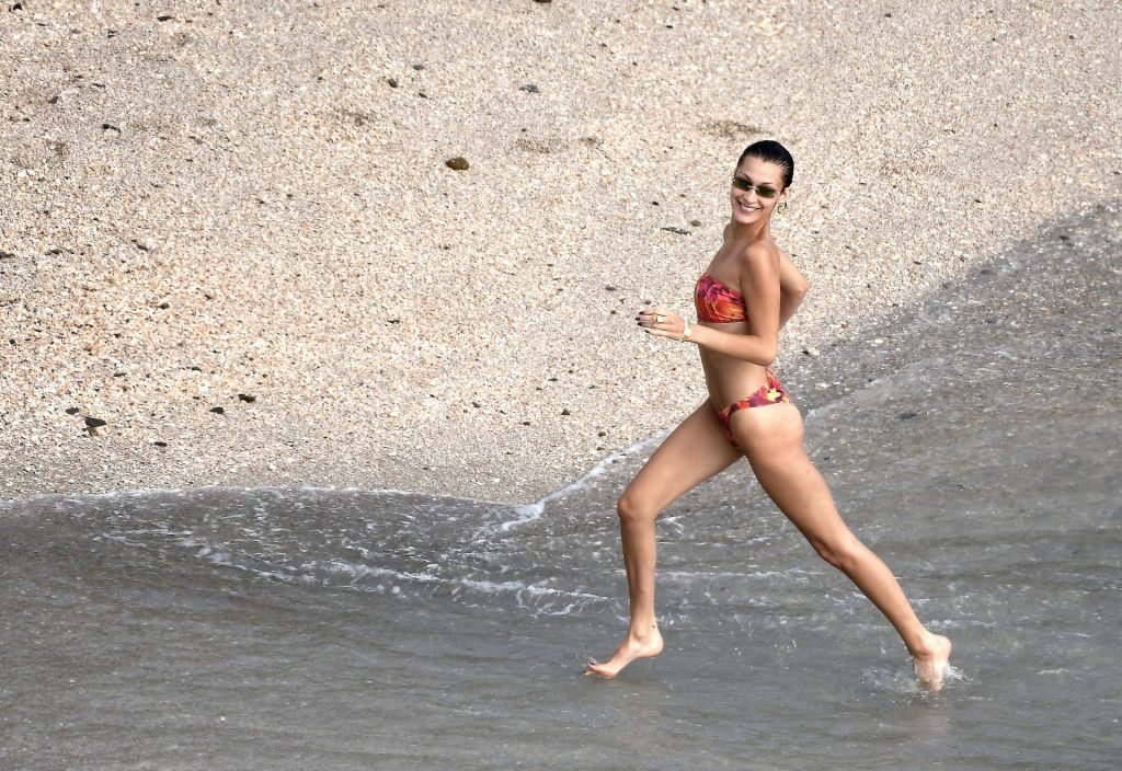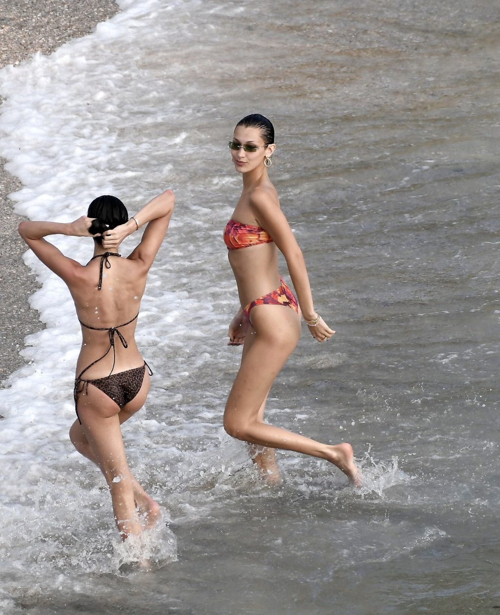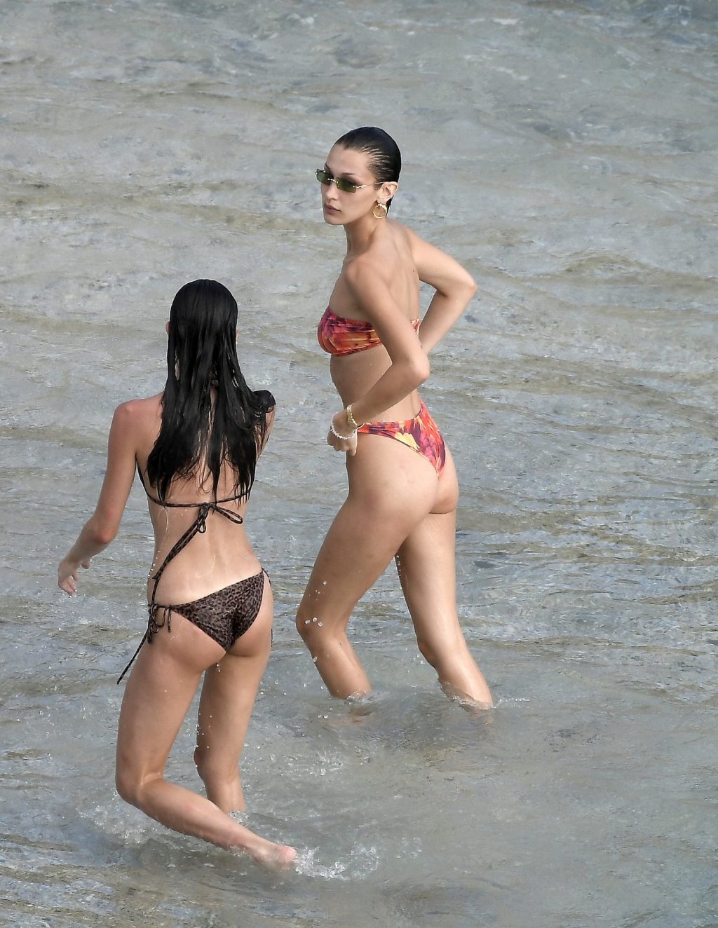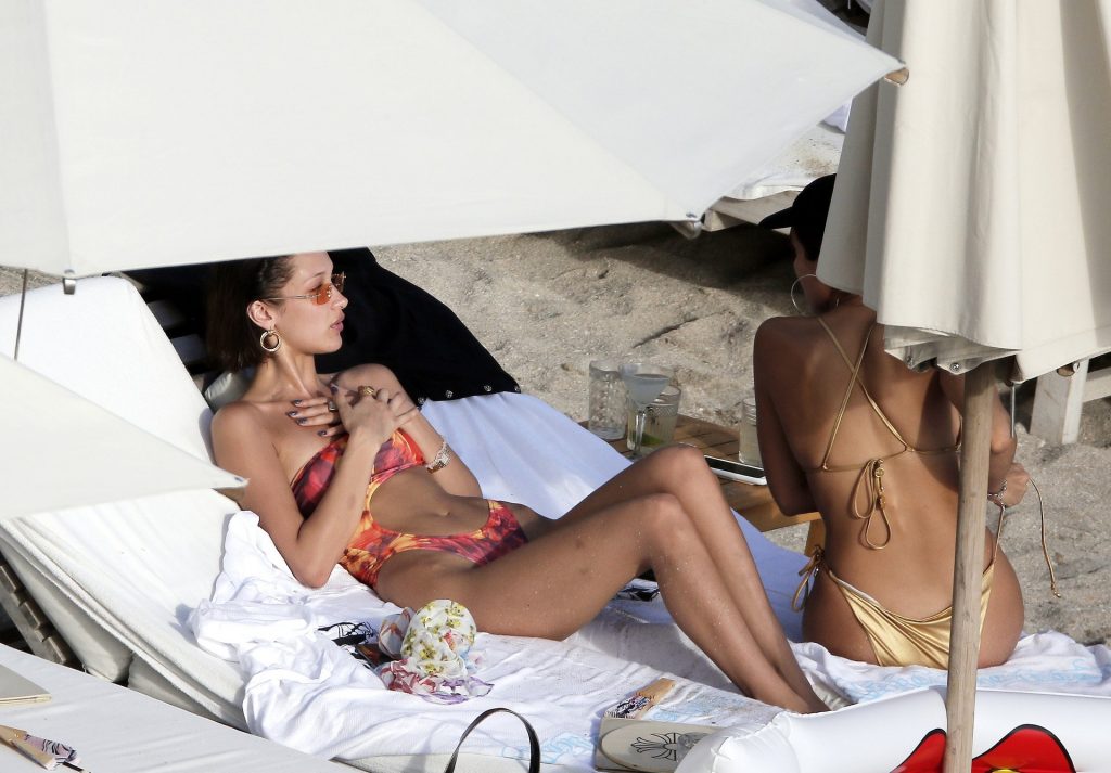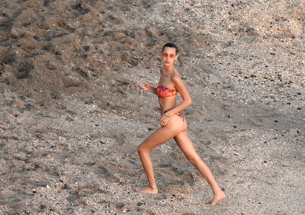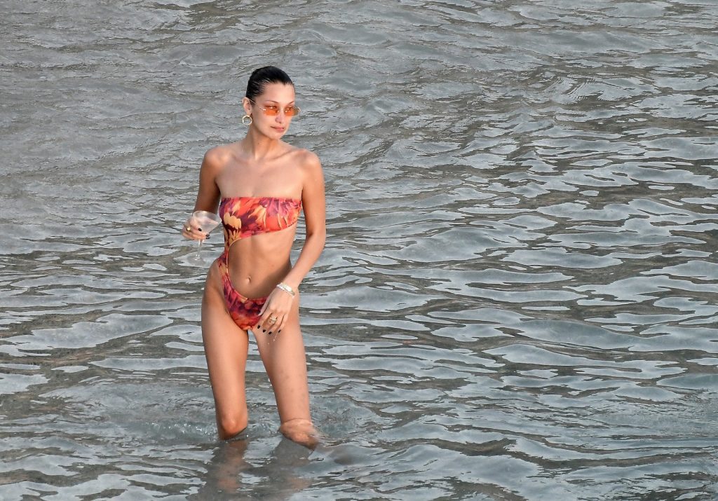 Bella Hadid affiche son incroyable silhouette dans un minuscule bikini tout en profitant du soleil des Caraïbes avec des amis, dont Jesse Jo Stark, Jordan Barrett, Devon Carlson et Lauren Perez à St Barths, le 12/07/2019.