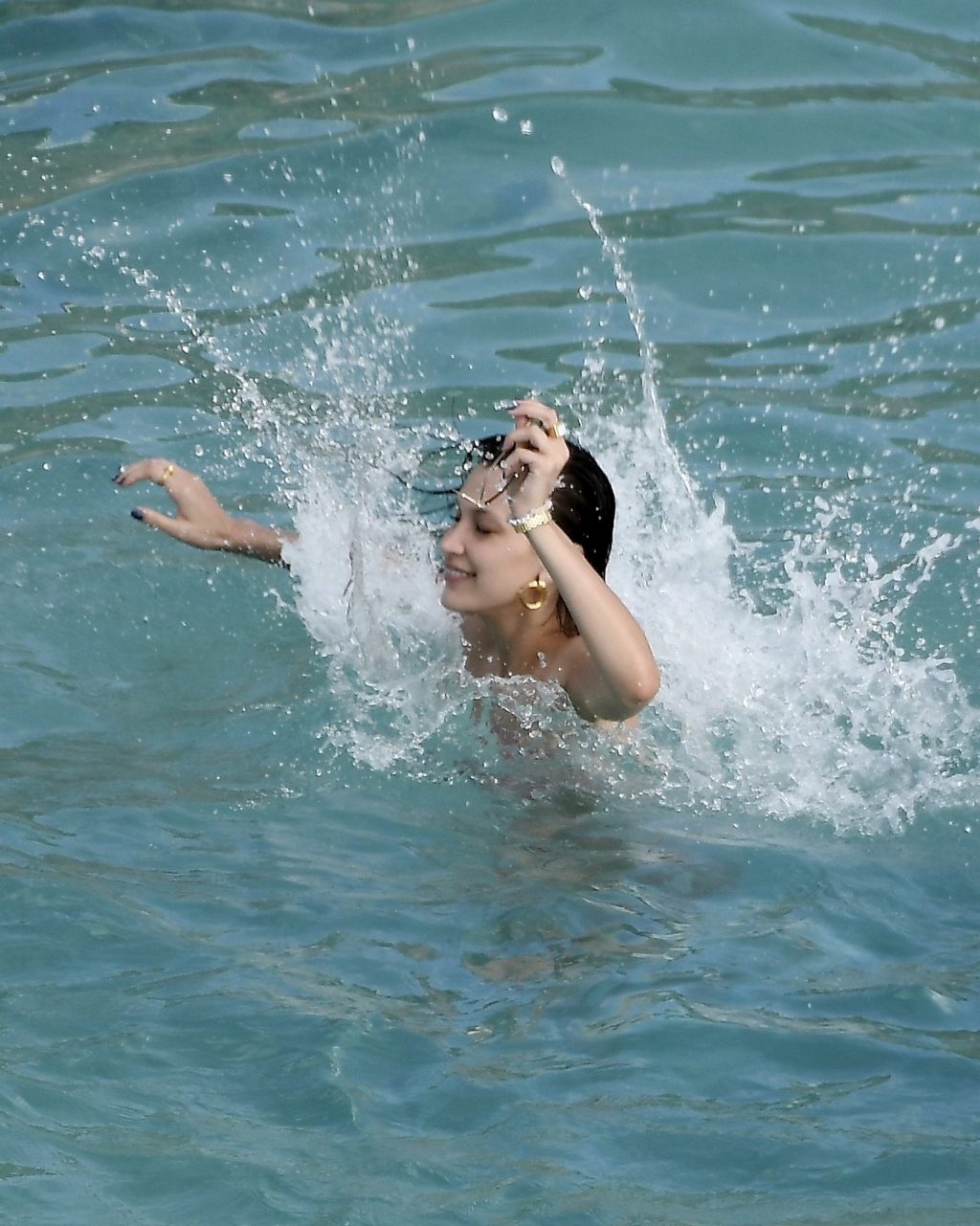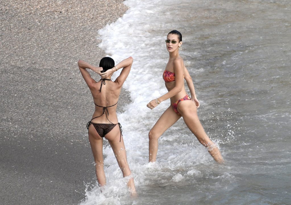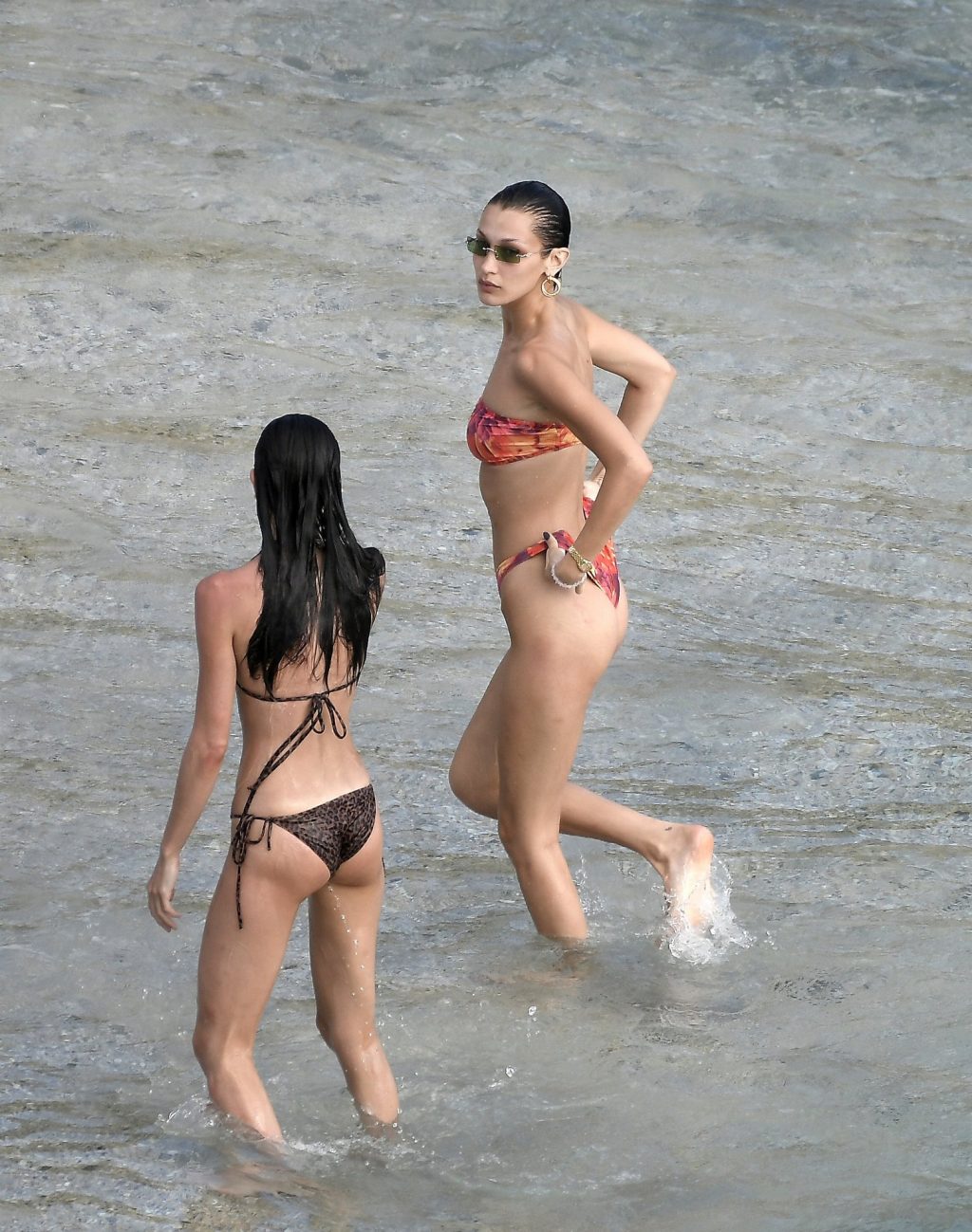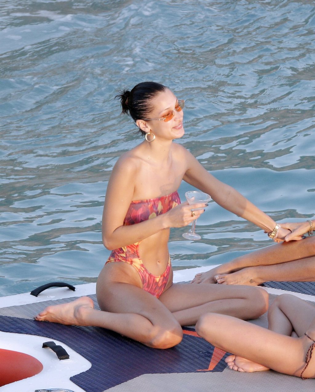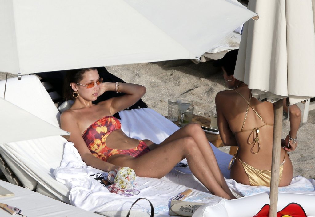 Bella Hadid affiche son incroyable silhouette dans un minuscule bikini tout en profitant du soleil des Caraïbes avec des amis, dont Jesse Jo Stark, Jordan Barrett, Devon Carlson et Lauren Perez à St Barths, le 12/07/2019.