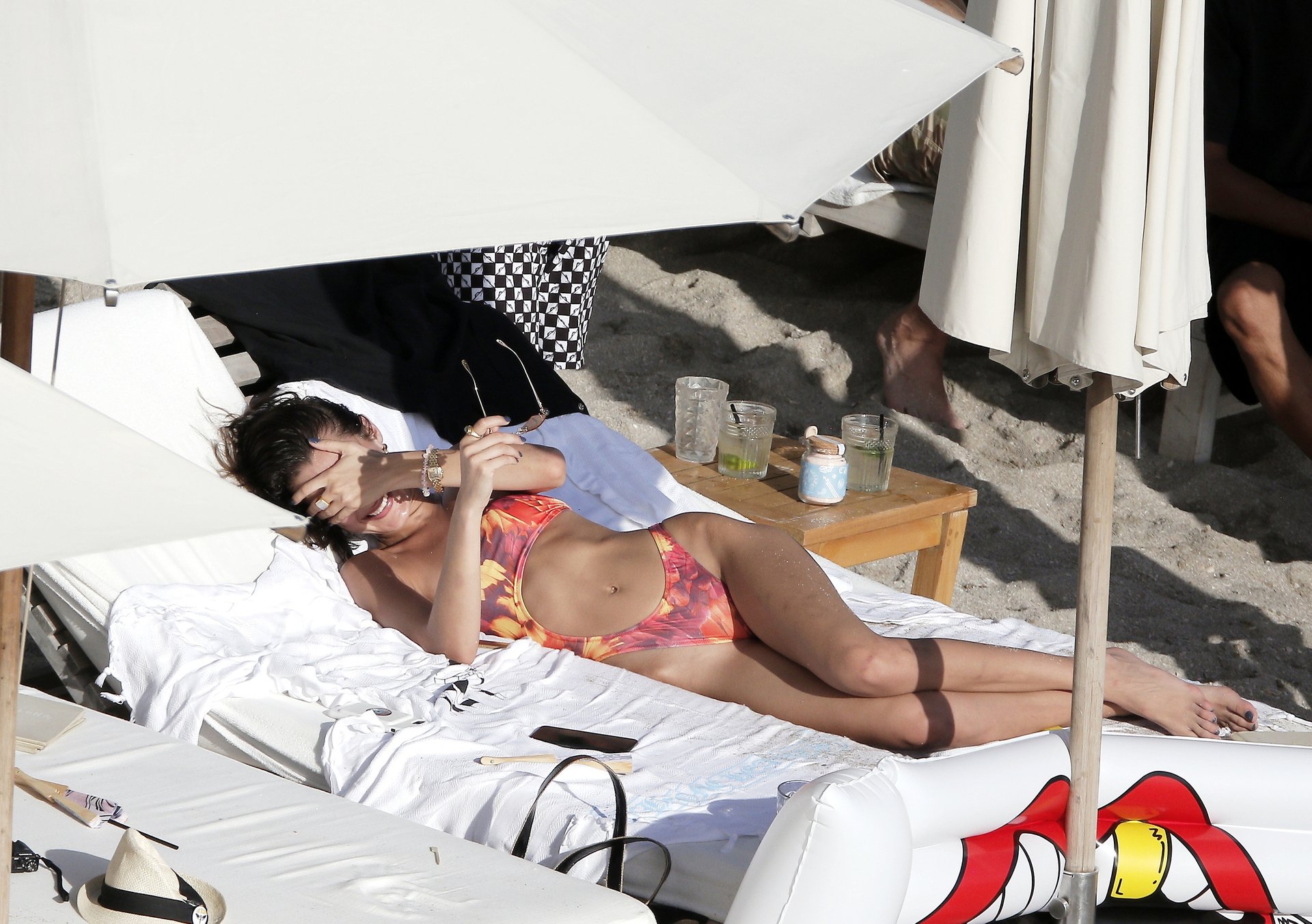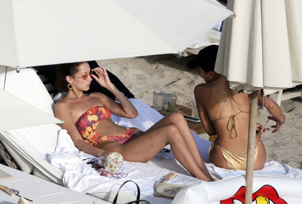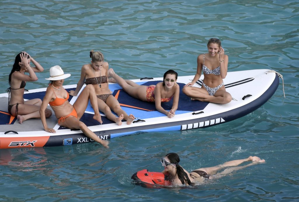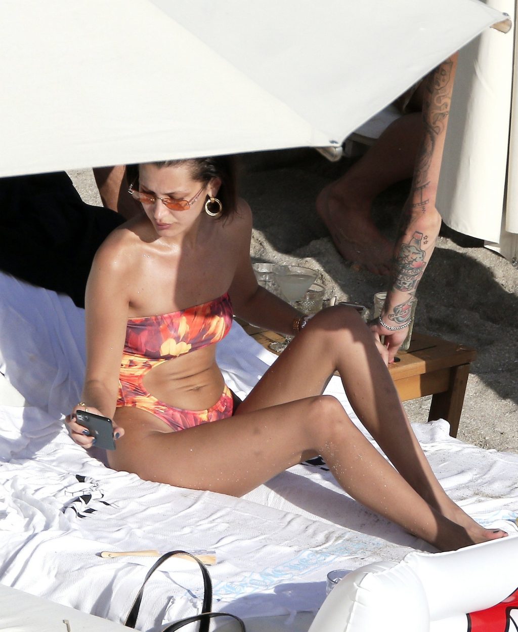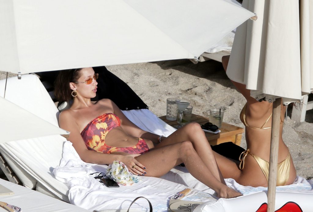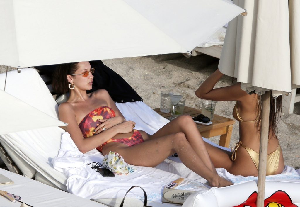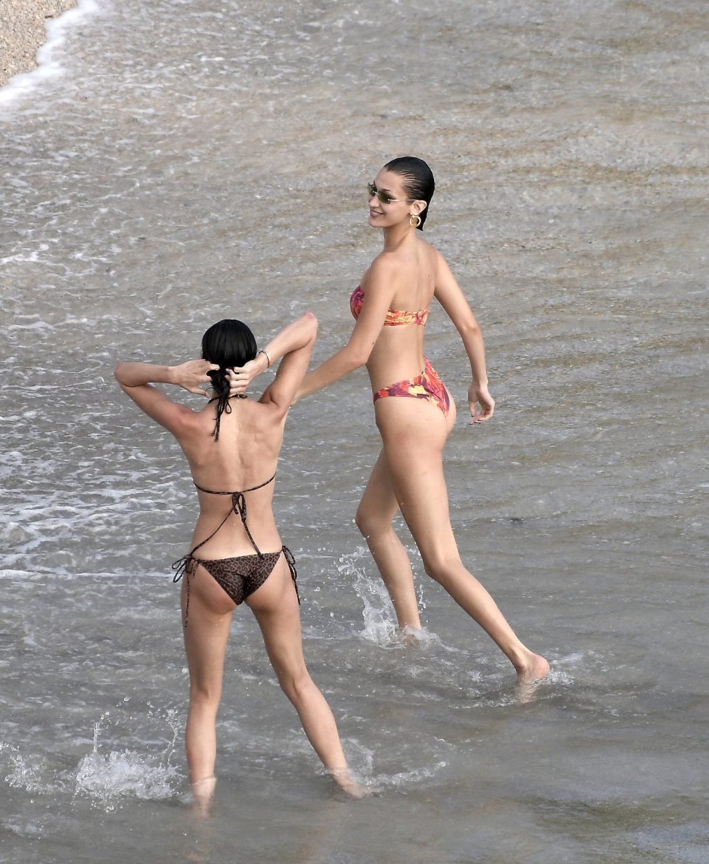 Bella Hadid affiche son incroyable silhouette dans un minuscule bikini tout en profitant du soleil des Caraïbes avec des amis, dont Jesse Jo Stark, Jordan Barrett, Devon Carlson et Lauren Perez à St Barths, le 12/07/2019.