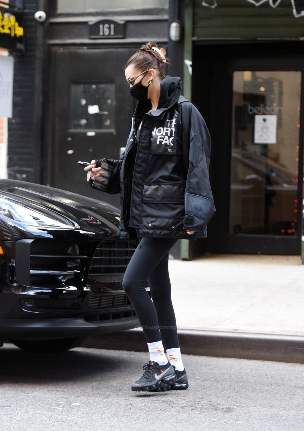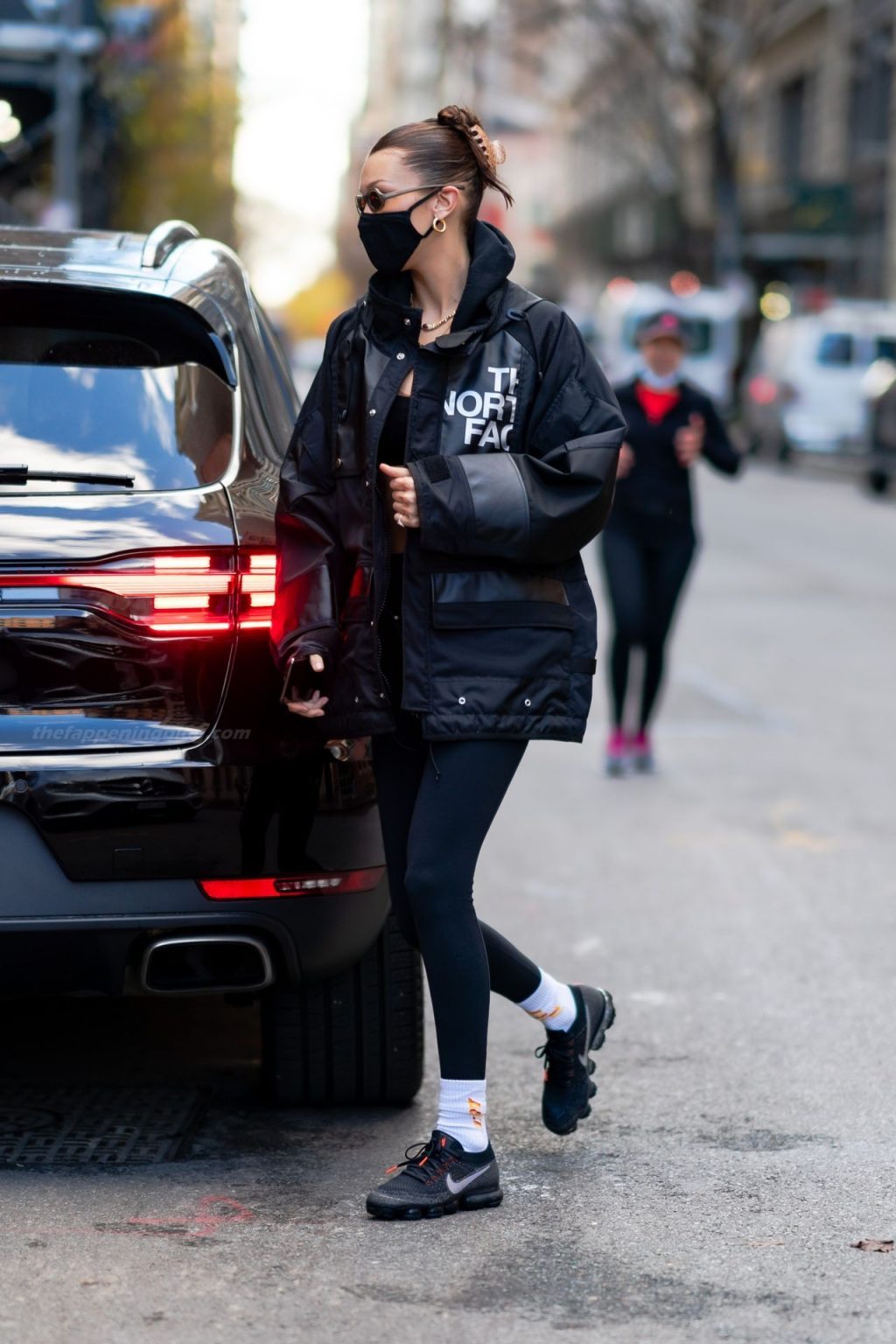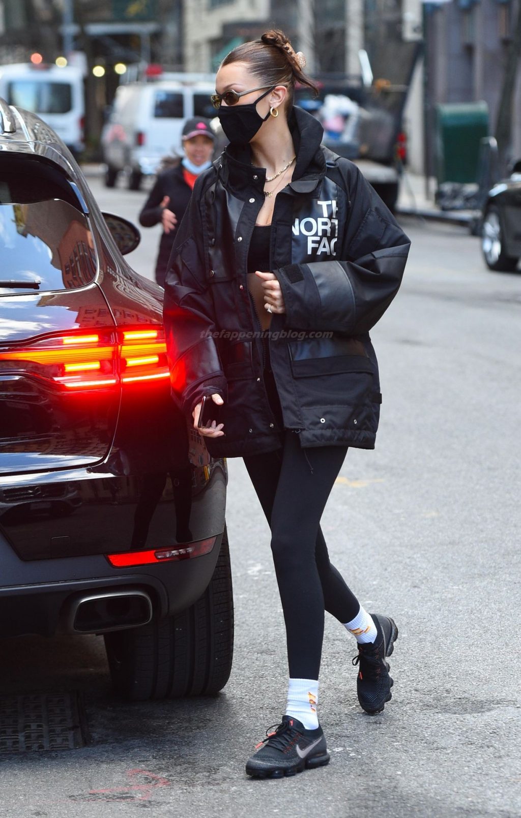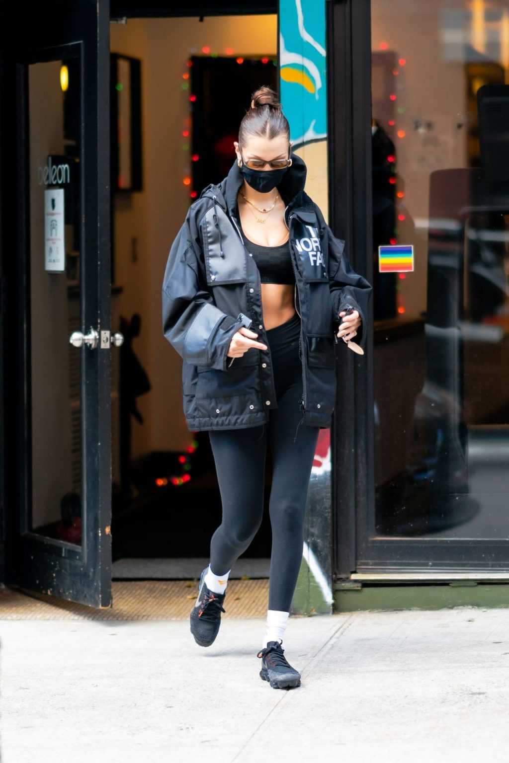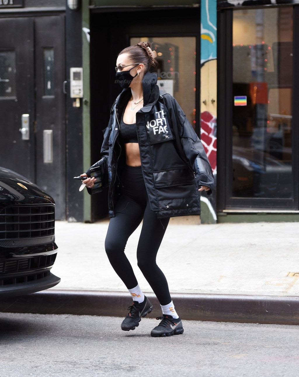 La mannequin américaine de 24 ans a été aperçue se rendant à la salle de sport, dévoilant son ventre plat sous une veste noire North Face associée à des collants noirs et des baskets noires Nike.