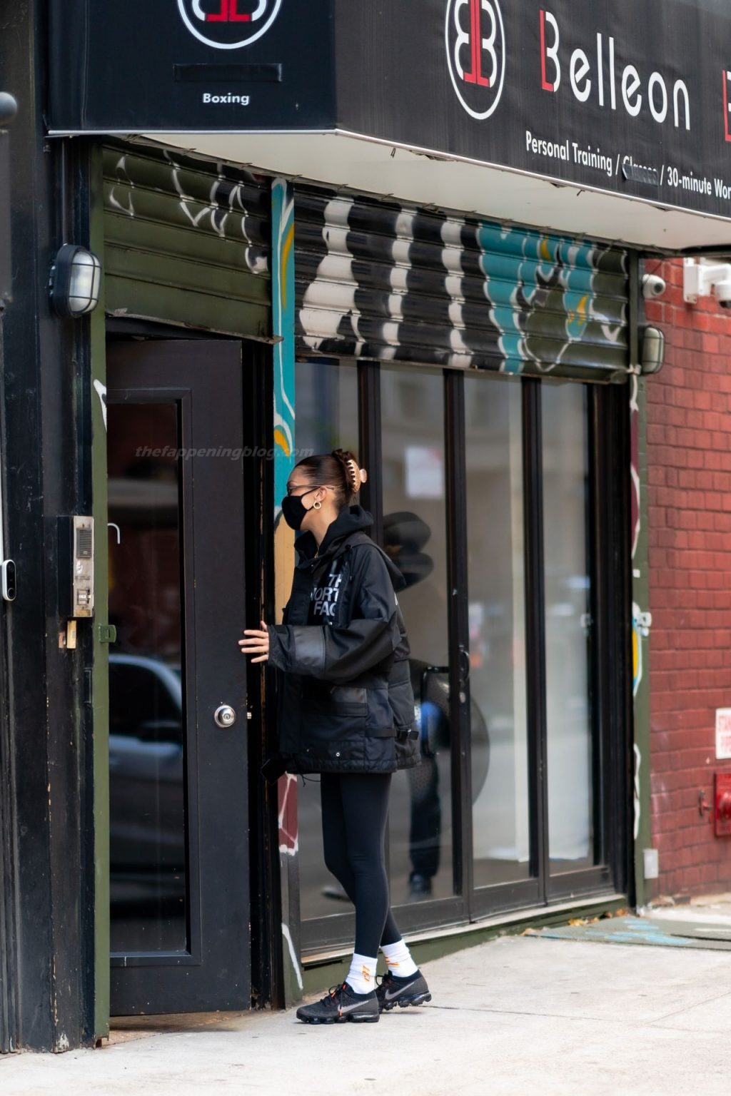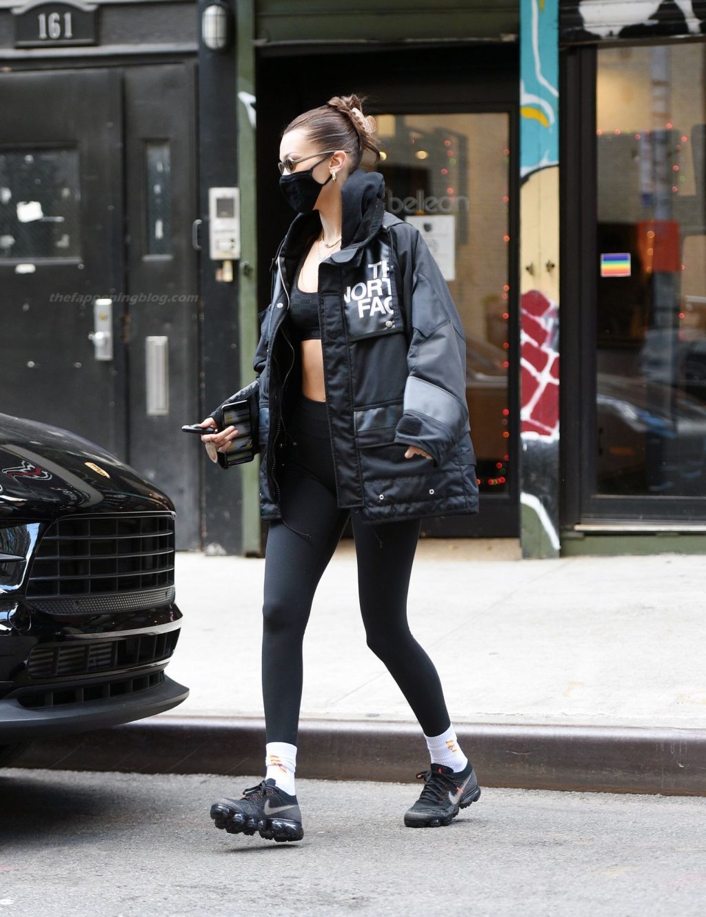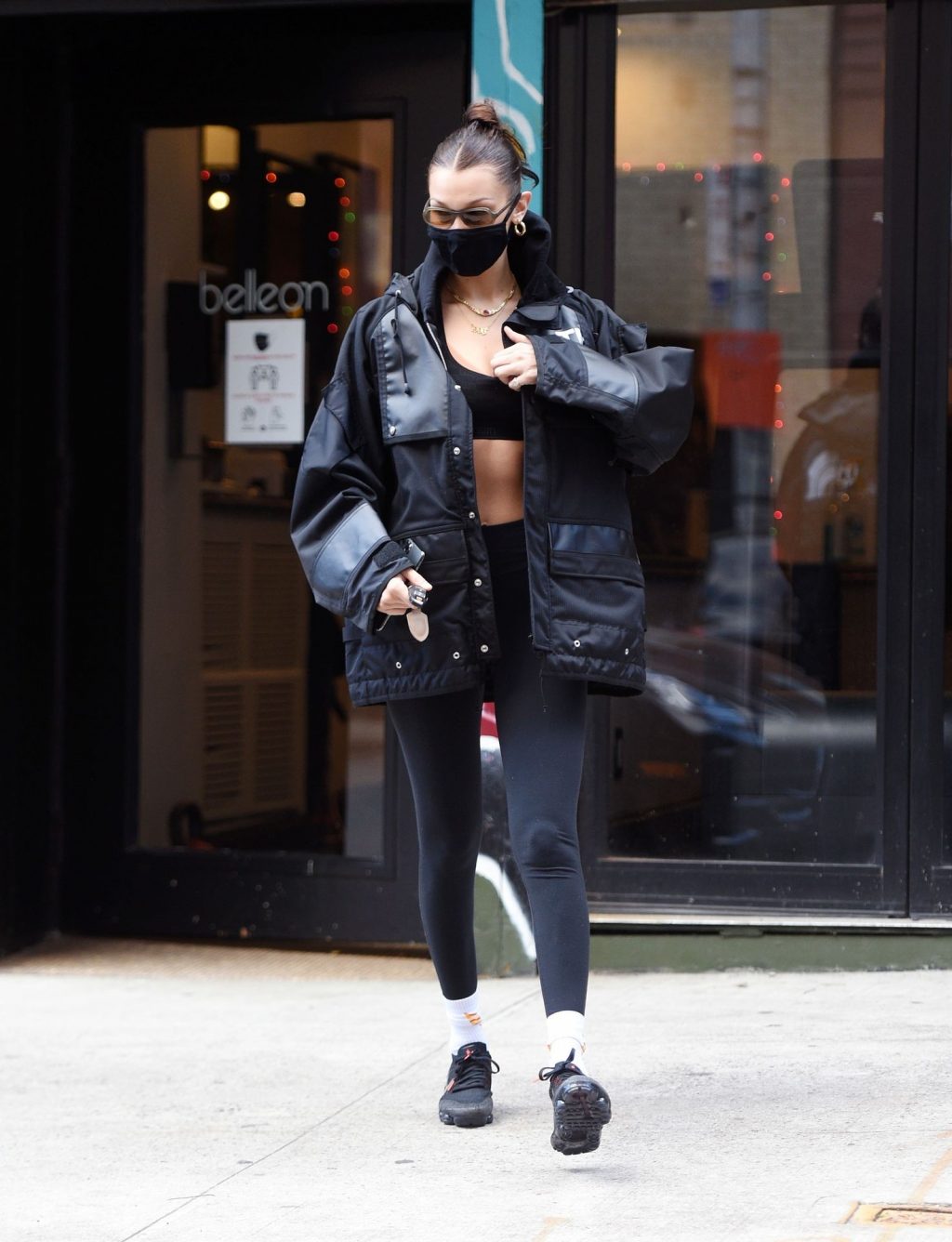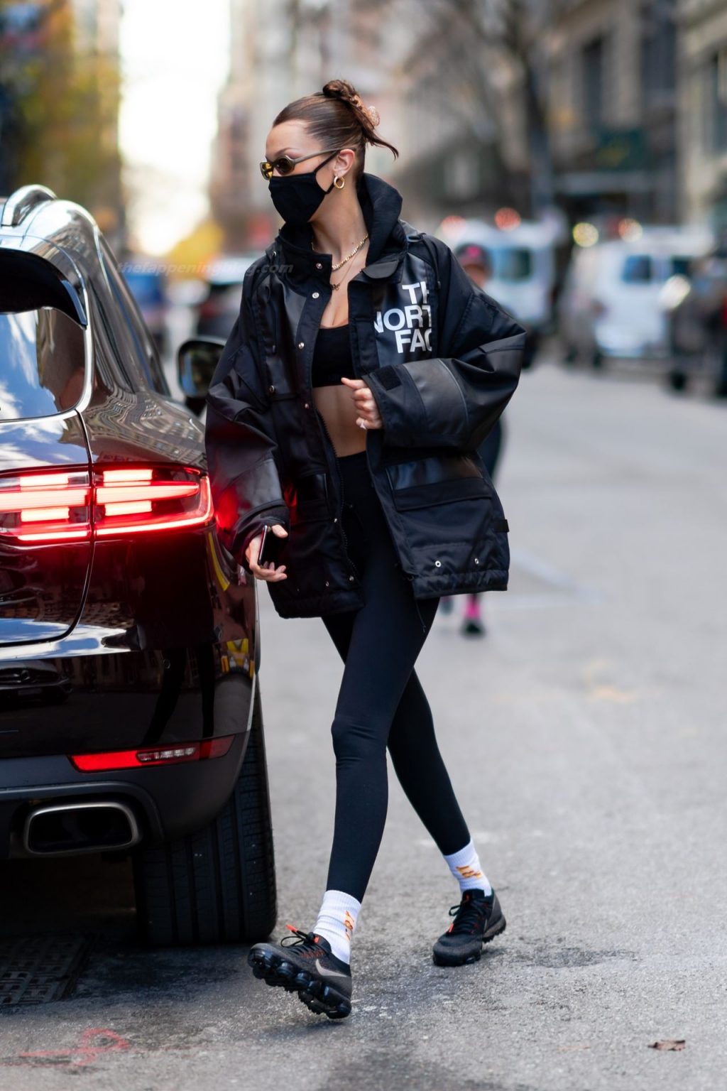 La mannequin américaine de 24 ans a été aperçue se rendant à la salle de sport, dévoilant son ventre plat sous une veste noire North Face associée à des collants noirs et des baskets noires Nike.