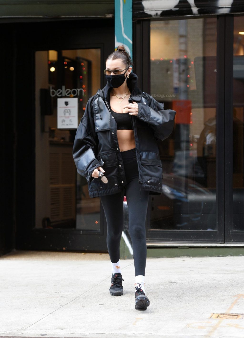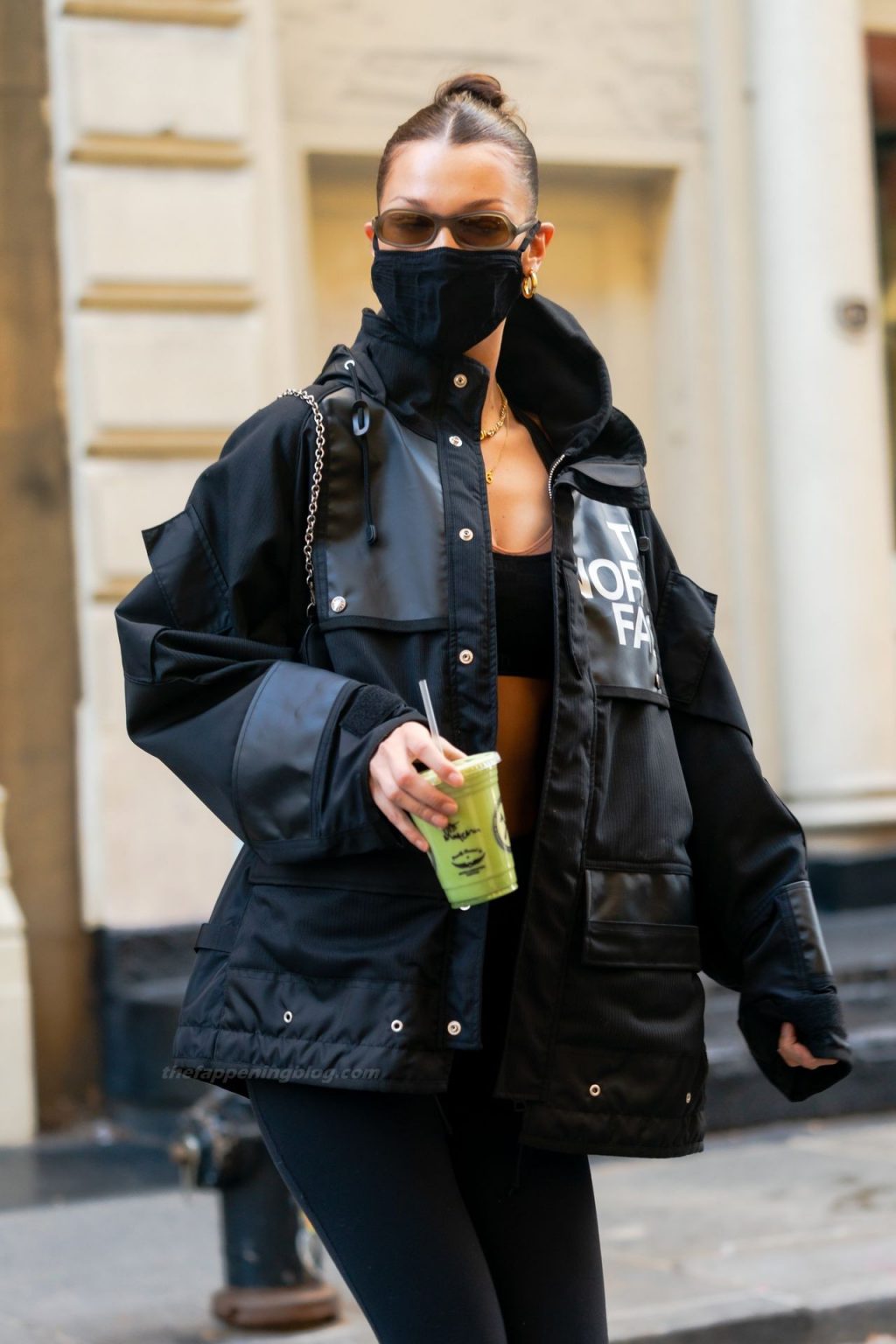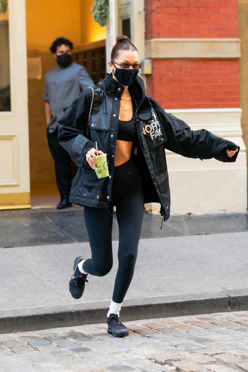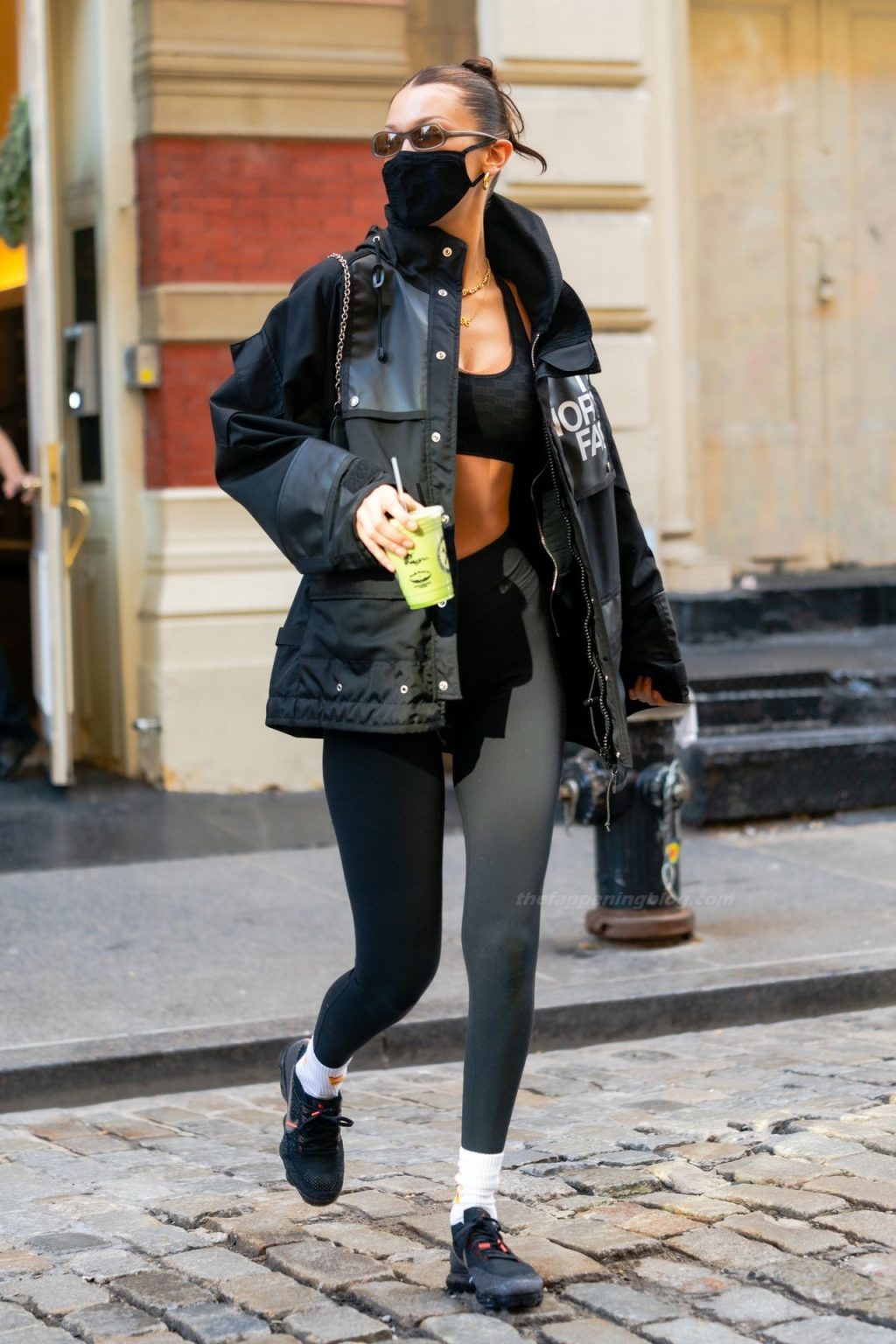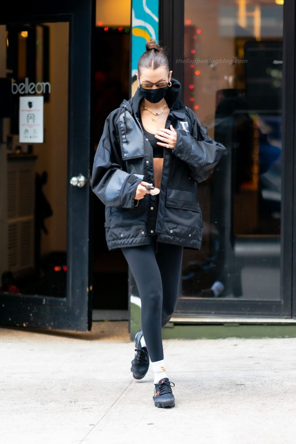 La mannequin américaine de 24 ans a été aperçue se rendant à la salle de sport, dévoilant son ventre plat sous une veste noire North Face associée à des collants noirs et des baskets noires Nike.