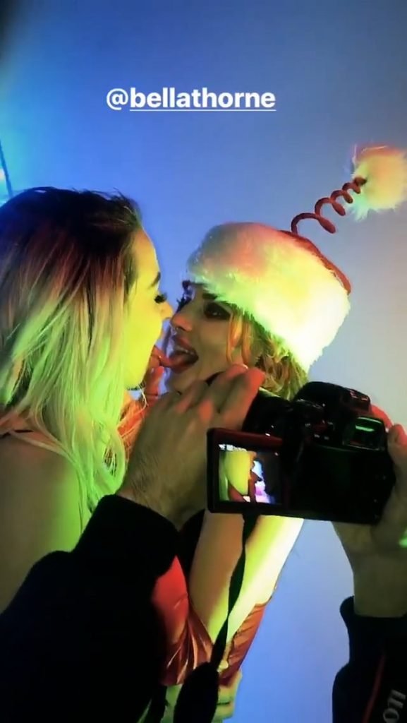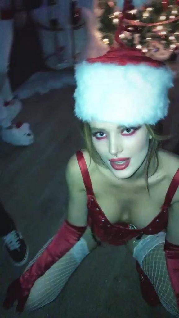 Bella Thorne porte un costume de Père Noël sexy sur le tournage du clip de Noël – Instagram, 12/09/2017. Annabella Thorne est une actrice américaine (Assassination Nation), star d’Instagram, chanteuse. Âge : 20.