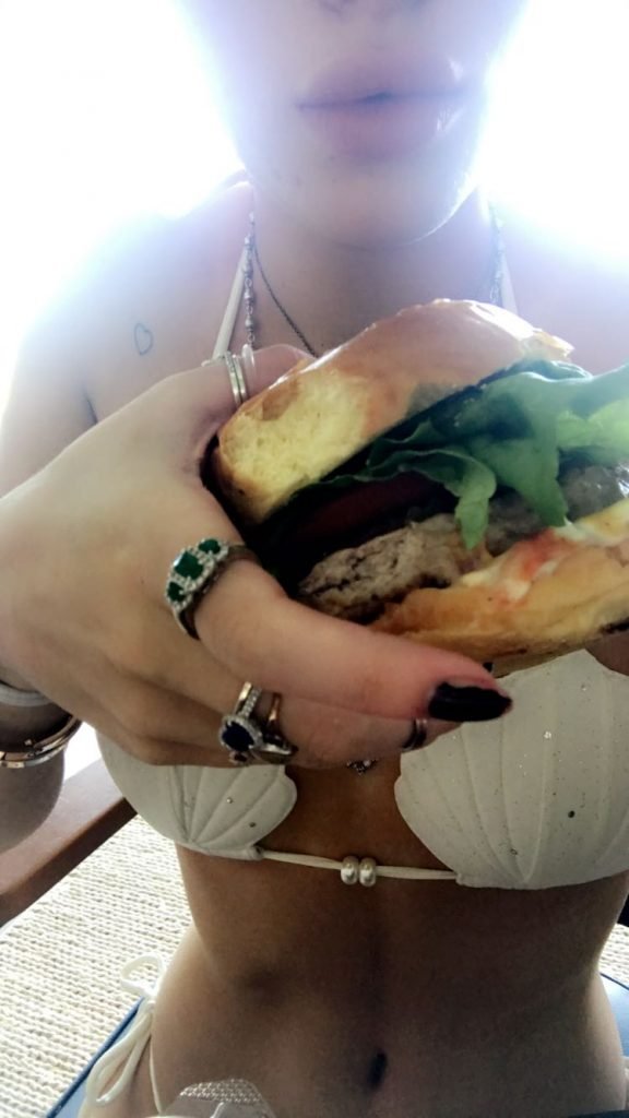 Bella Thorne pose en bikini blanc avec un burger – Instagram, Snapchat, 20/06/2017. Bella Avery Thorne est une actrice américaine (Break My Heart 1000 Times en tant que Veronica Calder), mannequin, chanteuse. Âge – 19 ans.