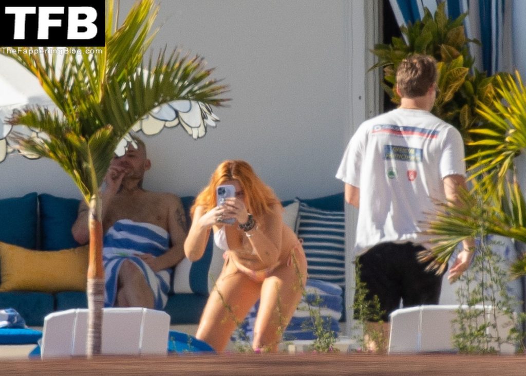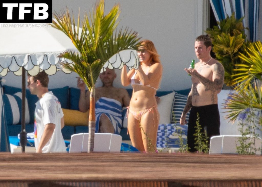 Bella Thorne affiche son corps en bikini alors qu’elle et son petit ami Benjamin Mascolo passent du temps avec des amis dans une location haut de gamme à Cabo San Lucas, Mexique, 16/03/2022. Bella reçoit de l’aide d’une amie pour ajuster sa montre pendant que son amoureux boit des bières.