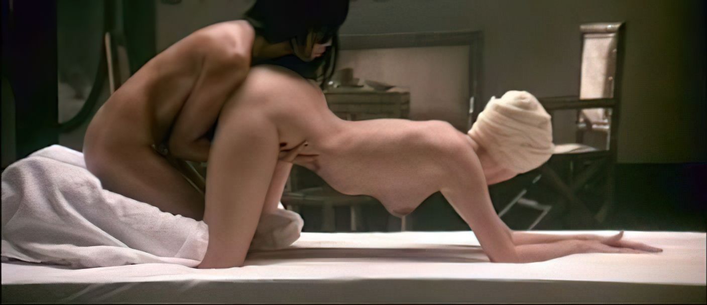 Sylvia Kristel, complètement nue, embrasse une fille nue. Elle remonte le long de son corps puis redescend avant de lui faire un sexe oral dans cette belle scène lesbienne.