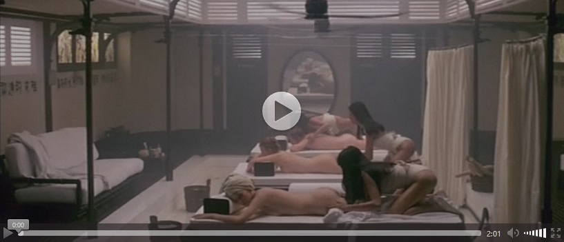 Naked Sylvia Kristel, Catherine Rivet, and a guy all receive sensual massages from three nude girls who rub their wet bodies all over their naked customers.