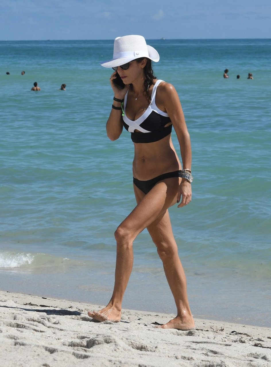 La star américaine de la télévision Bethenny Frankel (47 ans) porte un bikini noir et blanc alors qu’elle se rend à la plage à Miami, le 20/10/2018.