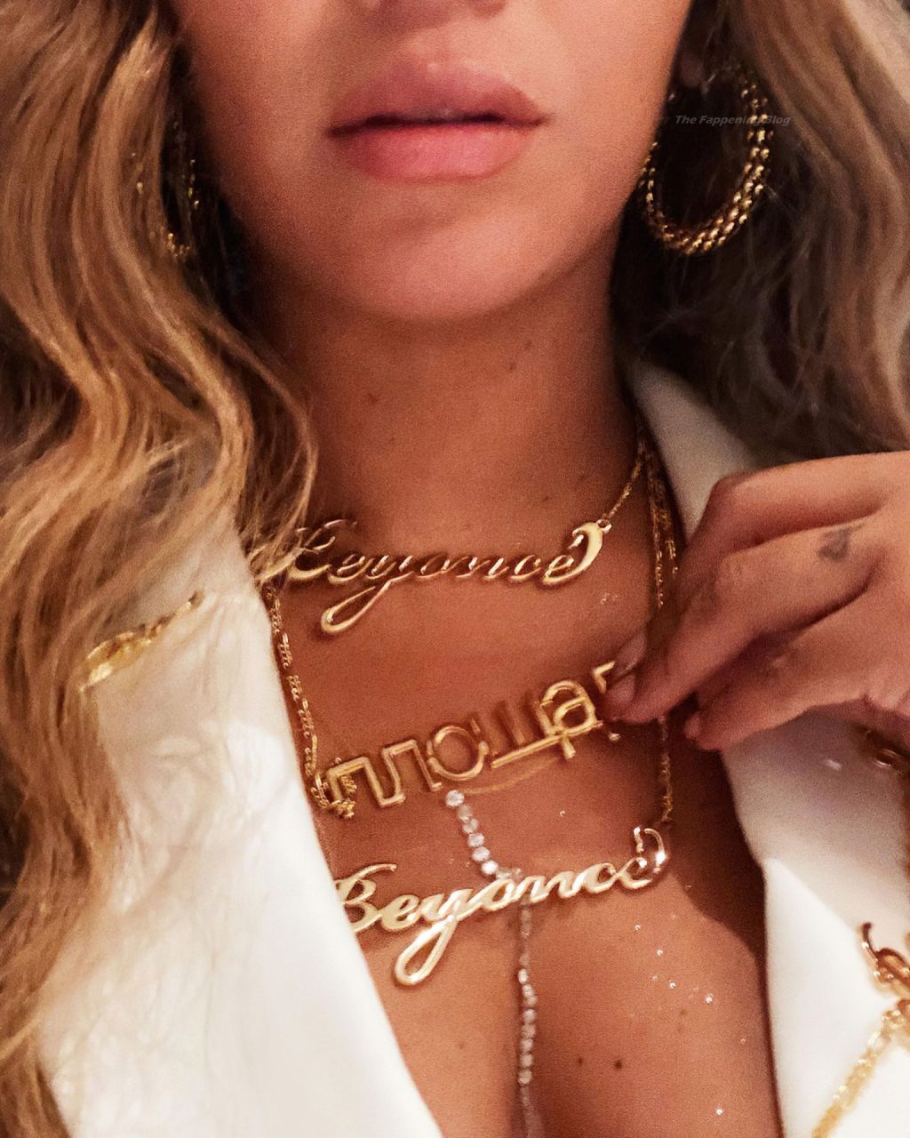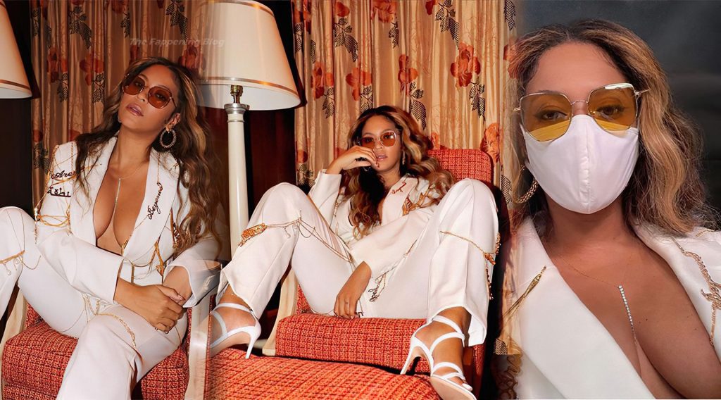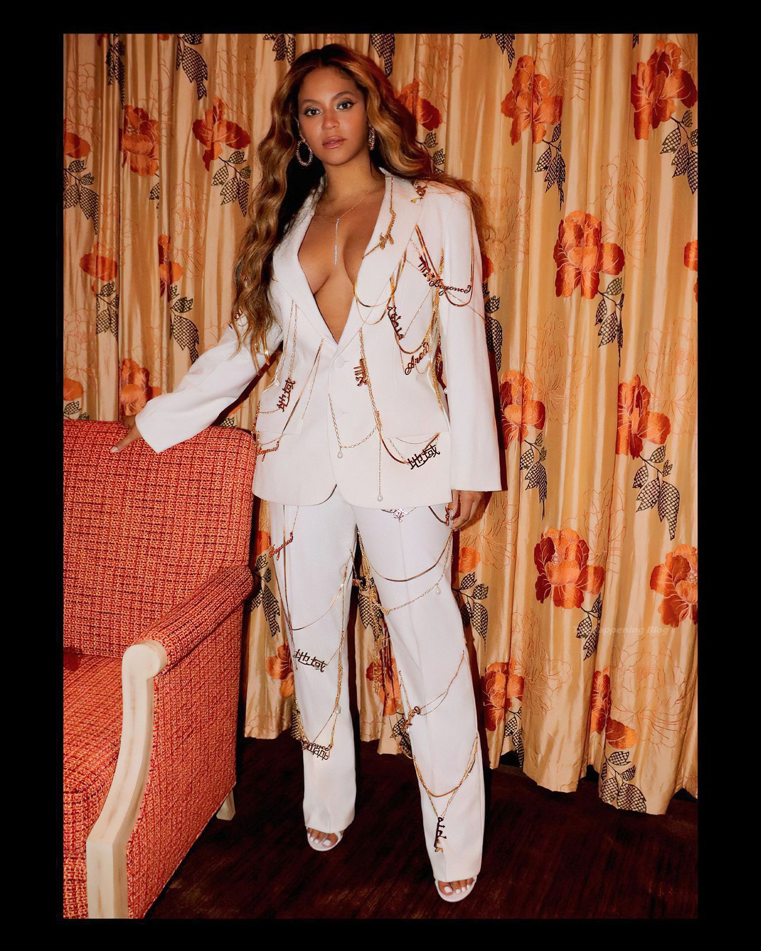 La chanteuse Beyoncé exhibe son joli décolleté et ses bijoux, posant sans soutien-gorge dans un tailleur-pantalon blanc lors d’une nouvelle séance photo sur les réseaux sociaux (avril 2021).