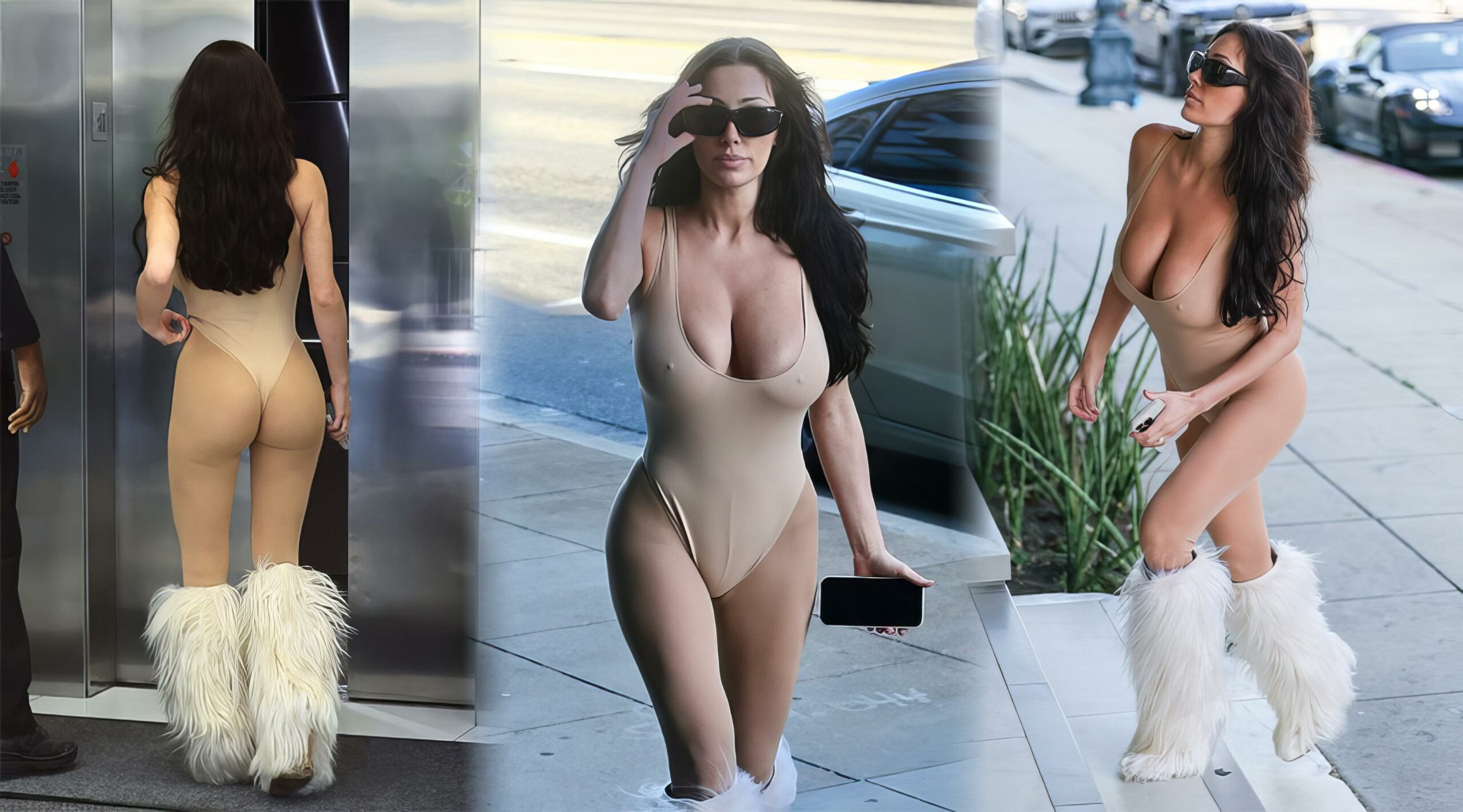 Bianca Censori a tout donné à L.A., portant un body nude transparent associé à des bottes en fourrure, montrant ses seins sexy et ses fesses.